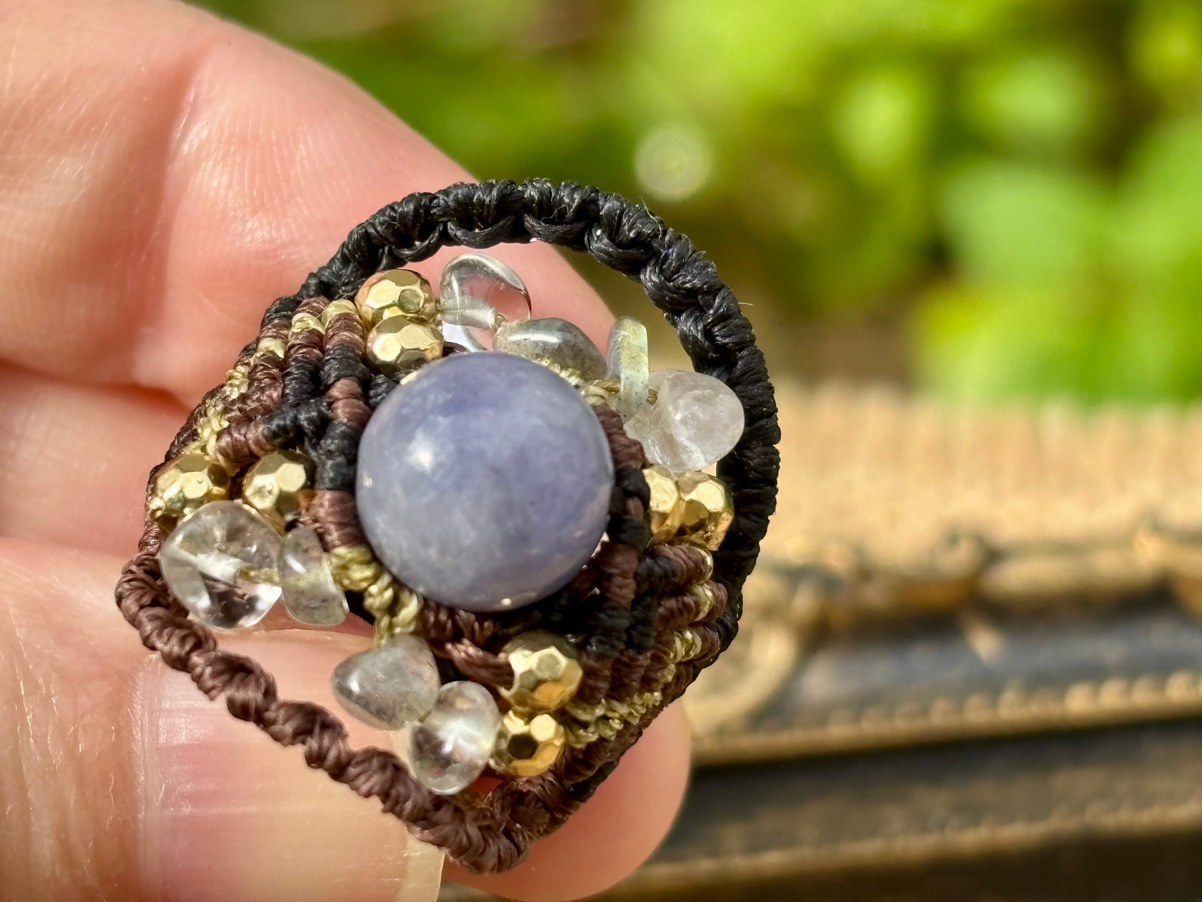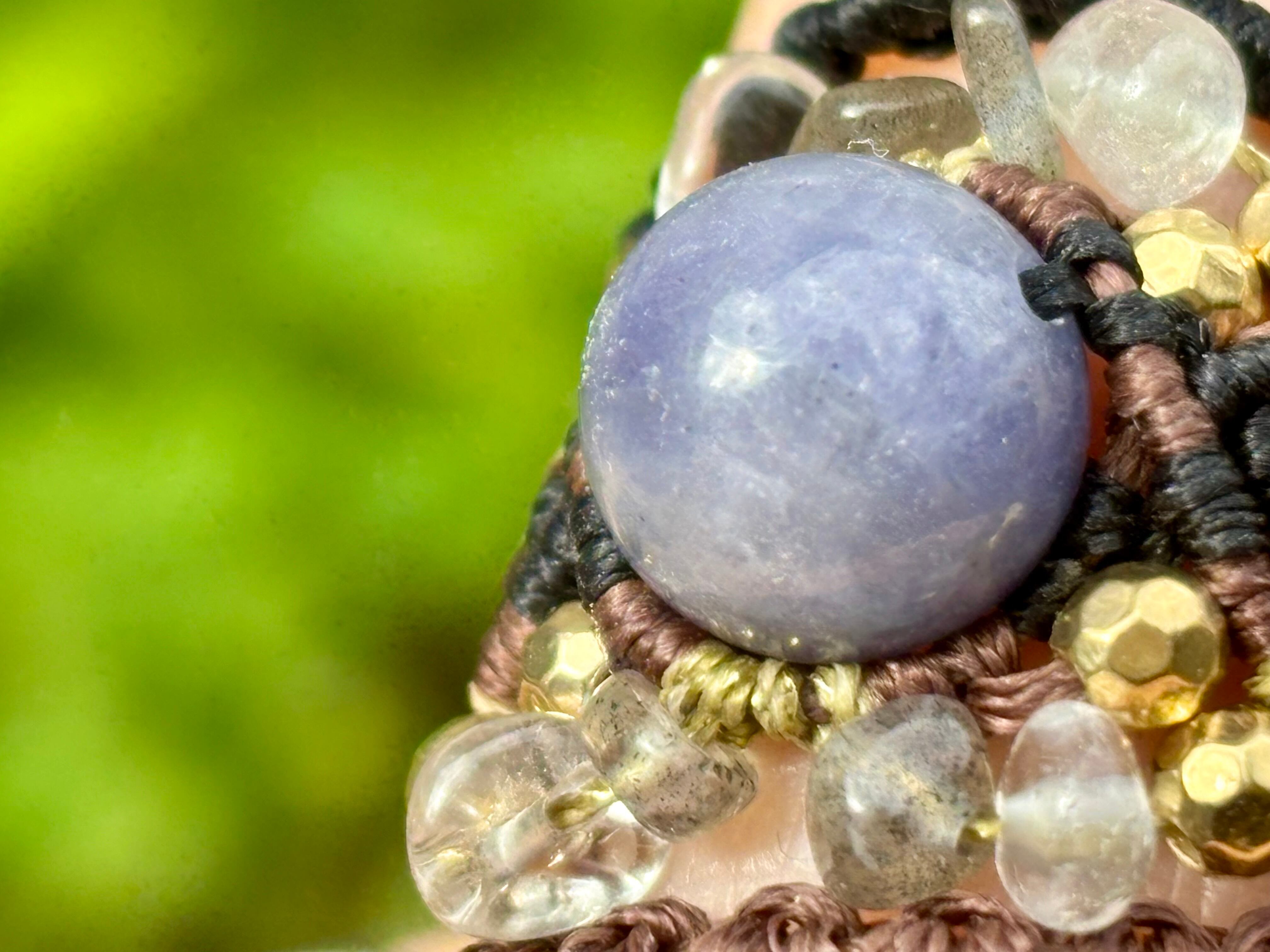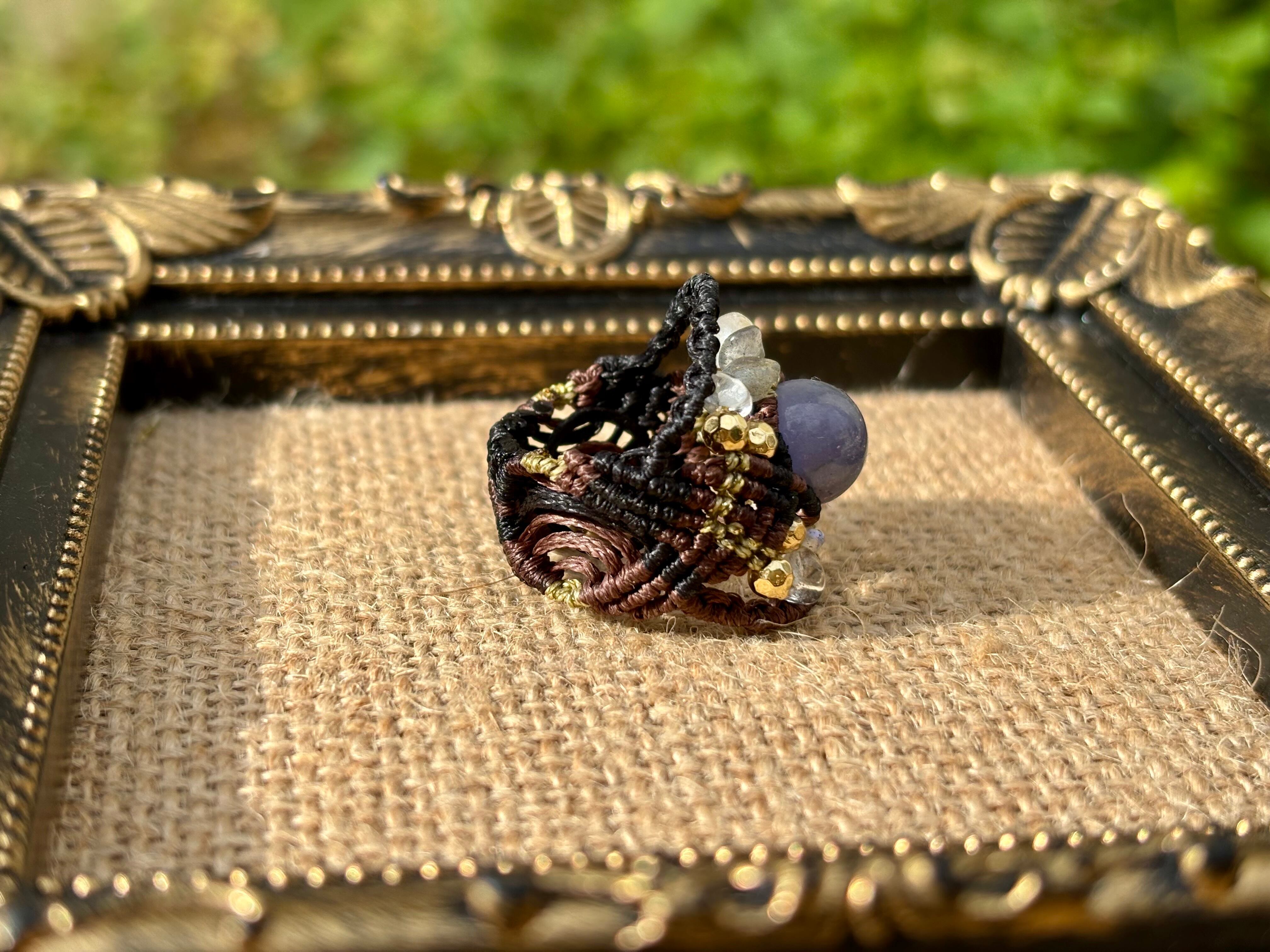 #893希少タンザナイト一点物(タンザナイト×水晶×ラブラドライト マクラメ編みリング/指輪)