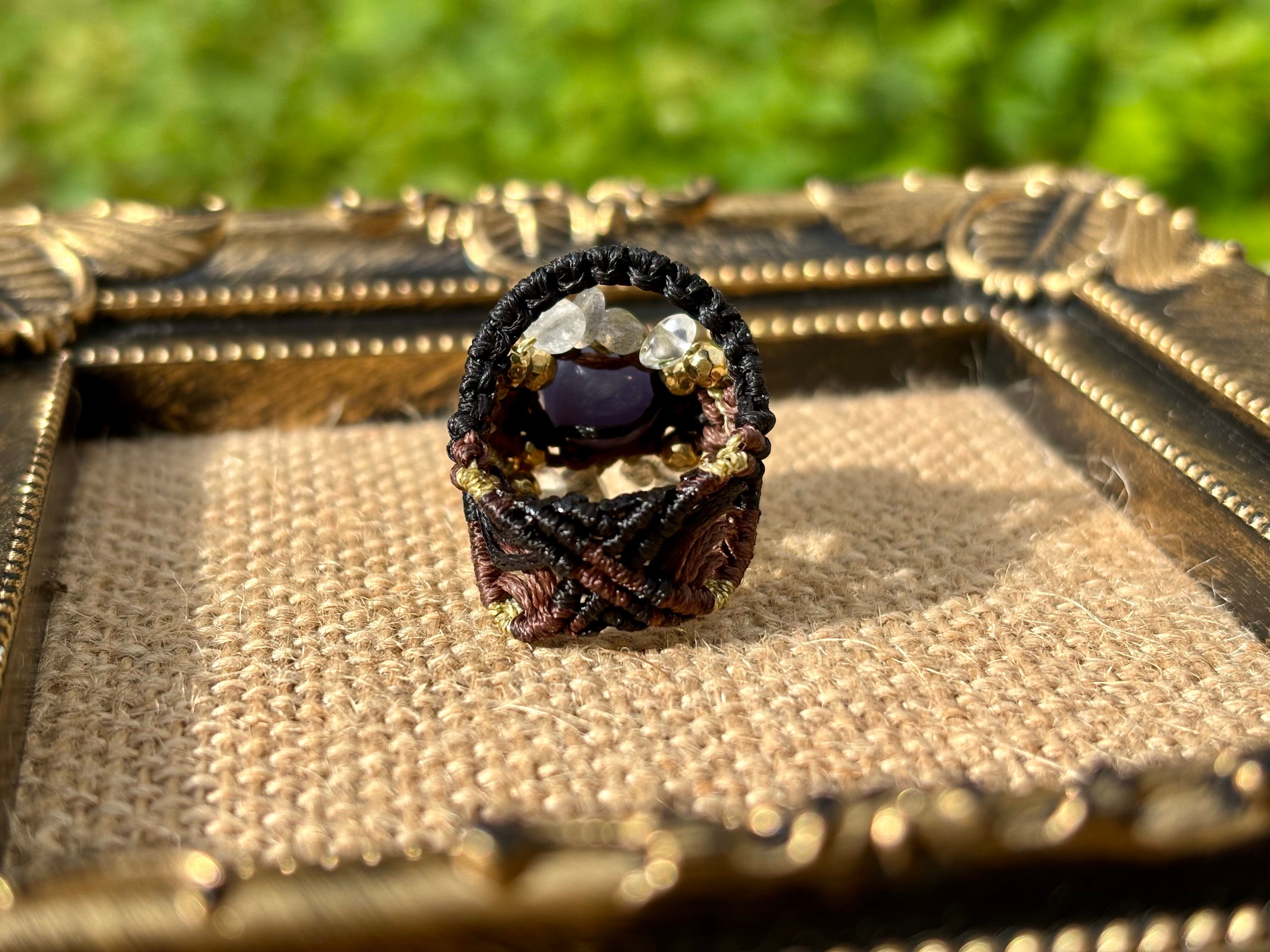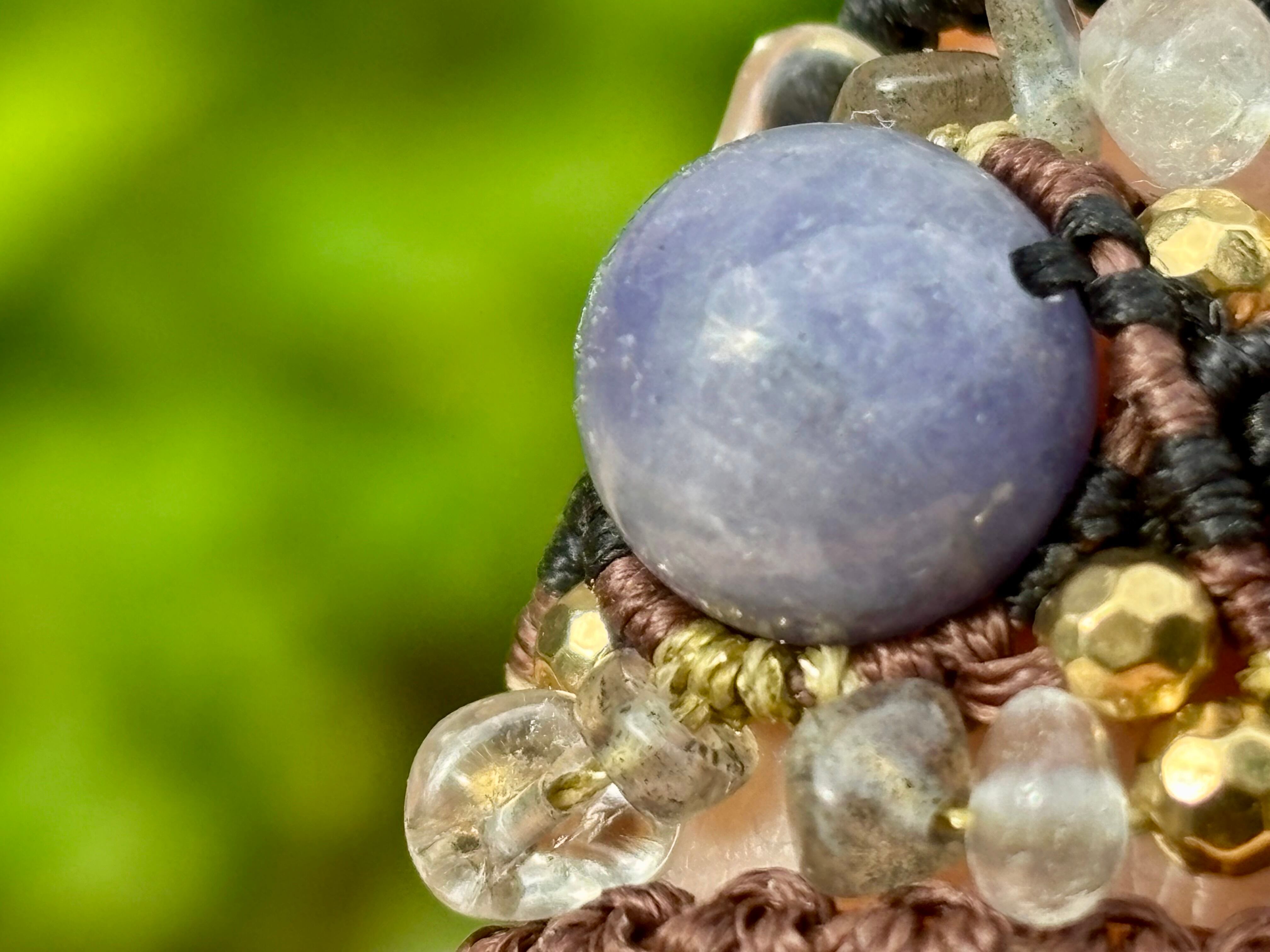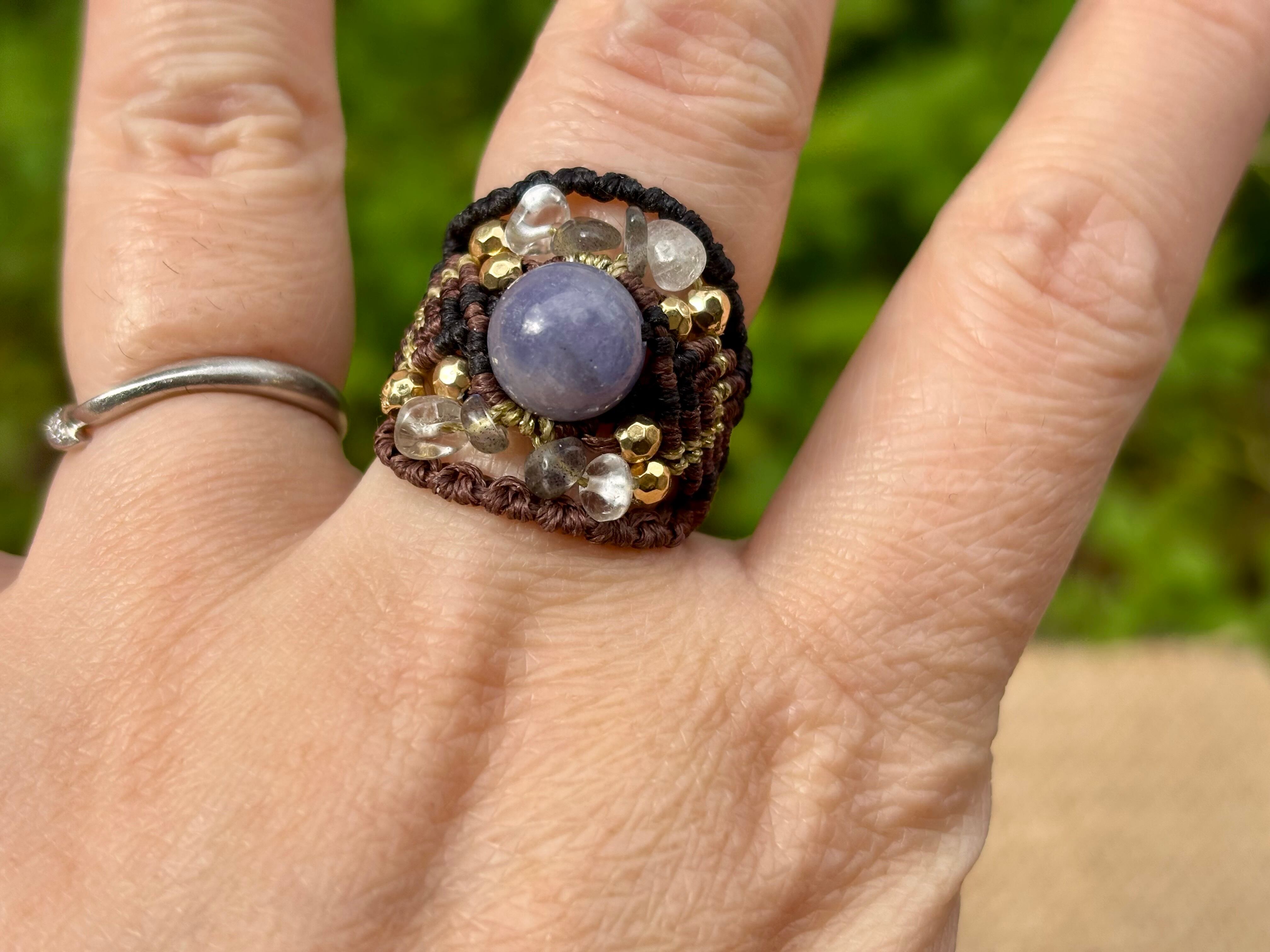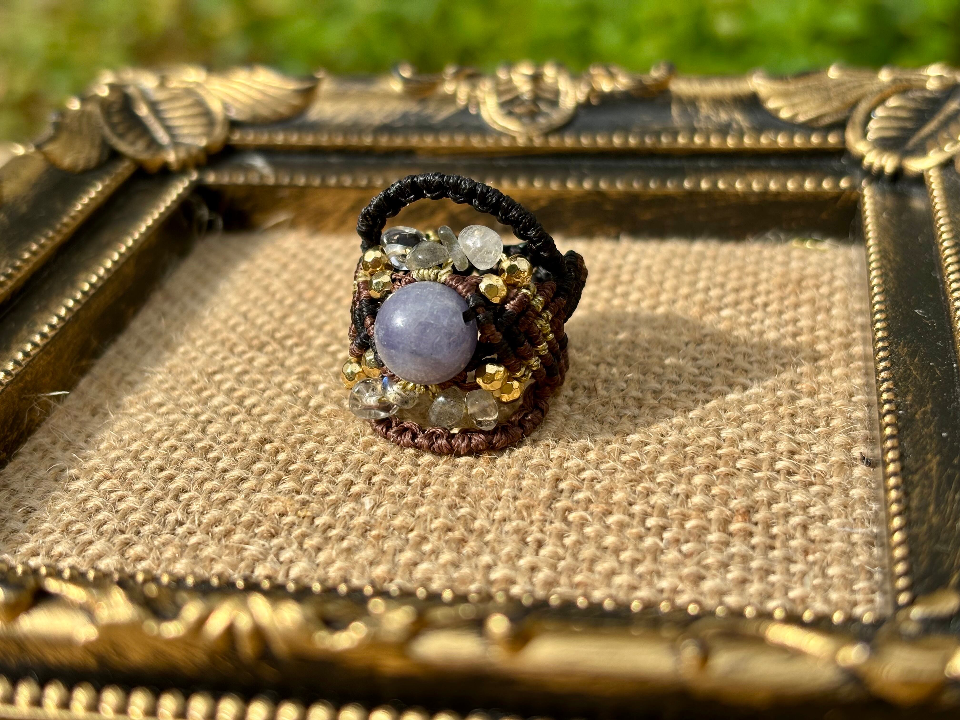 #893希少タンザナイト一点物(タンザナイト×水晶×ラブラドライト マクラメ編みリング/指輪)