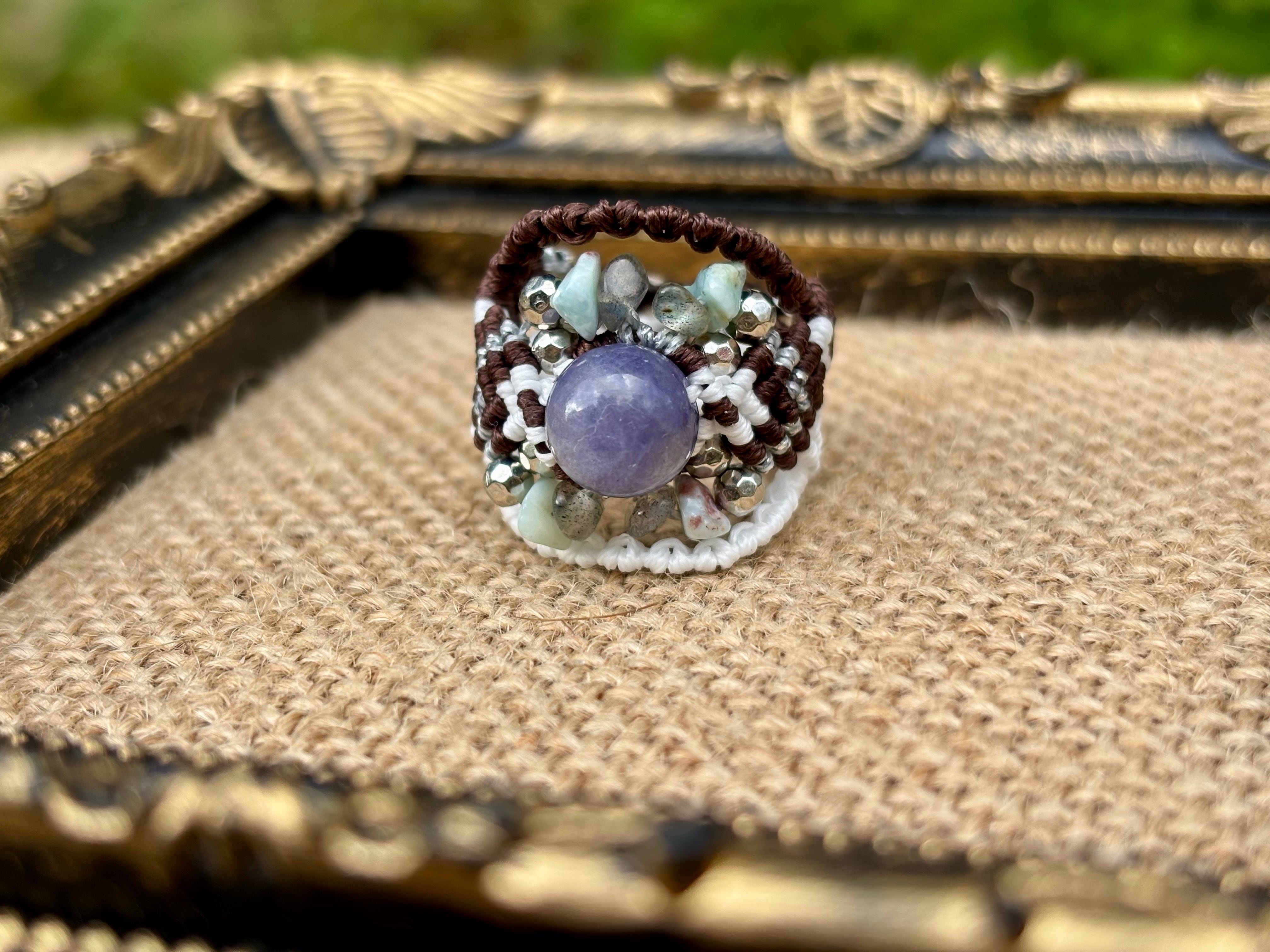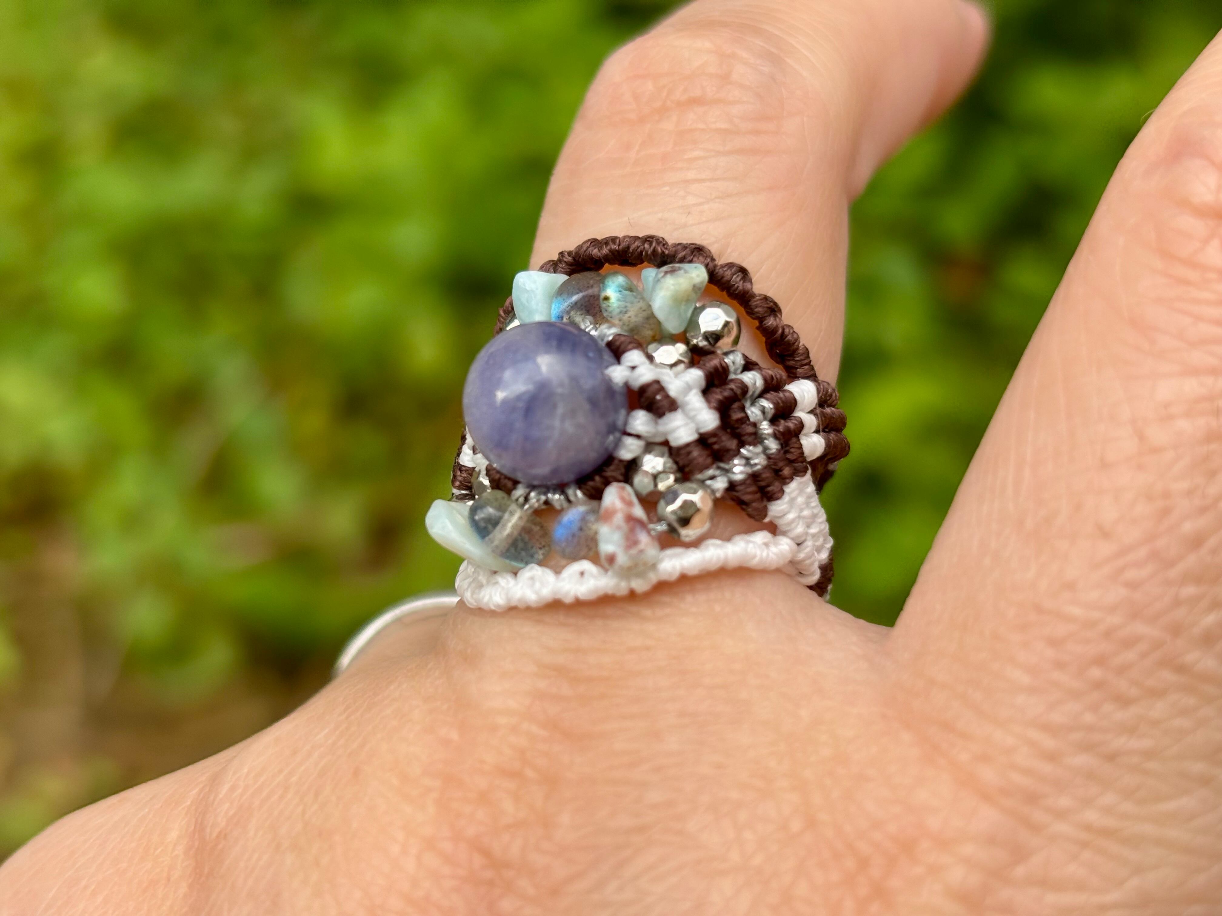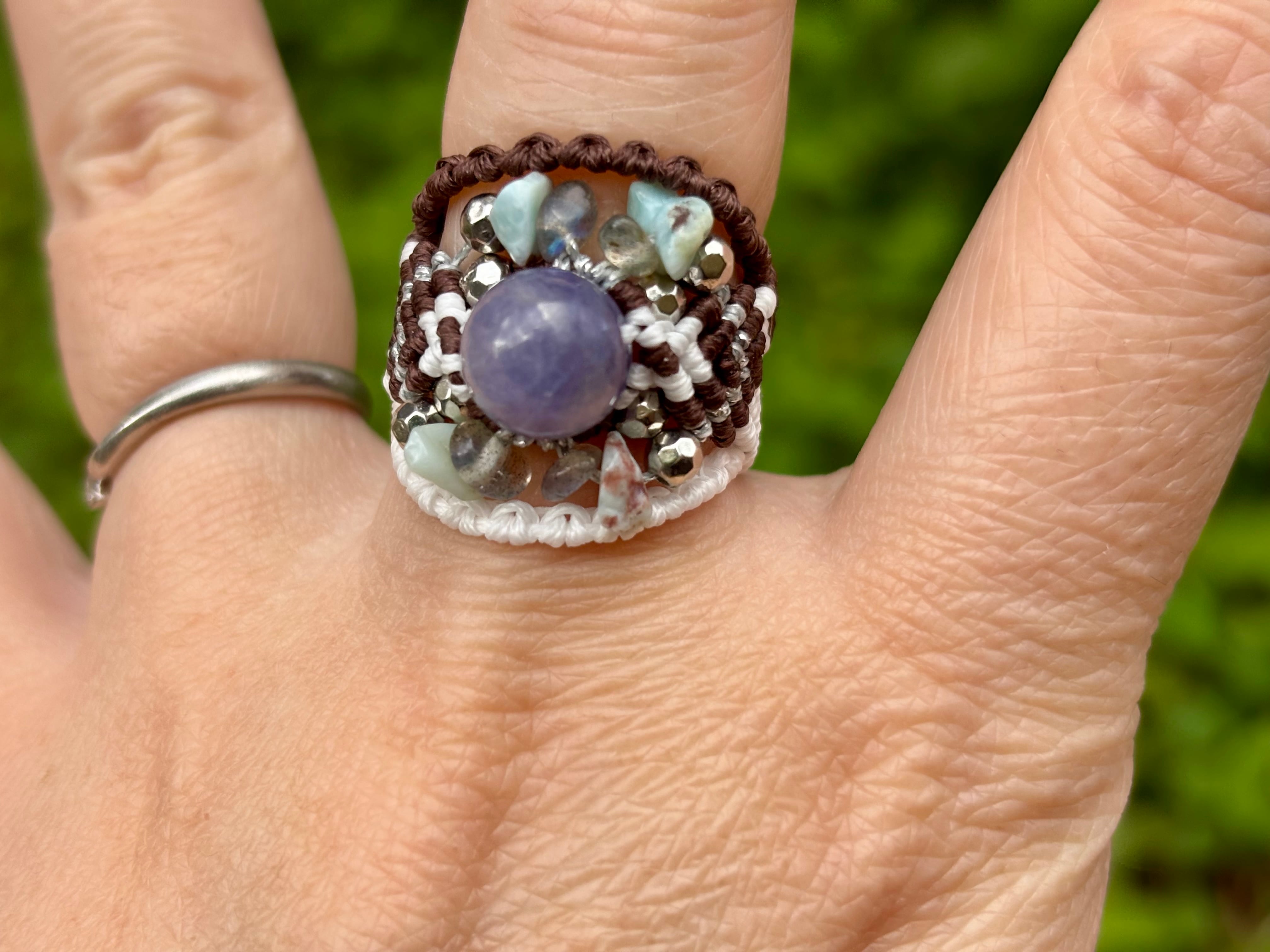 #895希少タンザナイト一点物(タンザナイト×ラリマー×ラブラドライト マクラメ編みリング/指輪)