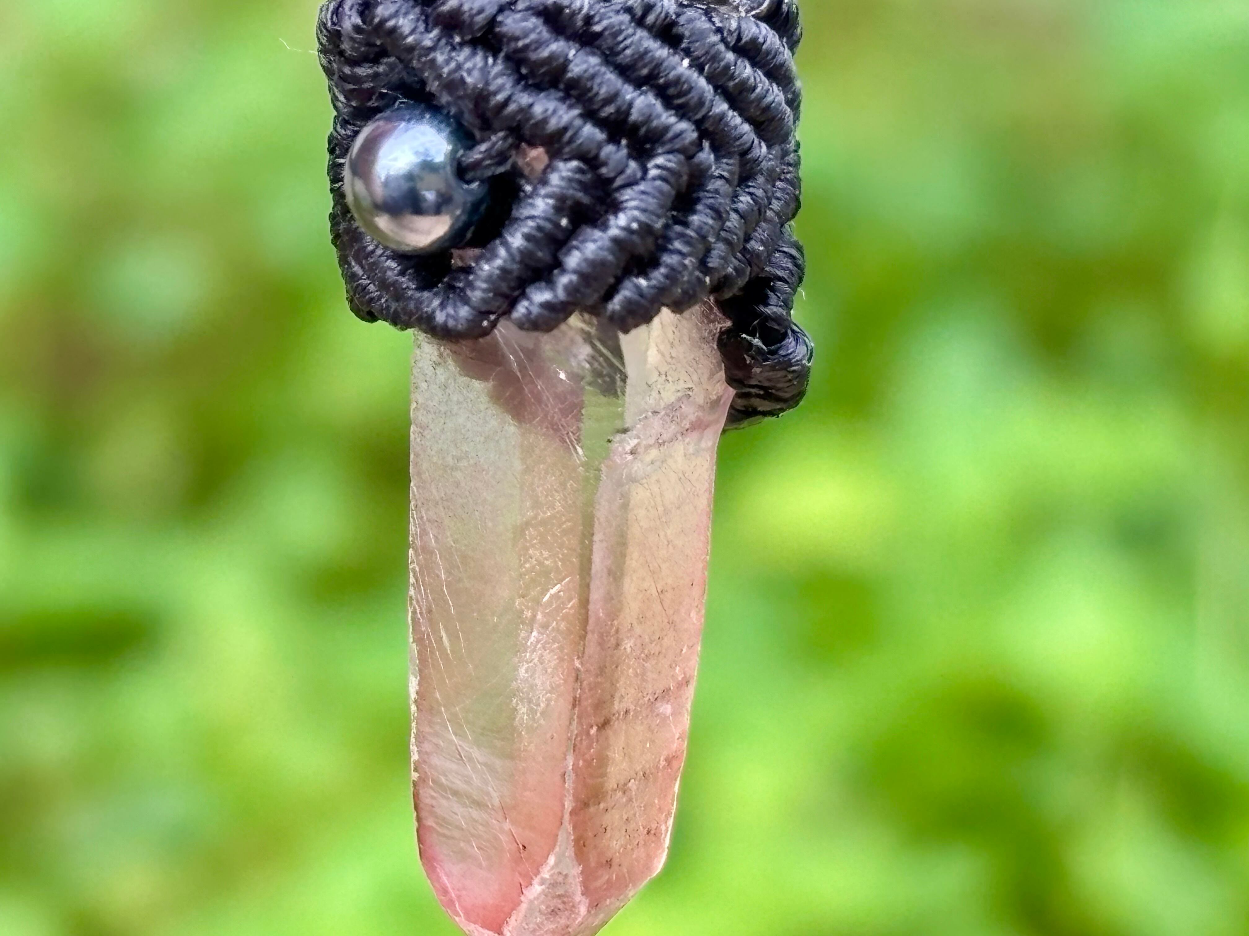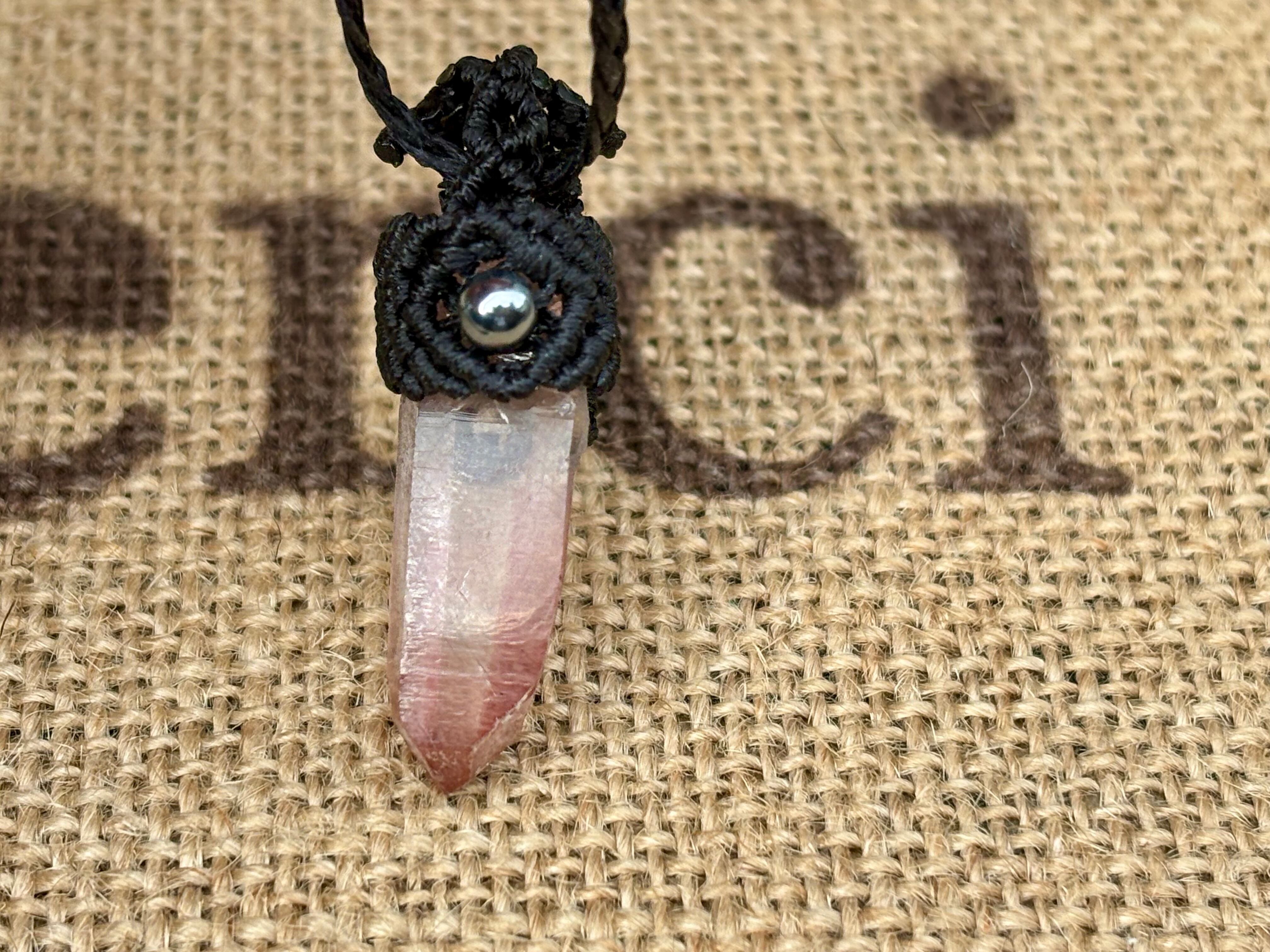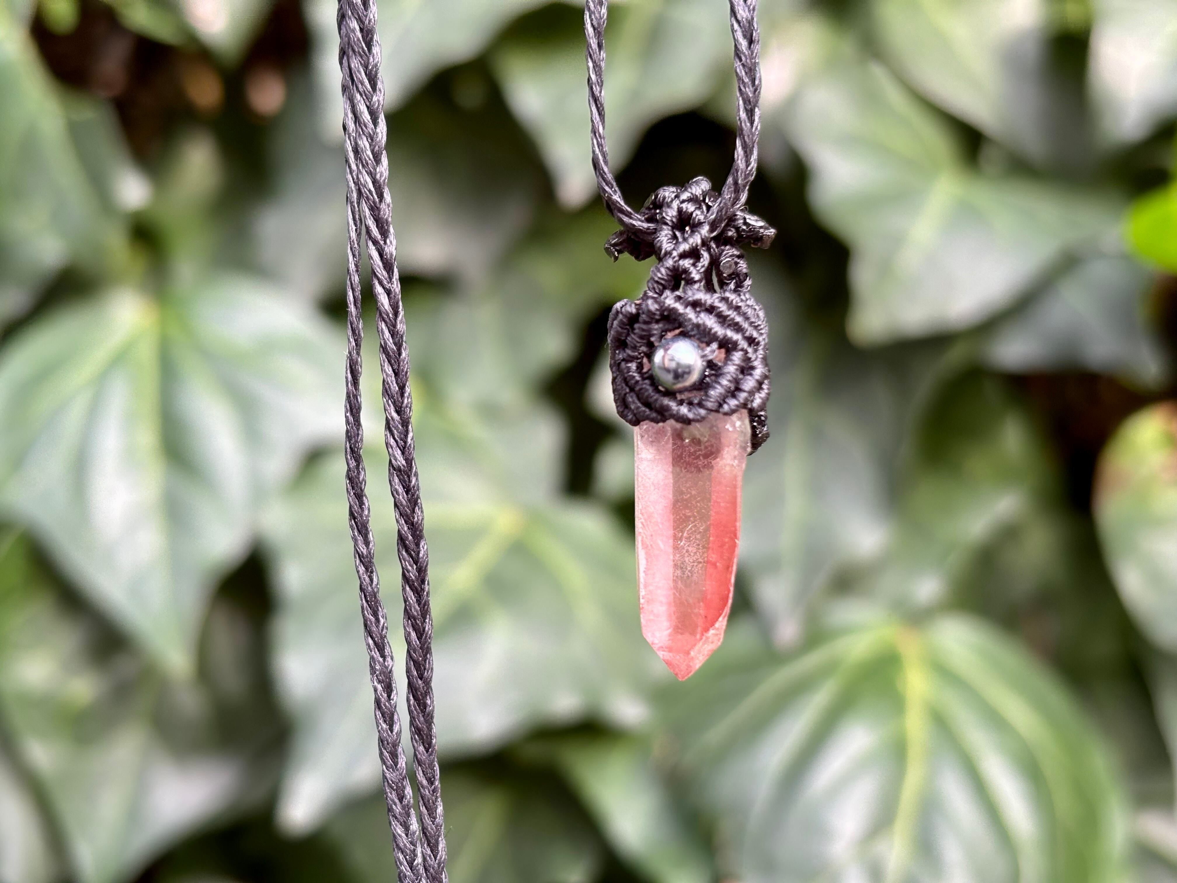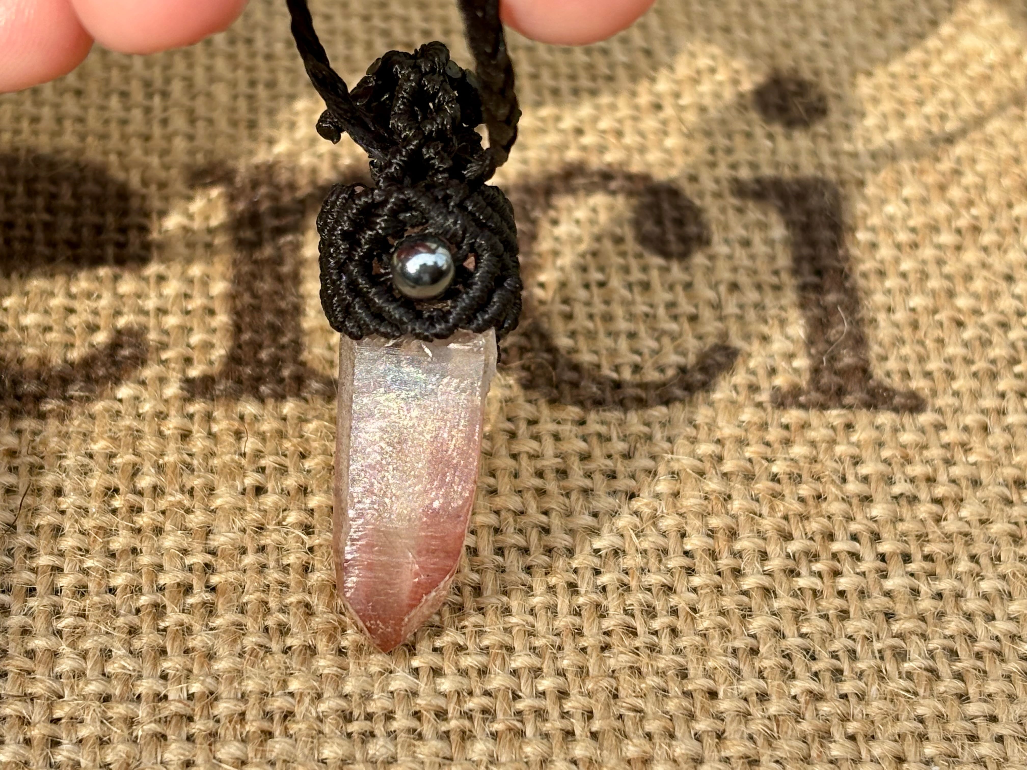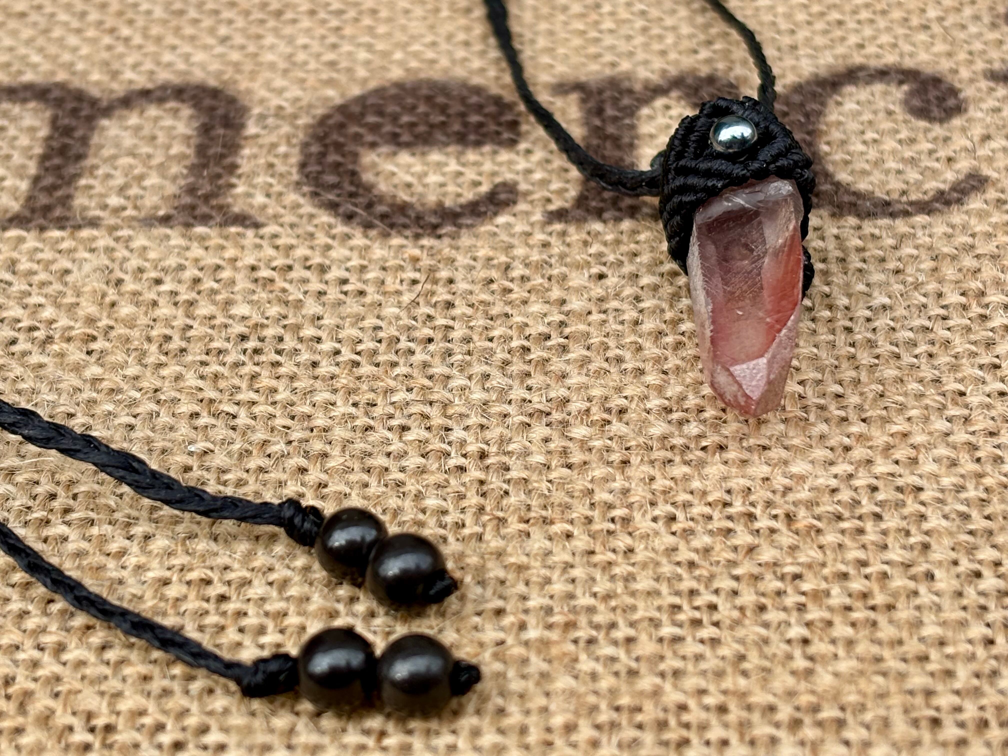 #908希少ピンクレムリアンシード一点物 (ピンクレムリアンシード×テラヘルツ×北投石 マクラメ編みデザインネックレス)