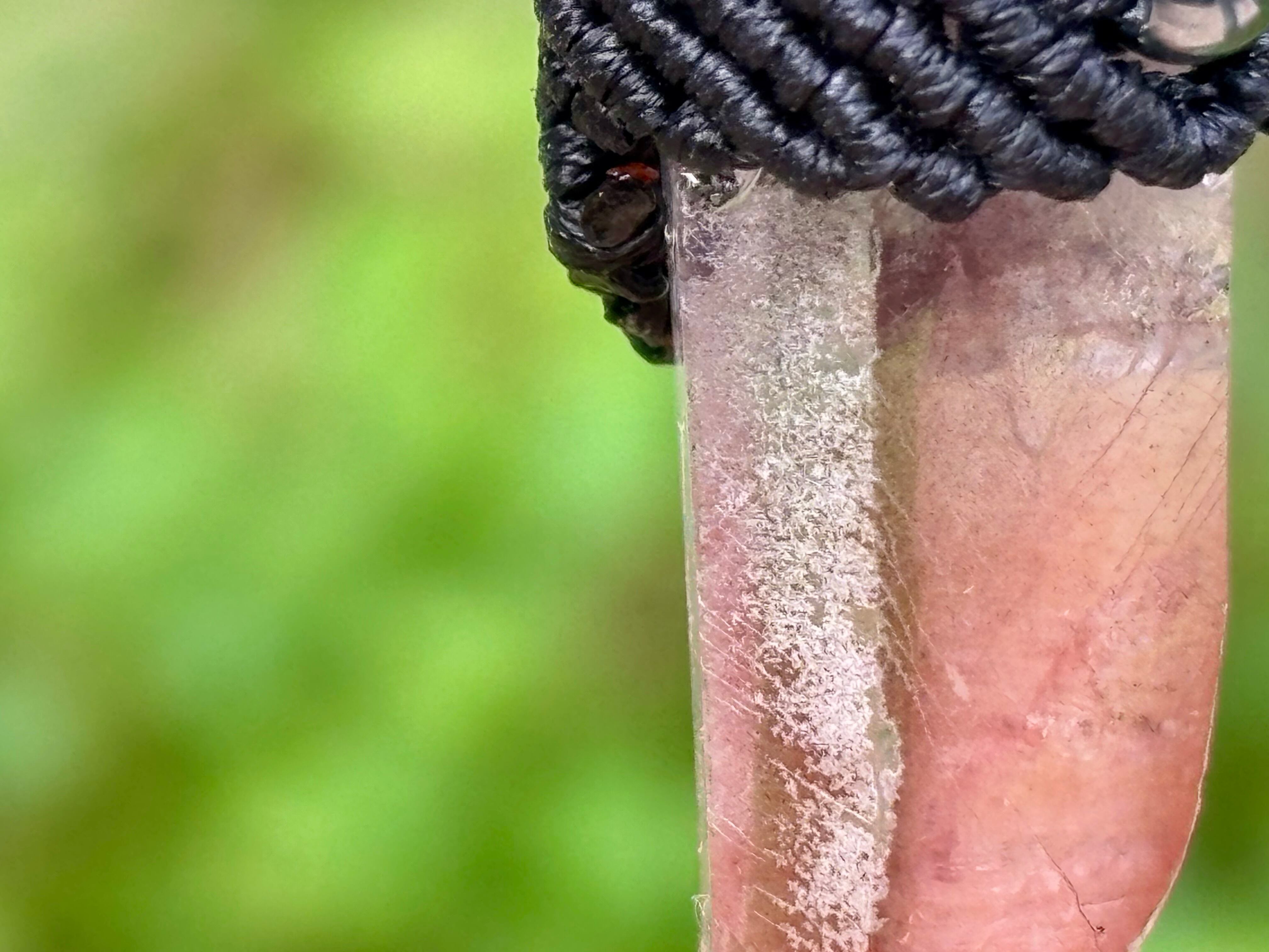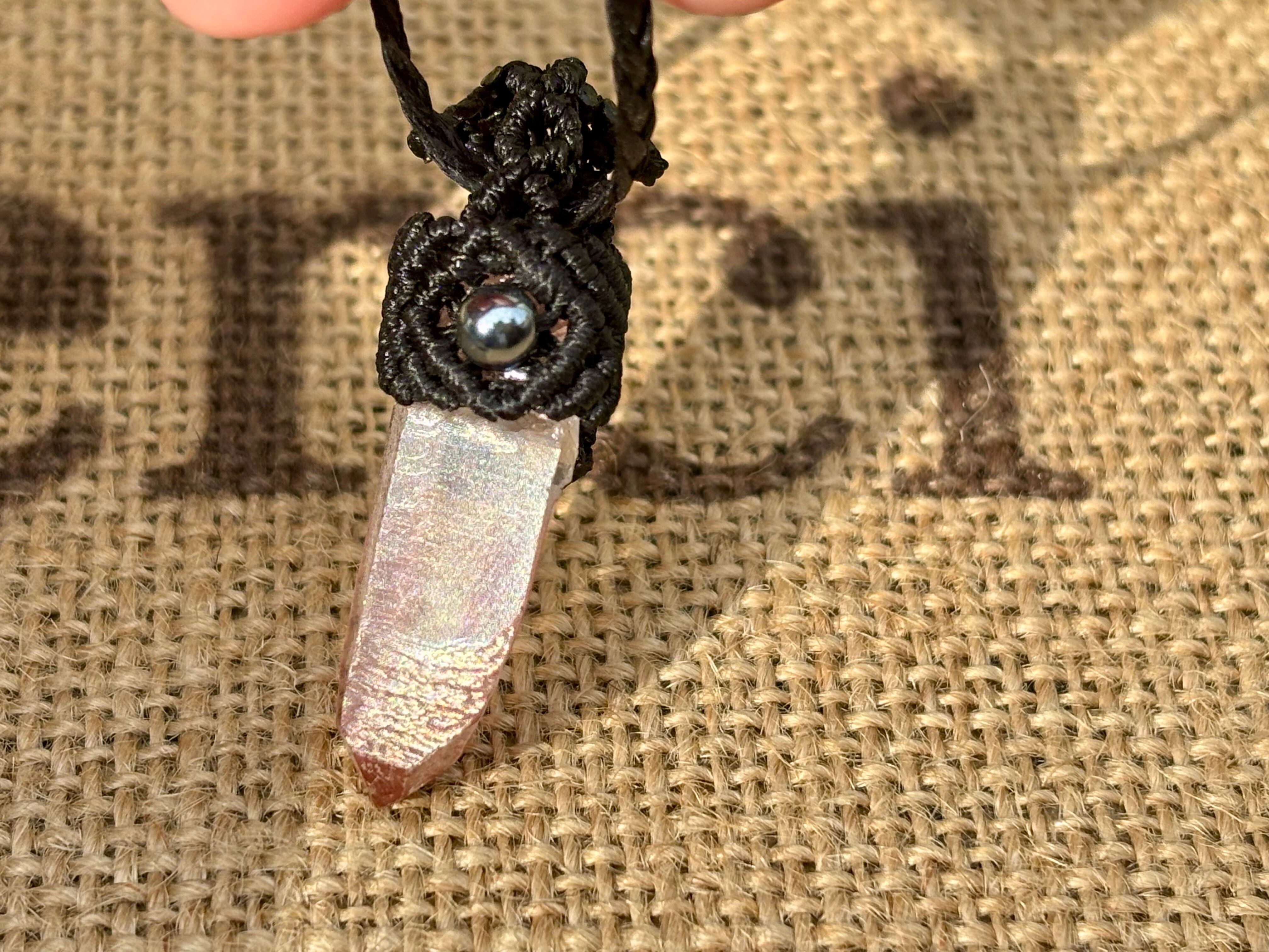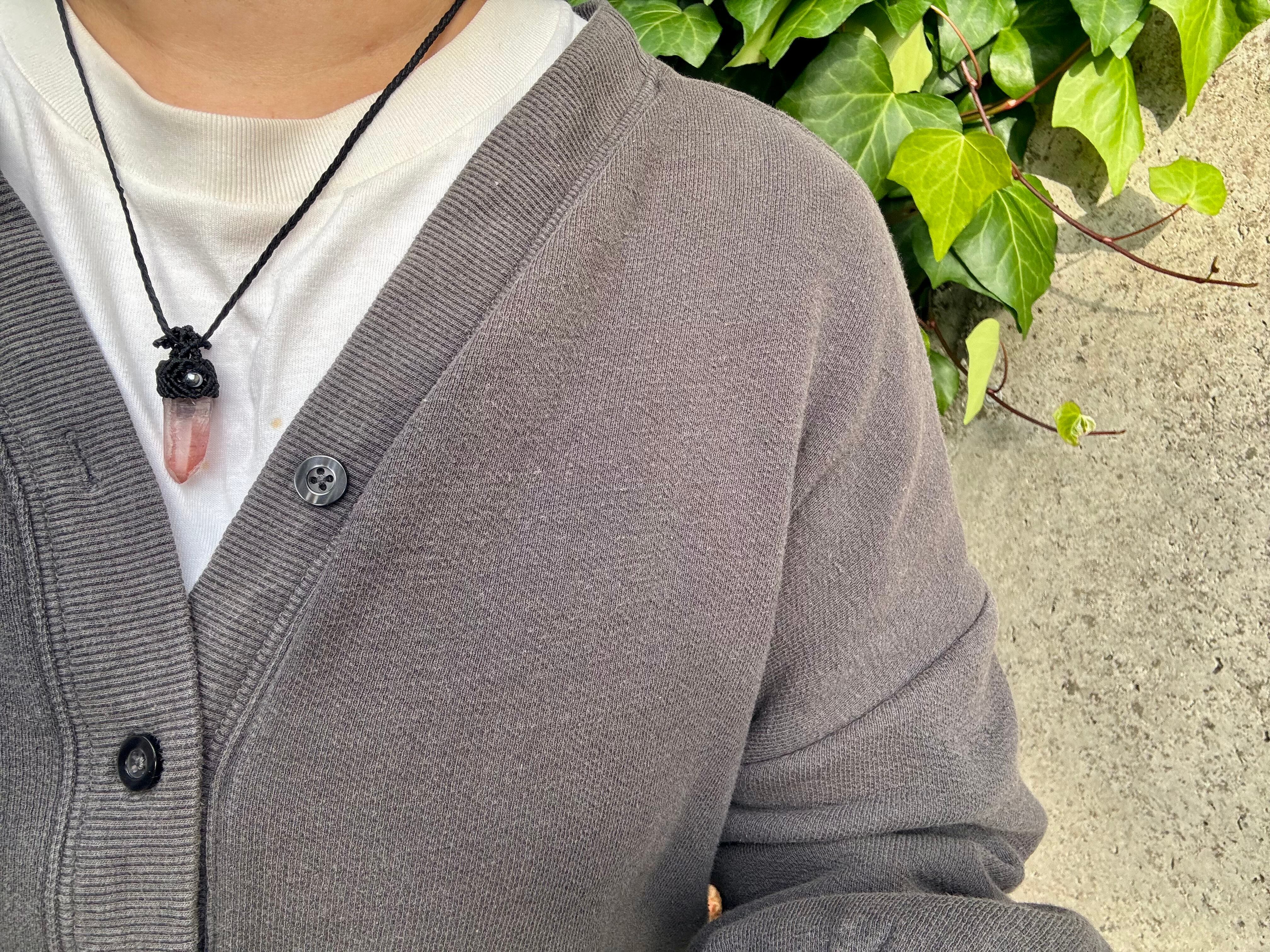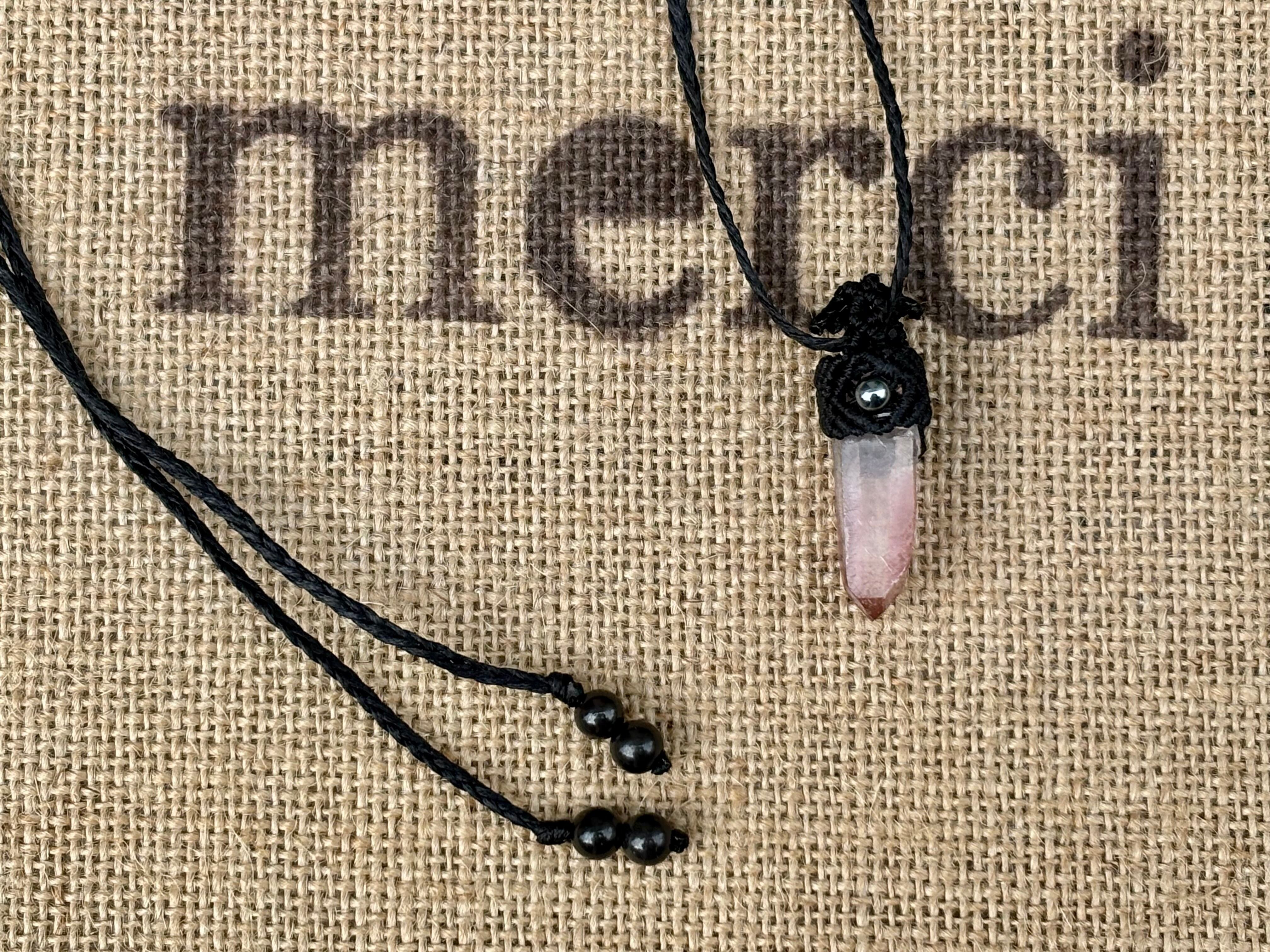 #908希少ピンクレムリアンシード一点物 (ピンクレムリアンシード×テラヘルツ×北投石 マクラメ編みデザインネックレス)