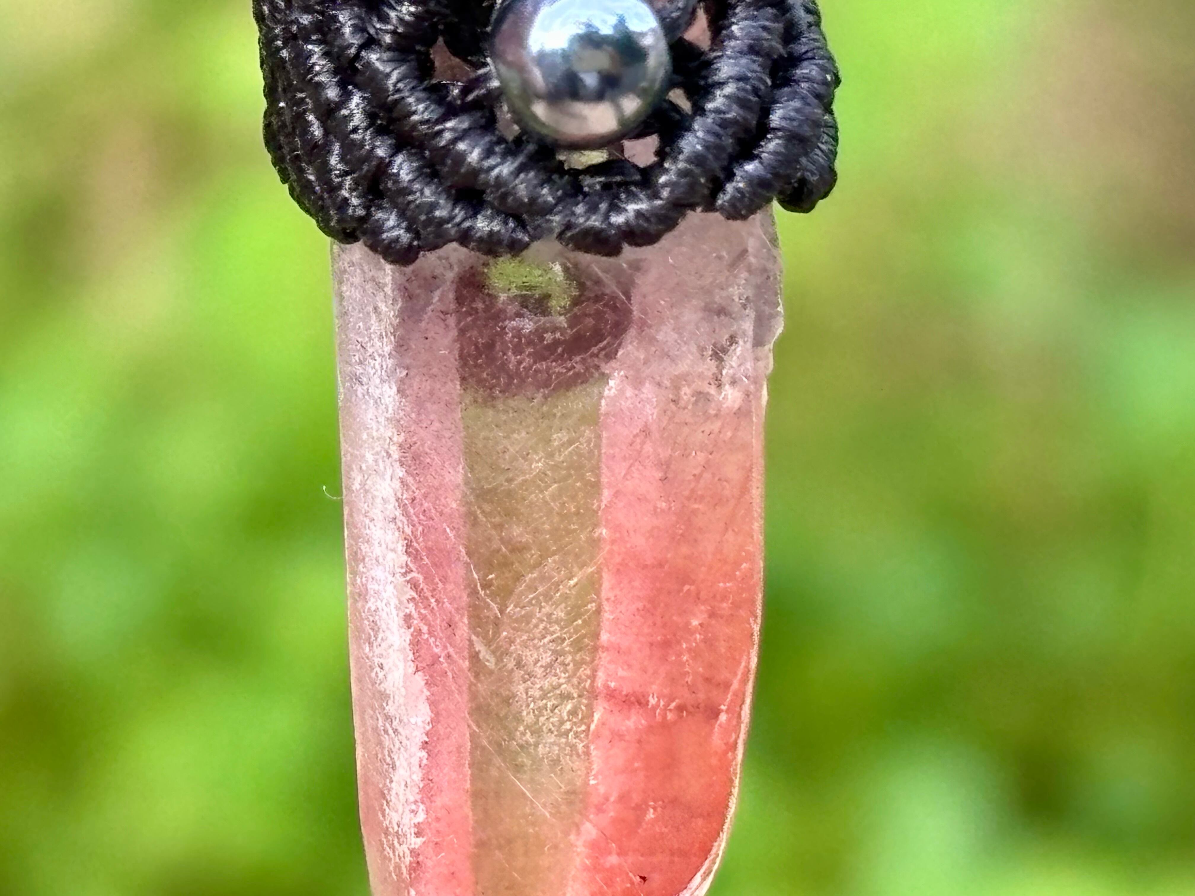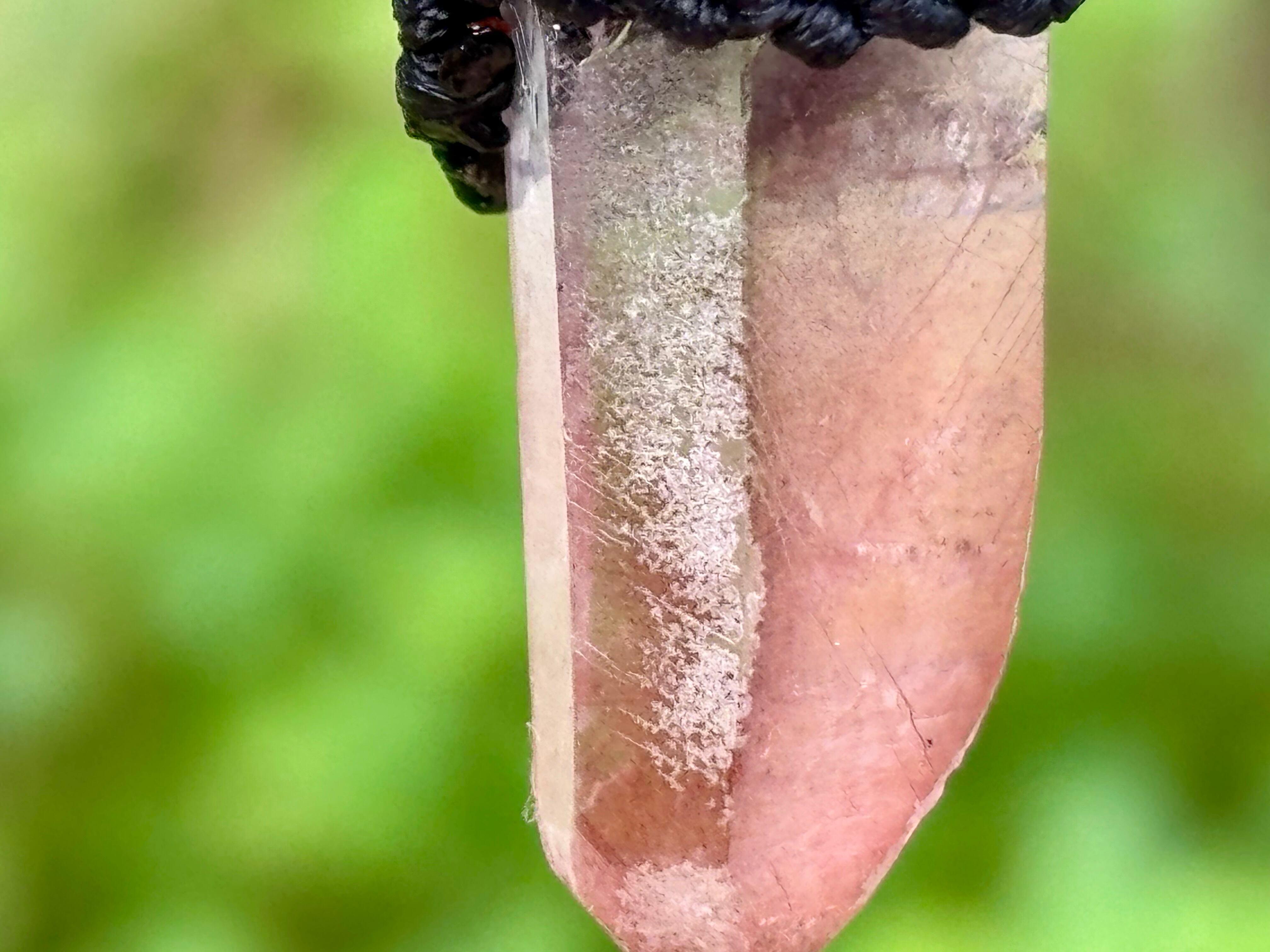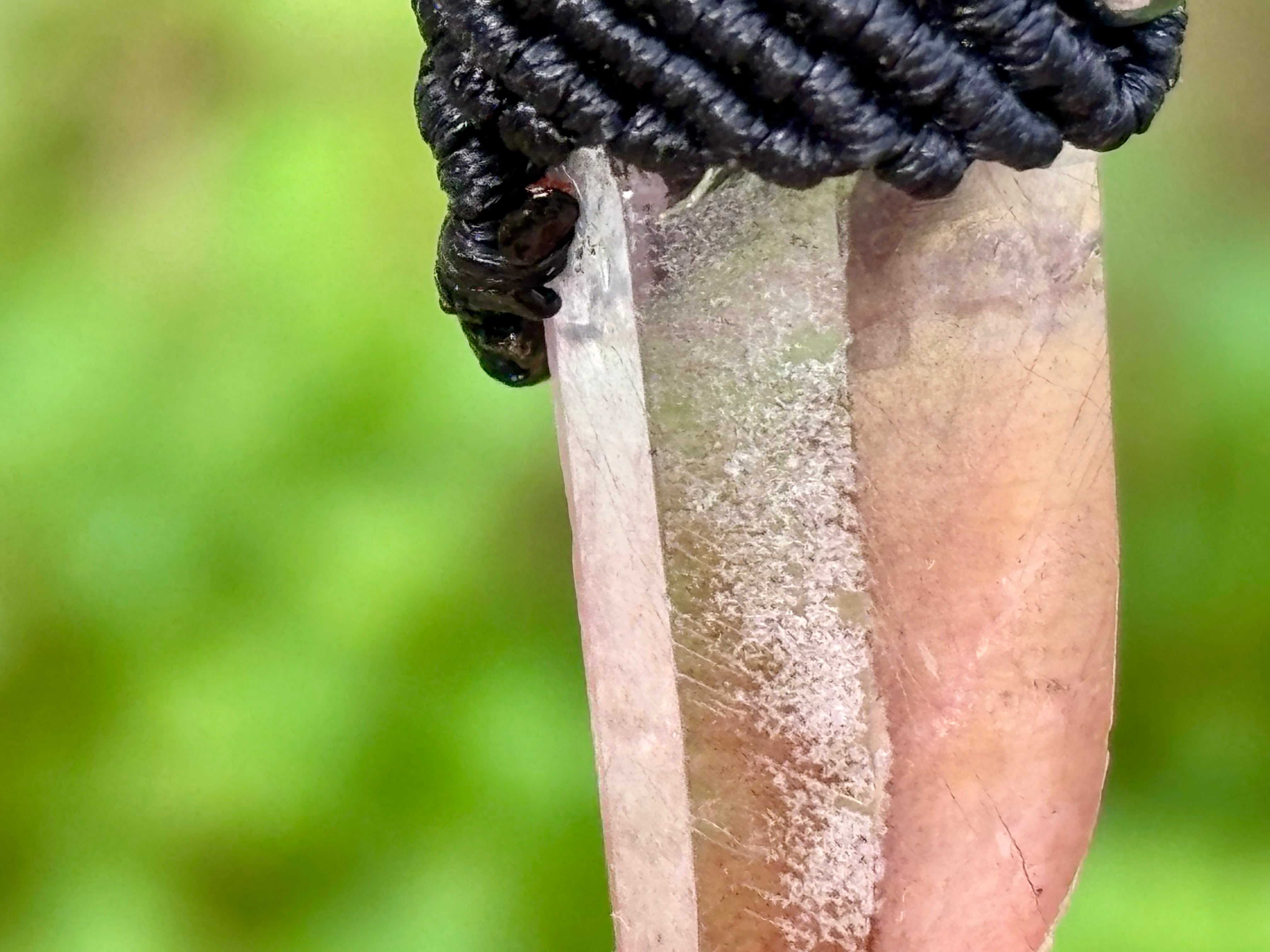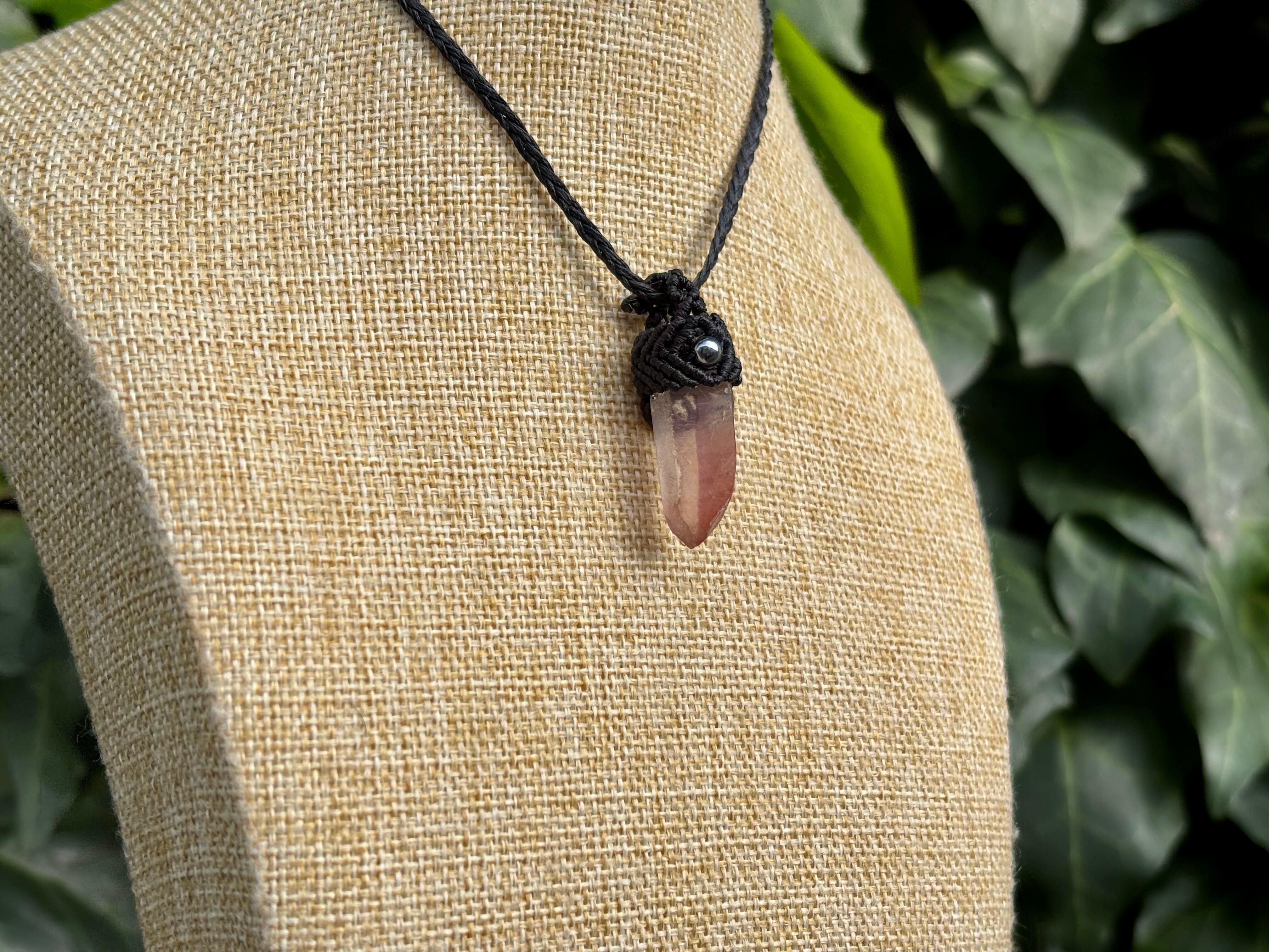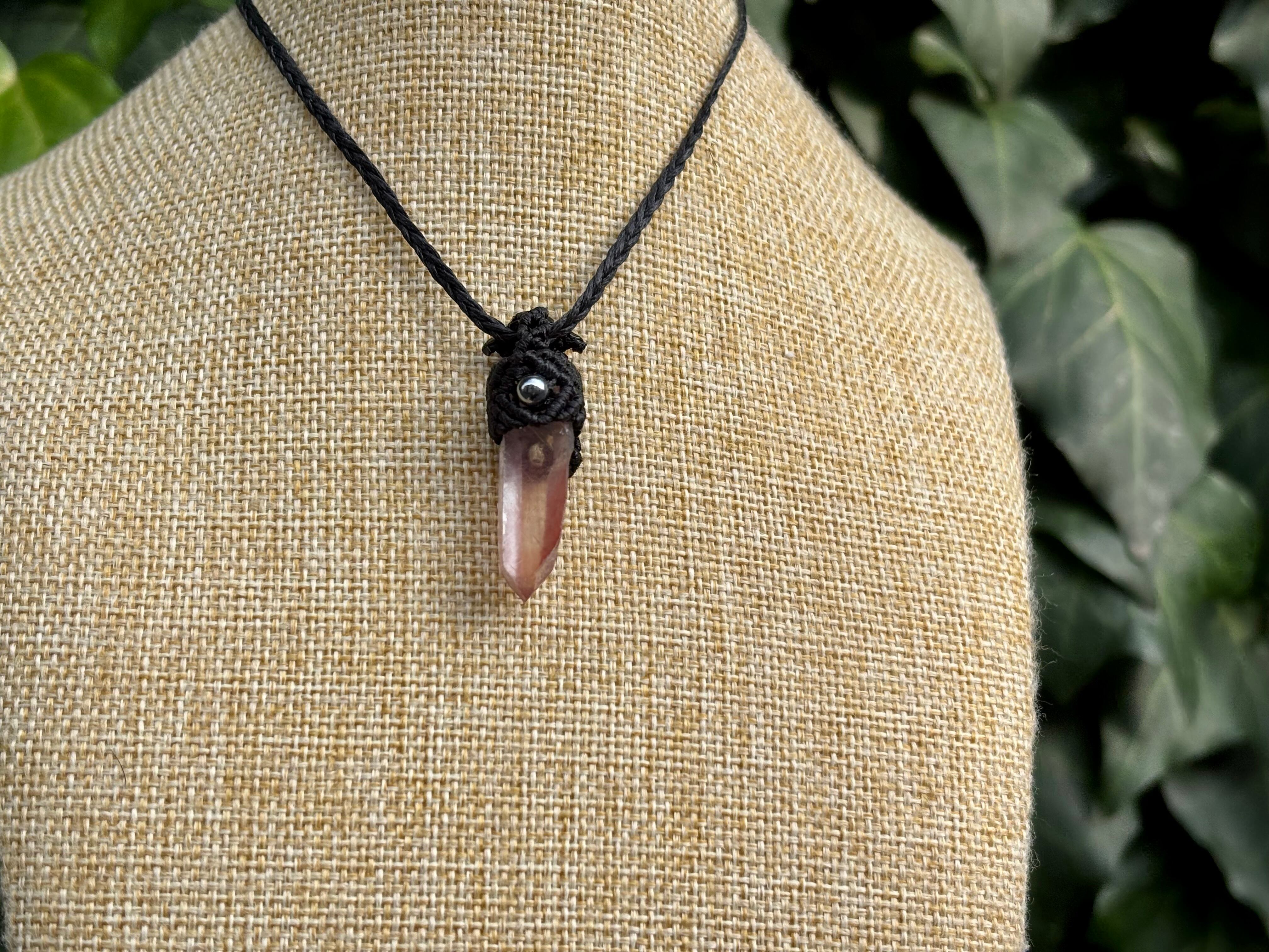 #908希少ピンクレムリアンシード一点物 (ピンクレムリアンシード×テラヘルツ×北投石 マクラメ編みデザインネックレス)