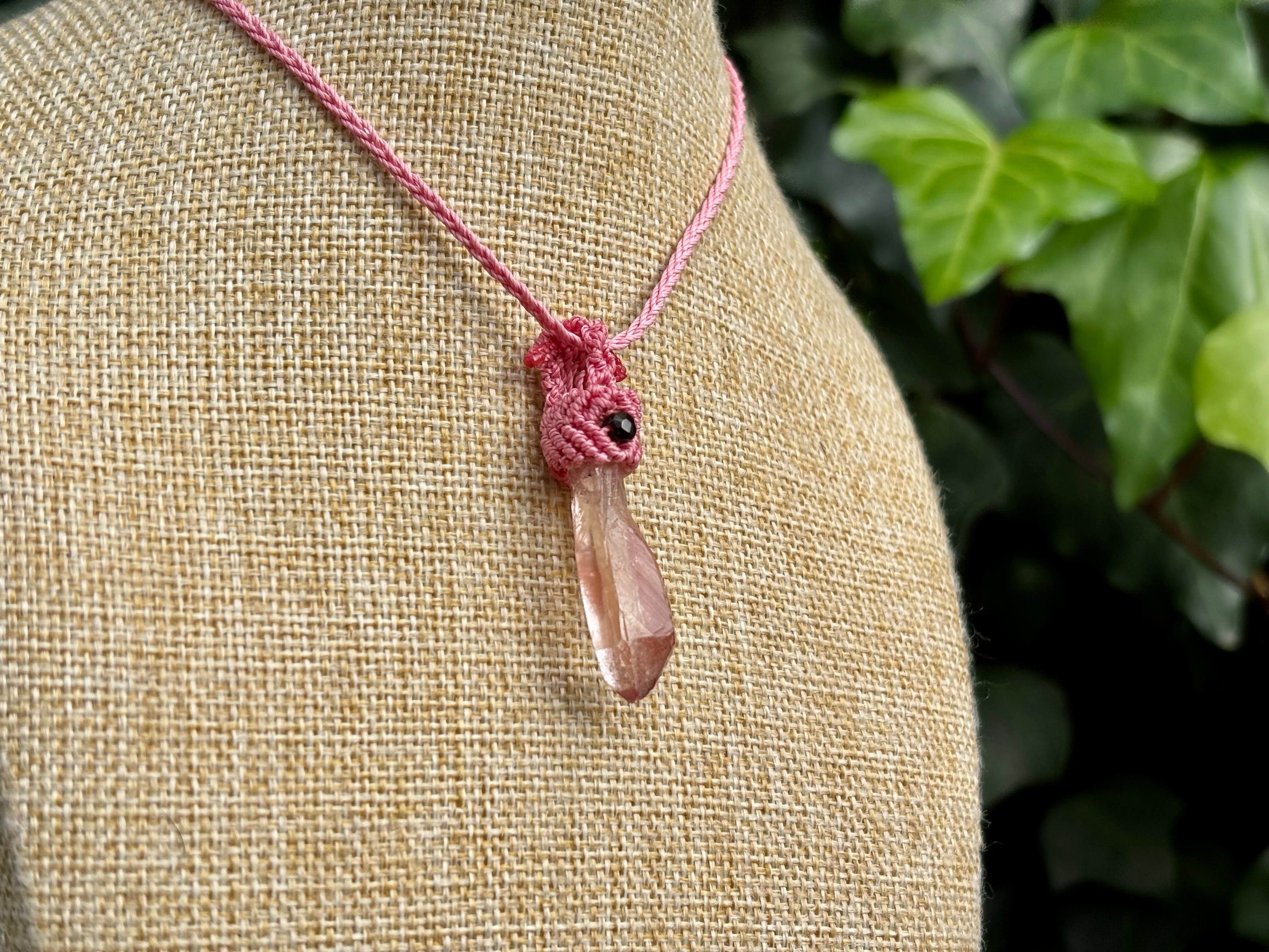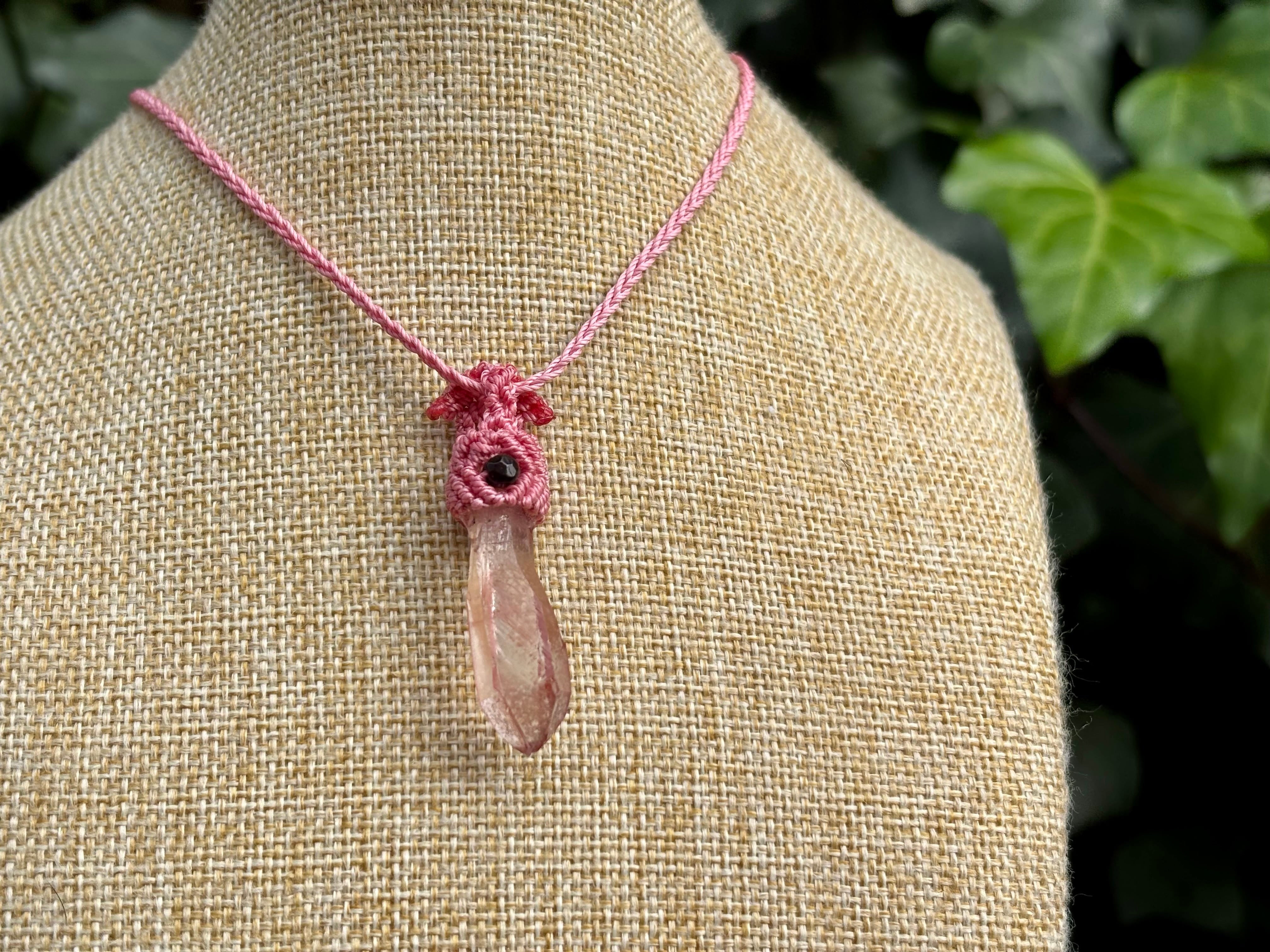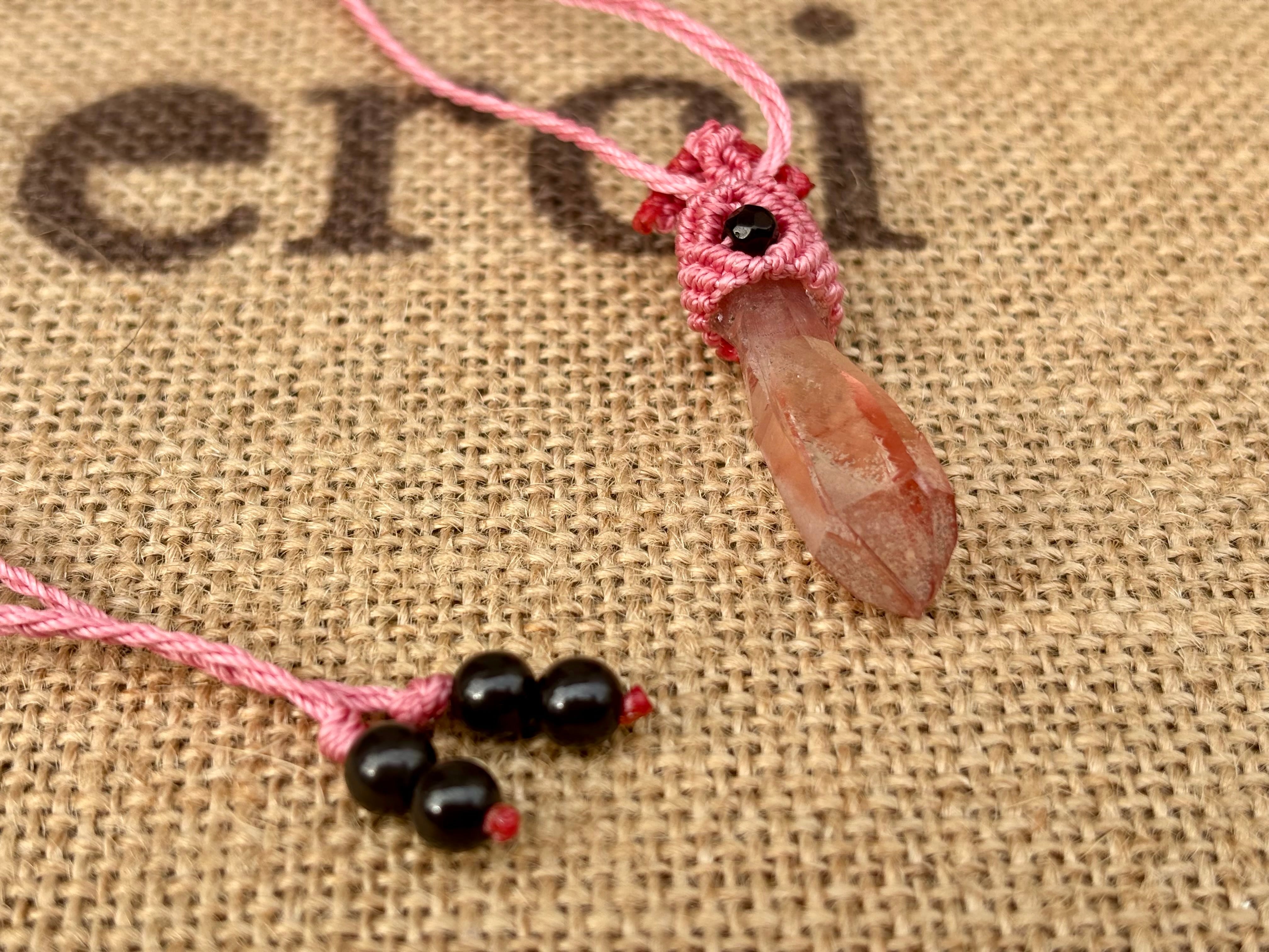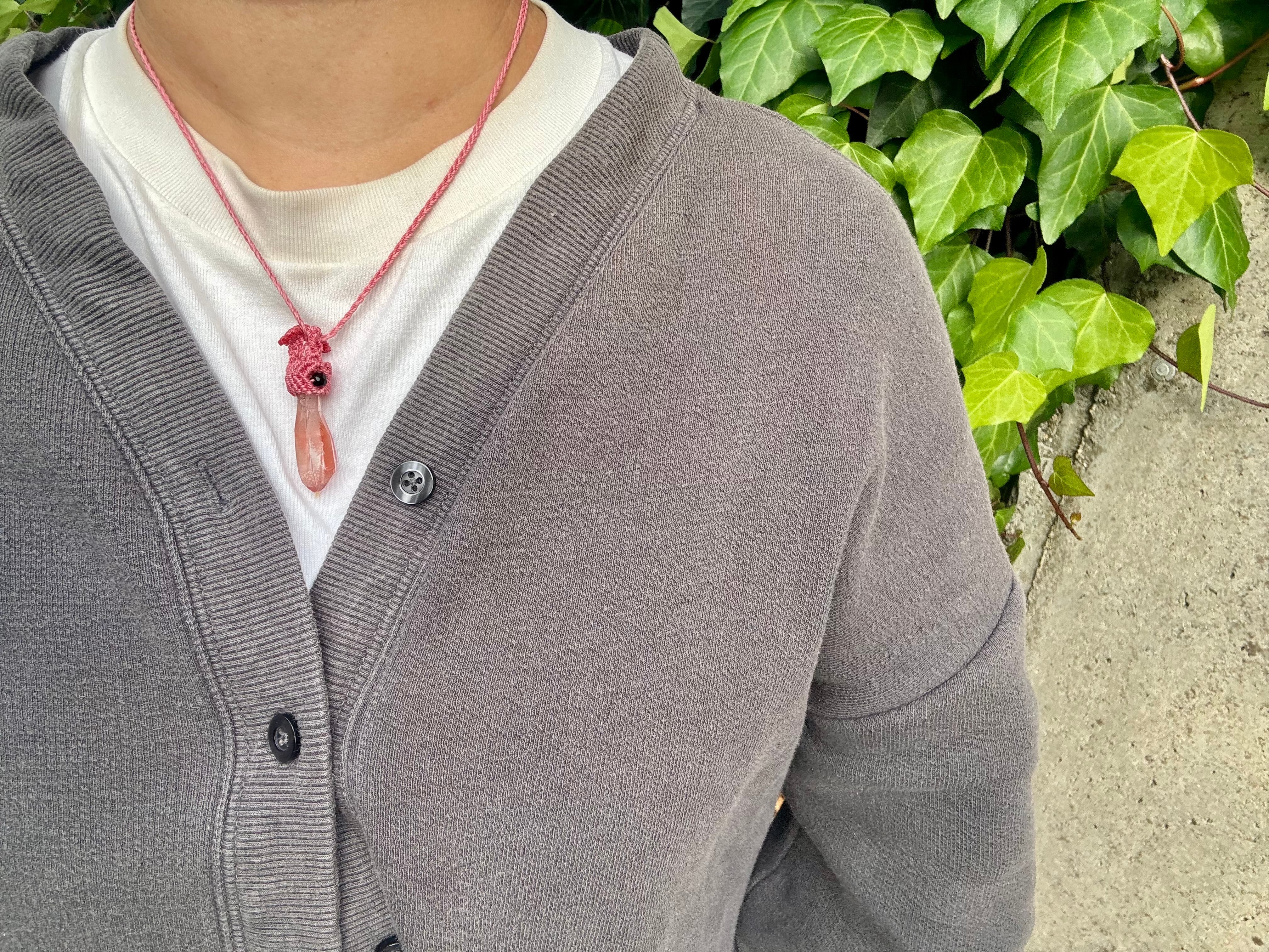 #909希少ピンクレムリアンシード一点物 (ピンクレムリアンシード×オニキス×北投石 マクラメ編みデザインネックレス)
