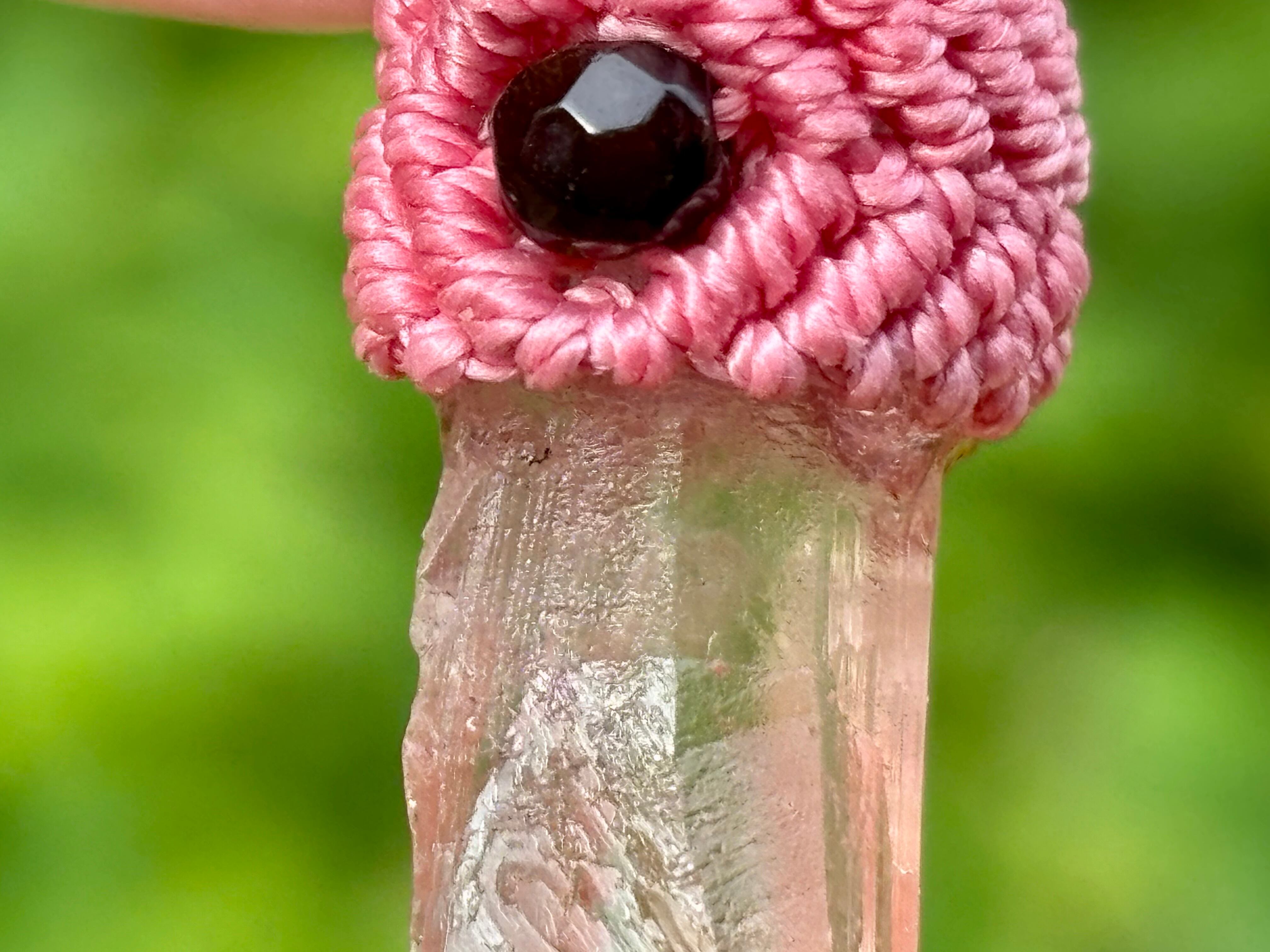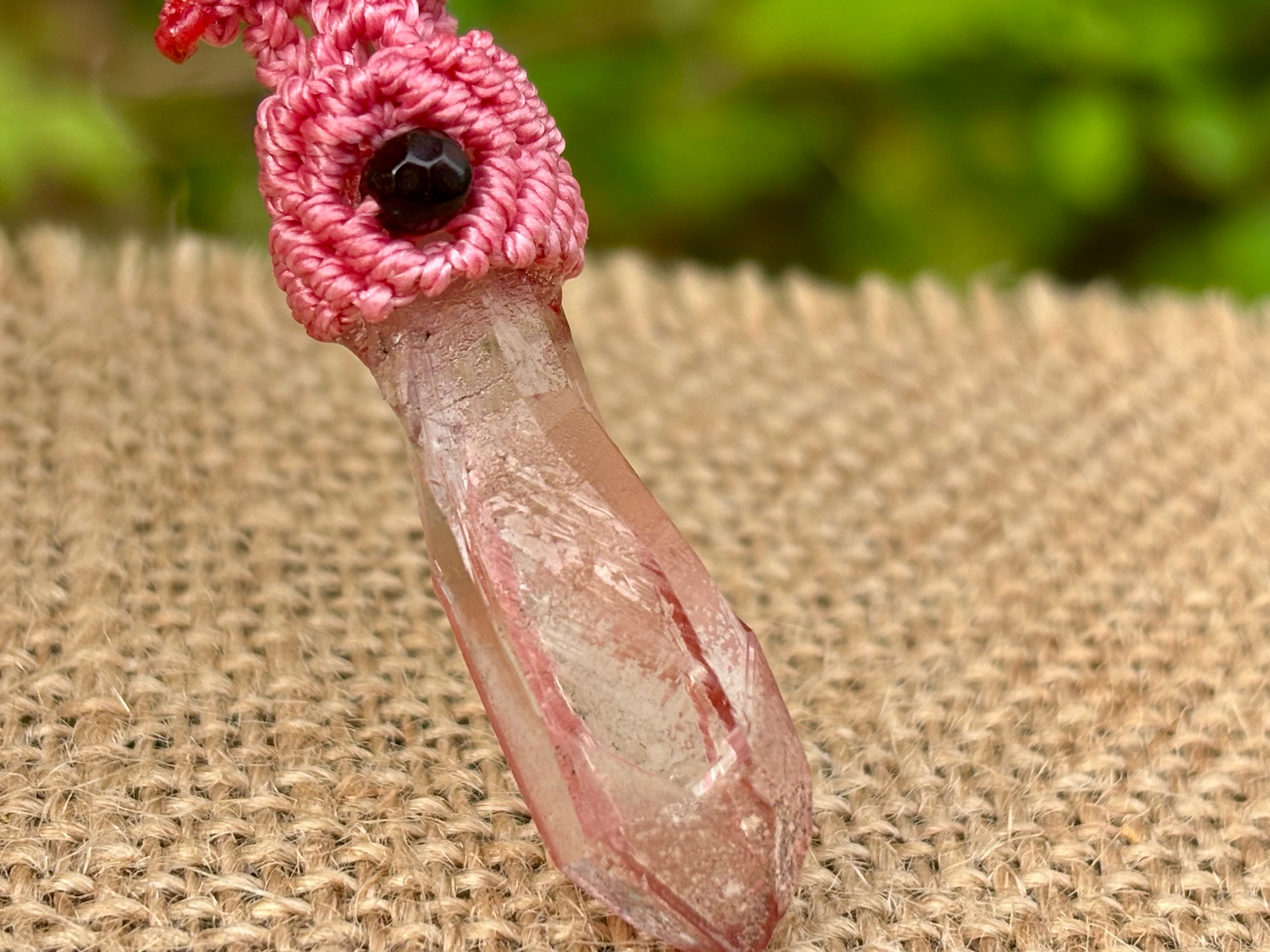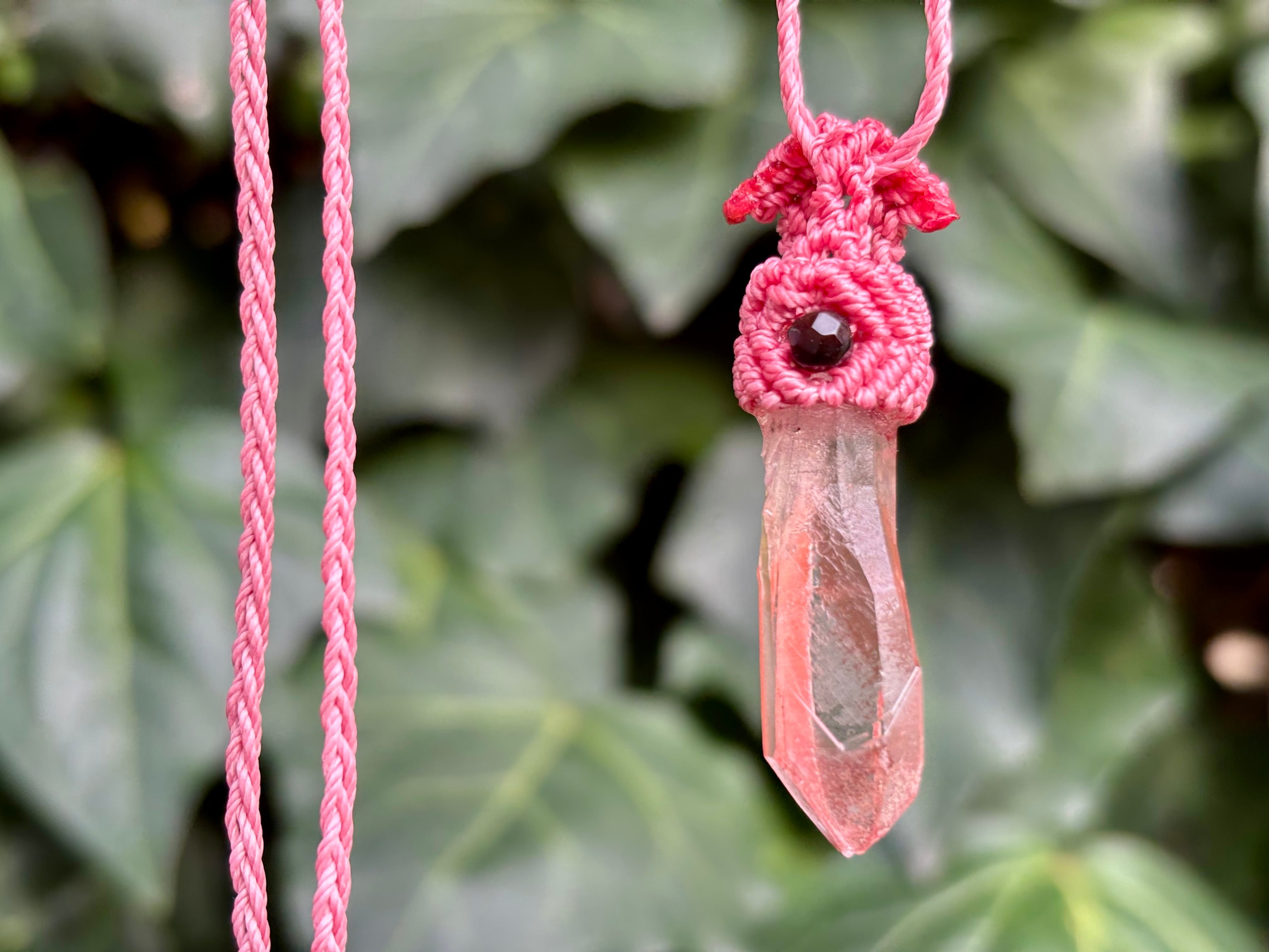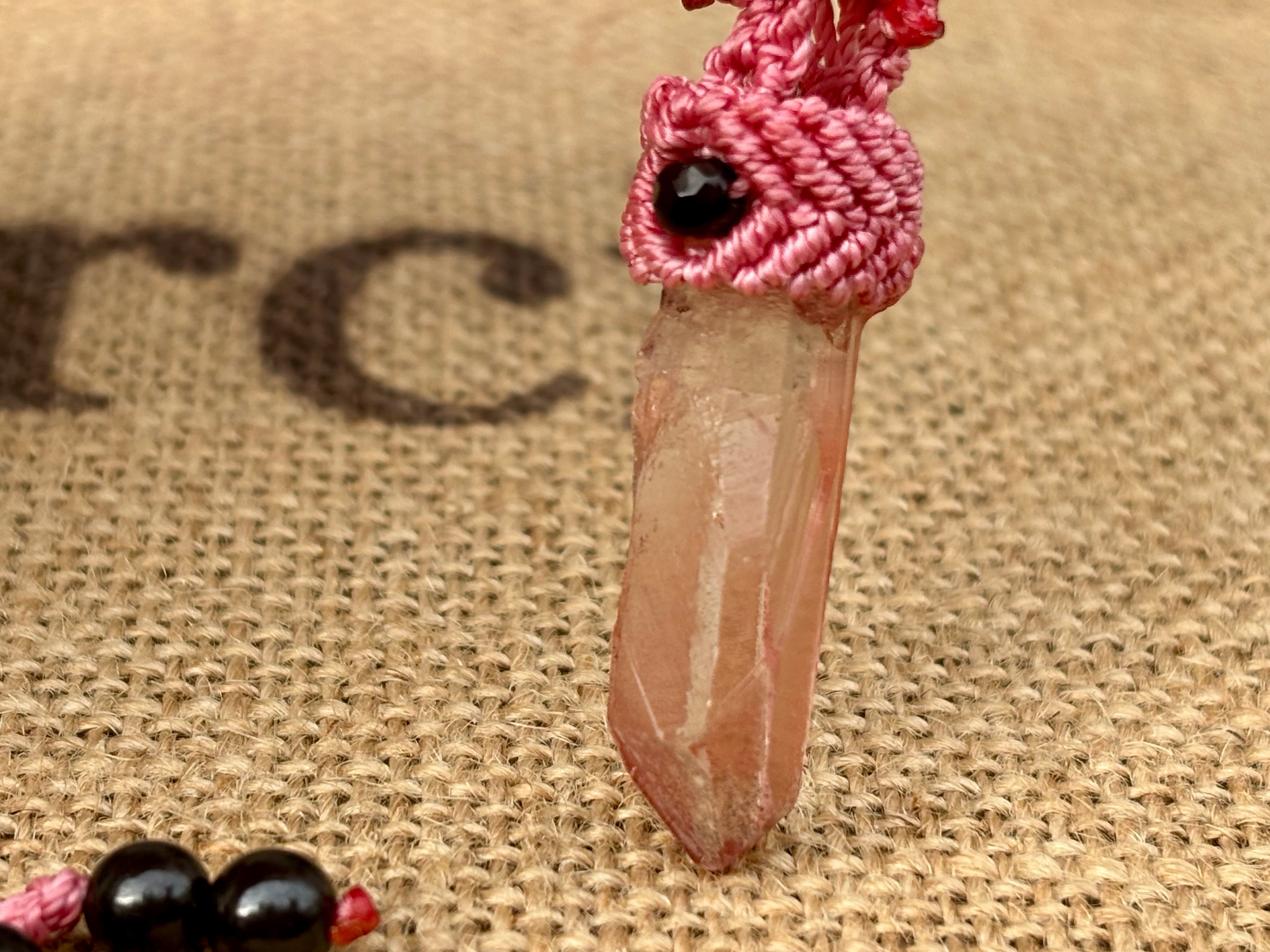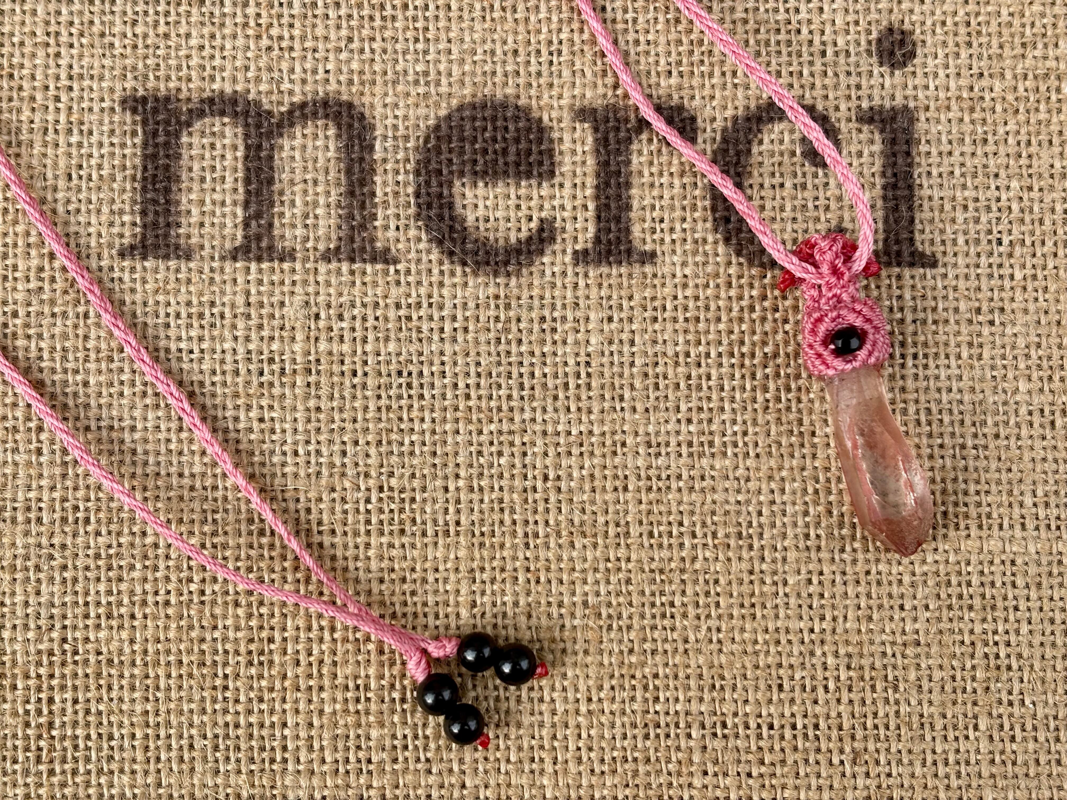 #909希少ピンクレムリアンシード一点物 (ピンクレムリアンシード×オニキス×北投石 マクラメ編みデザインネックレス)