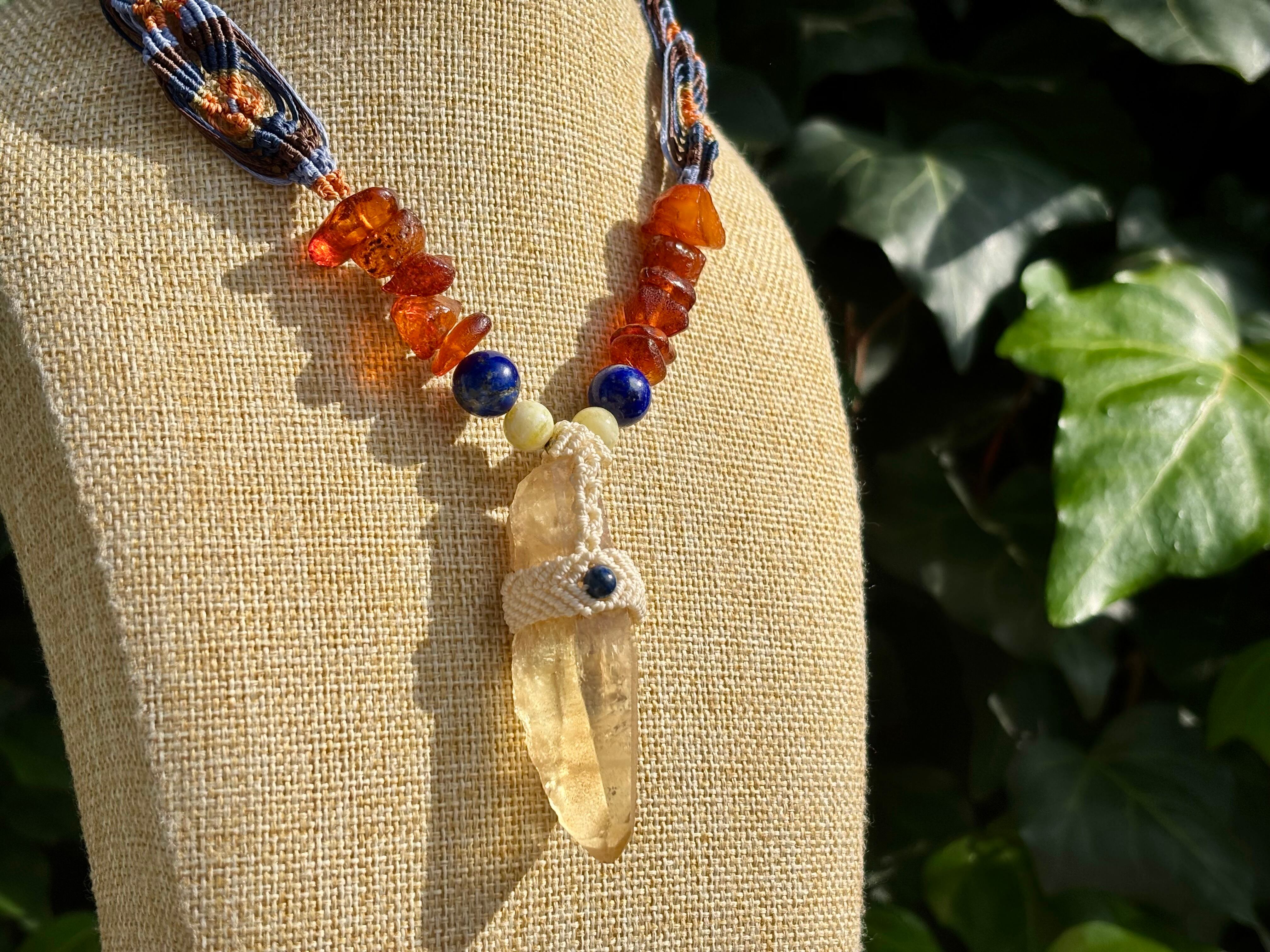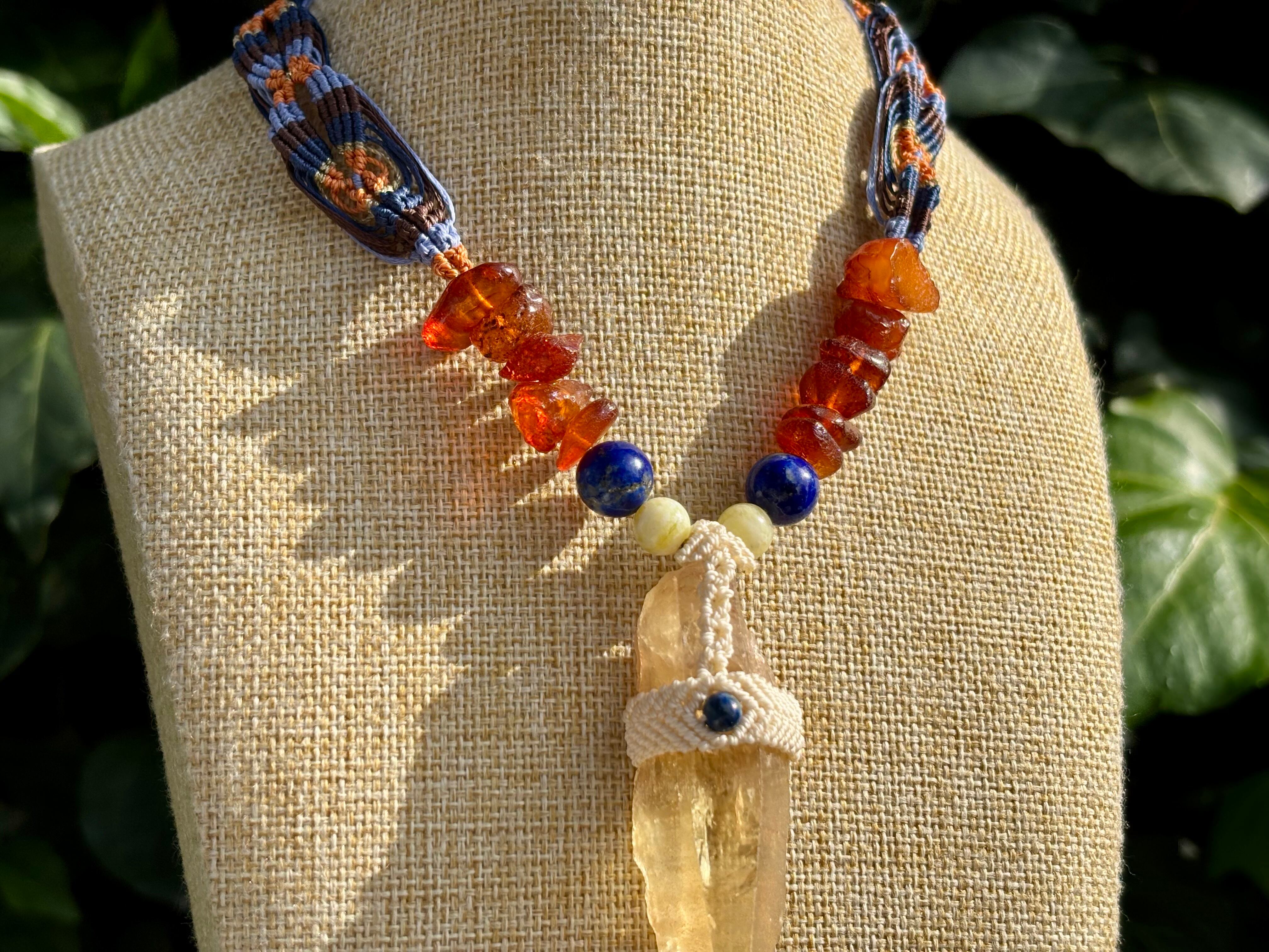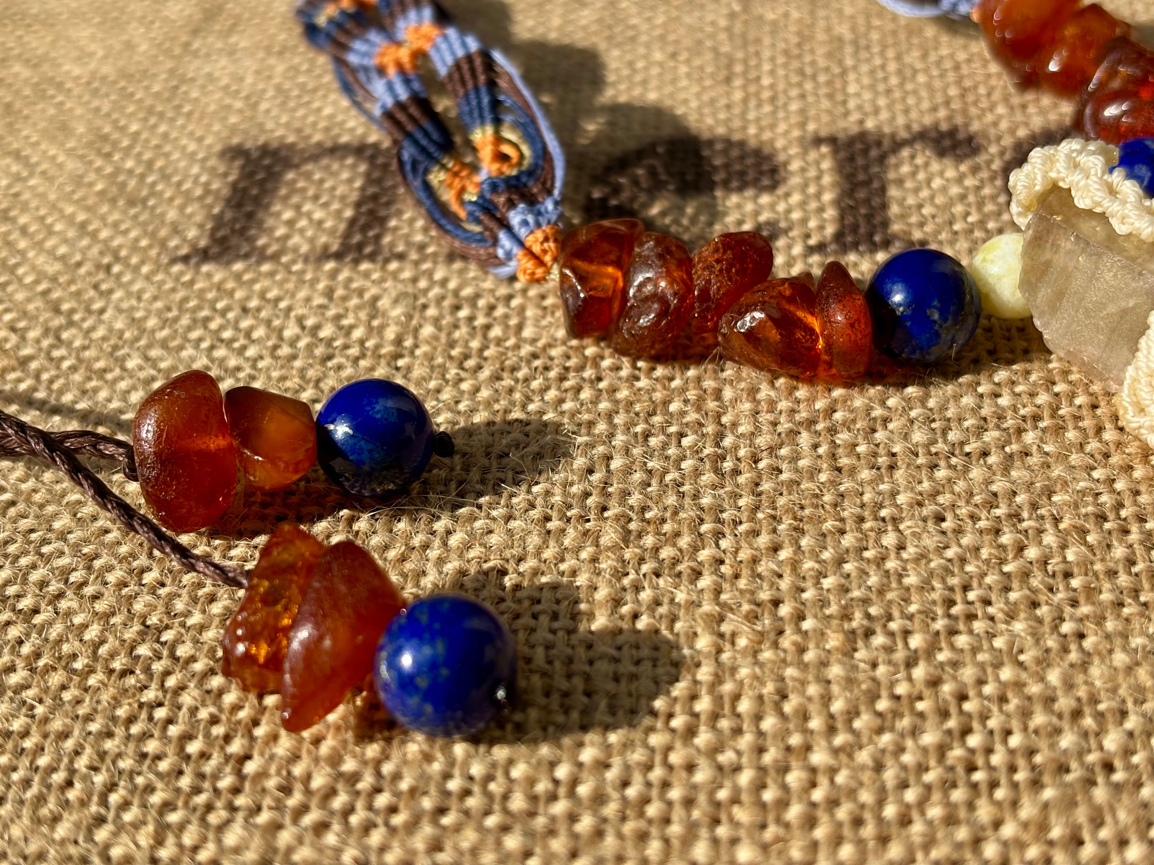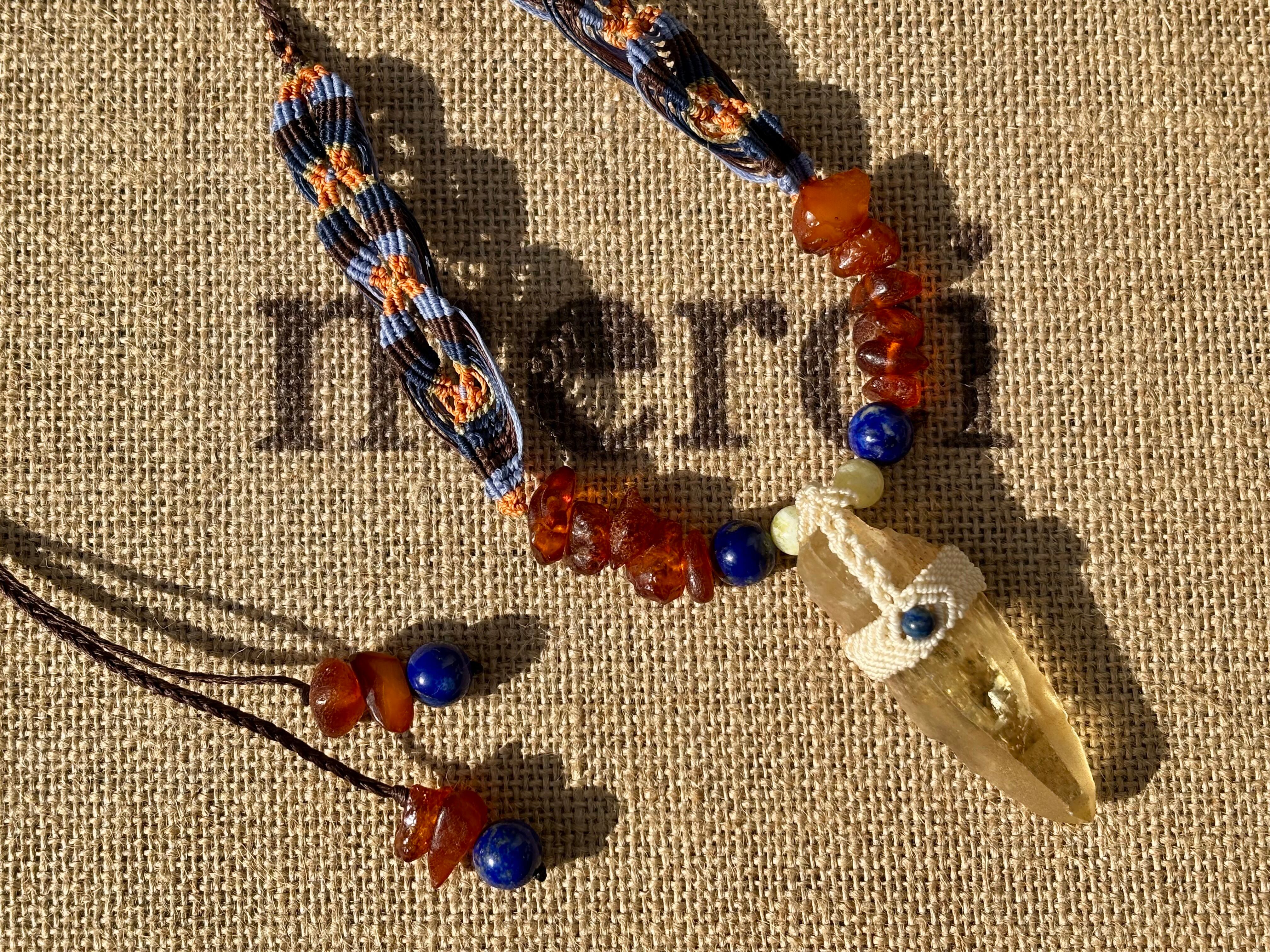 #911超希少ゴールデンレムリアンシード一点物 (ゴールデンレムリアンシード×ハニーイエローオパール×ラピスラズリ×アンバー マクラメ編みデザインネックレス)