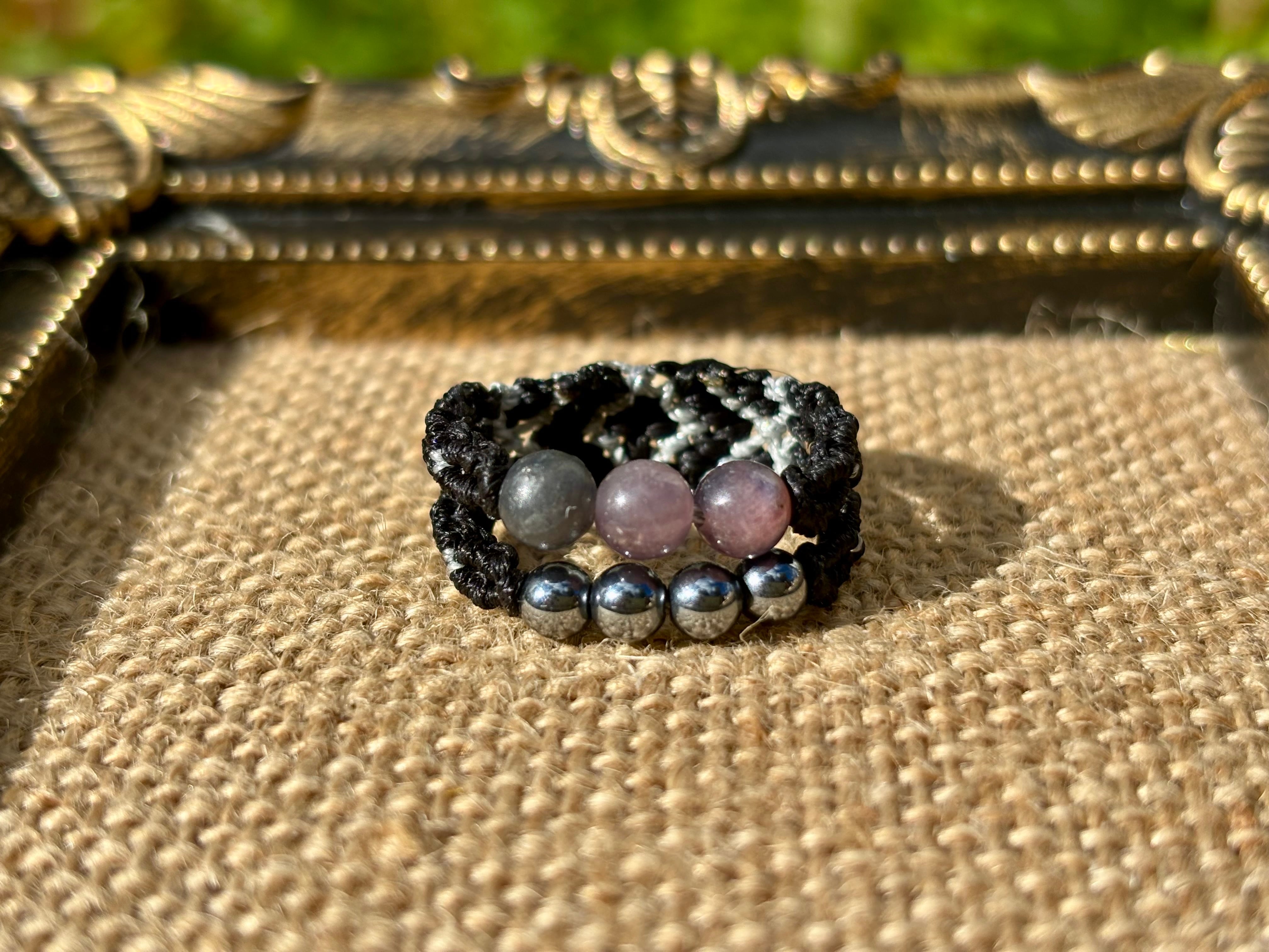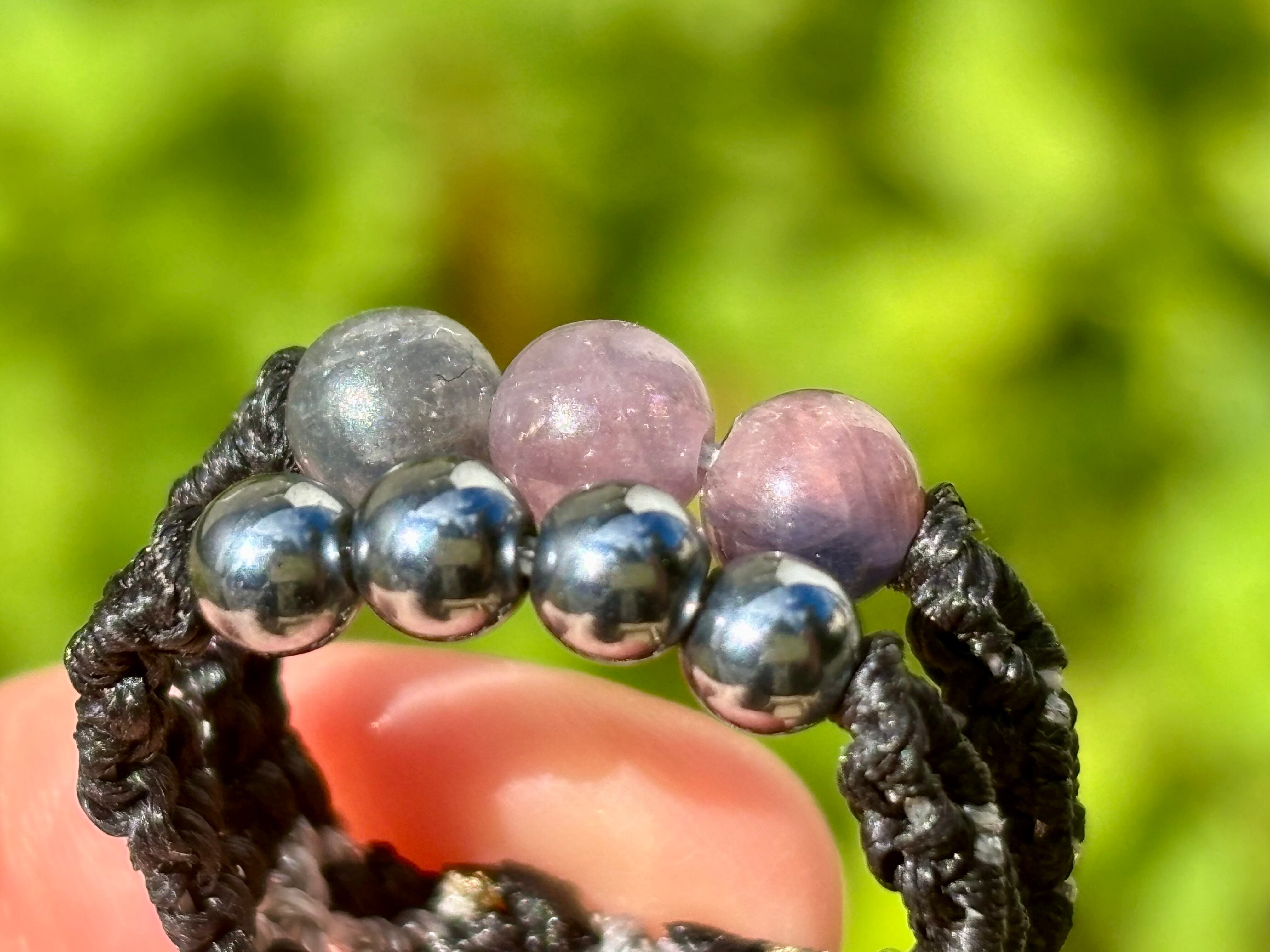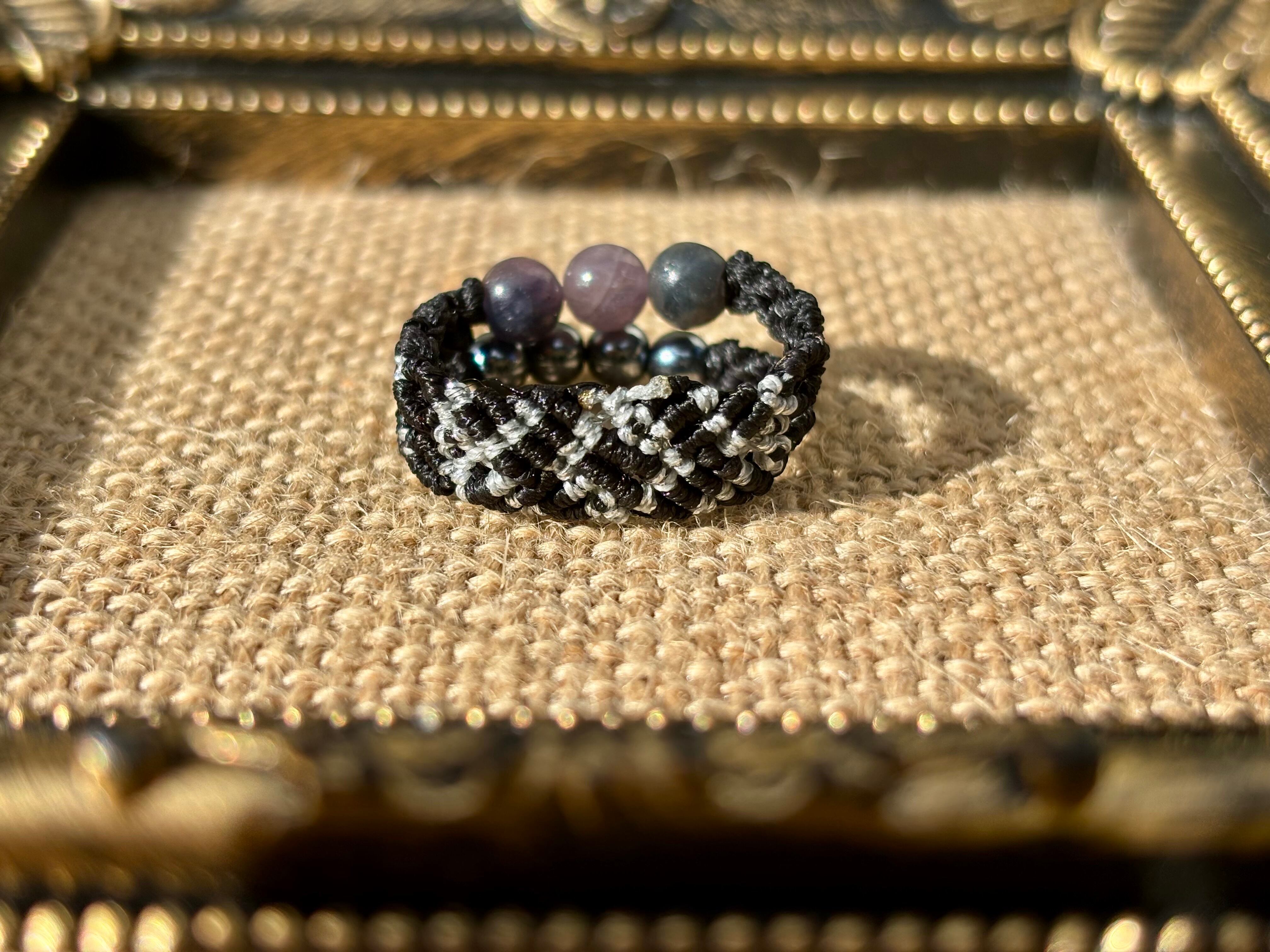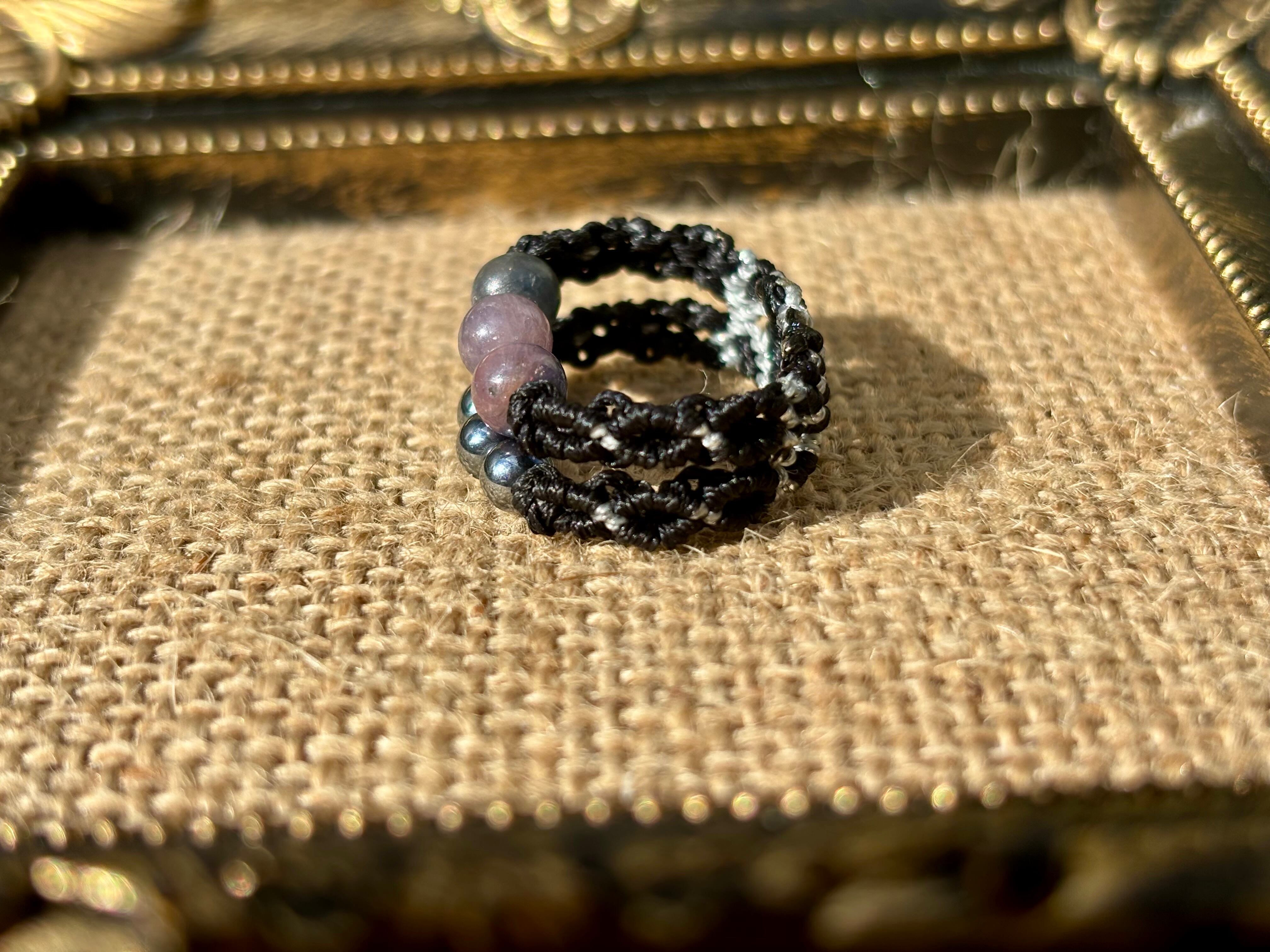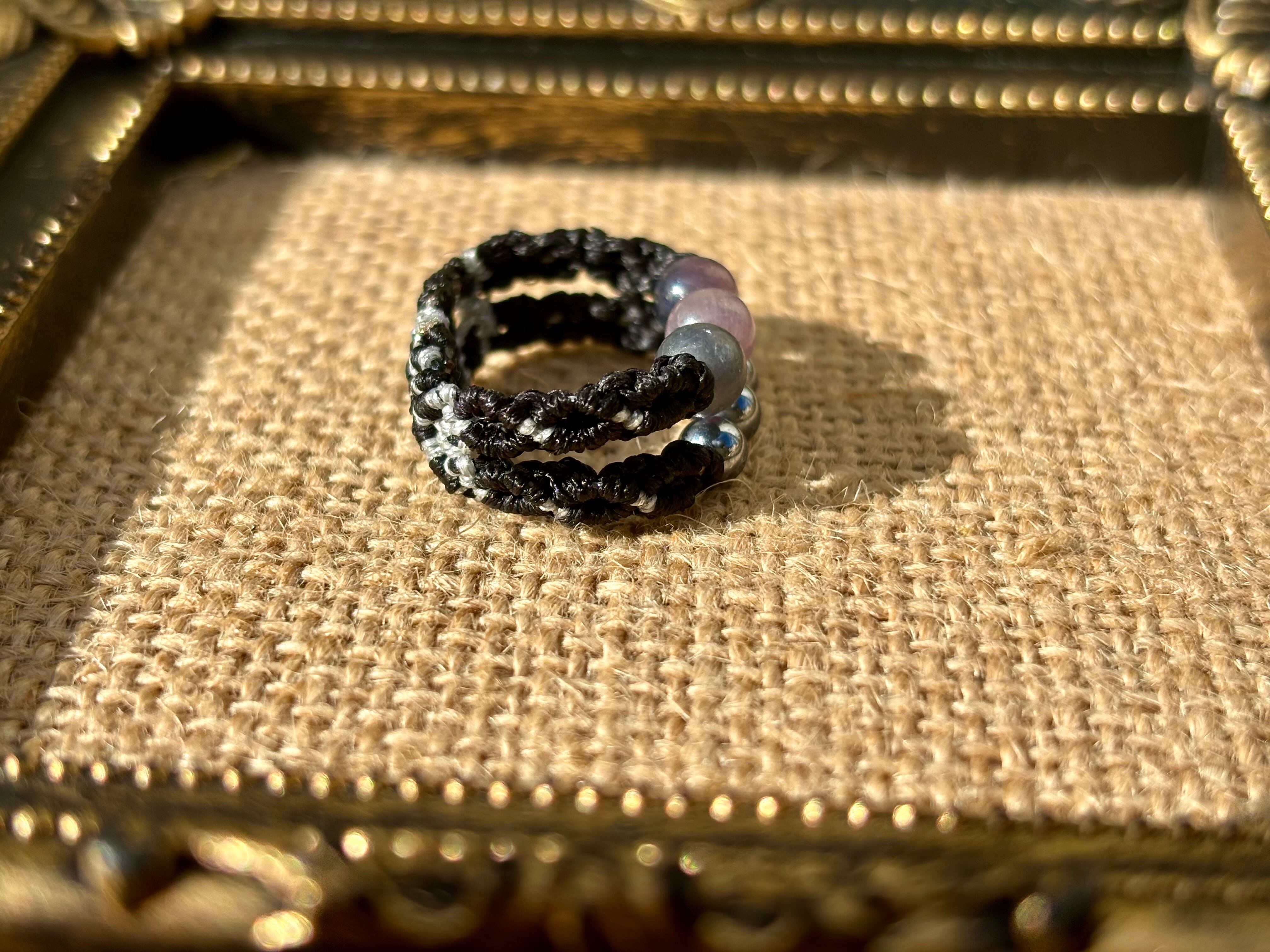 #917天然カラフルサファイア一点物(カラフルサファイア×テラヘルツ マクラメ編み二連リング/指輪)