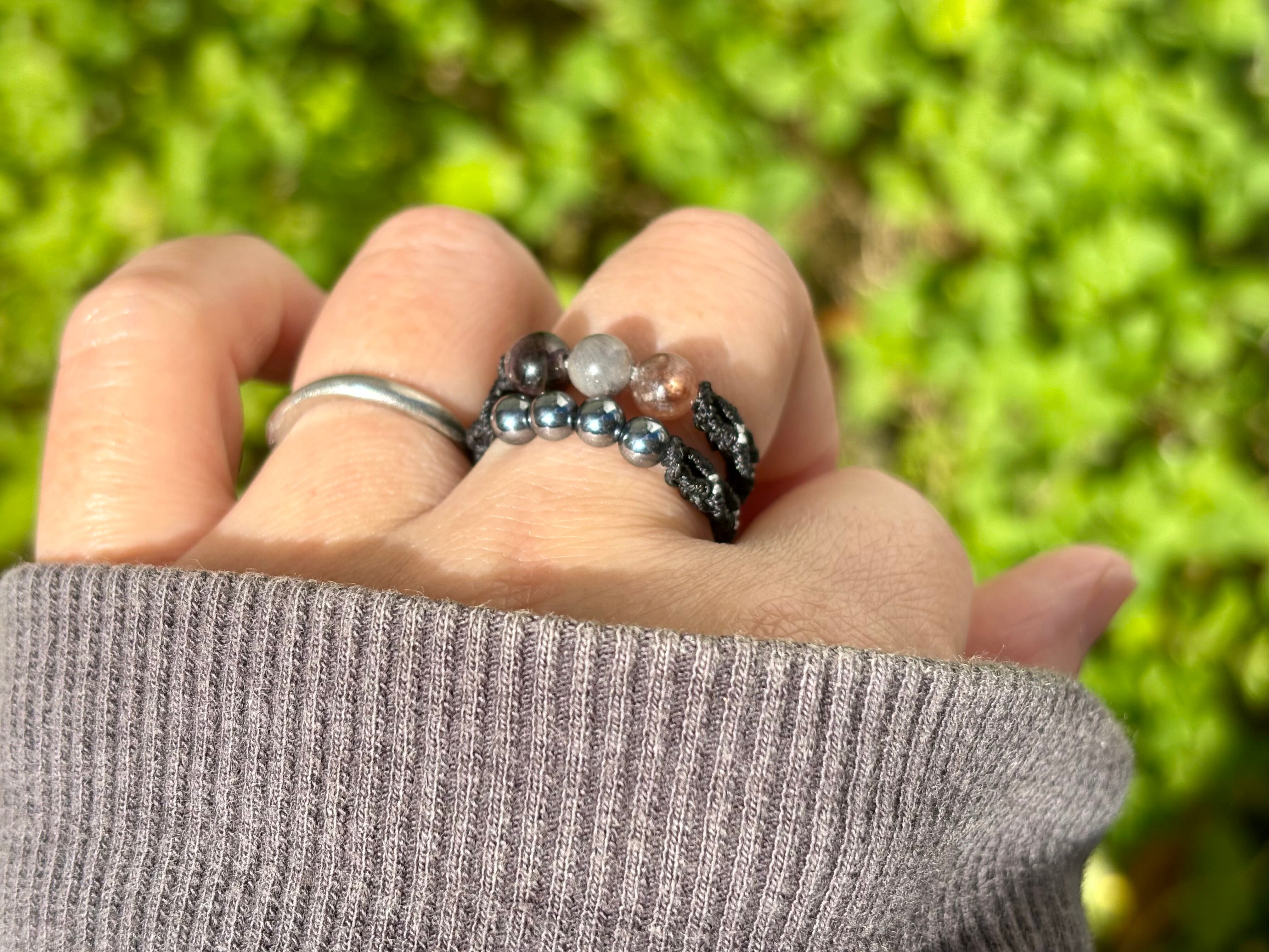 手作業で丁寧に編み込まれたこの二連リングは、日常のコーディネートに華を添えるだけでなく、特別な場面でも存在感を発揮します。