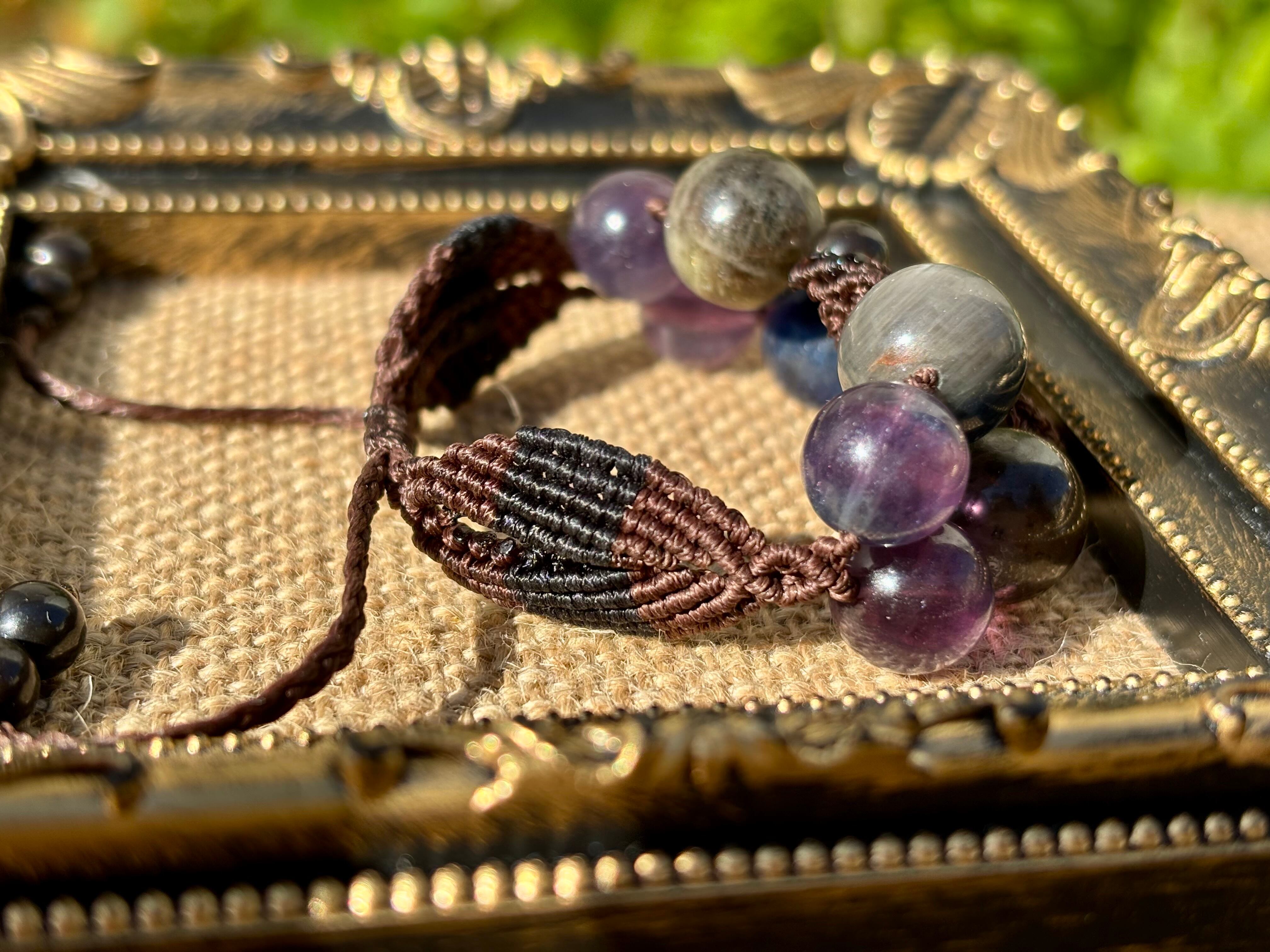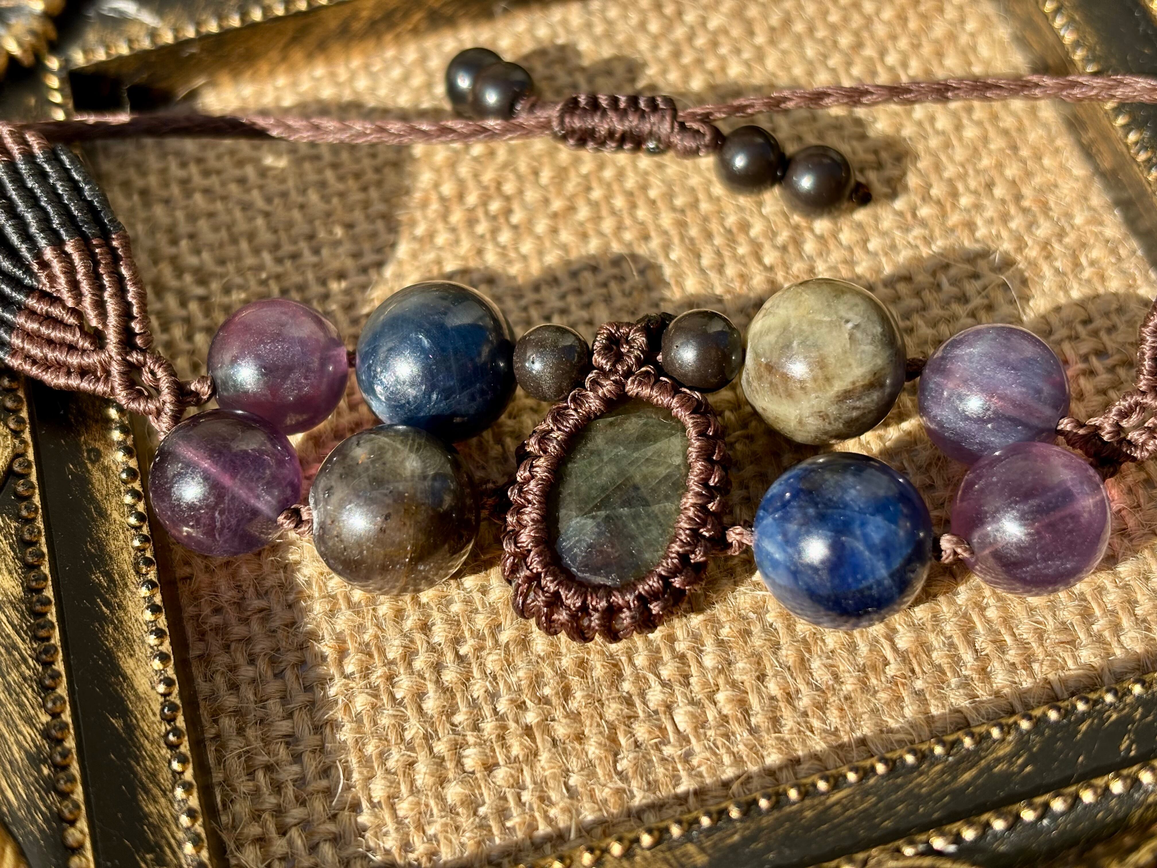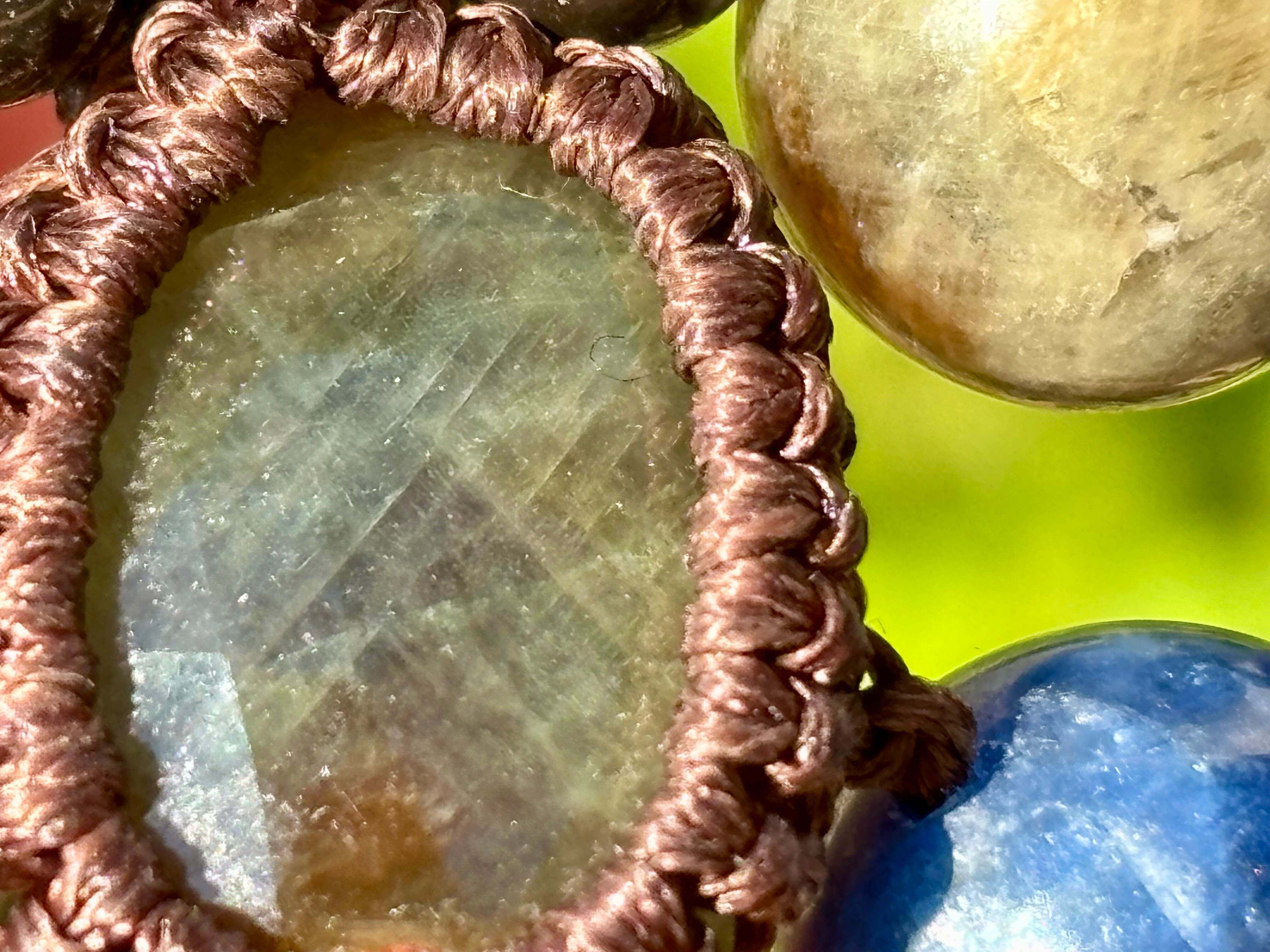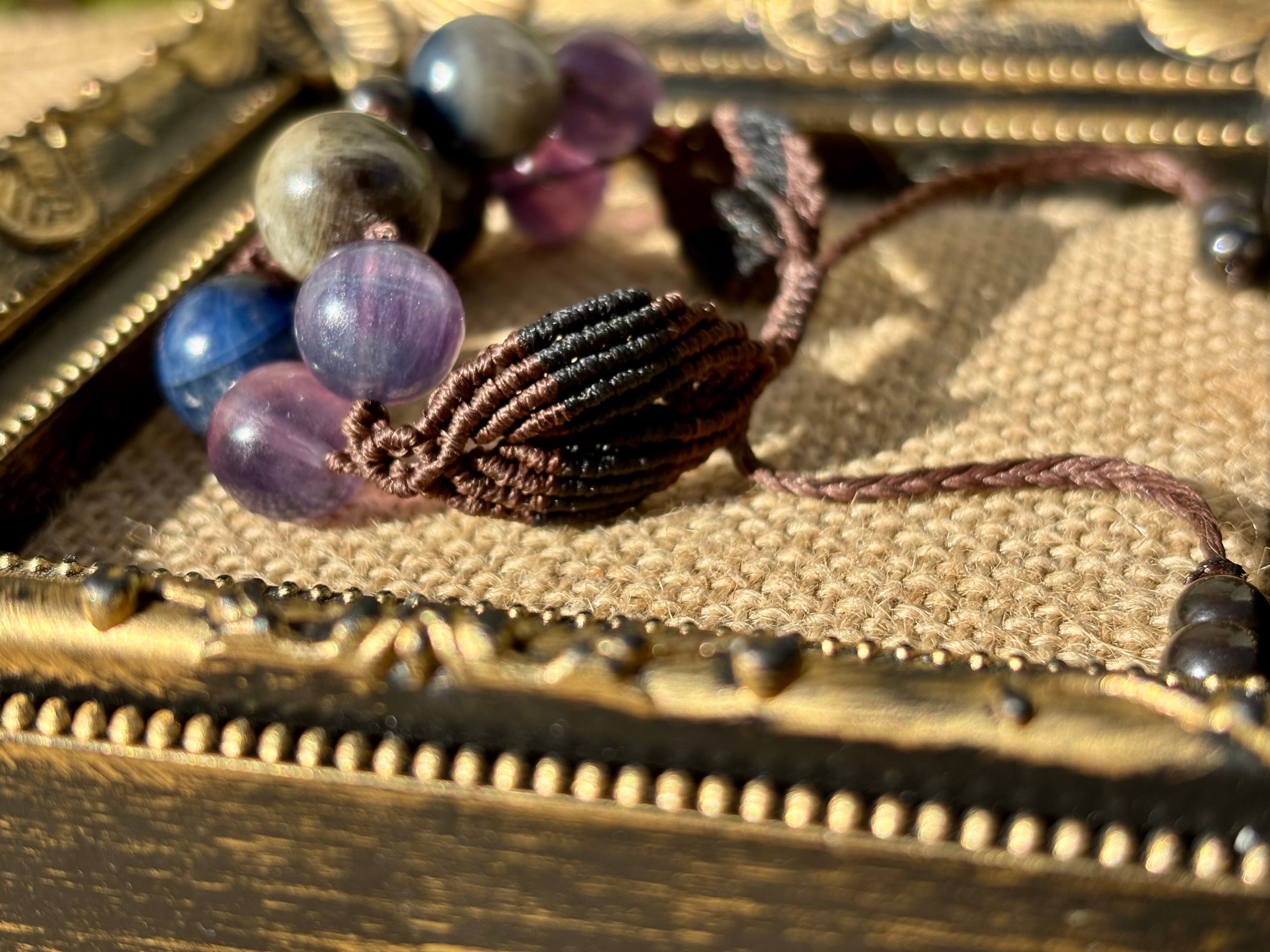 #920希少!!ブラウンサファイア一点物(ブラウンサファイア×ブルーサファイア×グリーンサファイア×フローライト×北投石 マクラメ編みブレスレット)