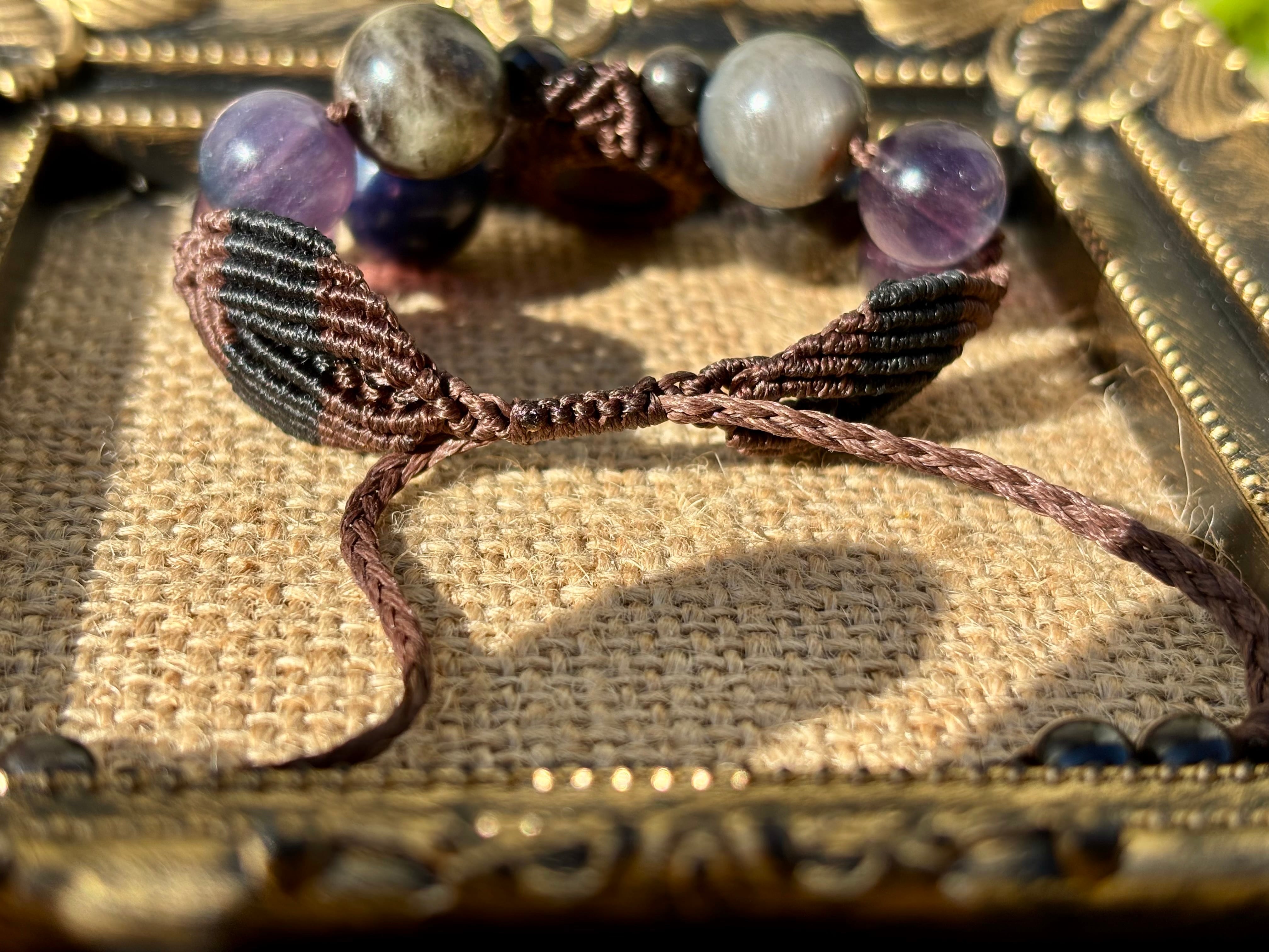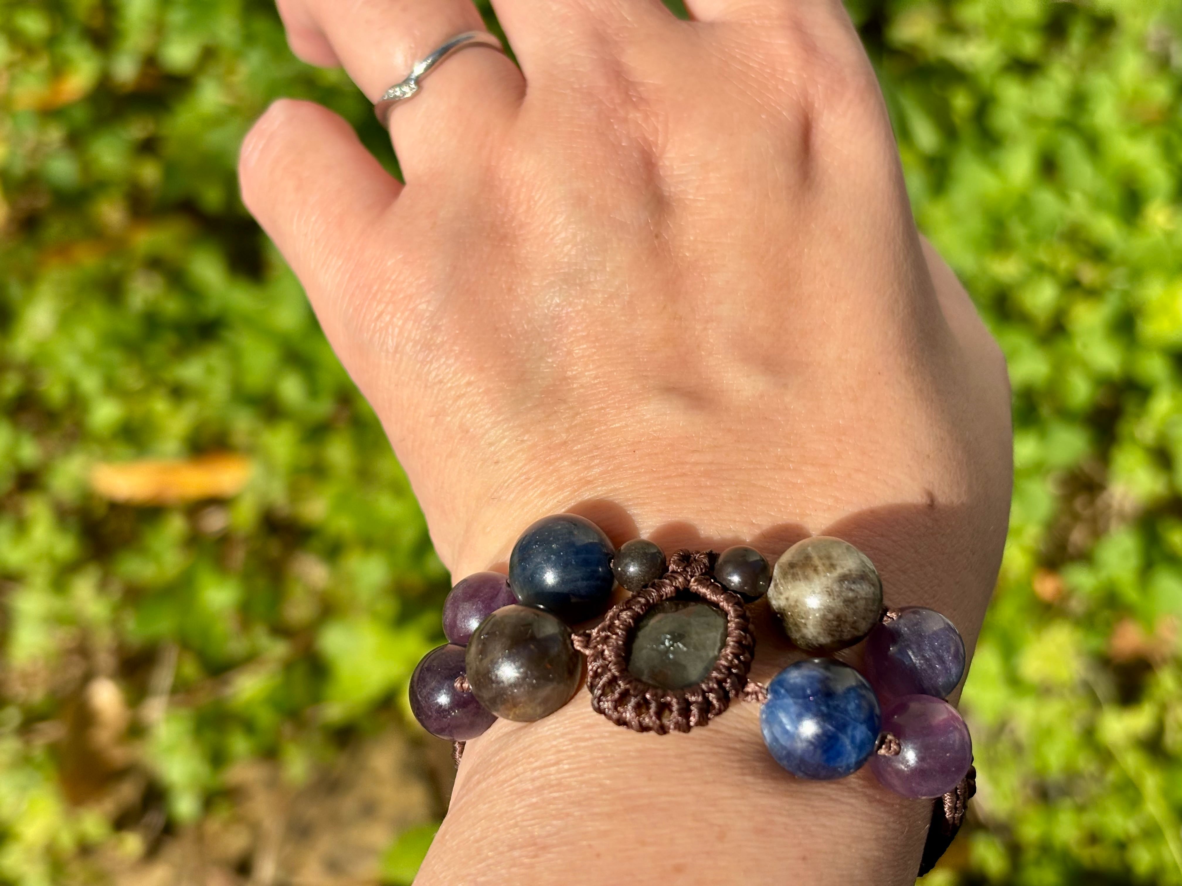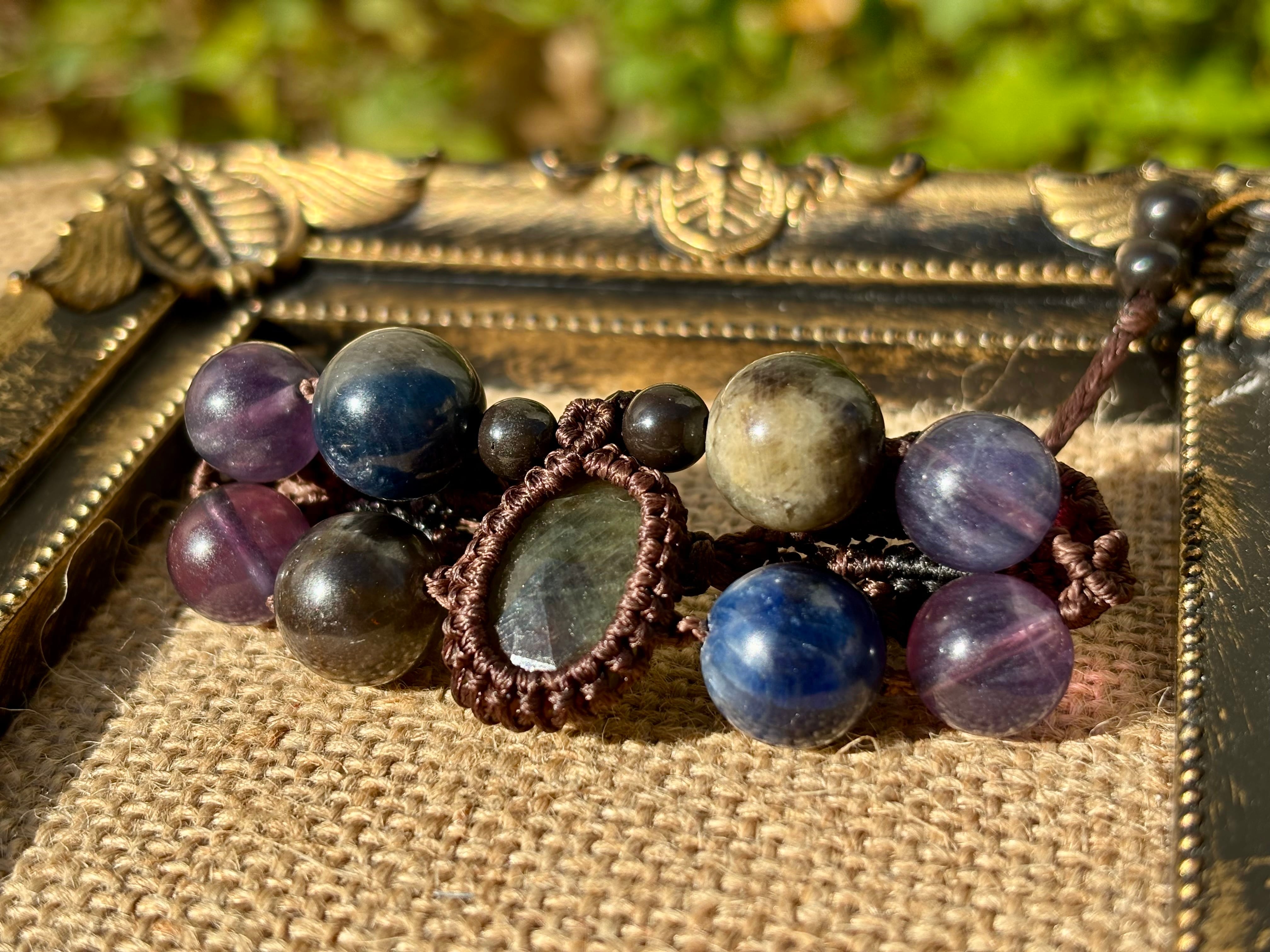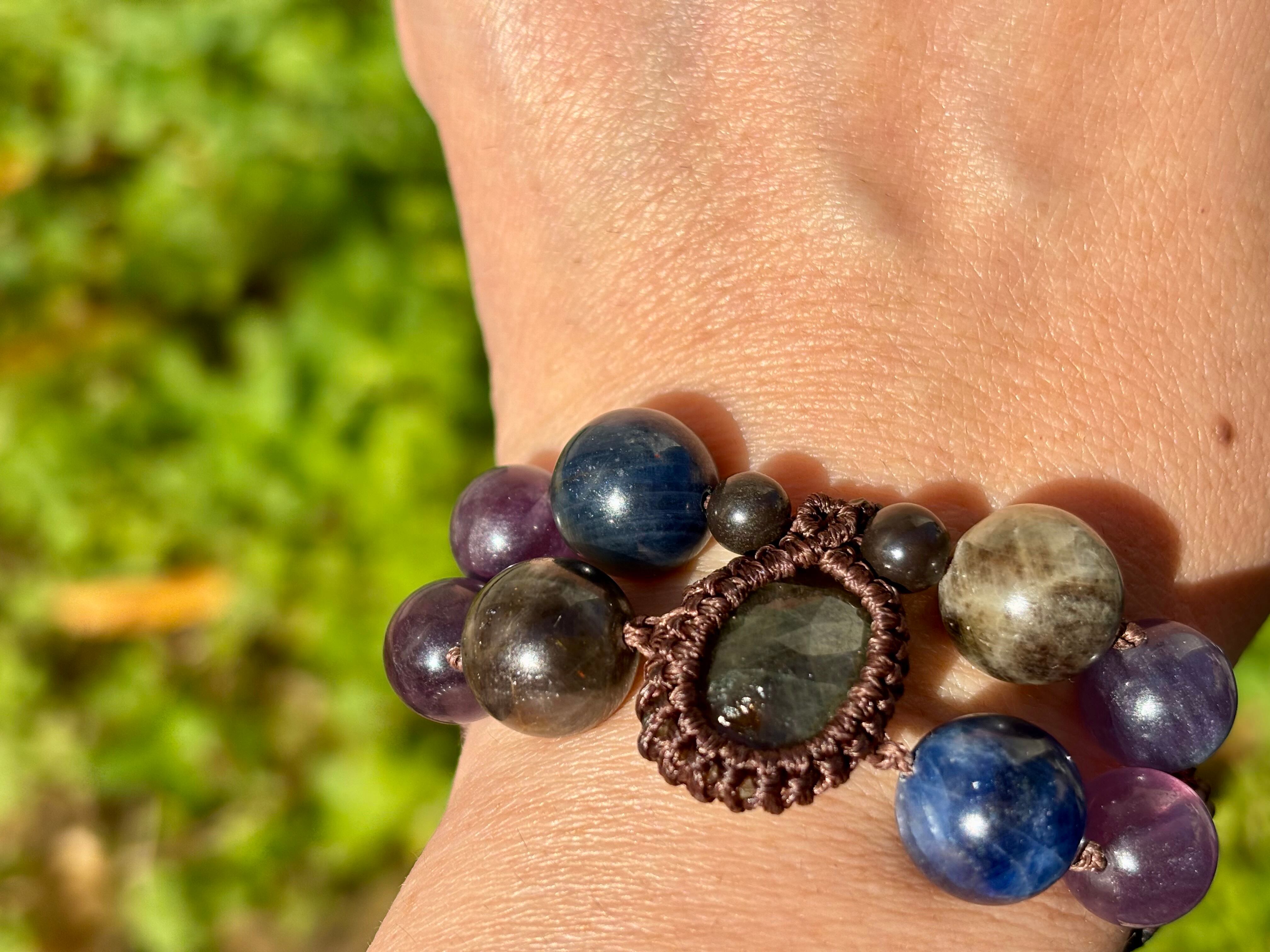#920希少!!ブラウンサファイア一点物(ブラウンサファイア×ブルーサファイア×グリーンサファイア×フローライト×北投石 マクラメ編みブレスレット)
