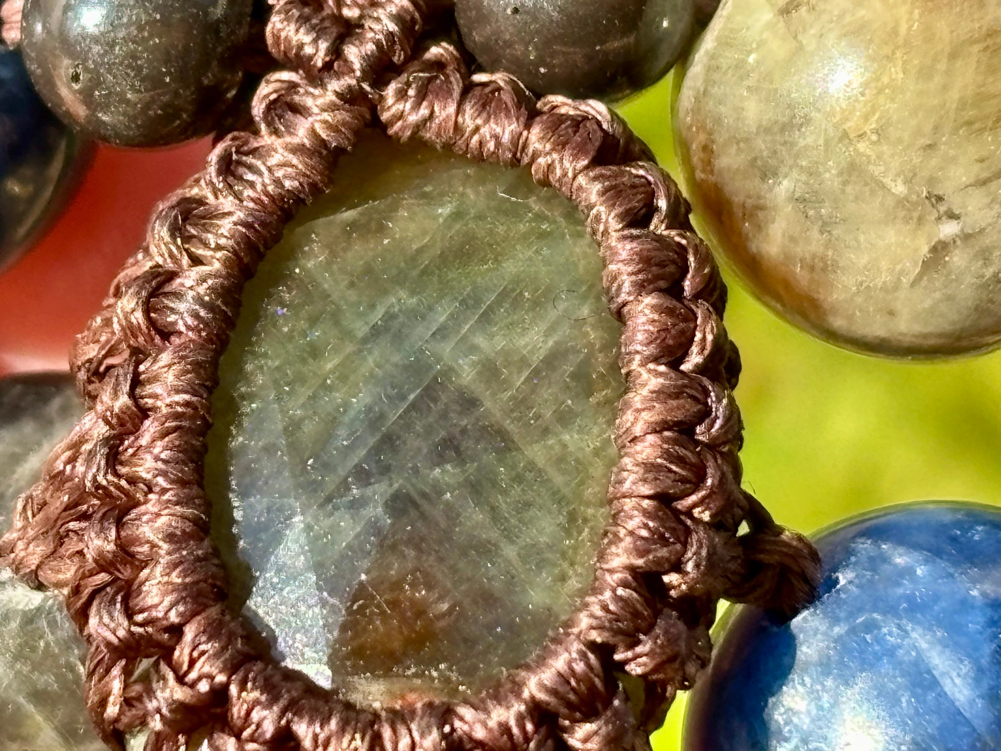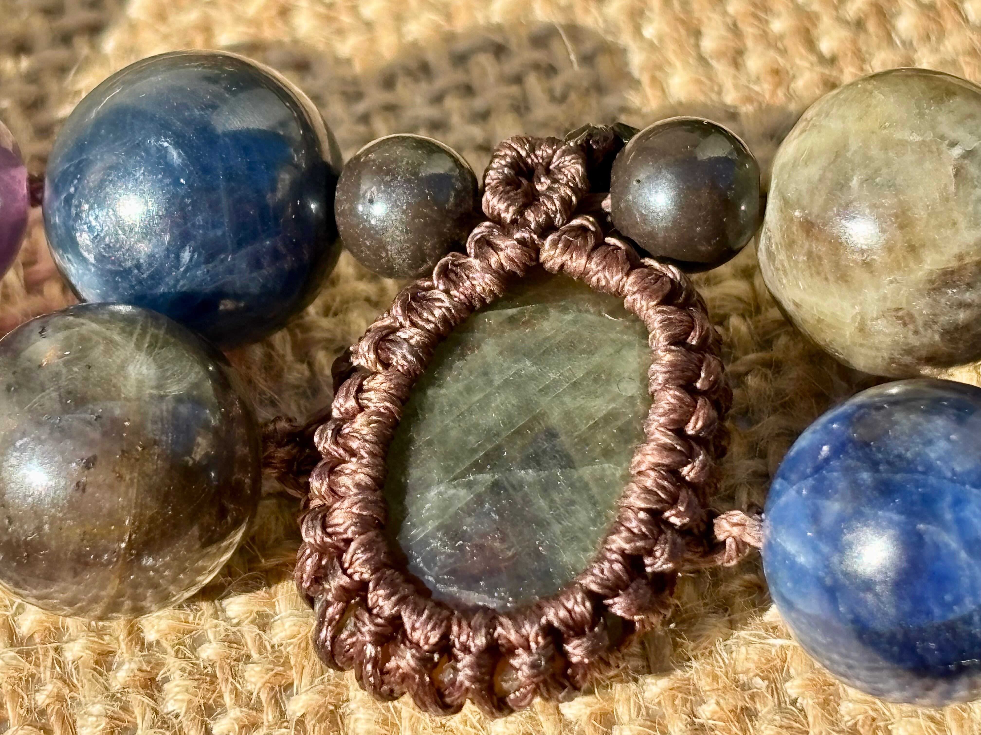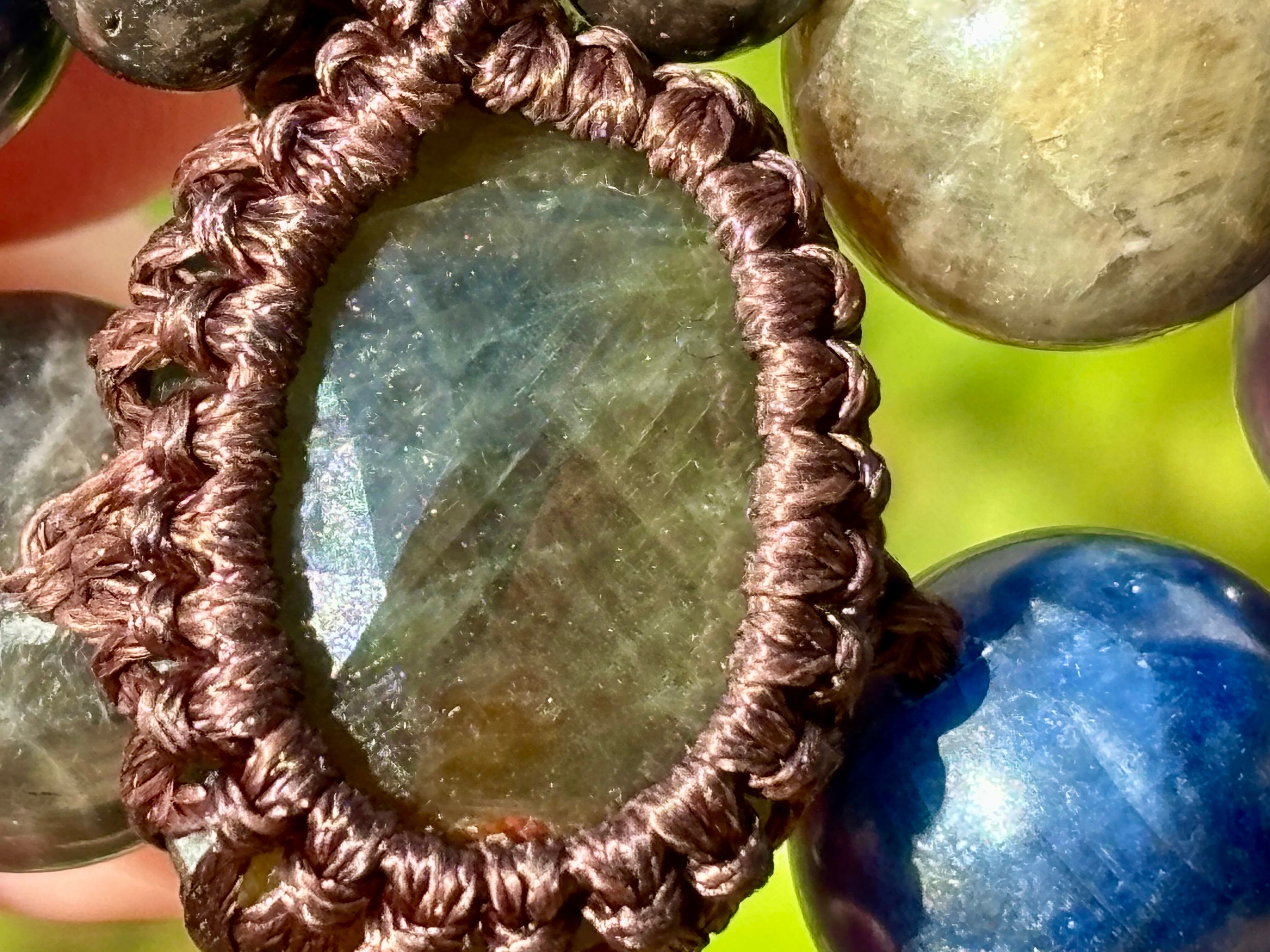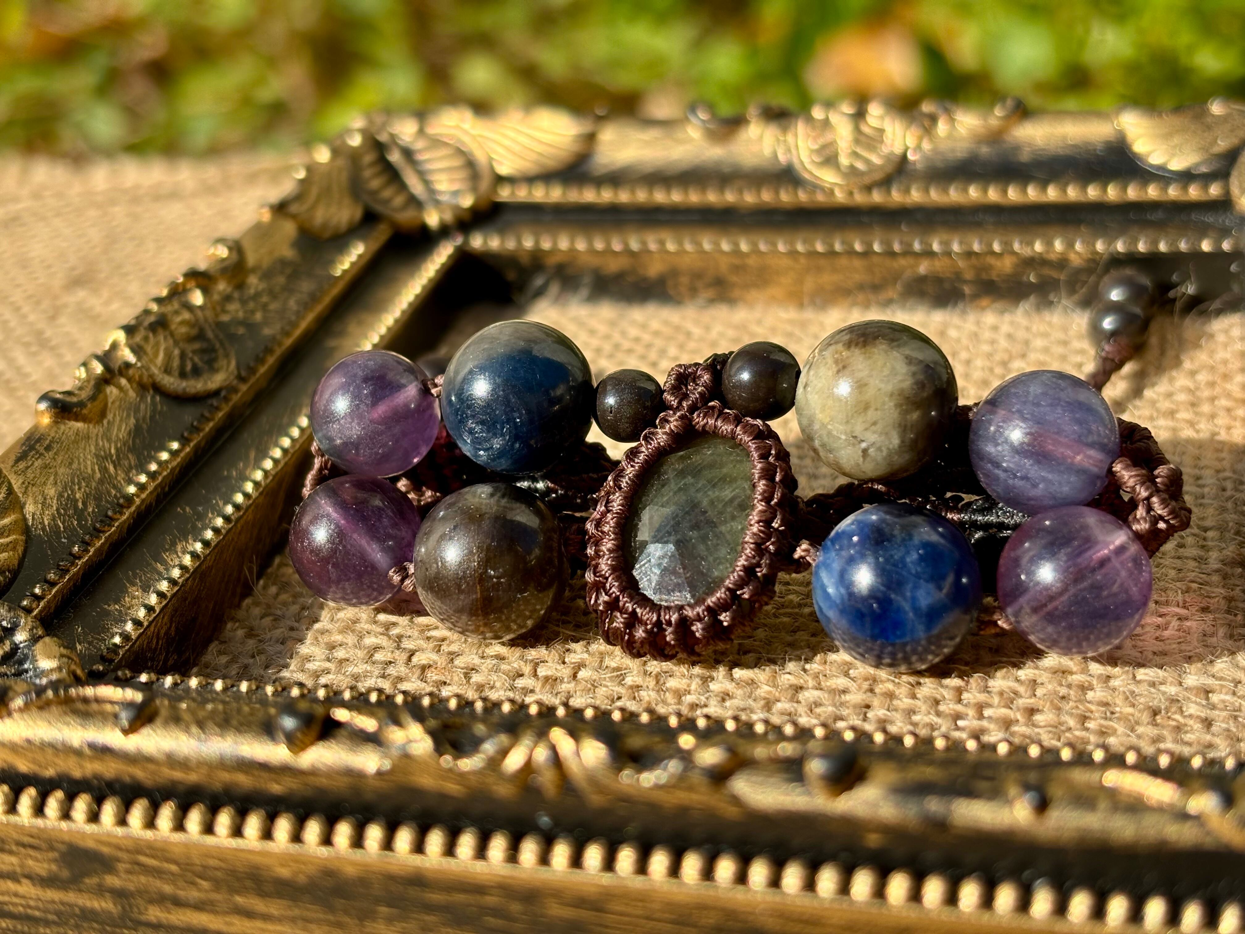 #920希少!!ブラウンサファイア一点物(ブラウンサファイア×ブルーサファイア×グリーンサファイア×フローライト×北投石 マクラメ編みブレスレット)