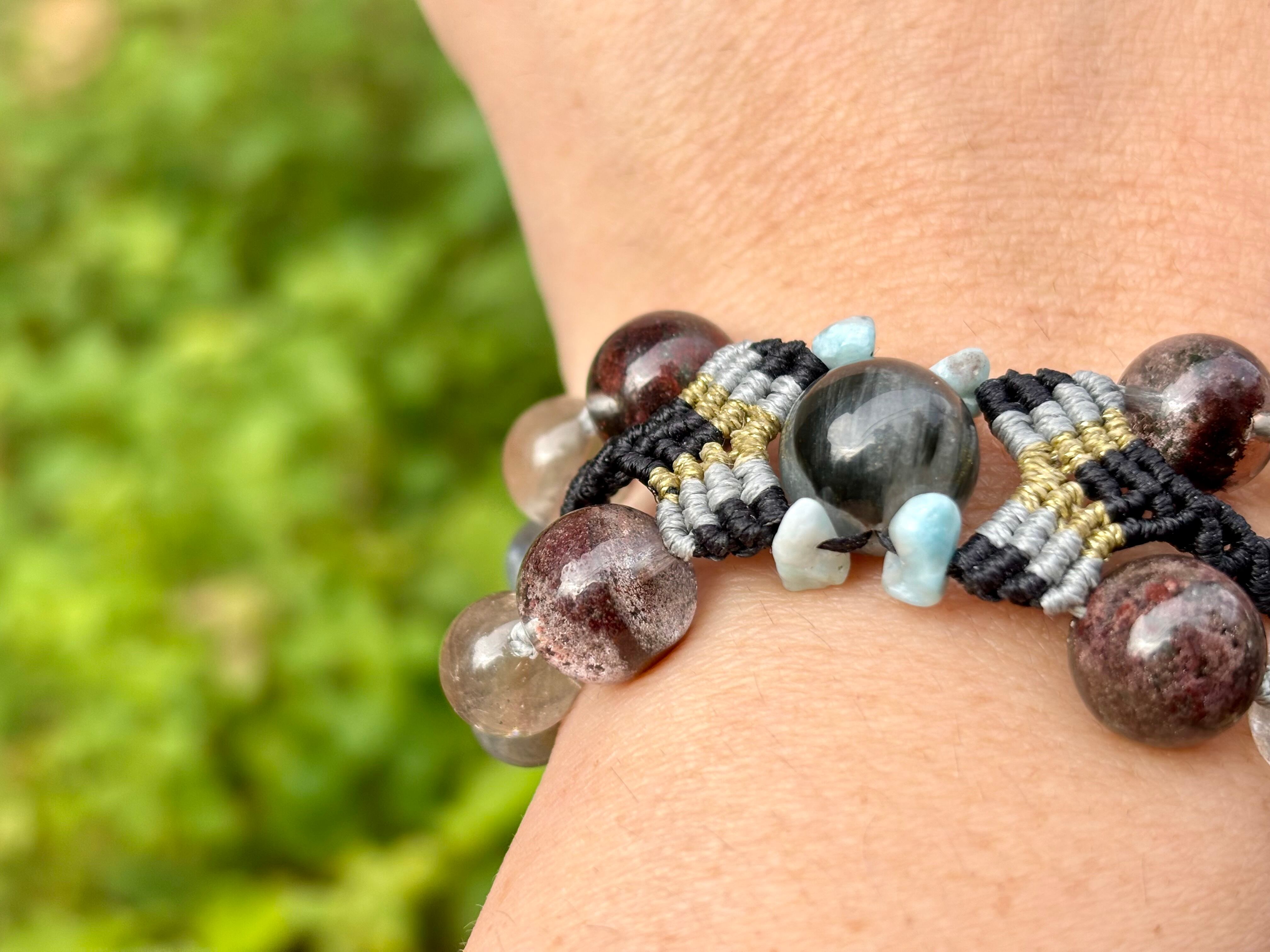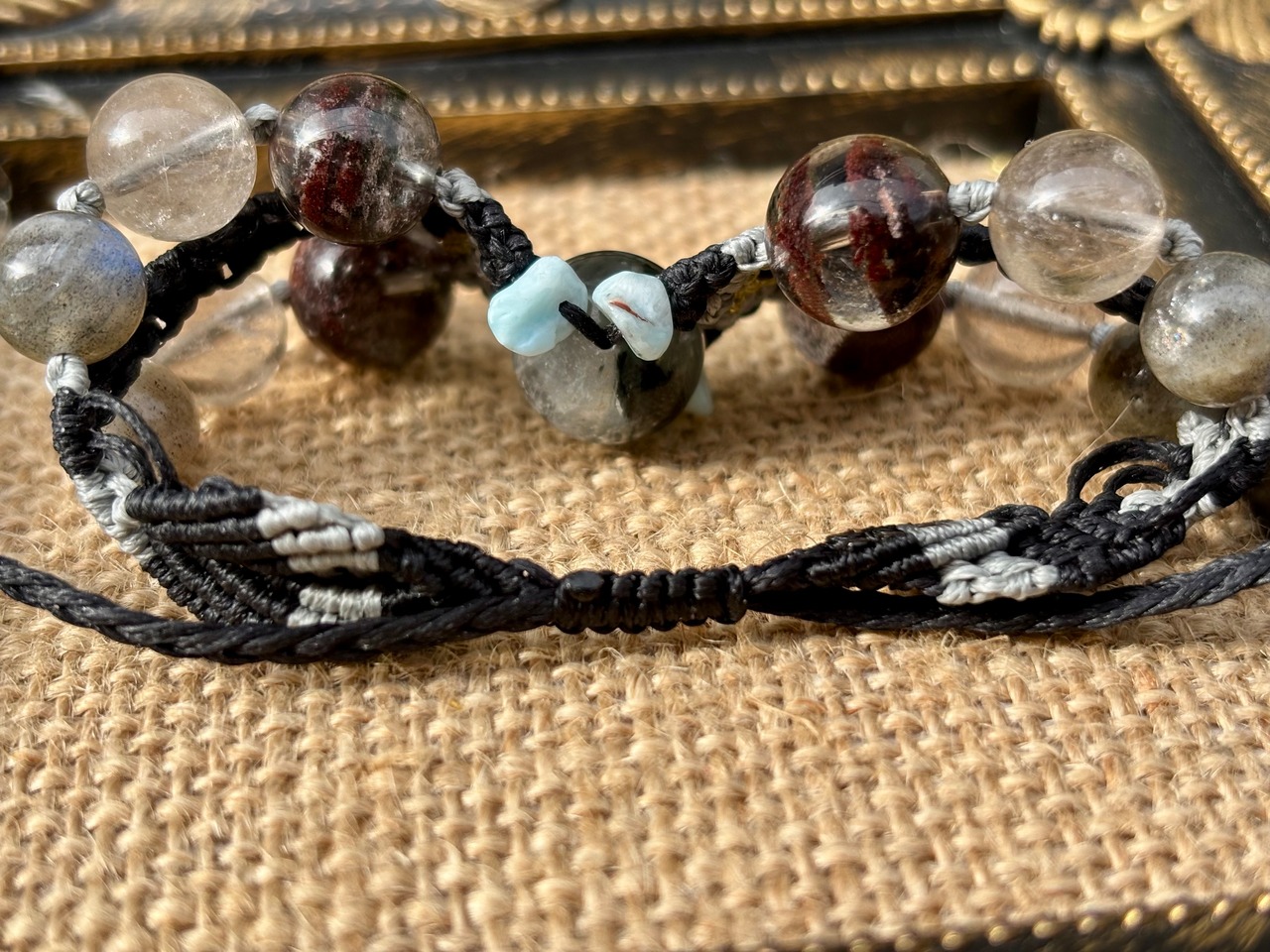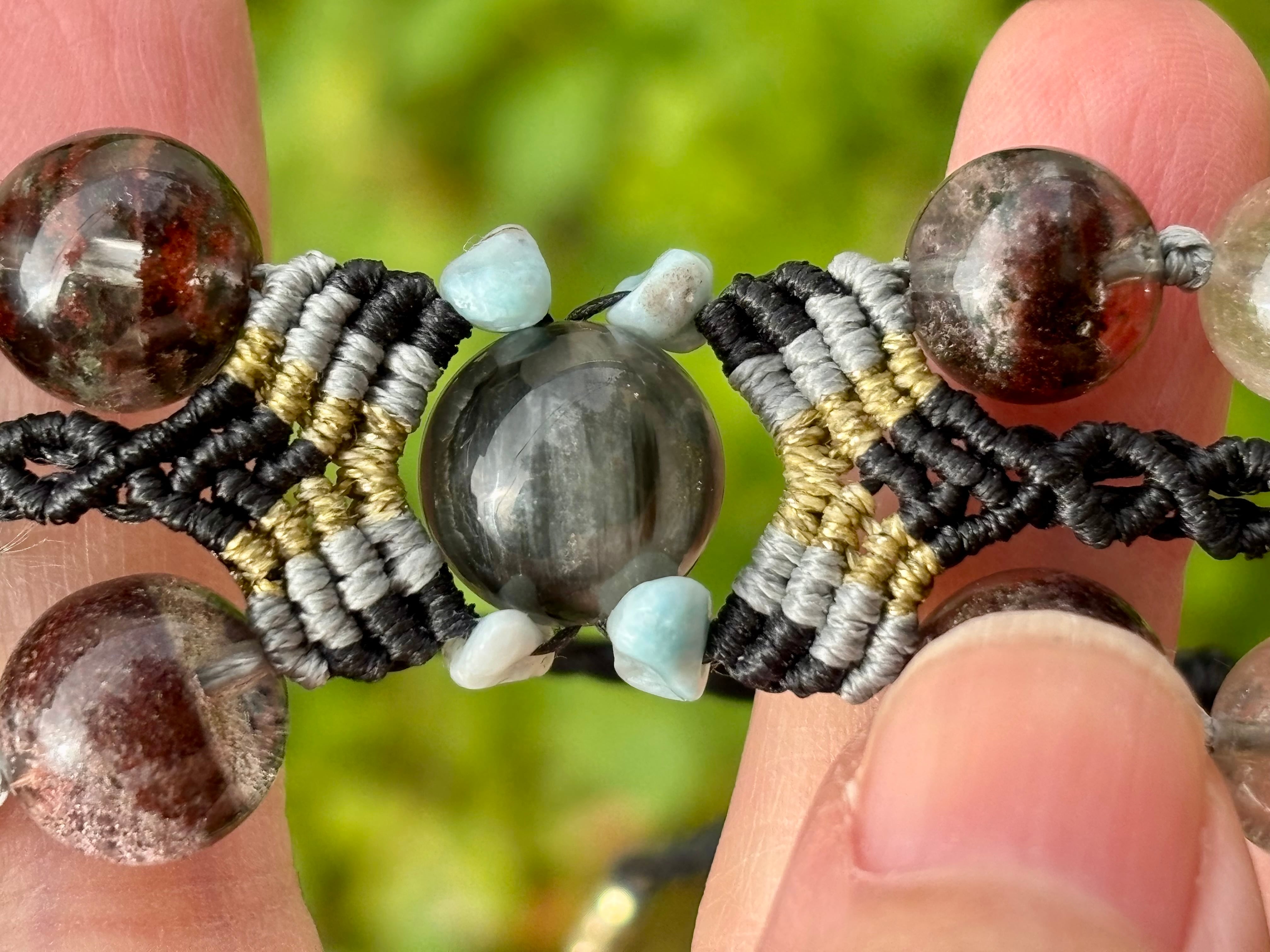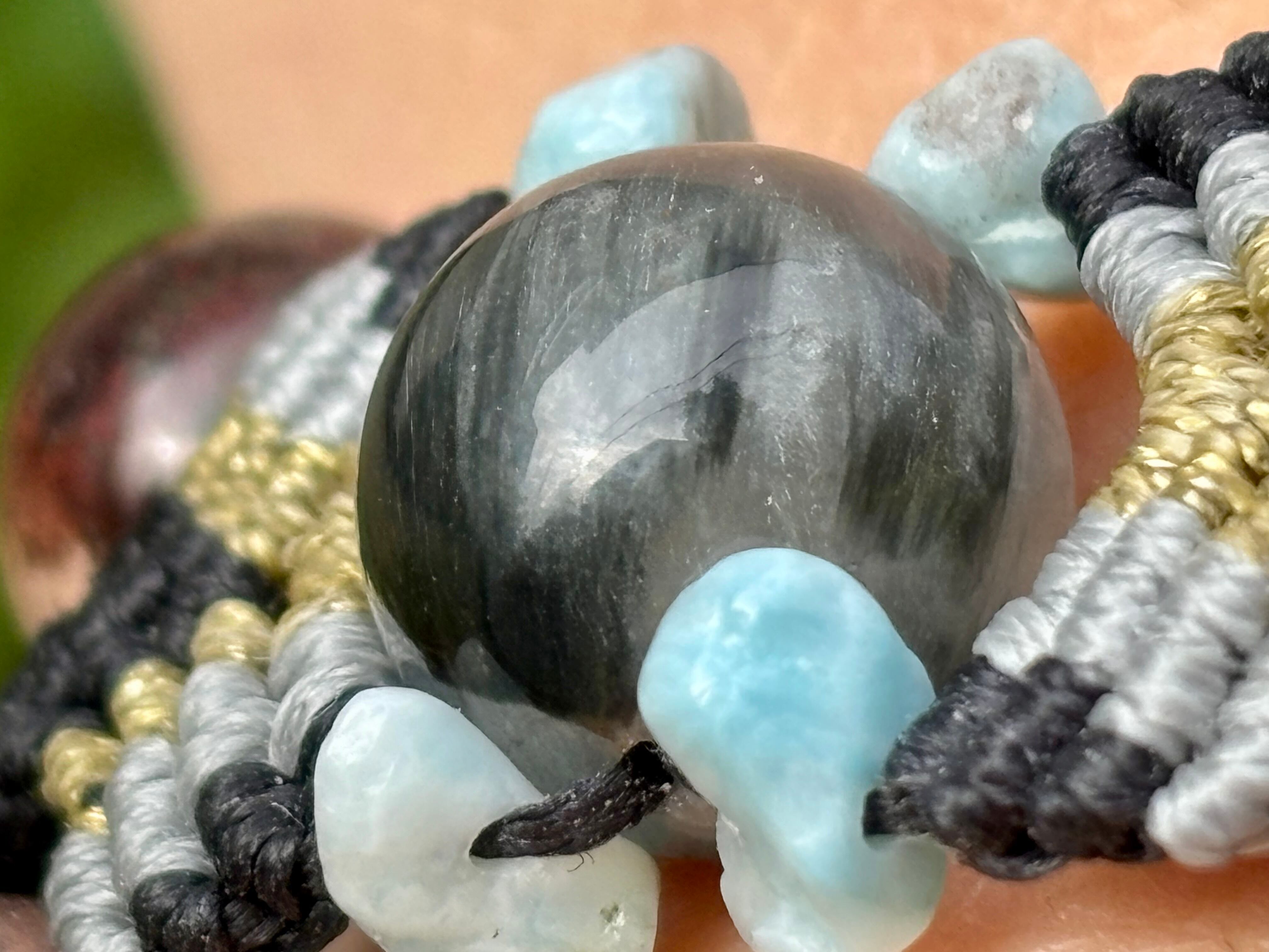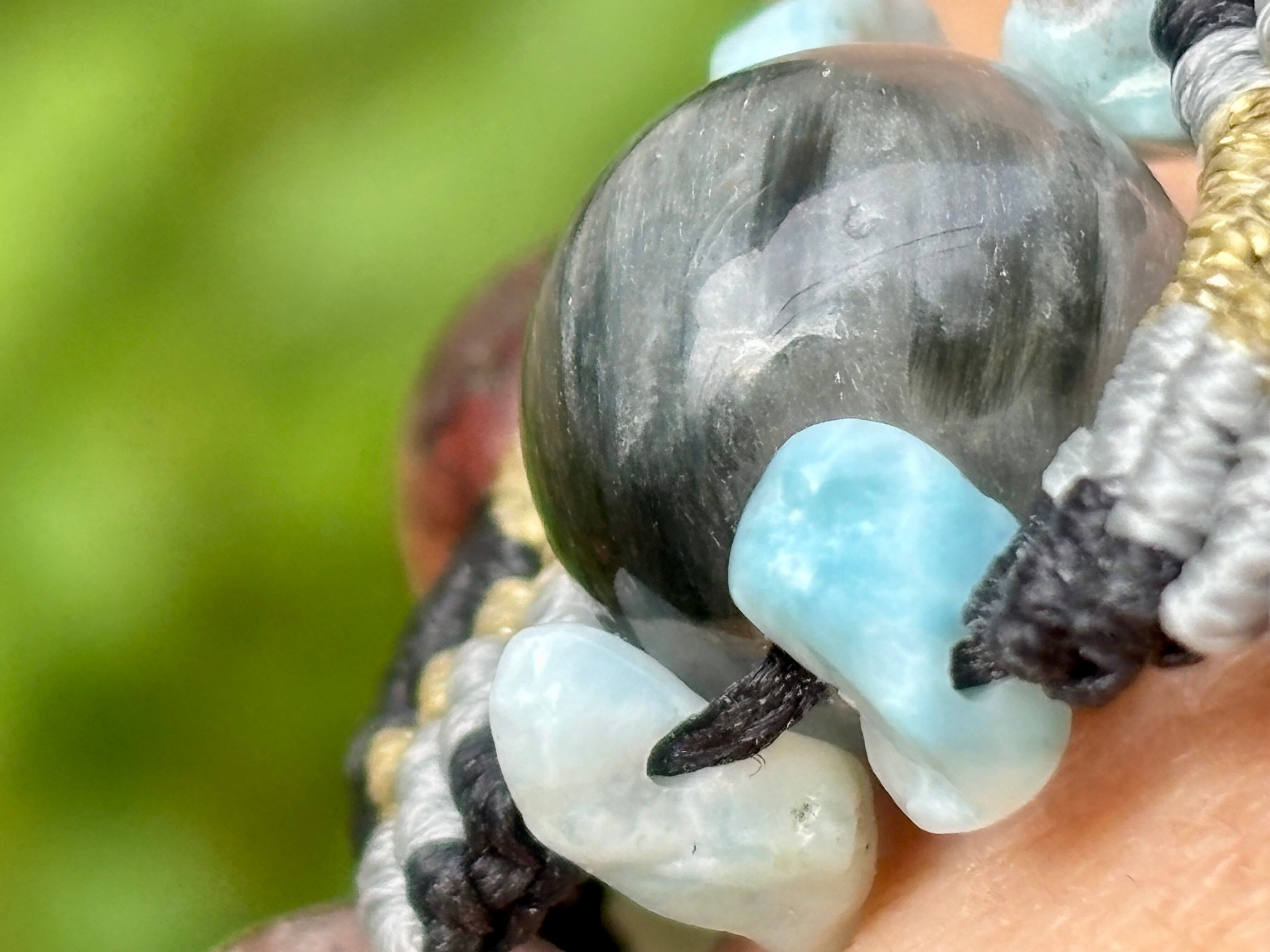 #929超希少‼︎ブラックサゲニティック一点物(ブラックサゲニティック×ラリマー×ラブラドライト マクラメ編みブレスレット)