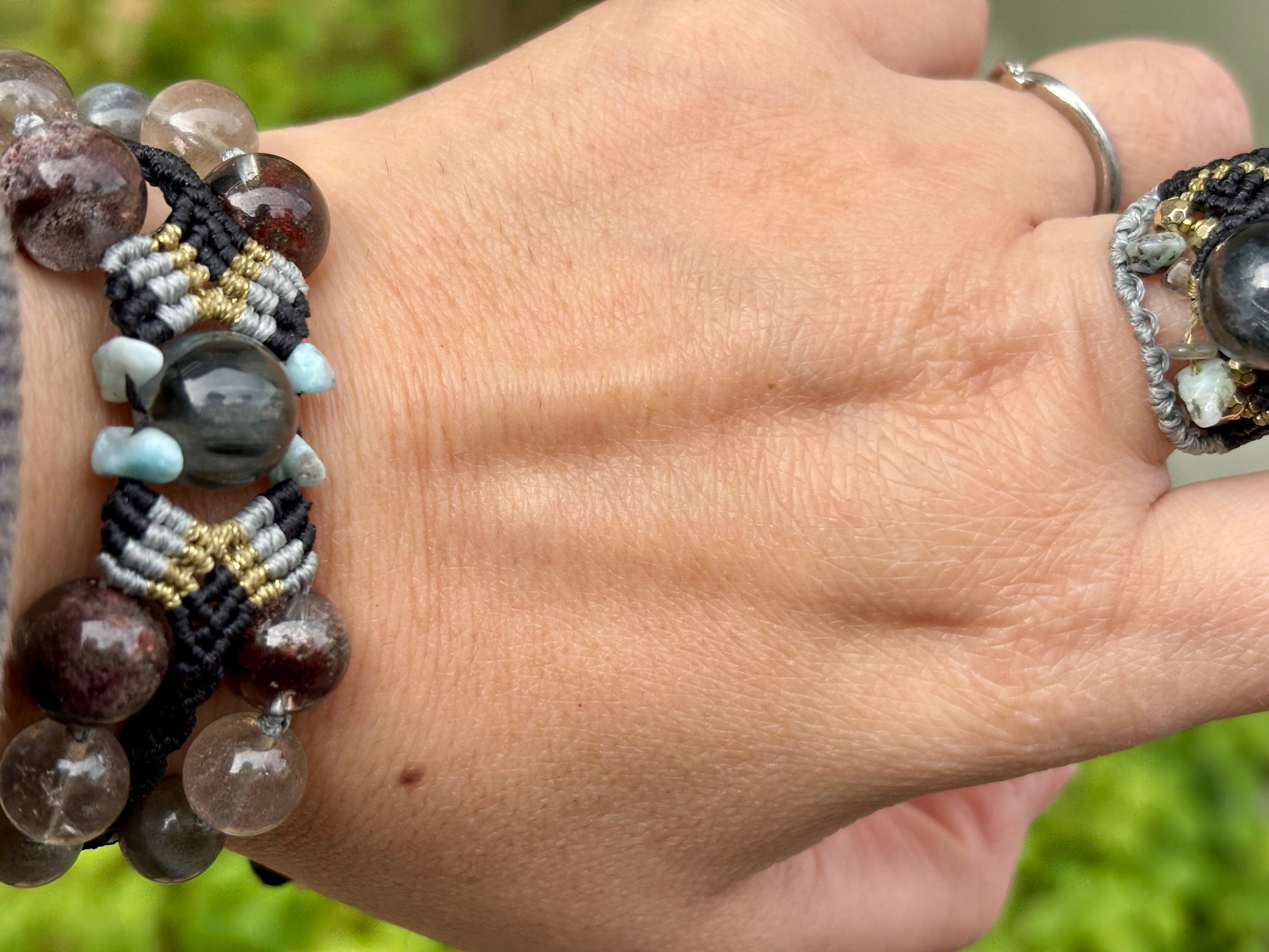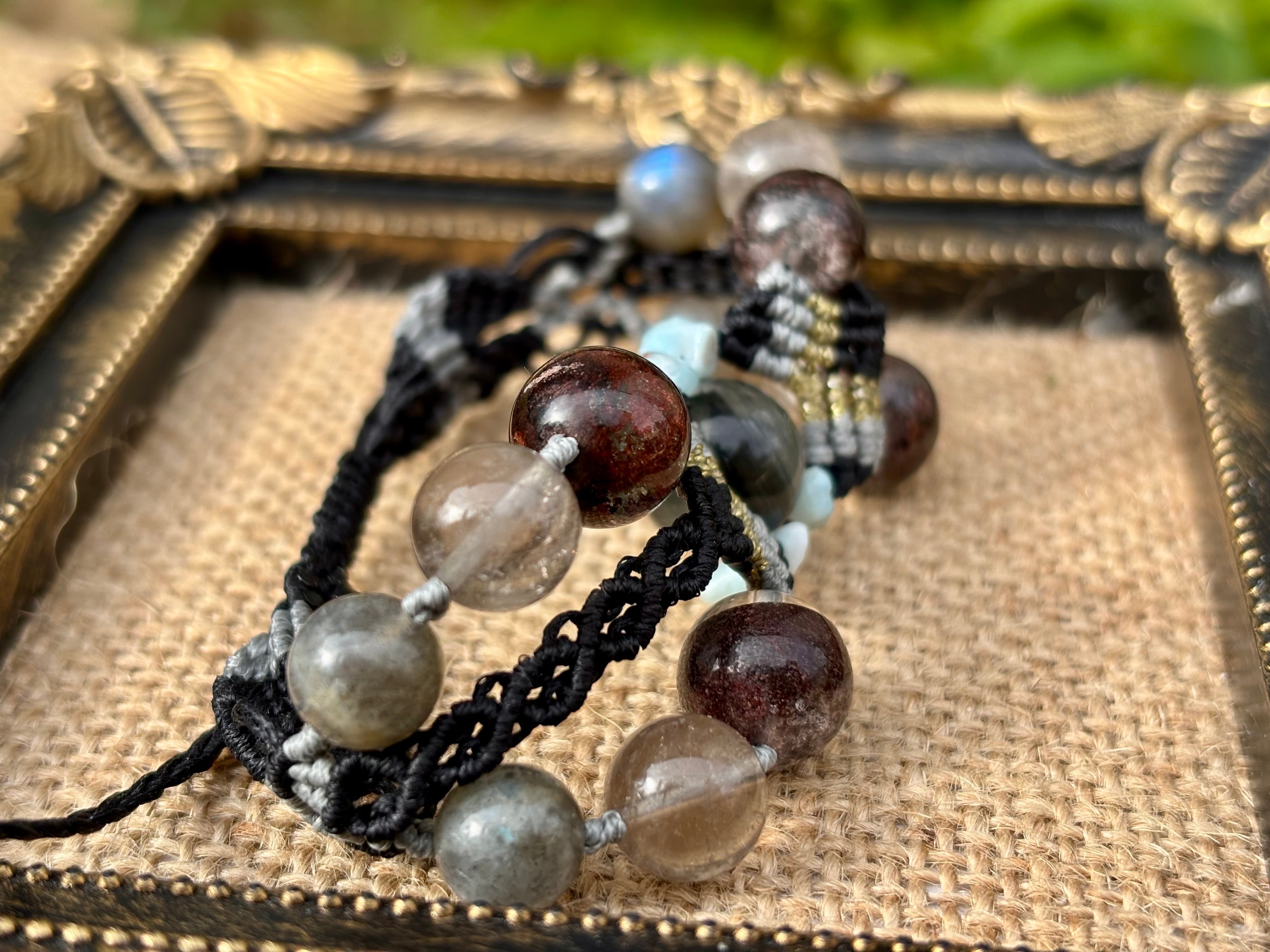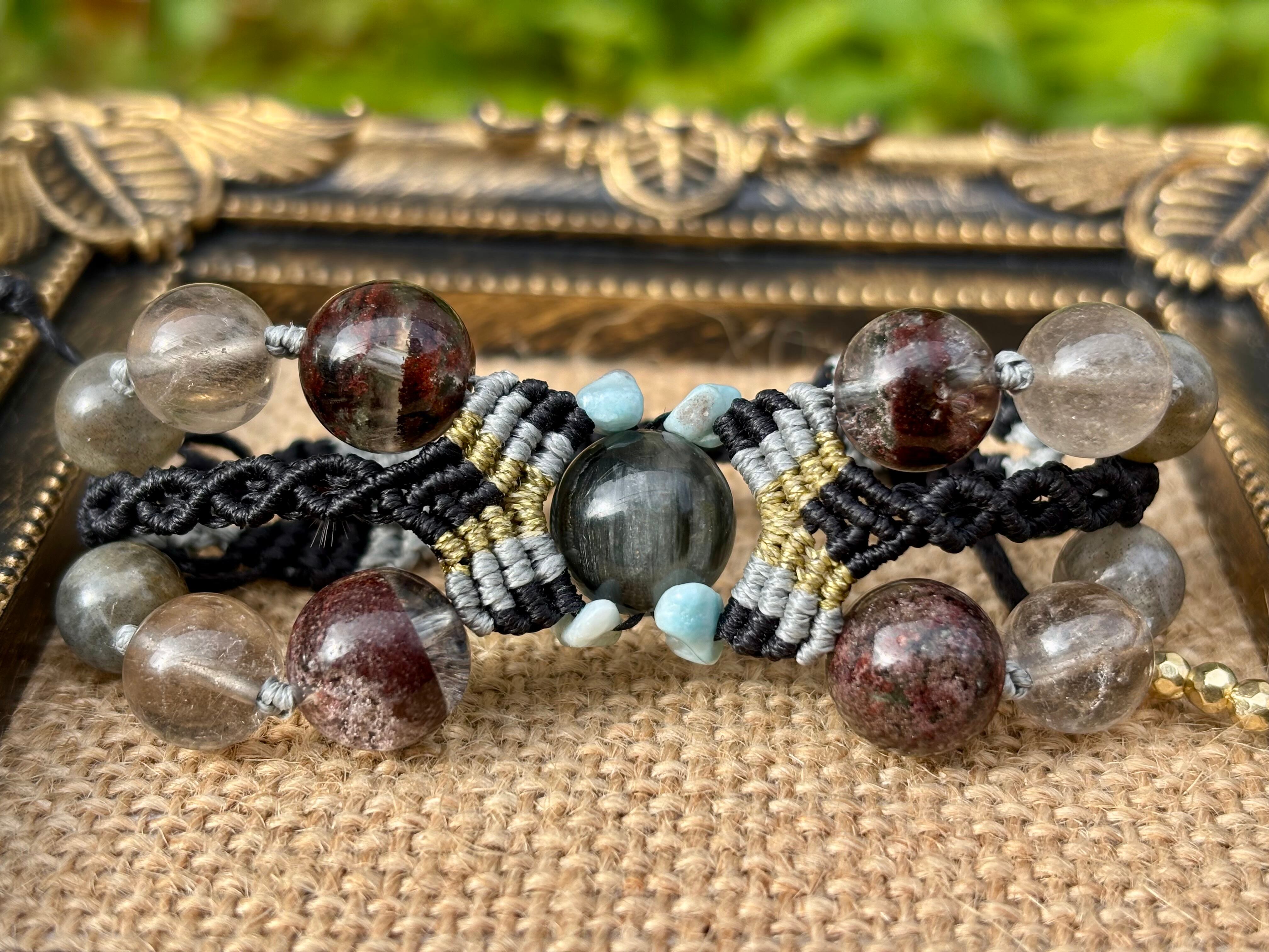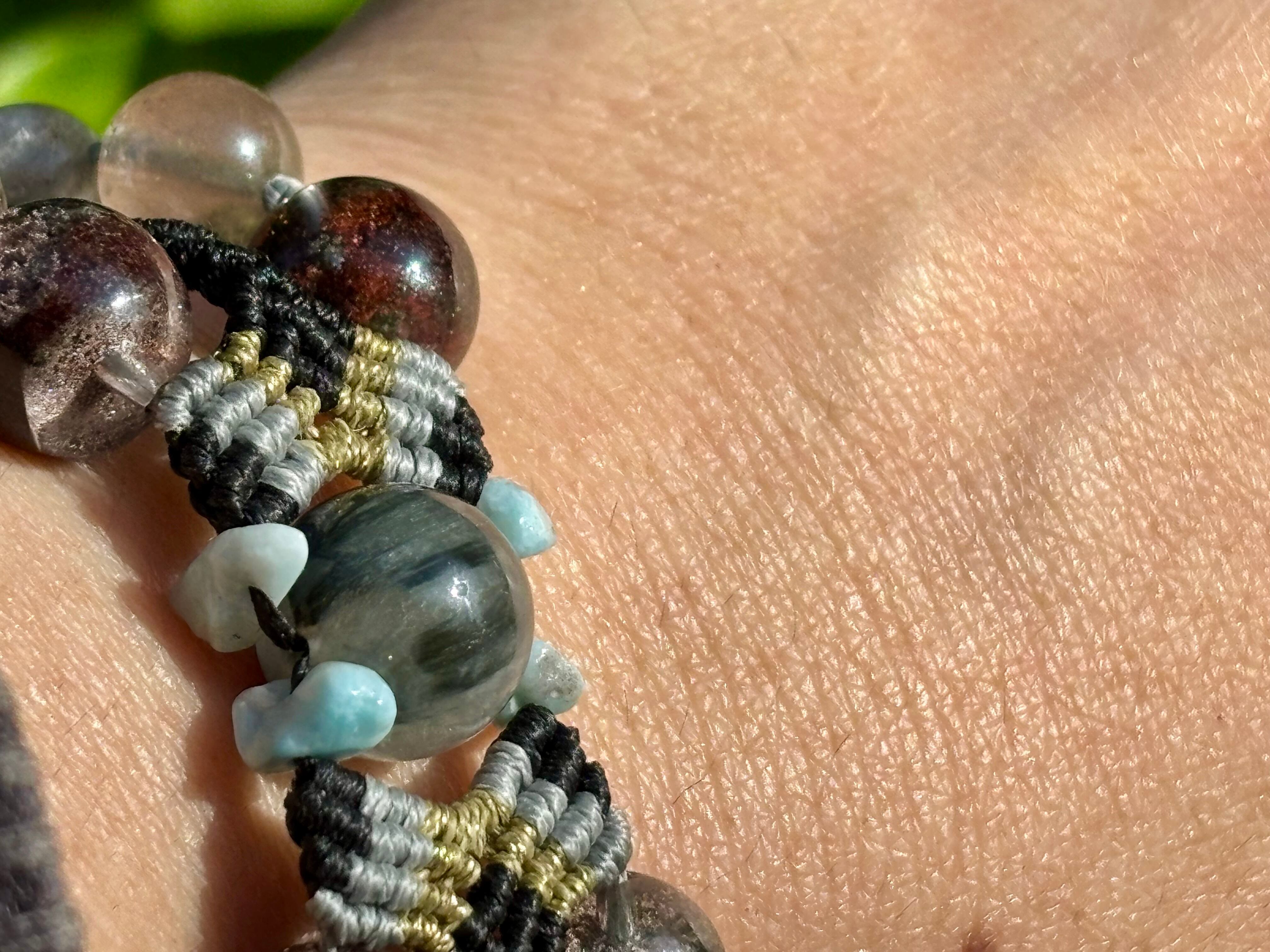 #929超希少‼︎ブラックサゲニティック一点物(ブラックサゲニティック×ラリマー×ラブラドライト マクラメ編みブレスレット)