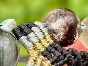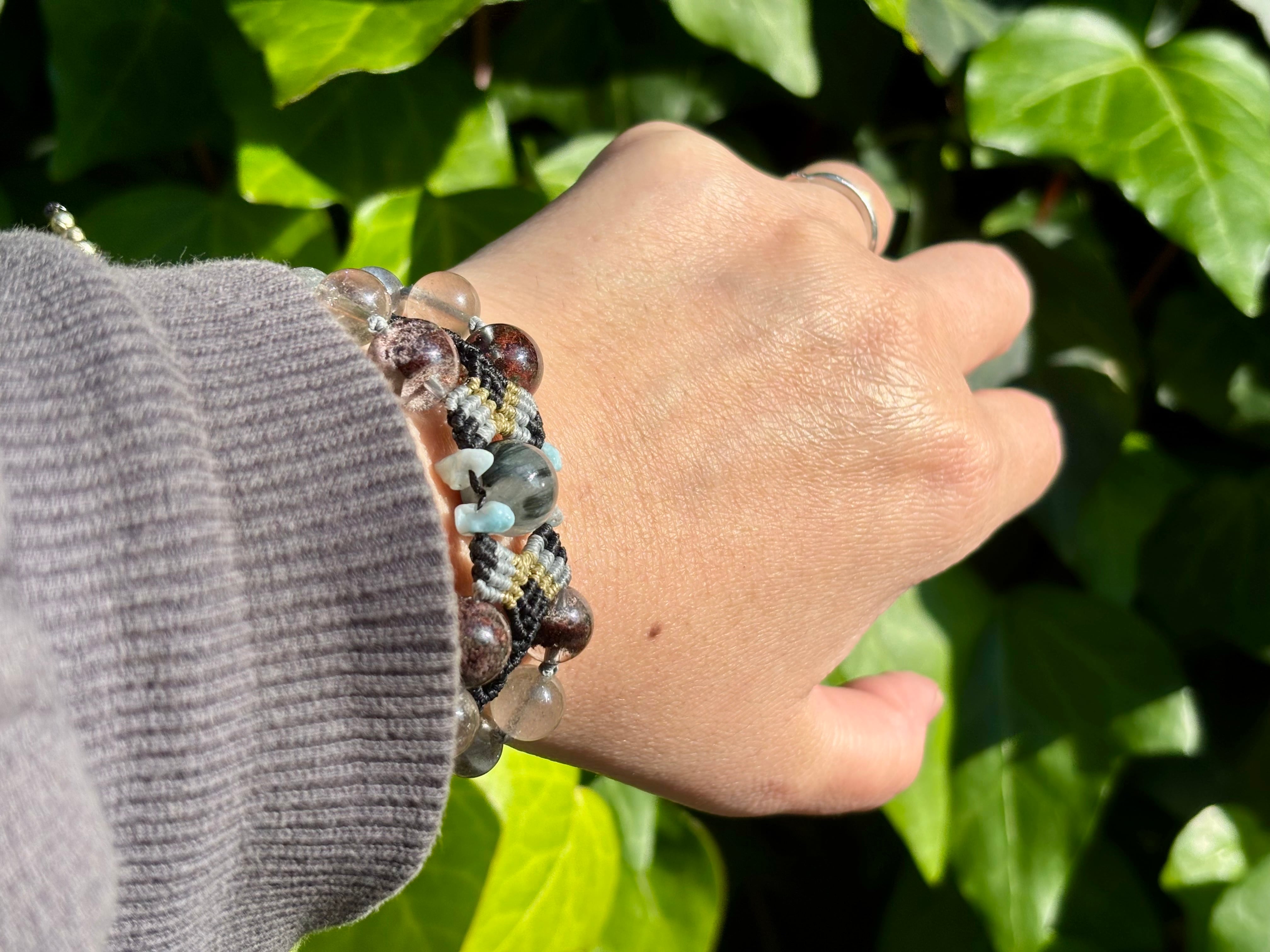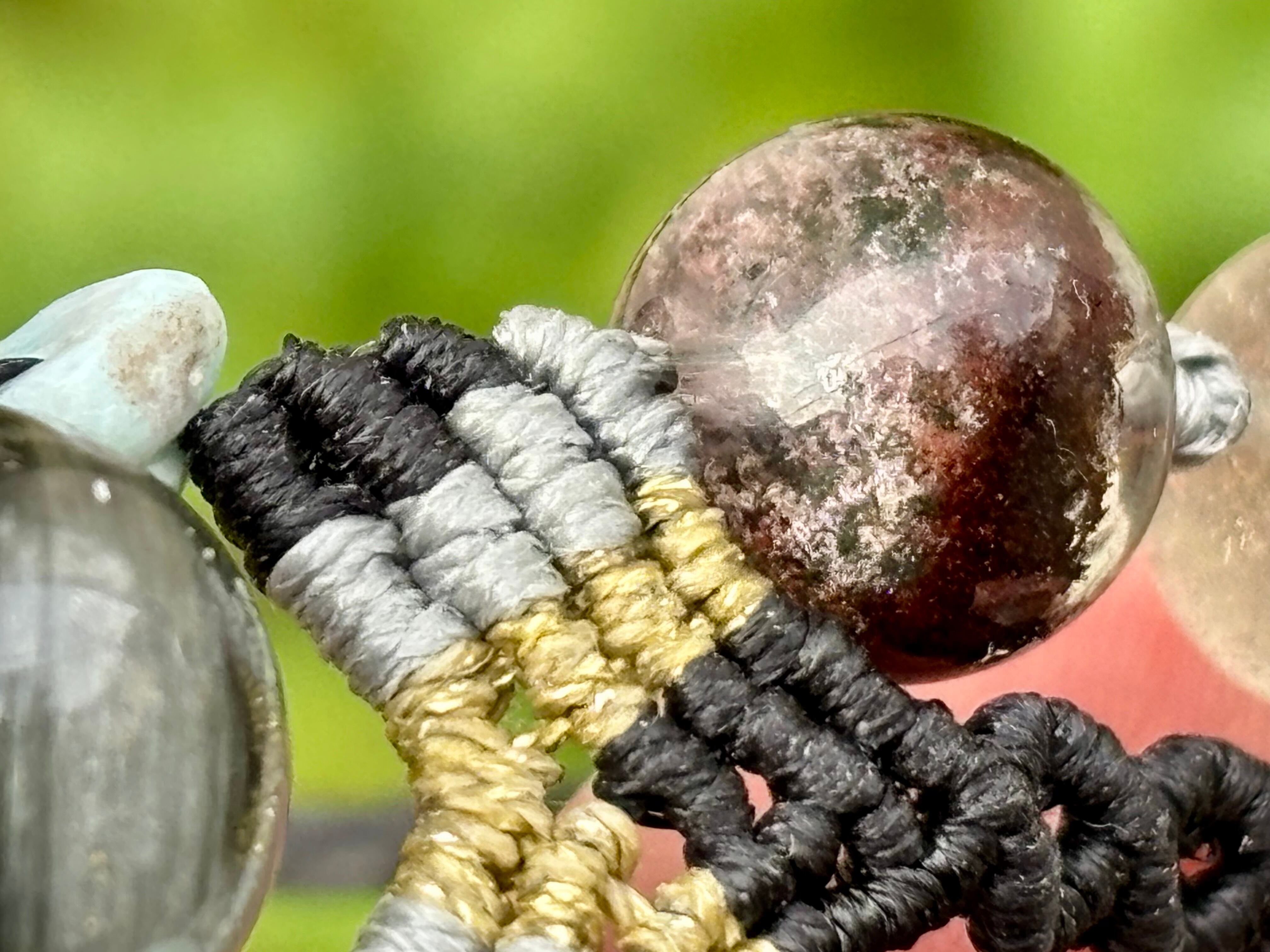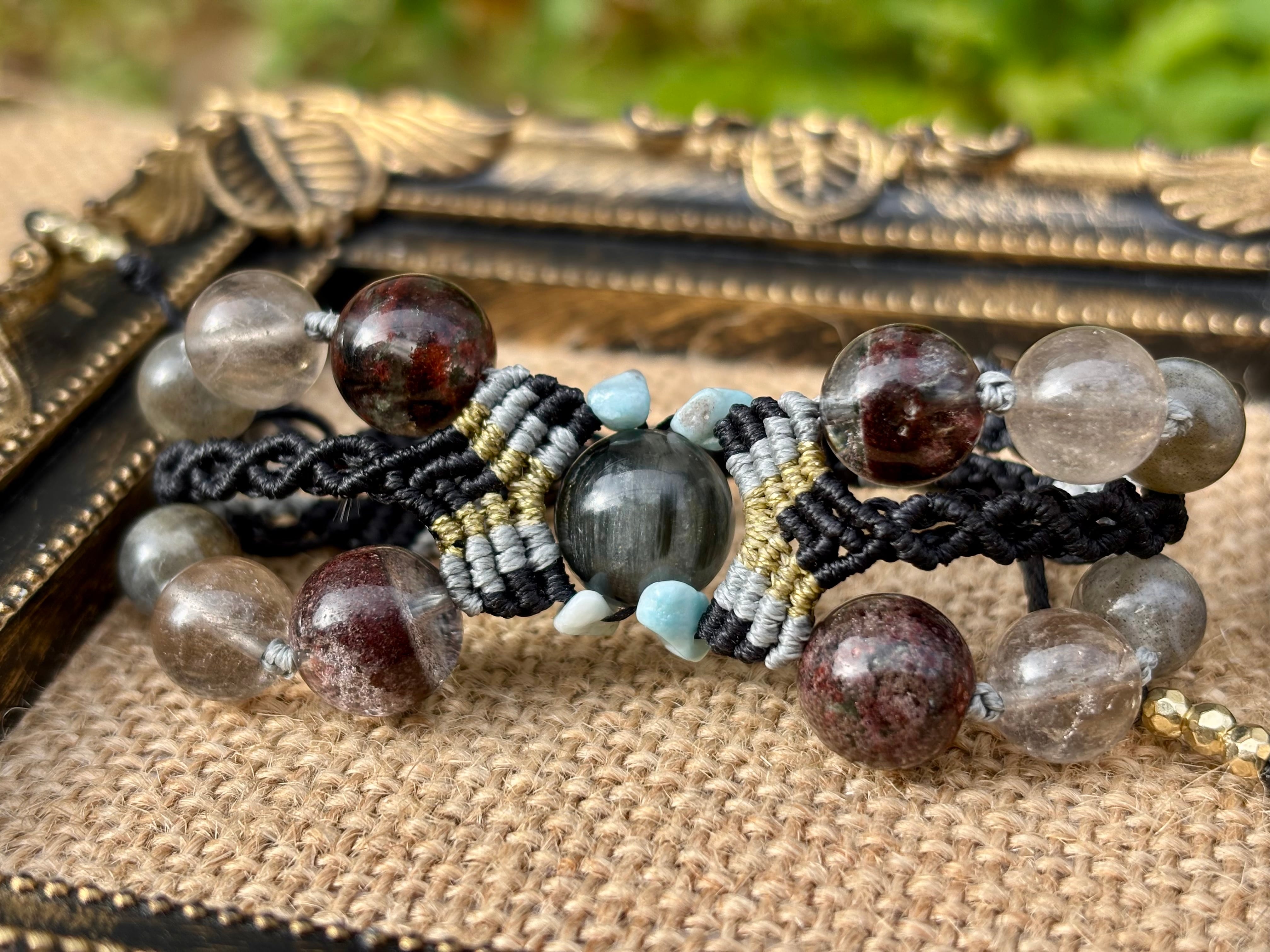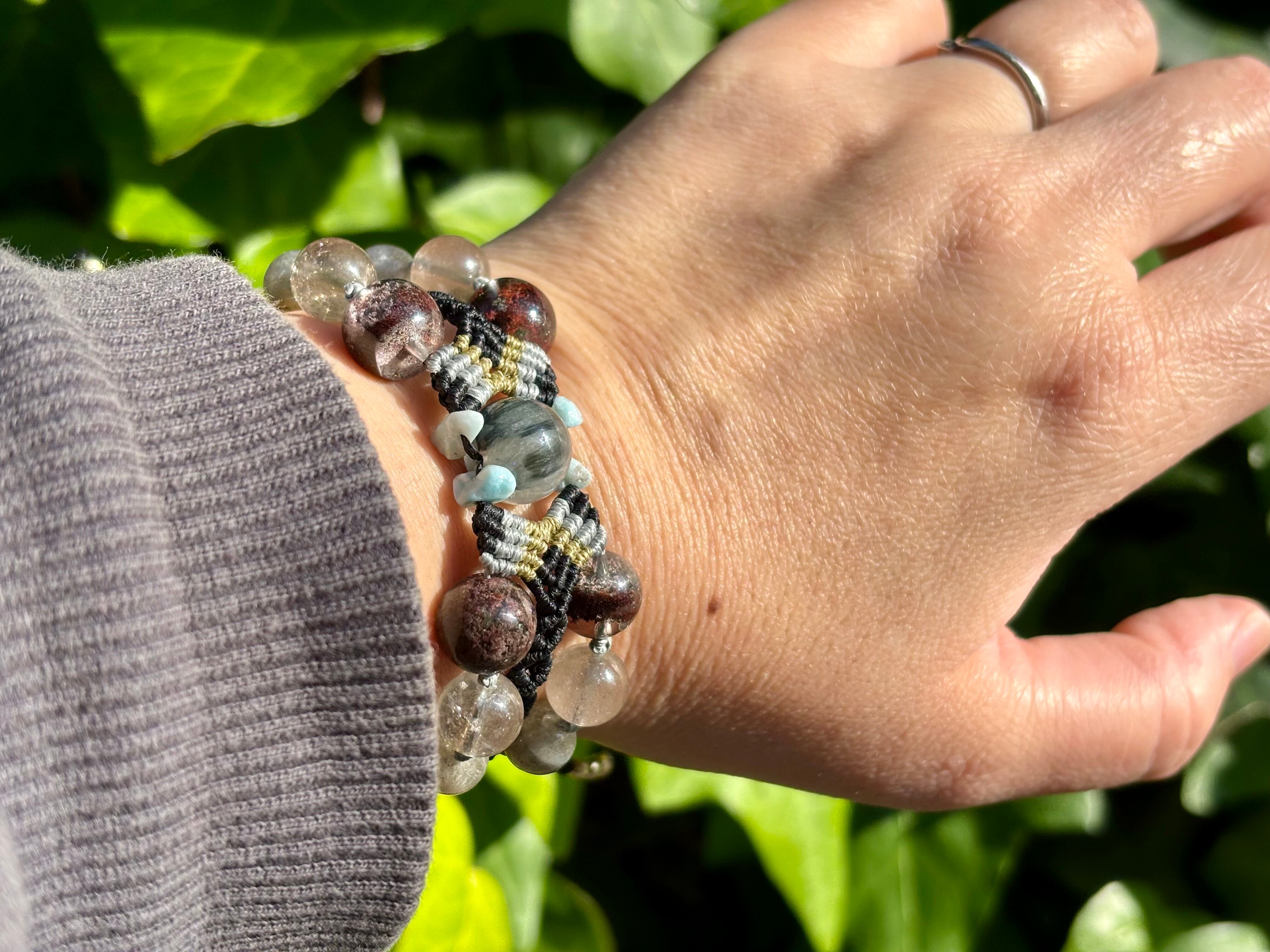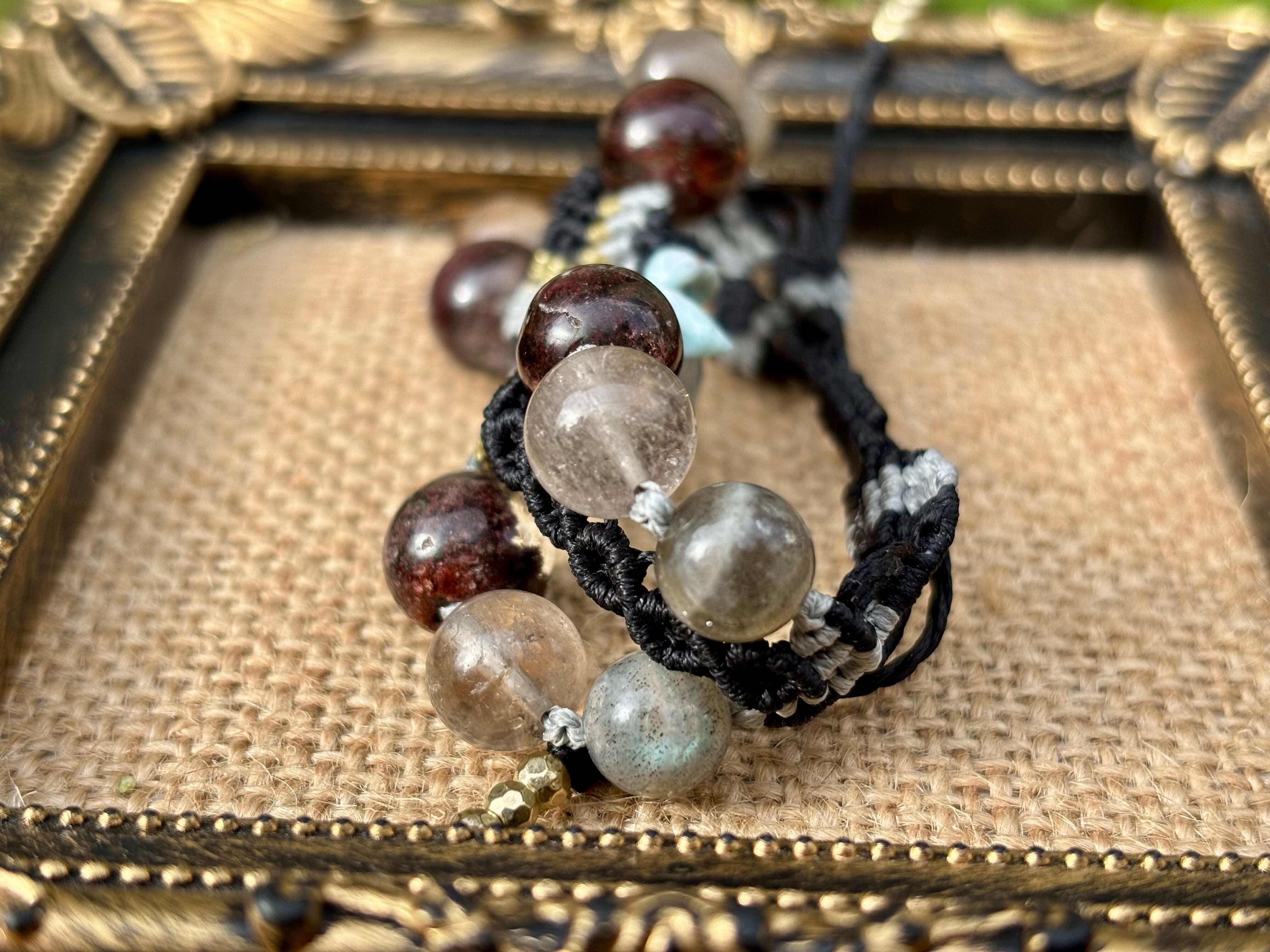 #929超希少‼︎ブラックサゲニティック一点物(ブラックサゲニティック×ラリマー×ラブラドライト マクラメ編みブレスレット)