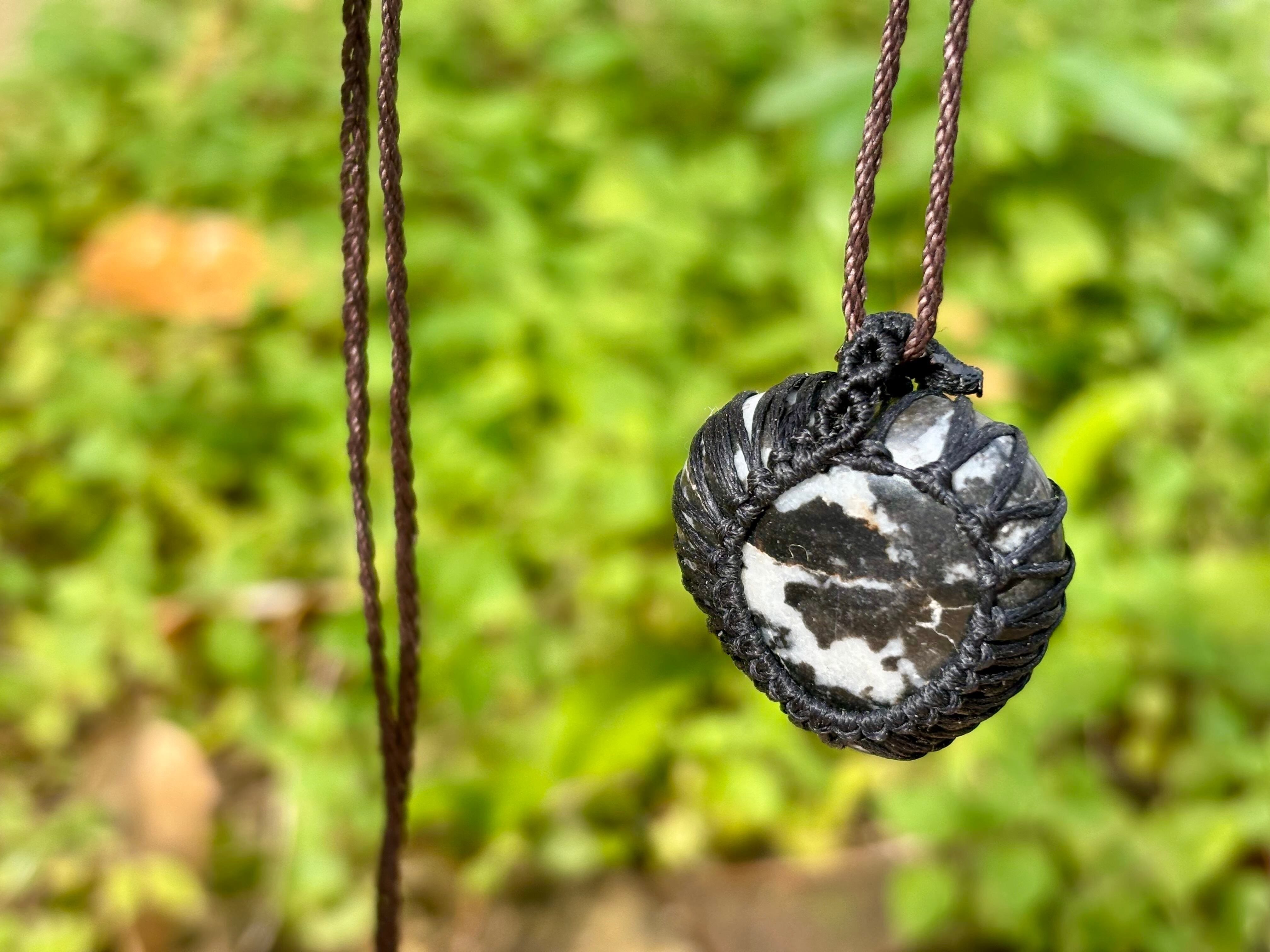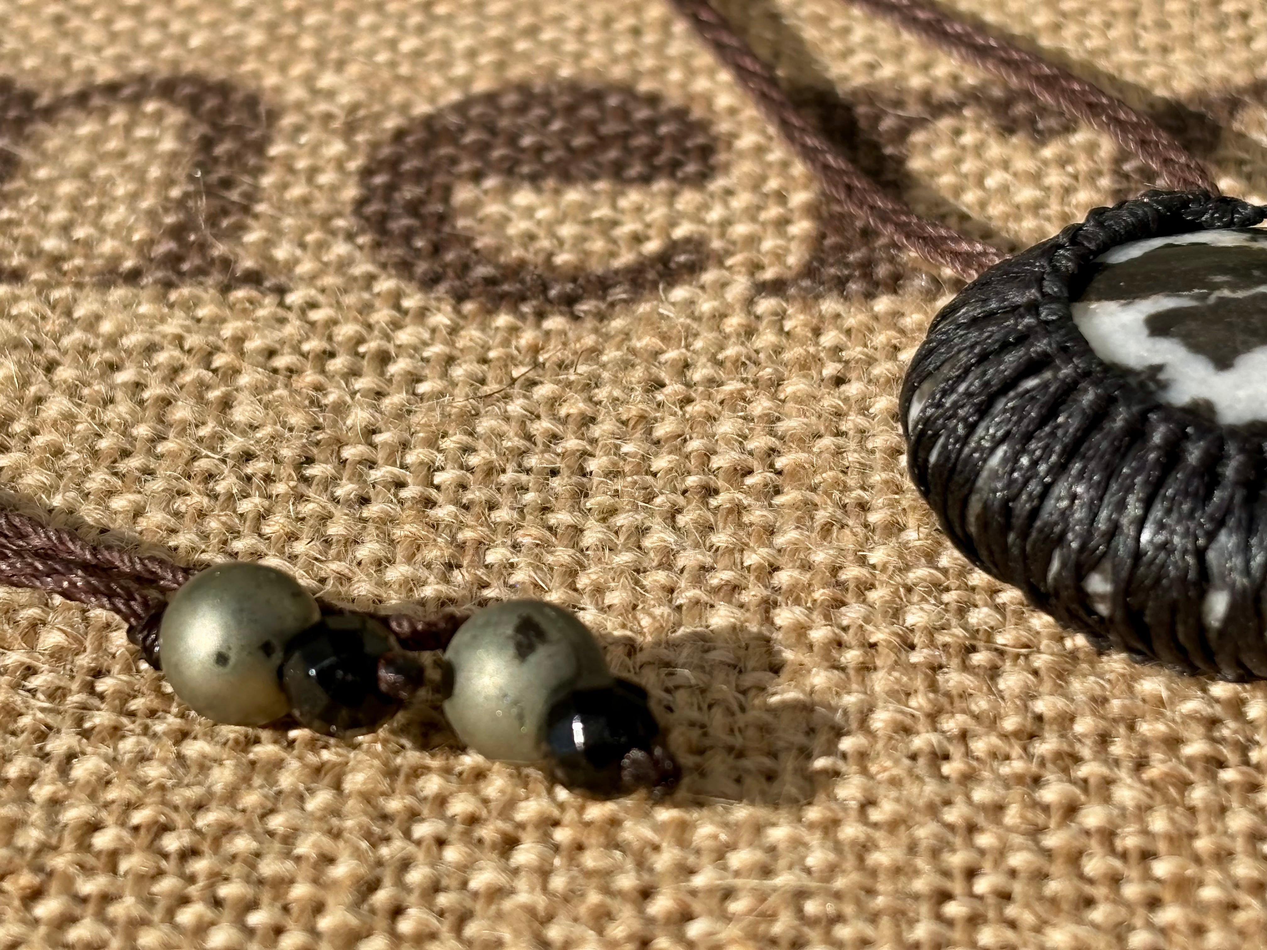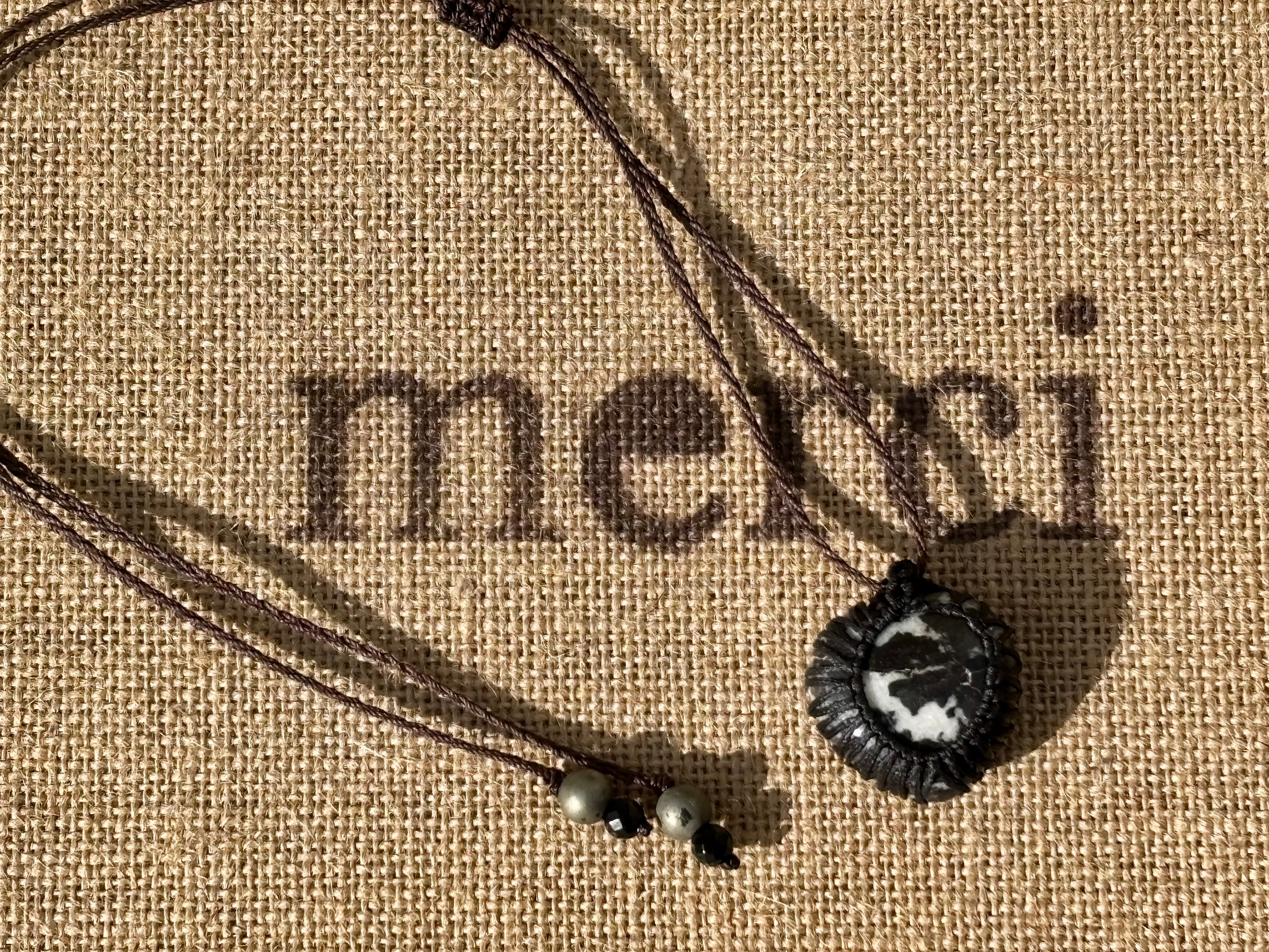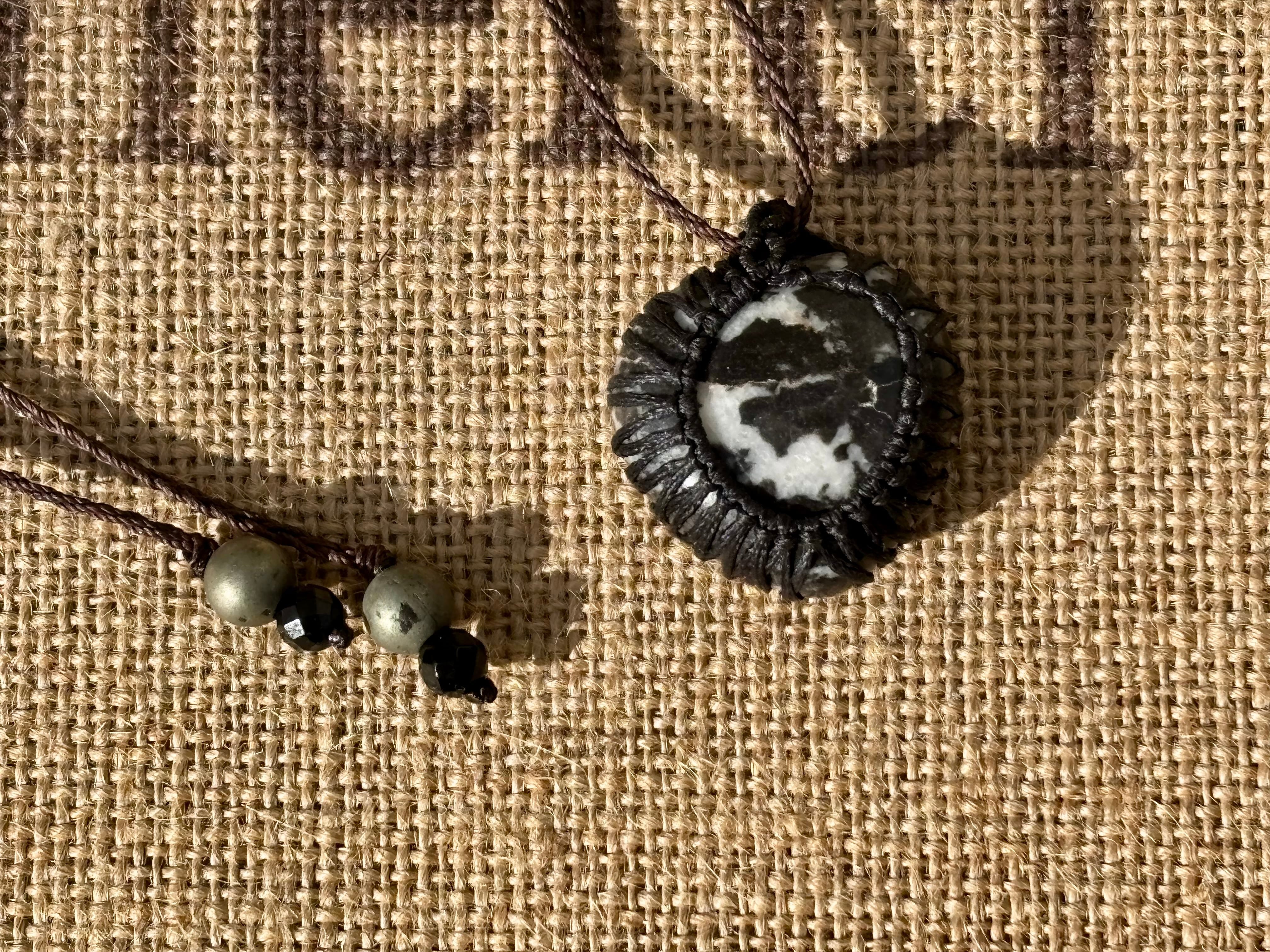 #930希少ホワイトバッファロー一点物 (ホワイトバッファローストーン×パイライト×ヘマタイト マクラメ編みデザインネックレス)
