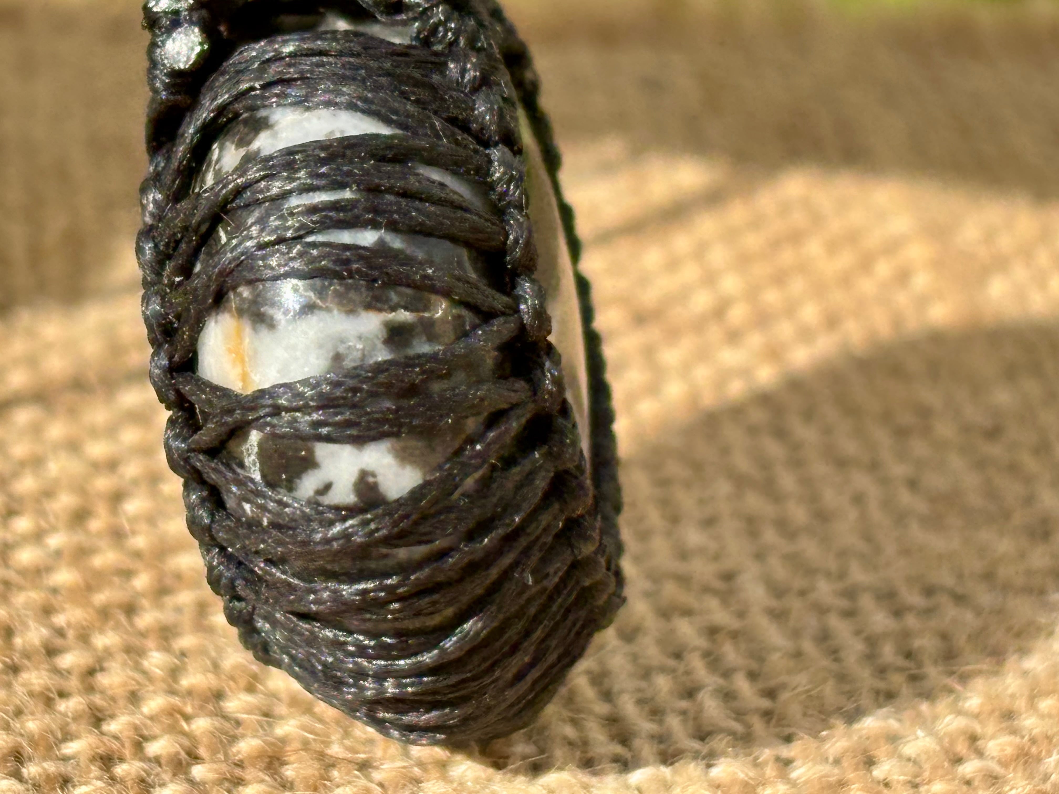 ホワイトバッファローストーンは、ネバダで採掘される希少な白い天然石で、「奇跡を呼ぶ石」や「聖なる石」と呼ばれ、ネイティブアメリカンに古くから大切にされてきた石です。マットな白地に黒い模様(ヘマタイト)が入るのが特徴で、見た目がターコイズに似ているため「ホワイトバッファロー・ターコイズ」とも呼ばれますが、鉱物的にはターコイズとは異なる(アラゴナイトやハウライトなどが使われることも)場合も多く、その希少性から「100万頭に1頭しか生まれない白いバッファロー」にちなんで名付けられました。心身の癒しや幸運を呼び込むパワーストーンとして人気があります。
