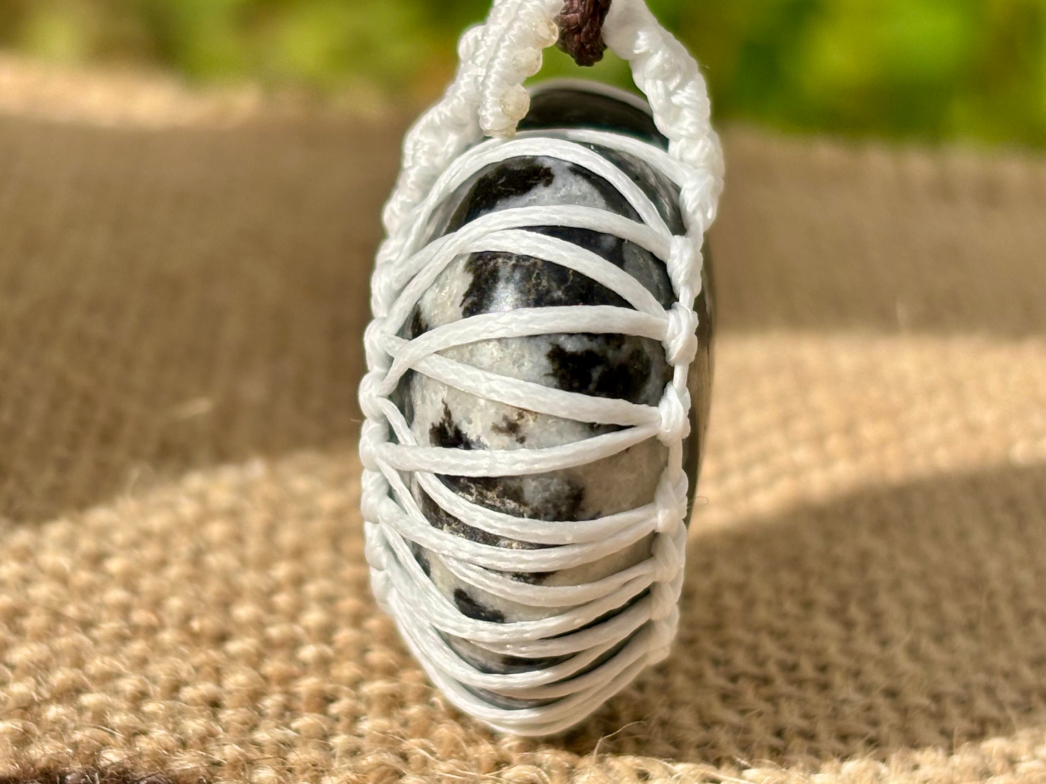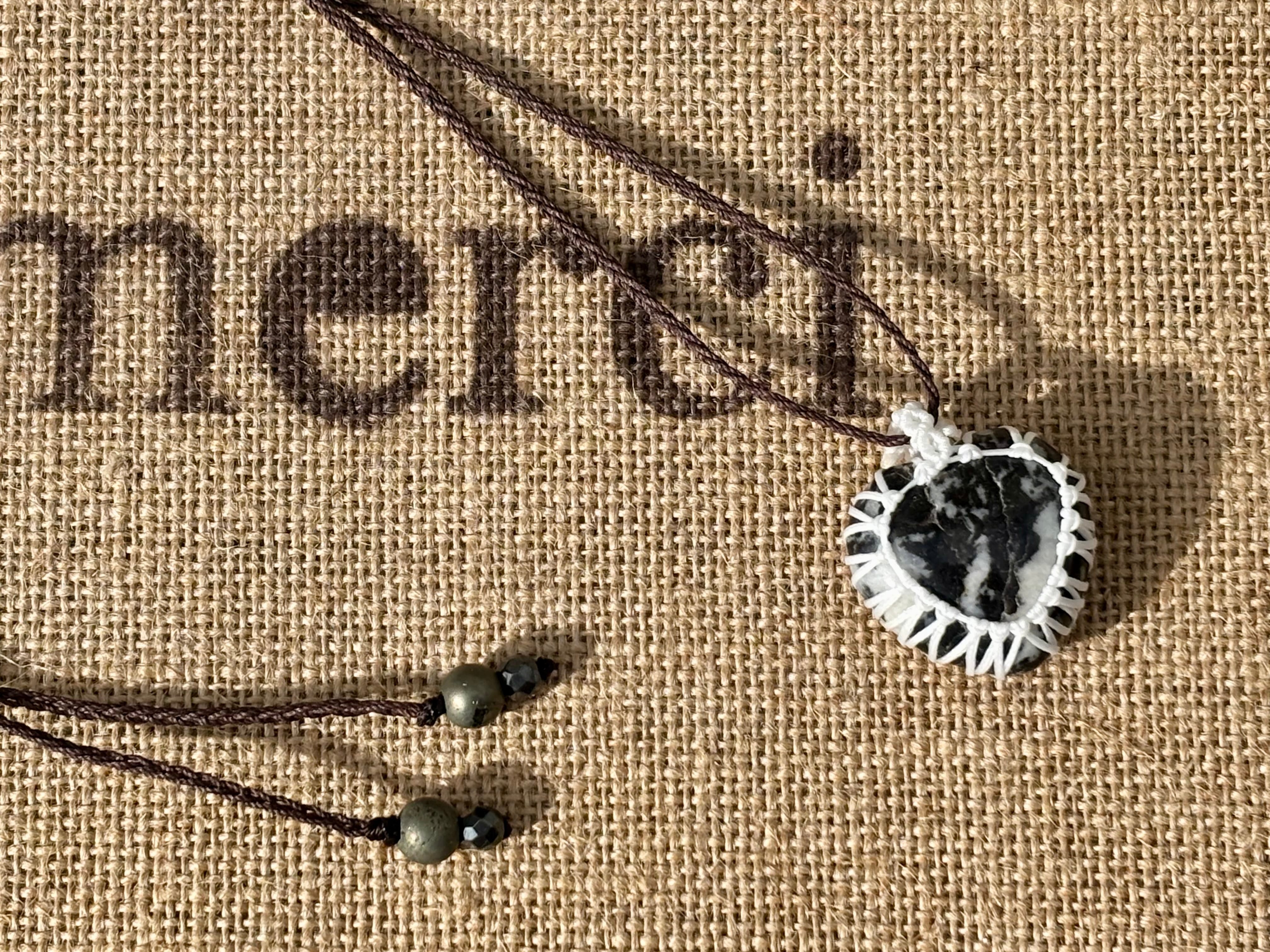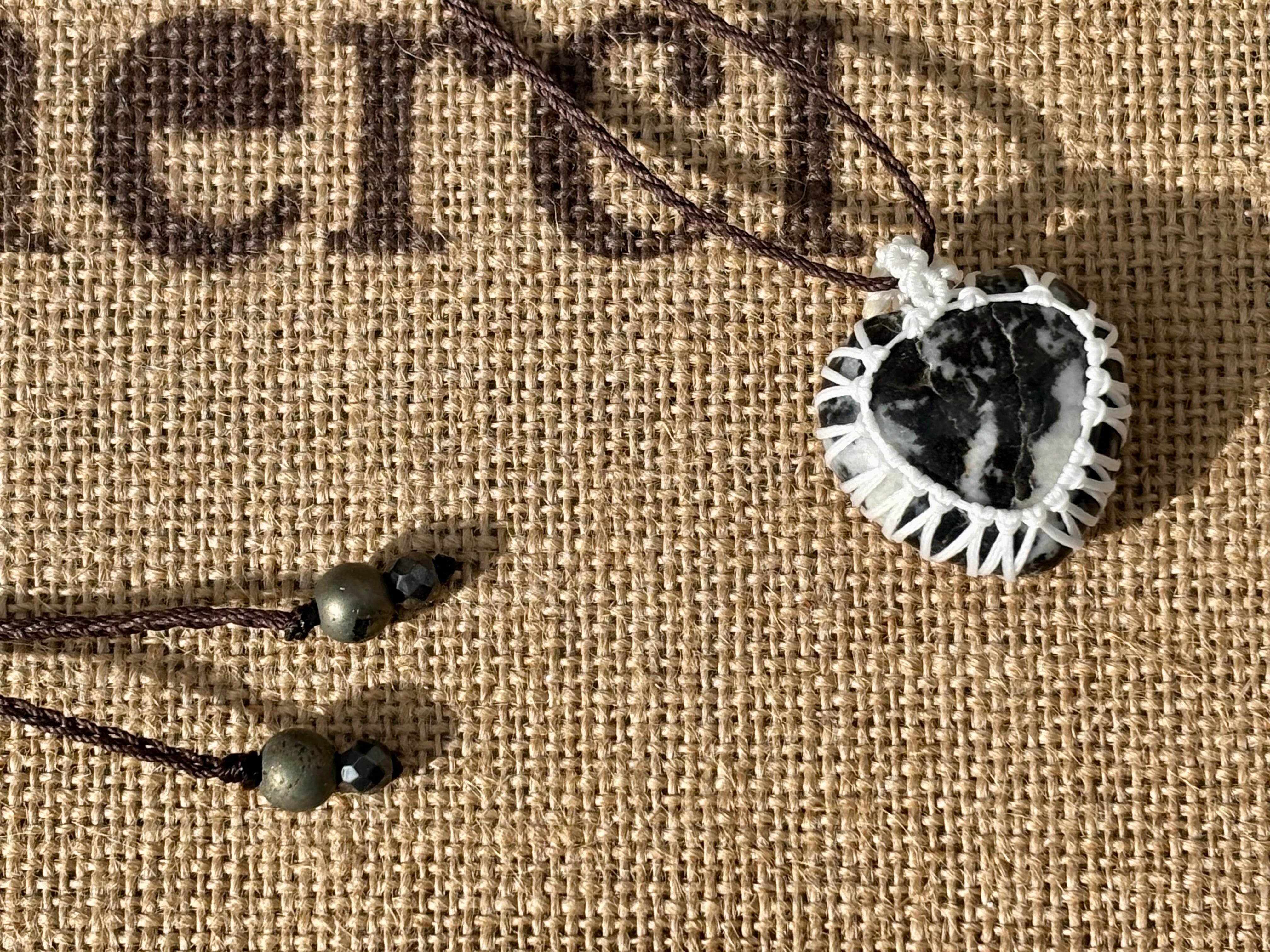 #931希少ホワイトバッファロー一点物 (ホワイトバッファローストーン×パイライト×ヘマタイト マクラメ編みデザインネックレス)