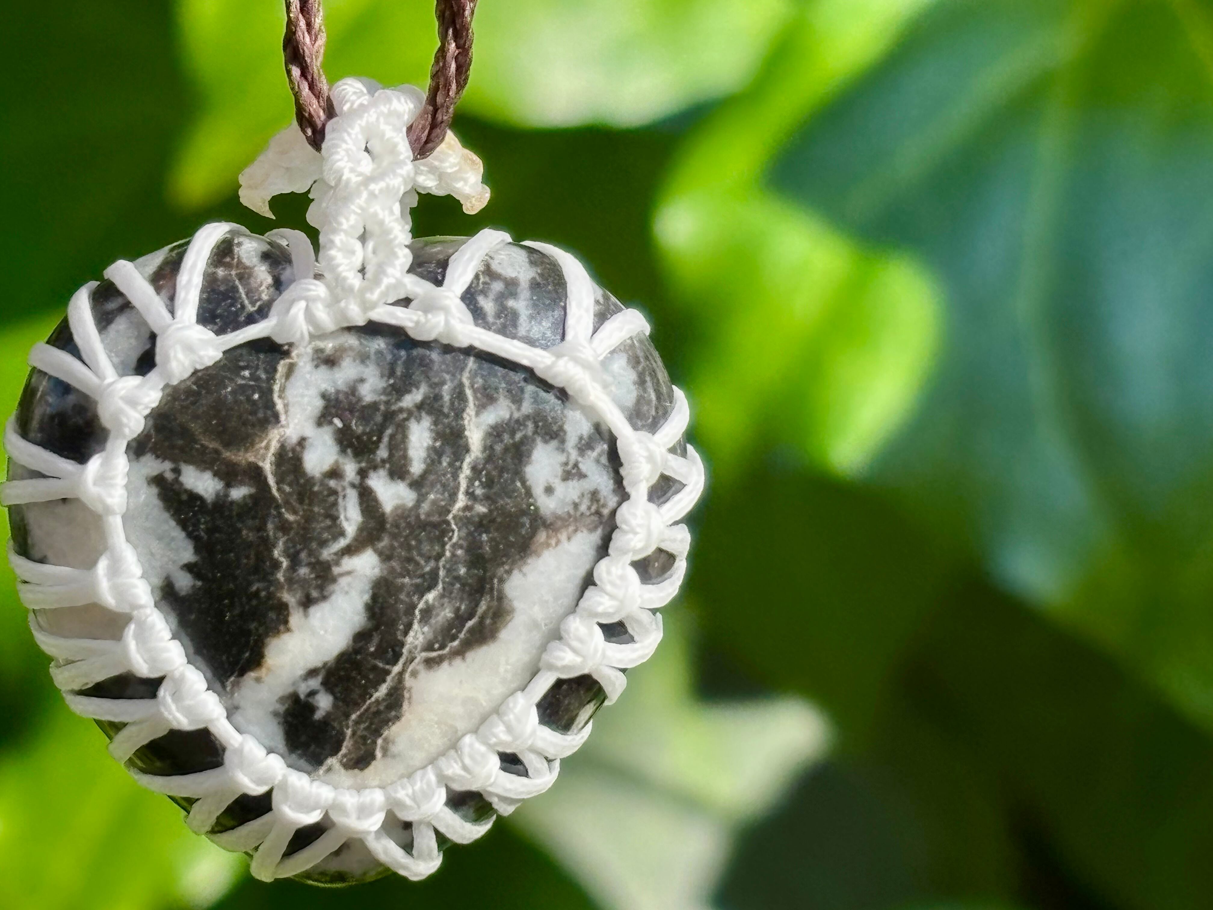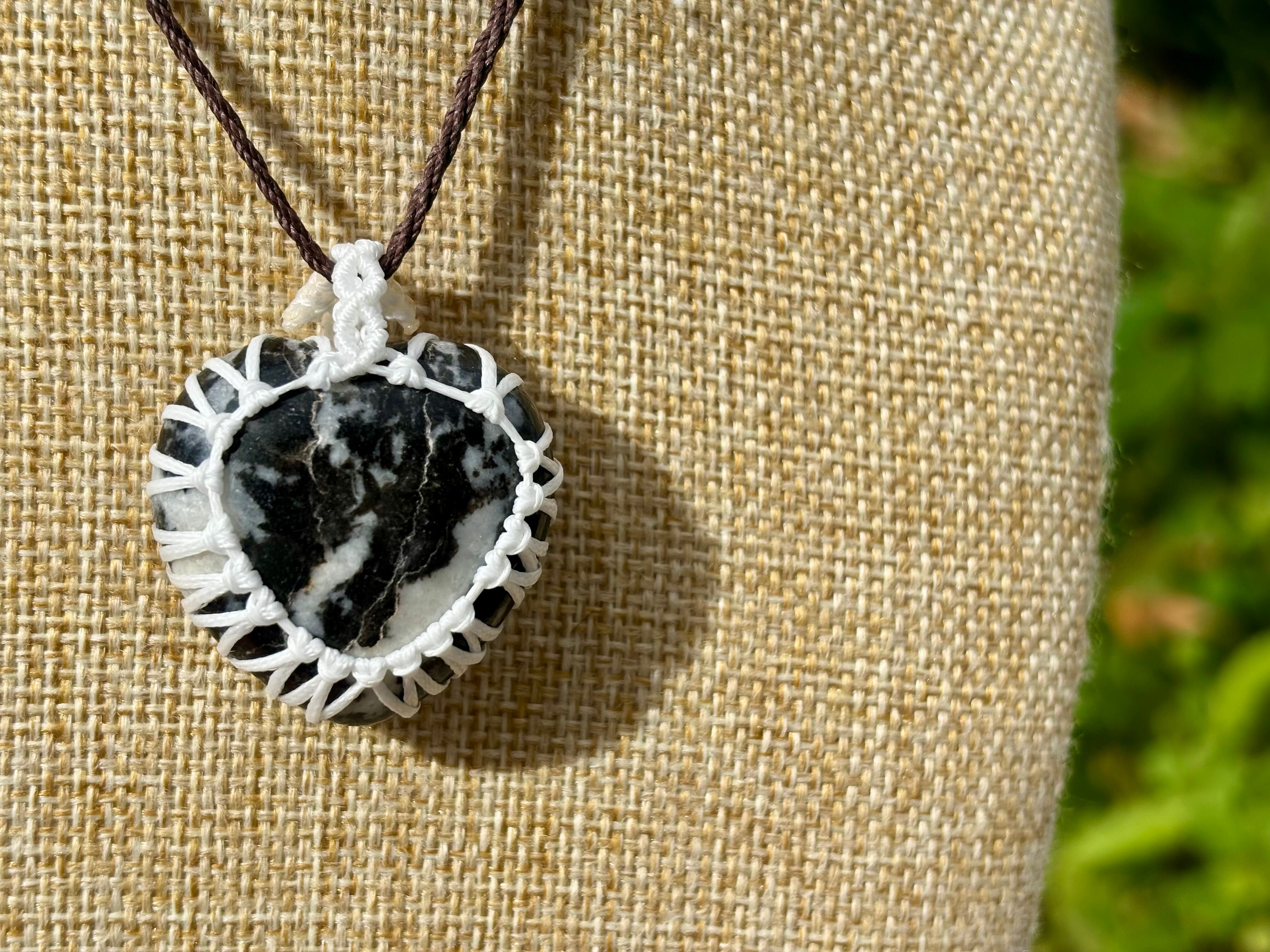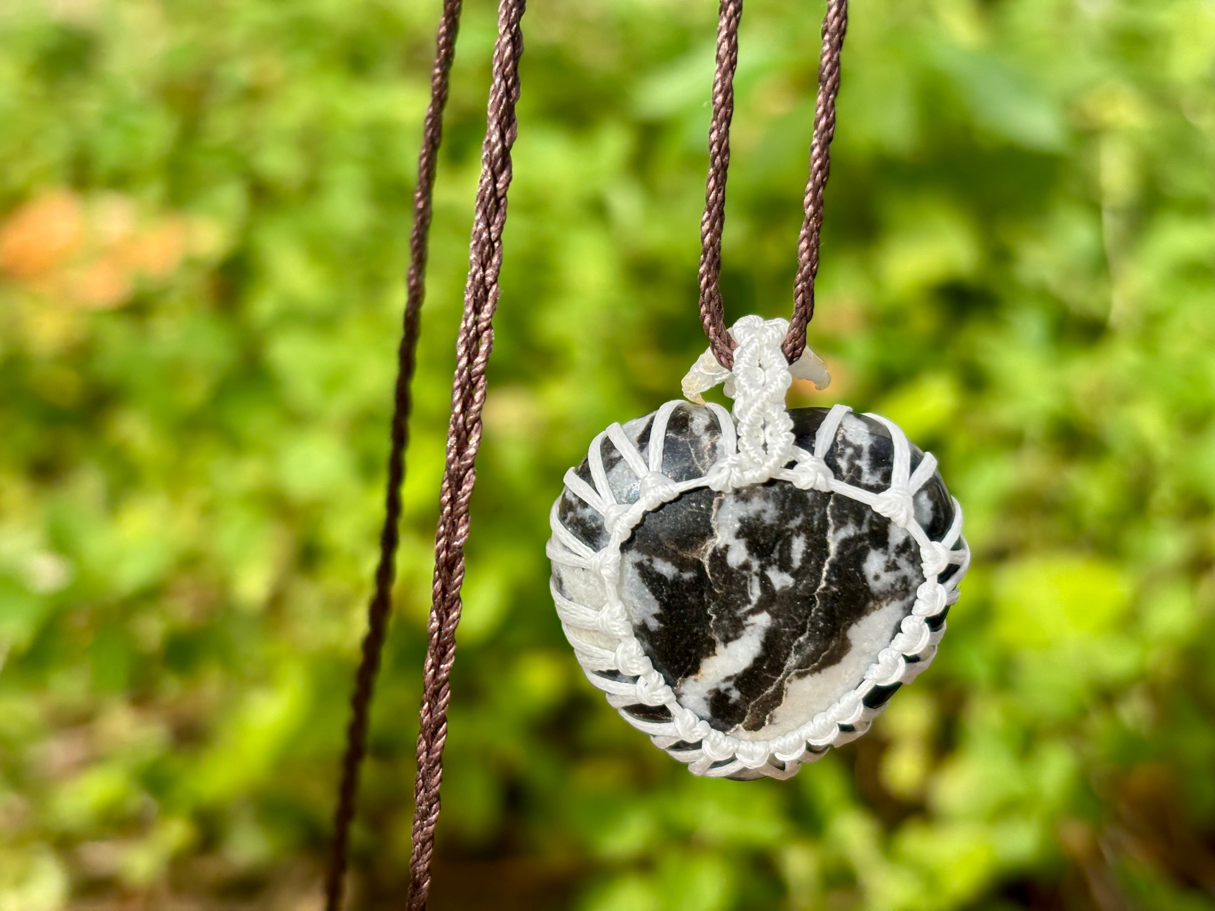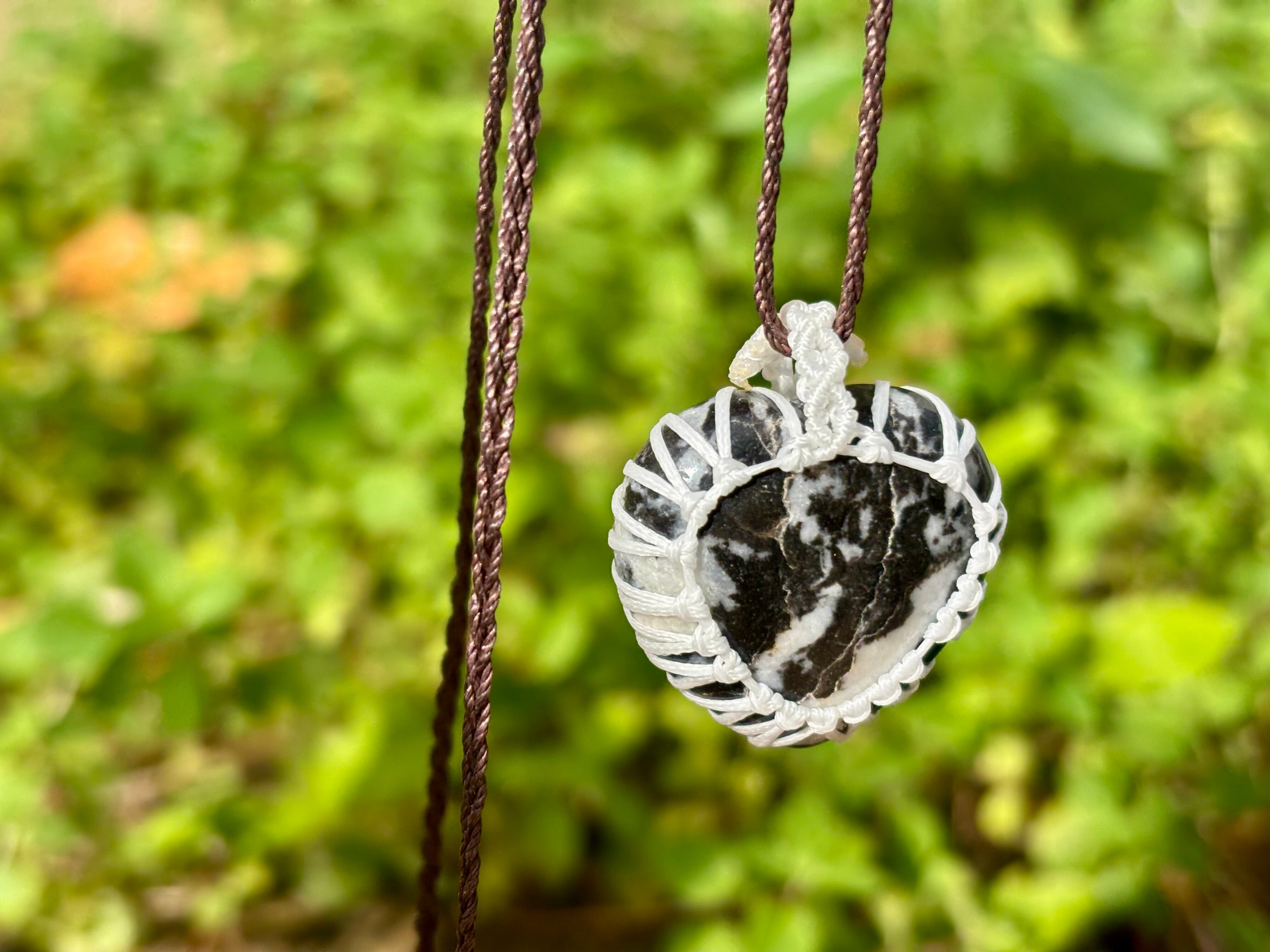 #931希少ホワイトバッファロー一点物 (ホワイトバッファローストーン×パイライト×ヘマタイト マクラメ編みデザインネックレス)