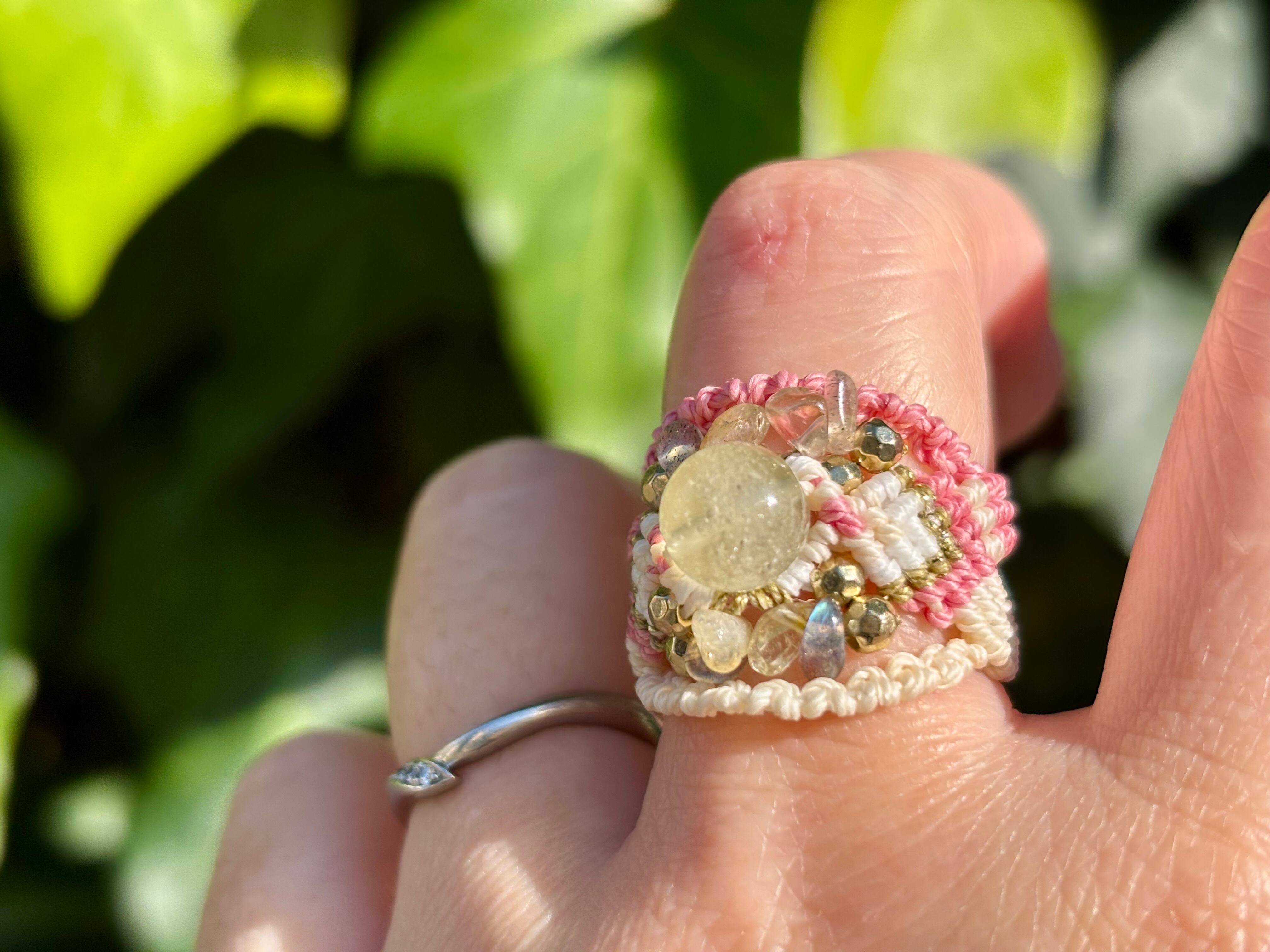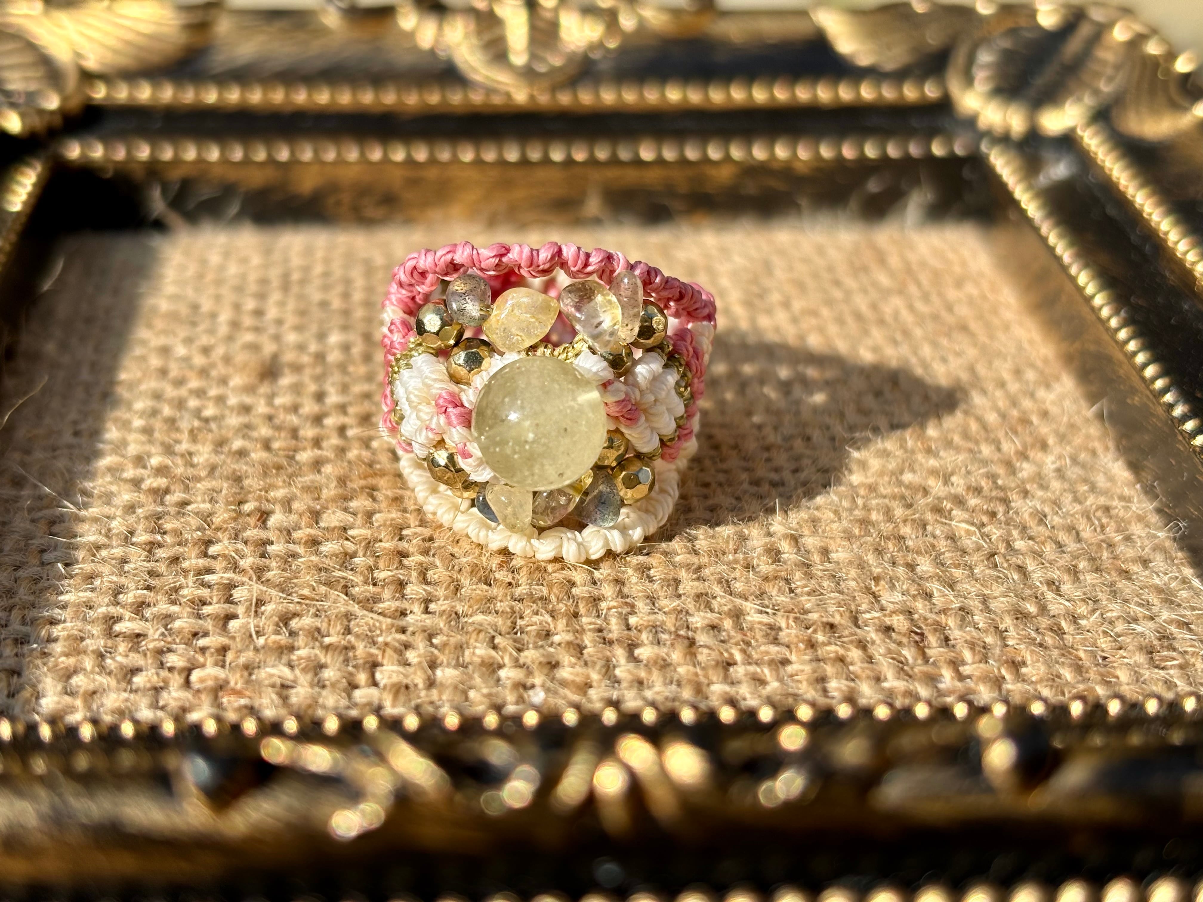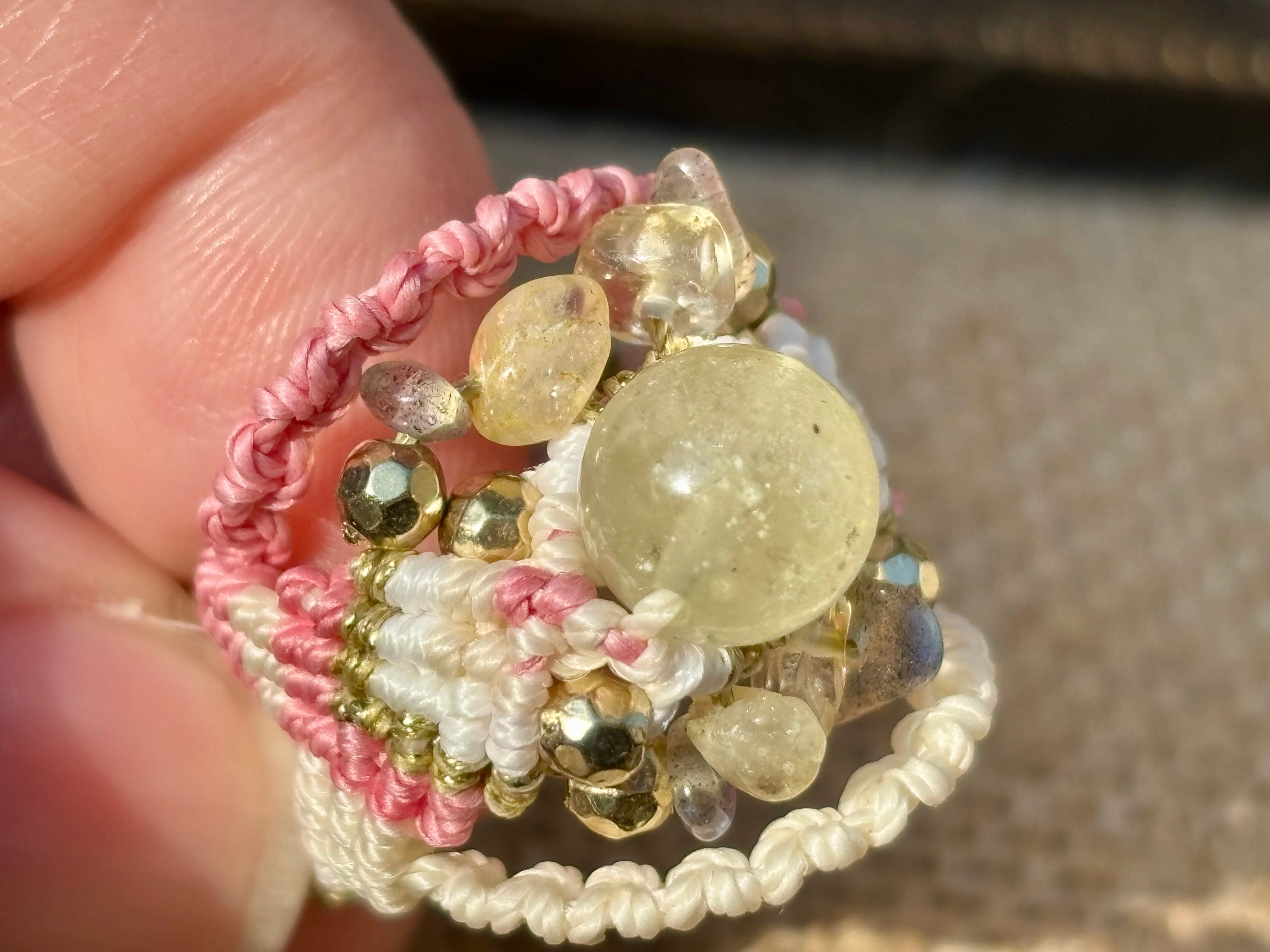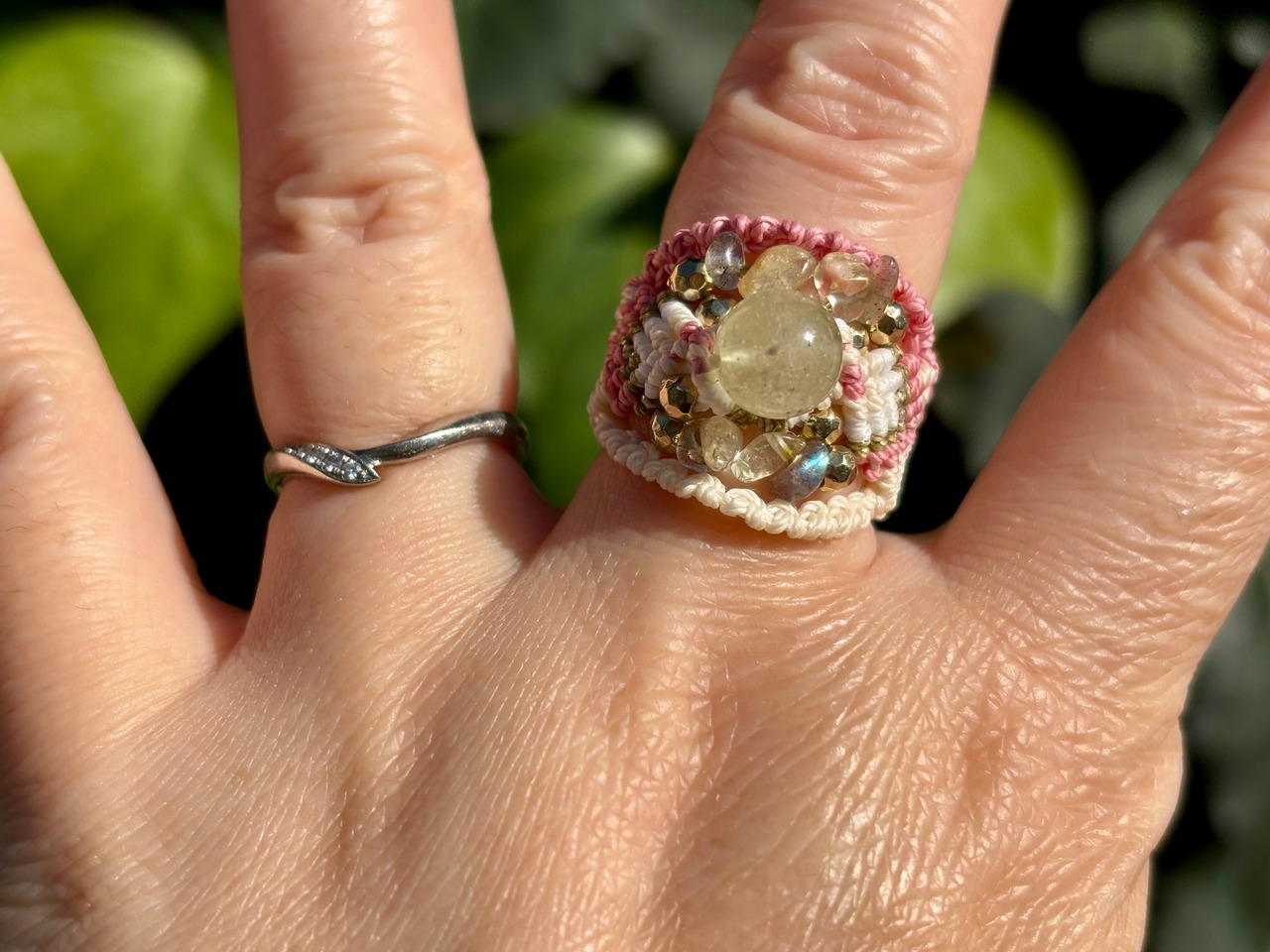 #932激レア⭐︎リビアングラス一点物(リビアングラス×シトリン×ラブラドライト マクラメ編みリング/指輪)