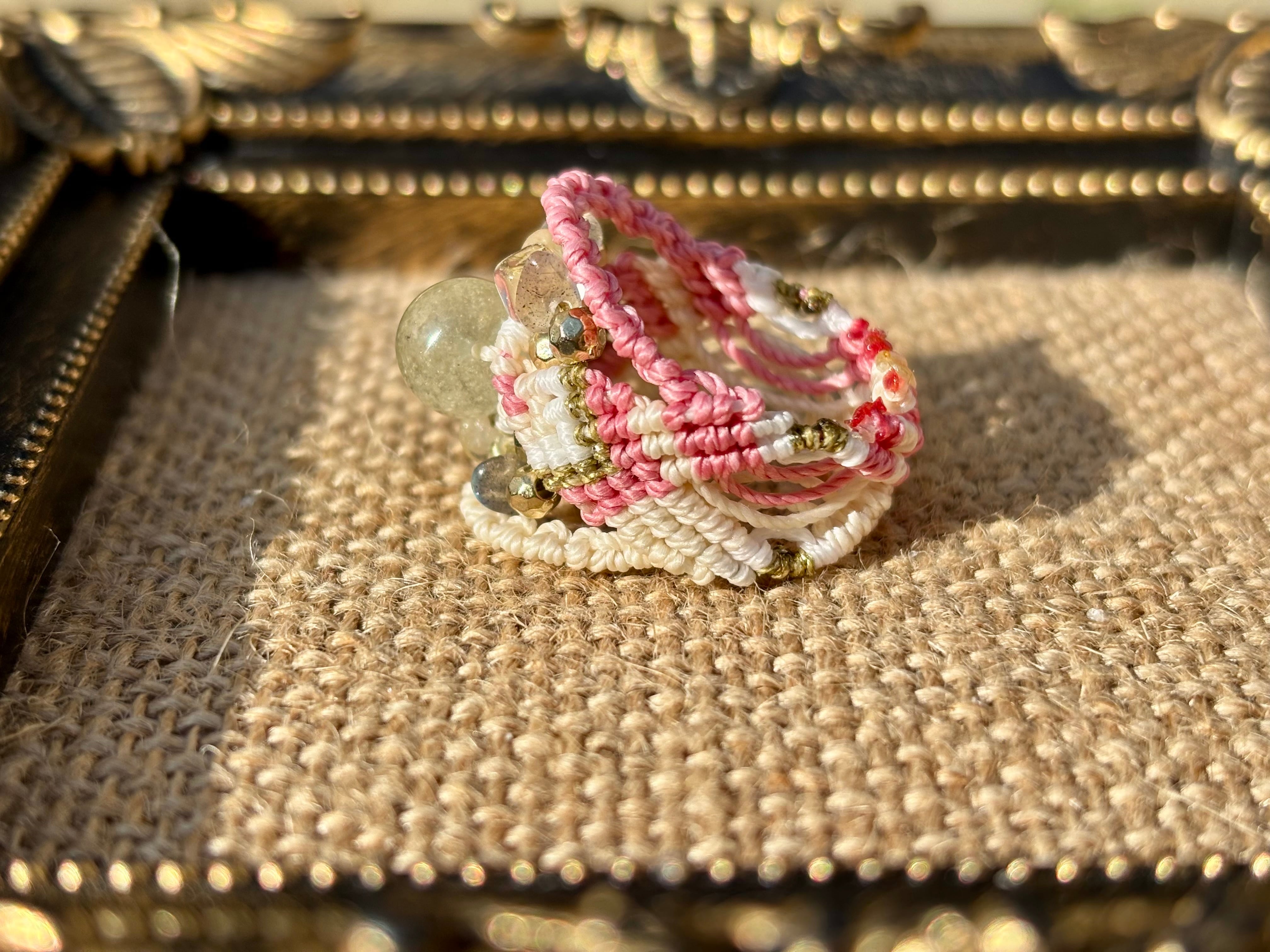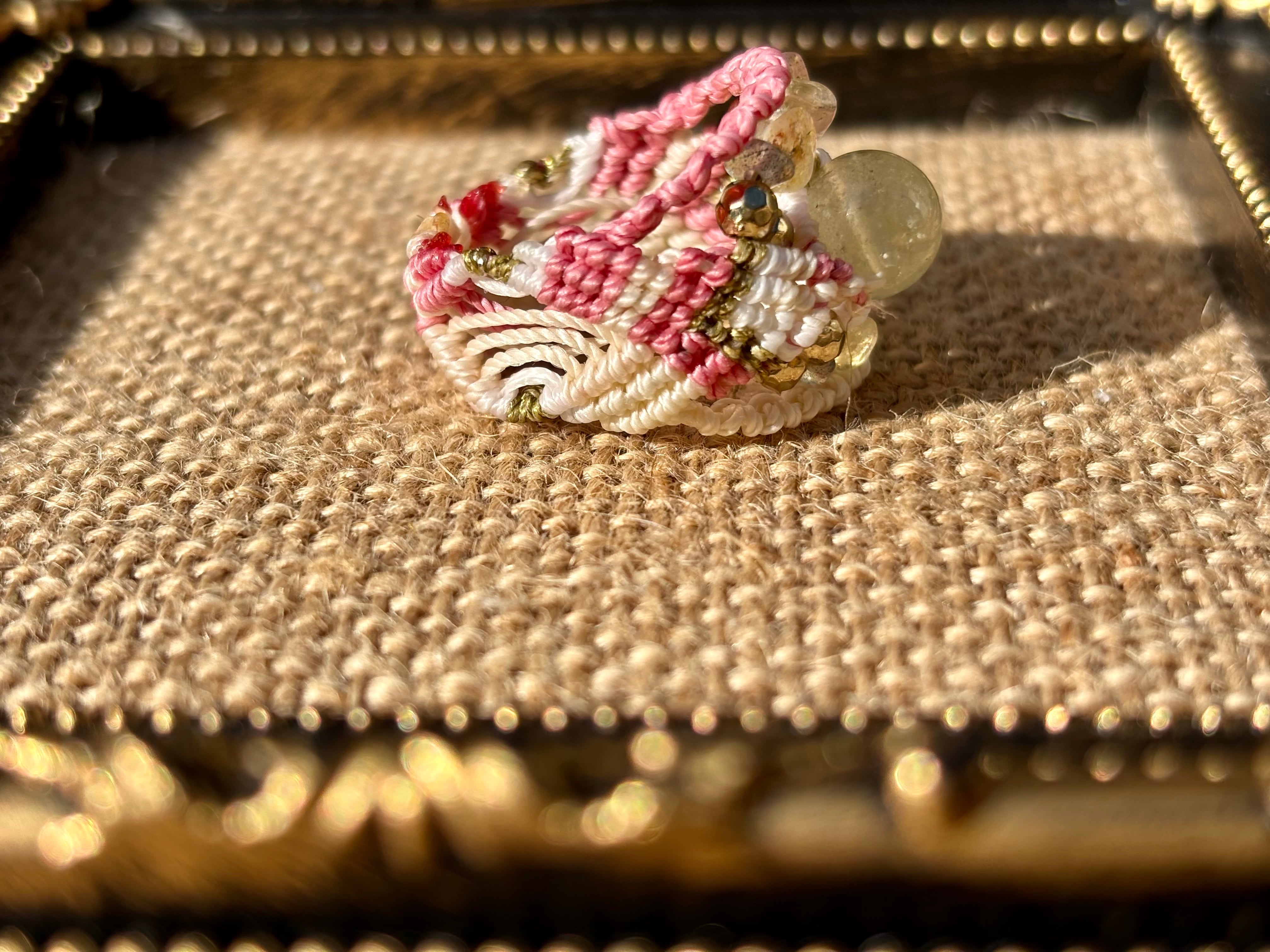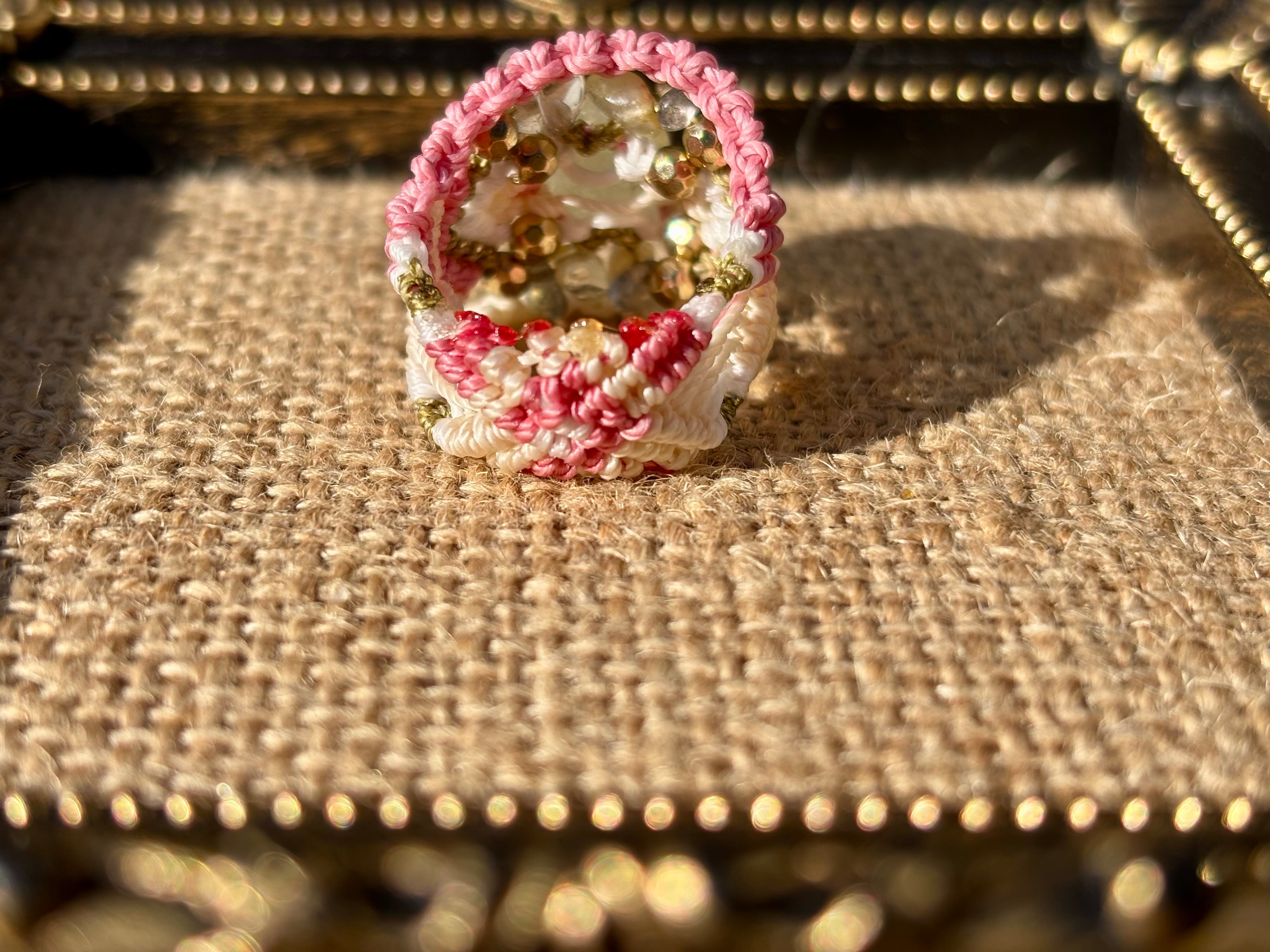手作業で丁寧に編み込まれたこのリングは、日常のコーディネートに華を添えるだけでなく、特別な場面でも存在感を発揮します。