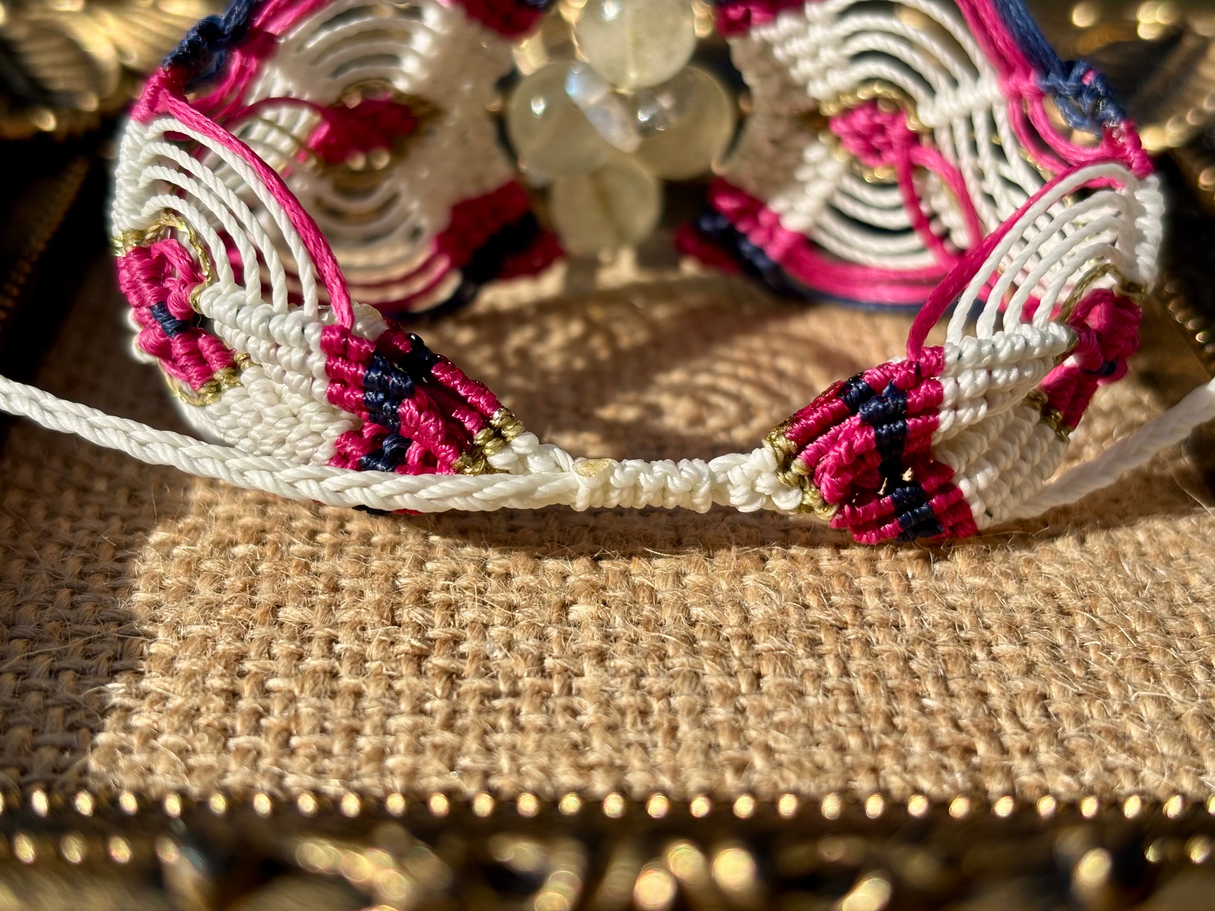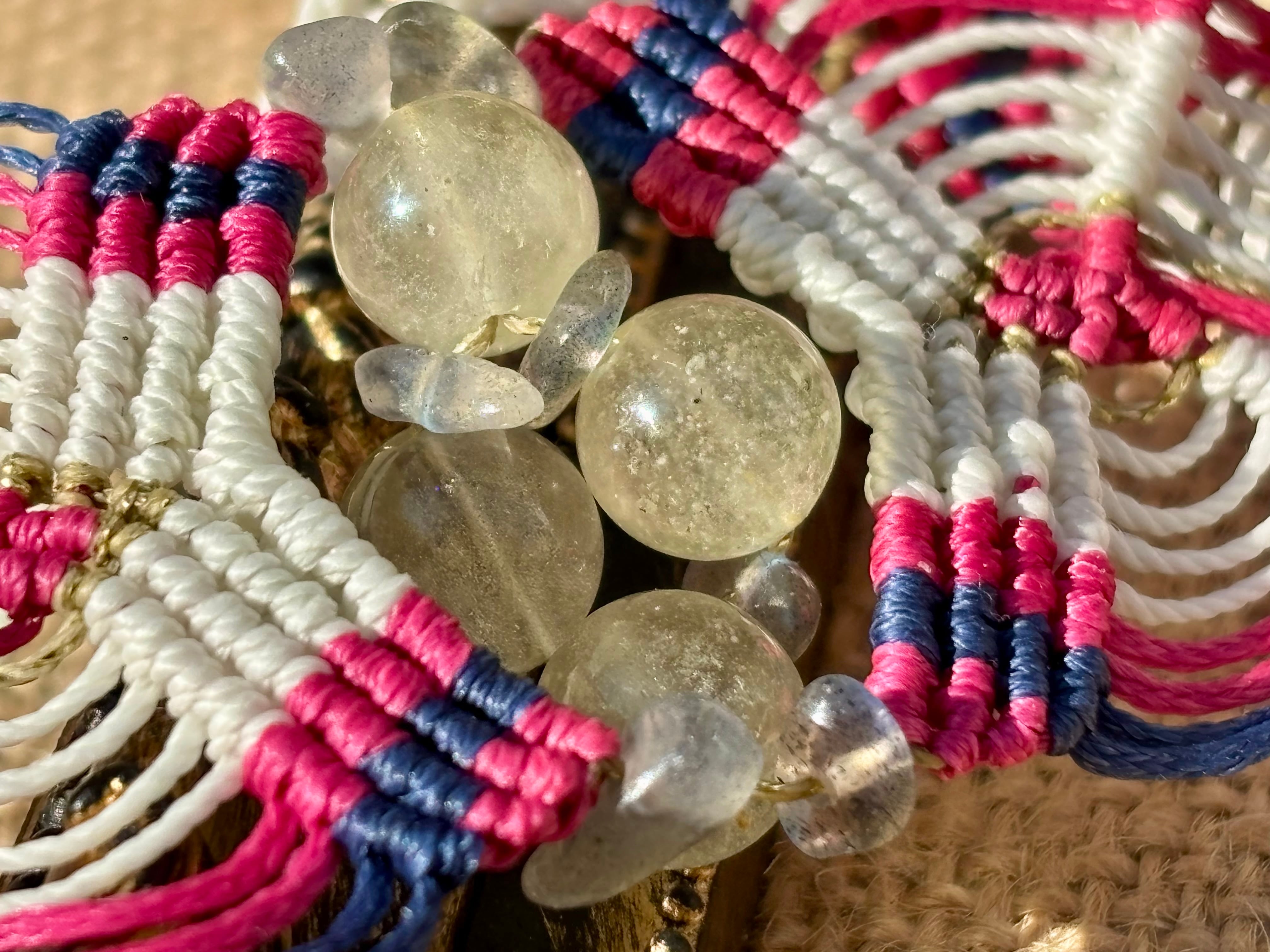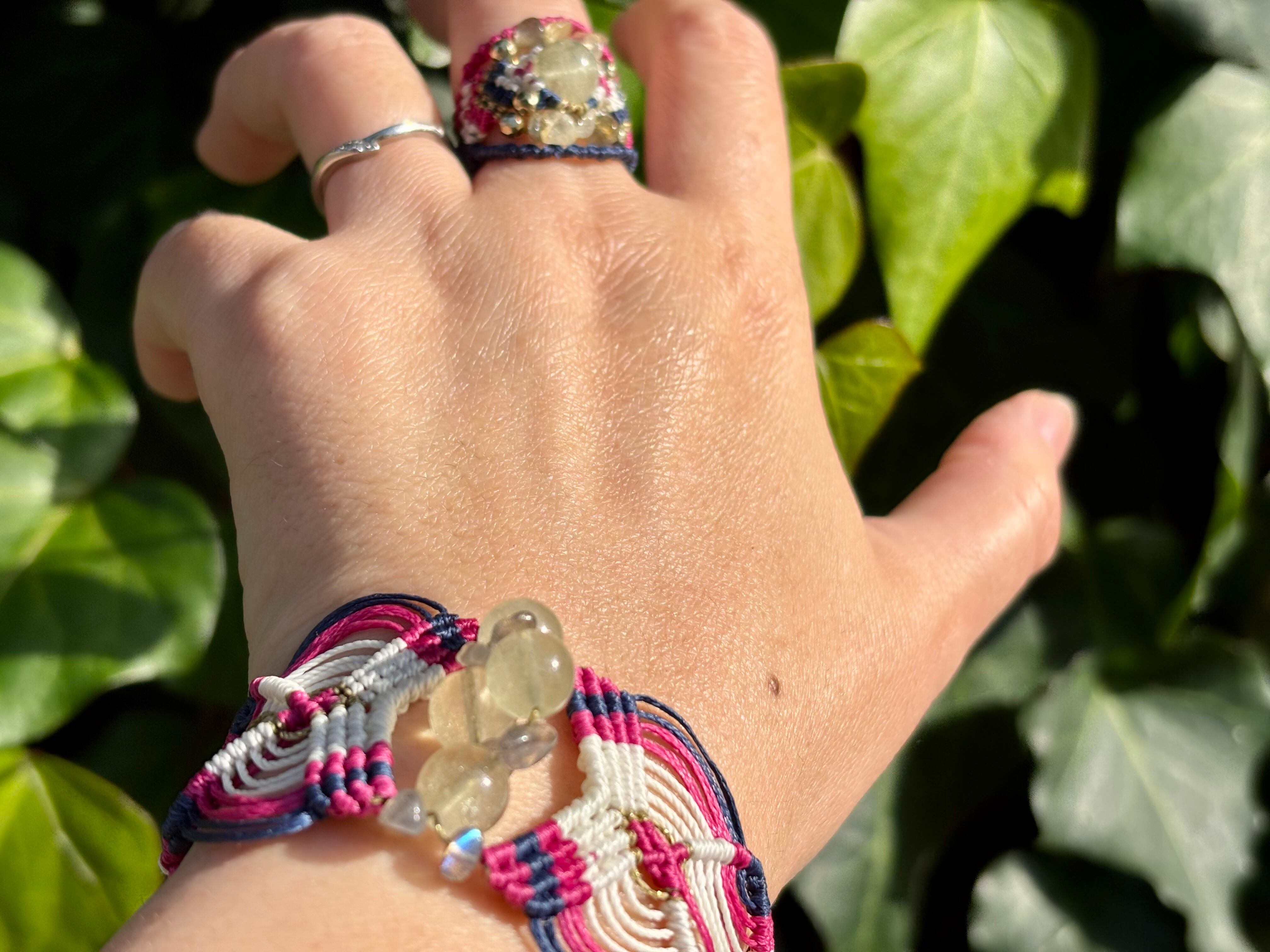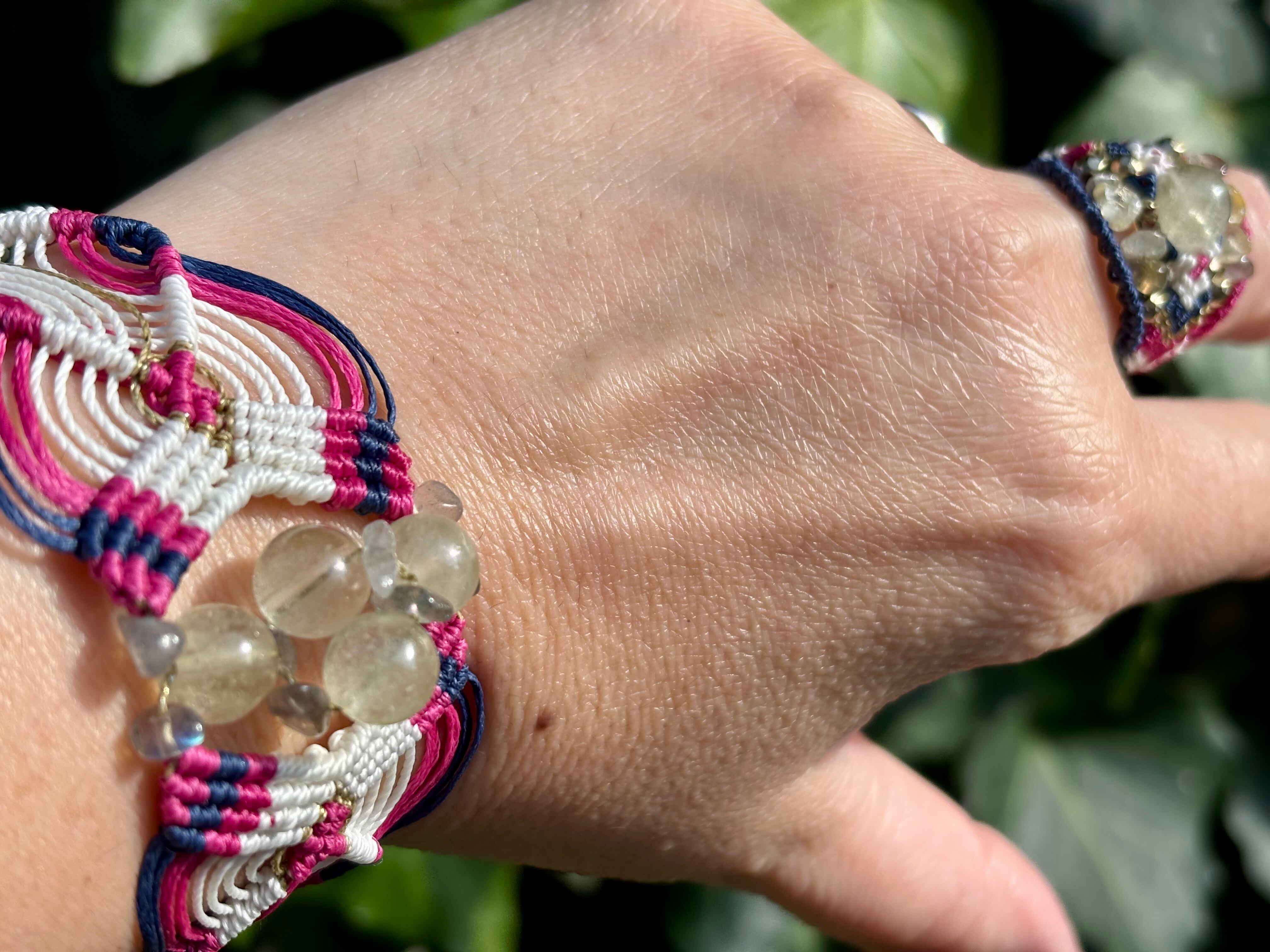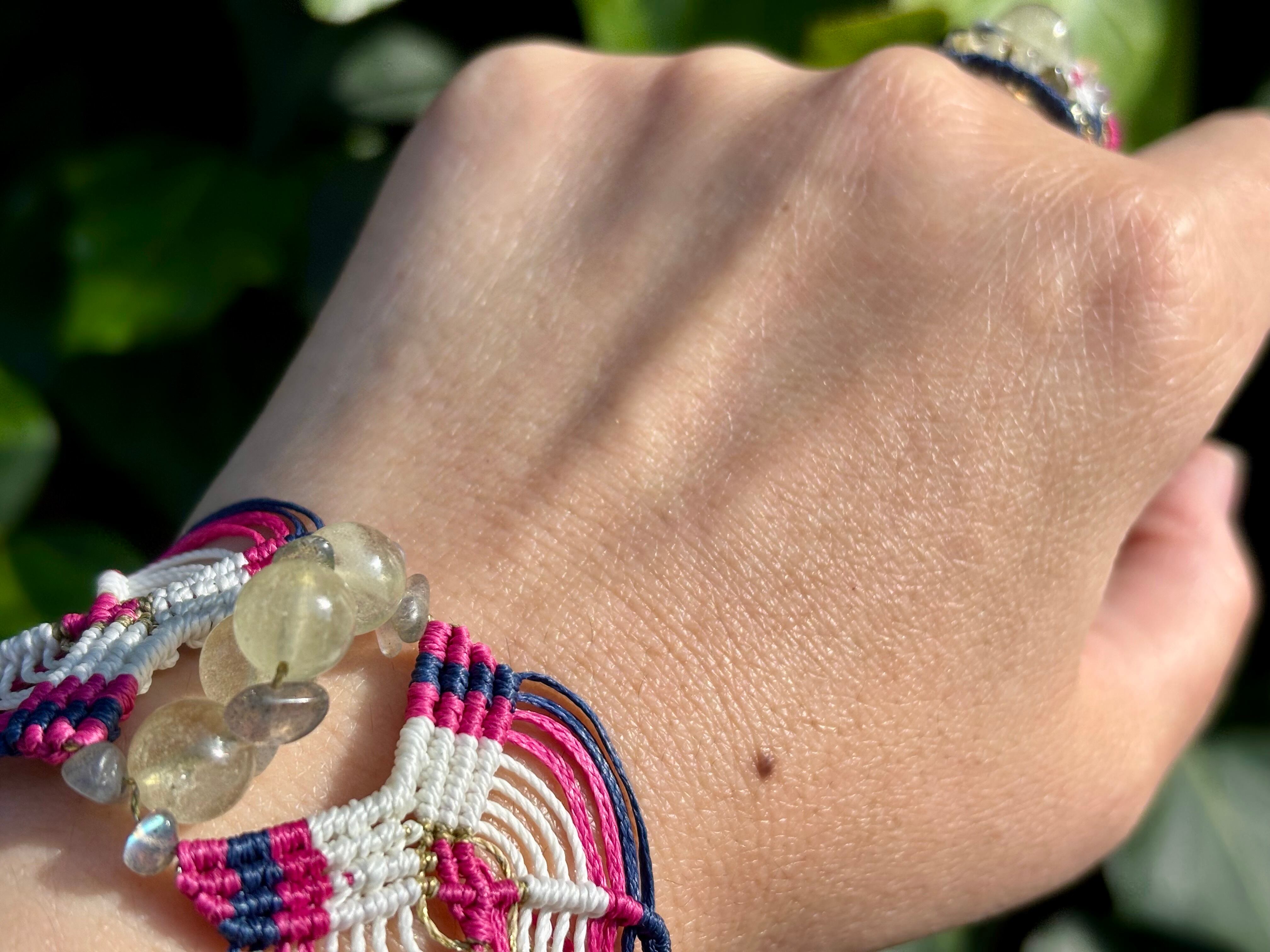 手作業で丁寧に編み込まれたこのブレスレットは、日常のコーディネートに華を添えるだけでなく、特別な場面でも存在感を発揮します。