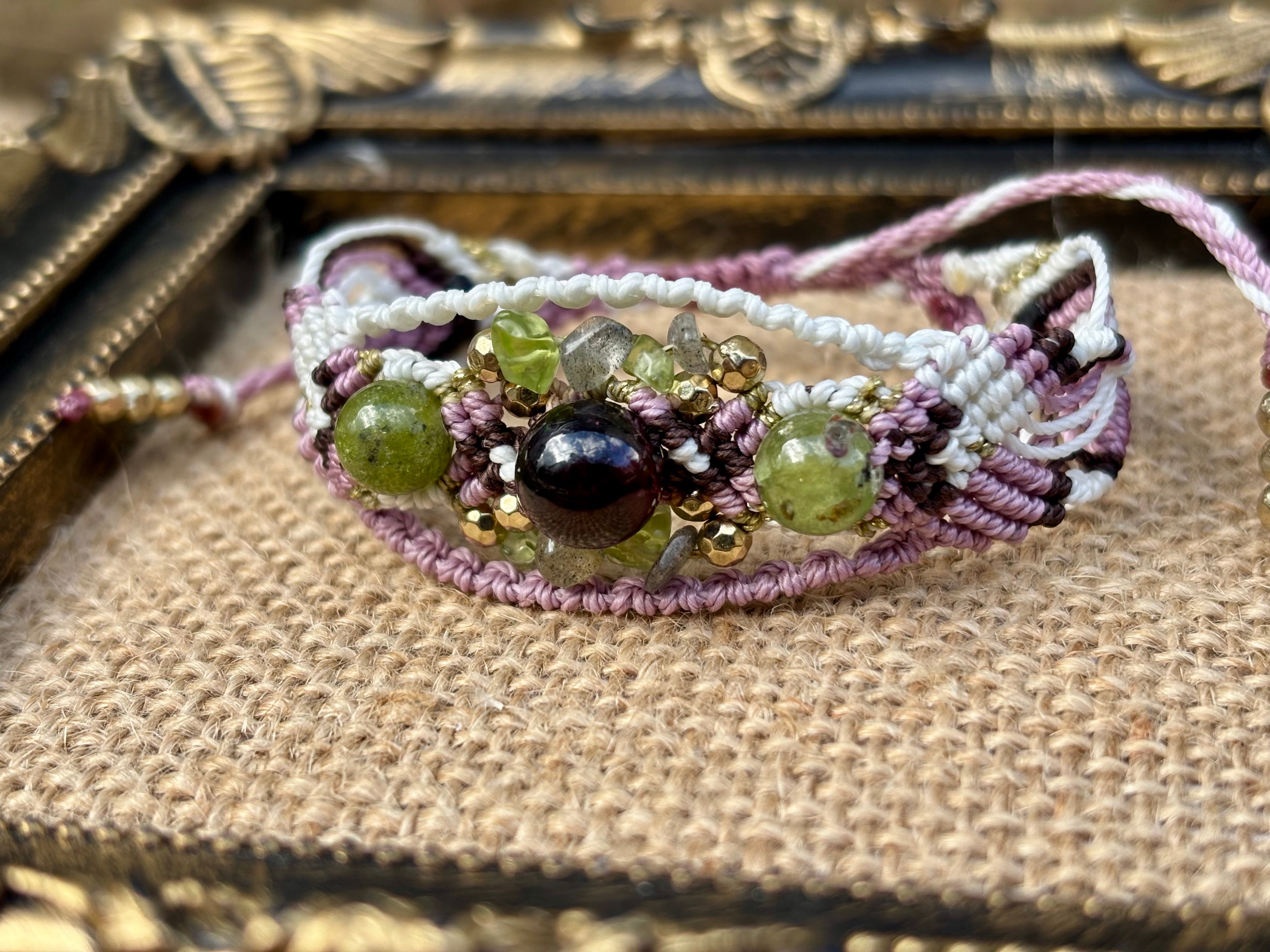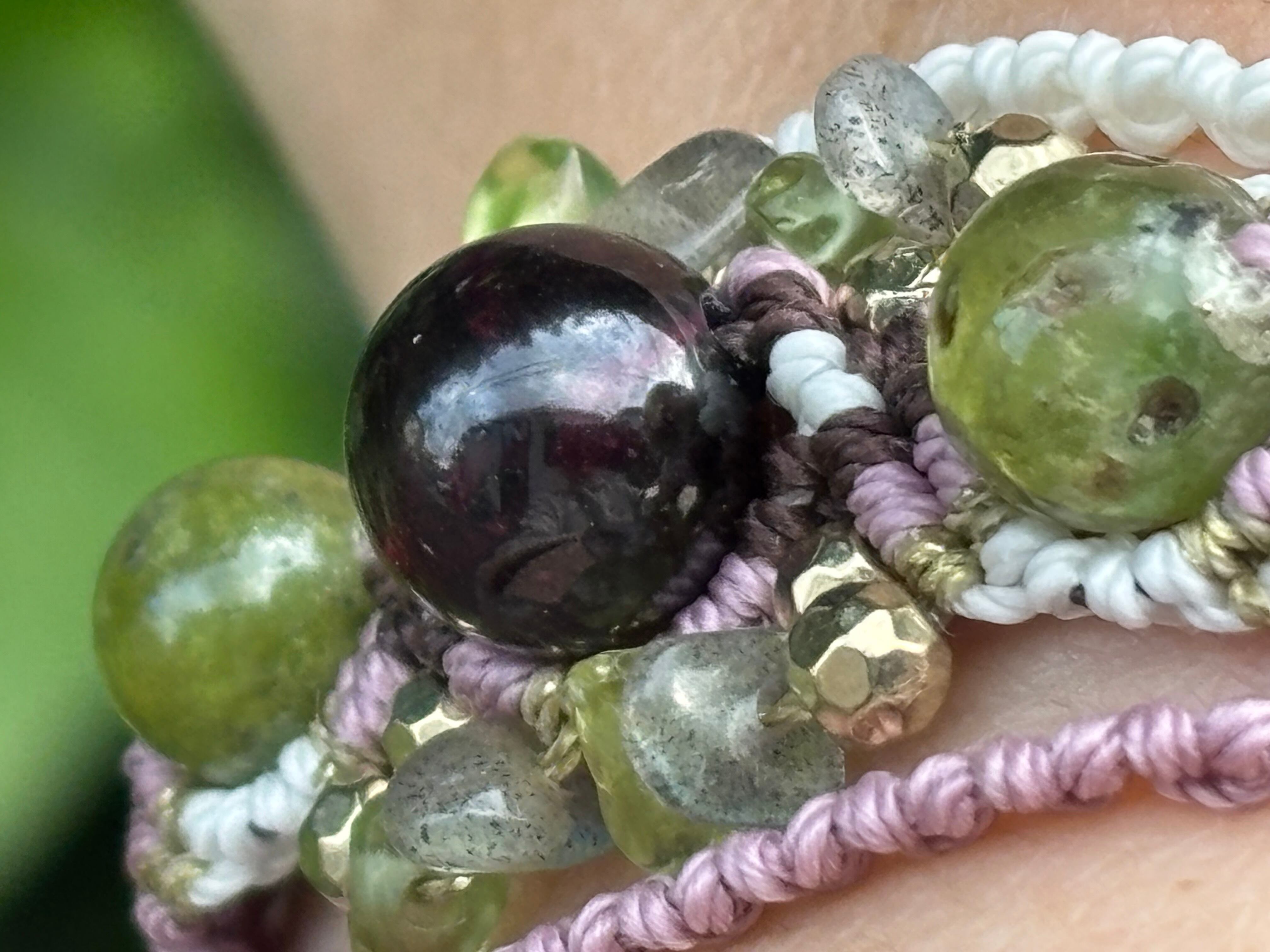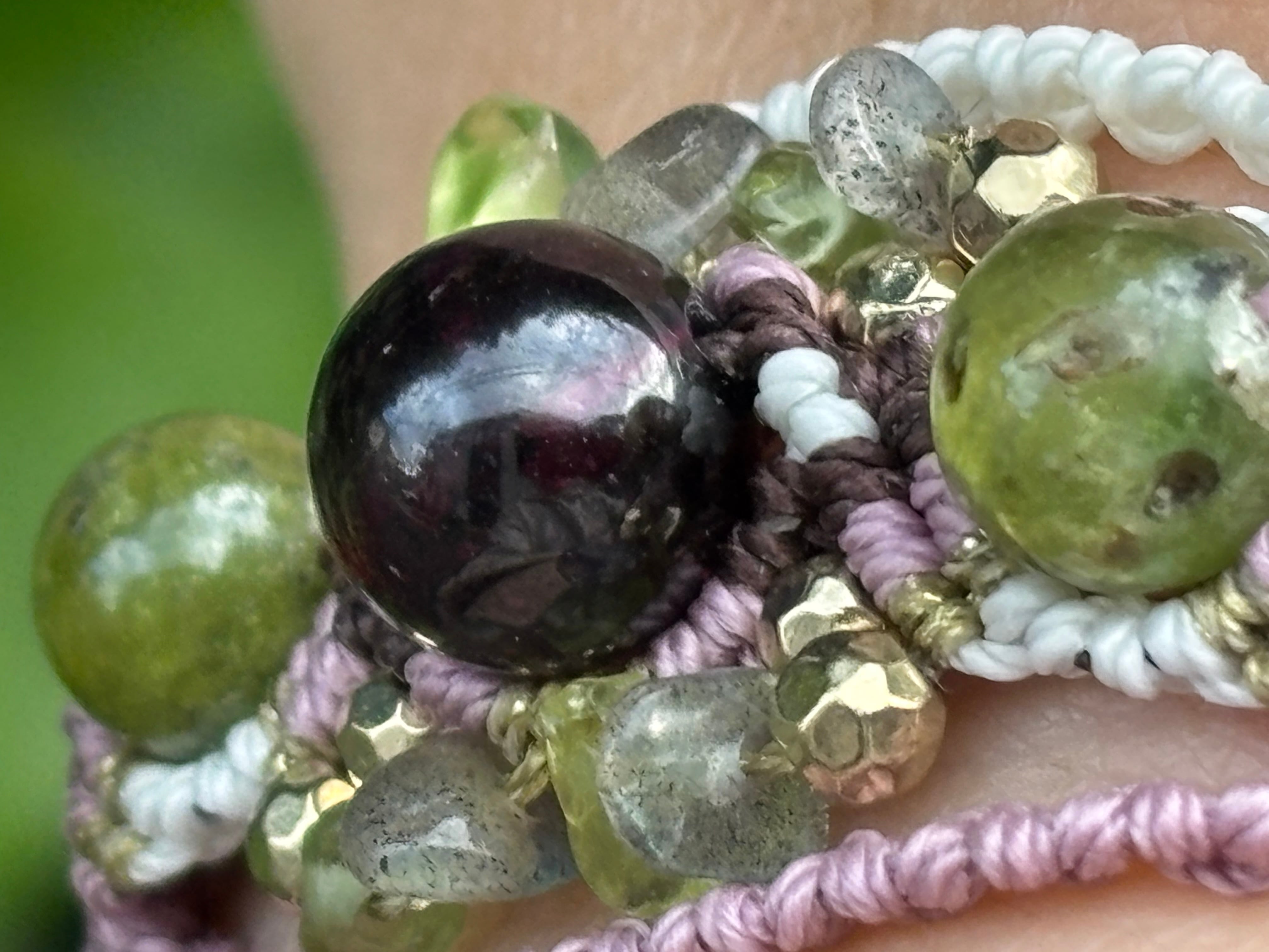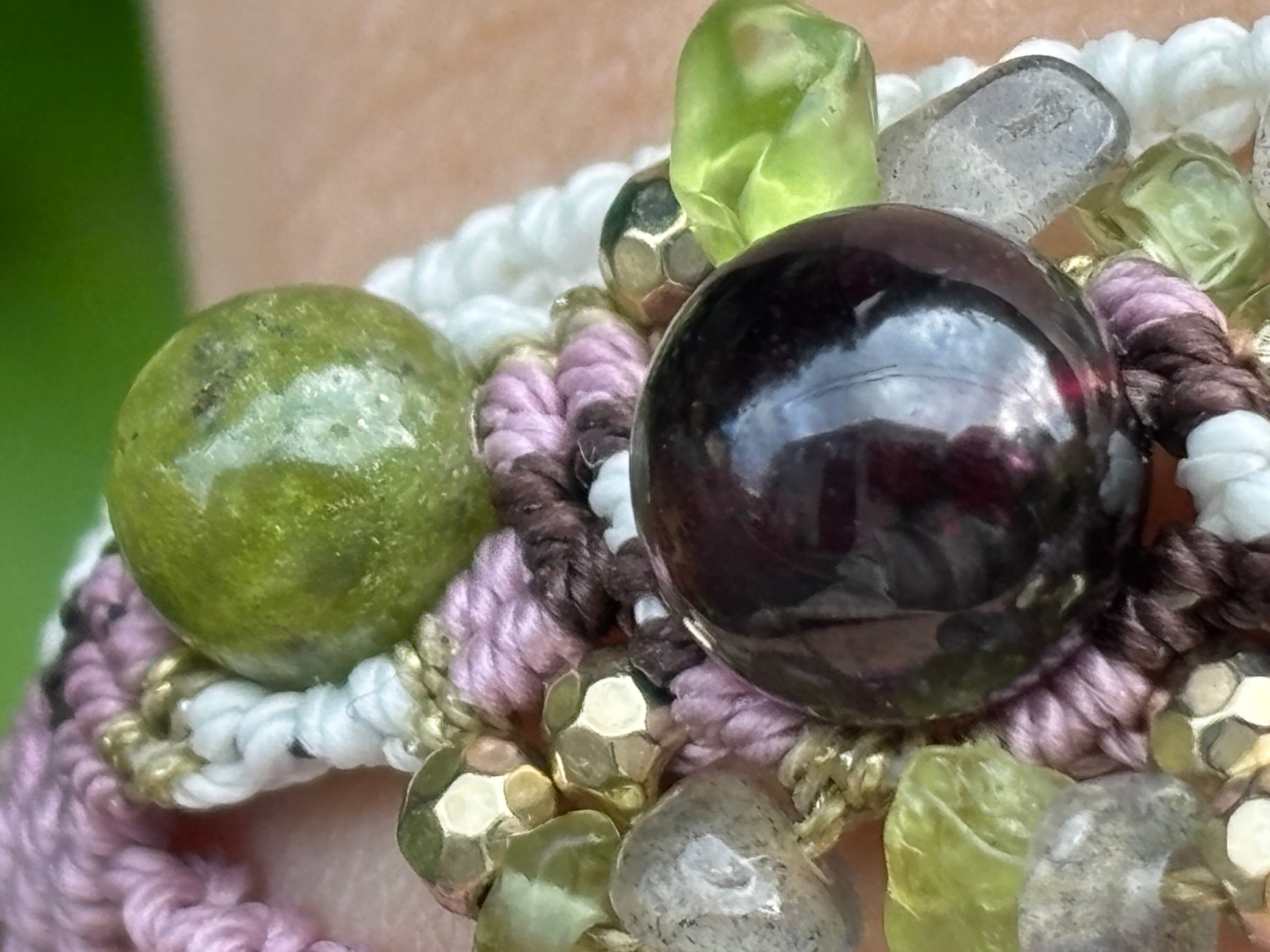 #946限定1点ロードライトガーネット×ツァボライト×ラブラドライト×ローズクォーツ マクラメ編みブレスレット