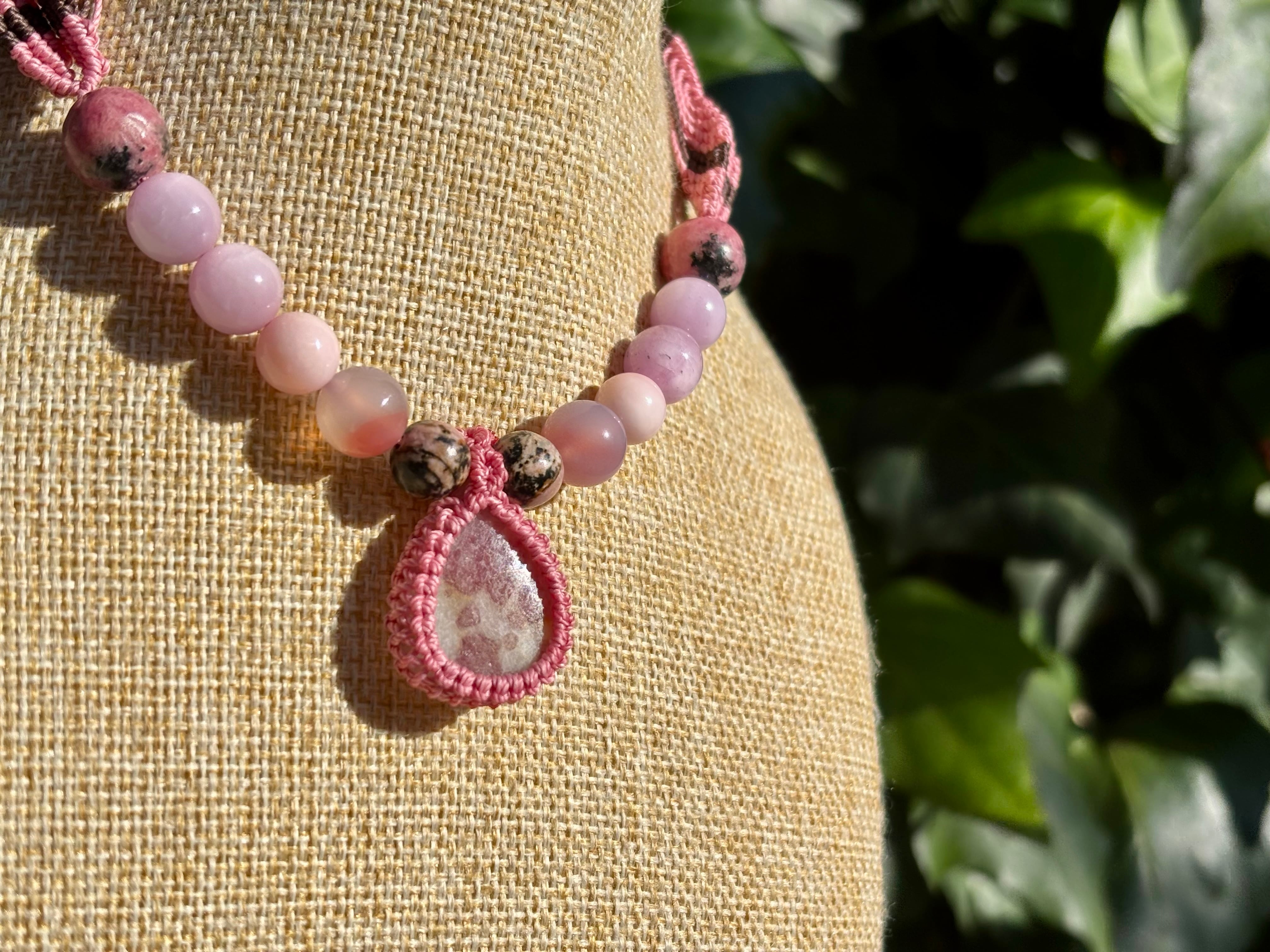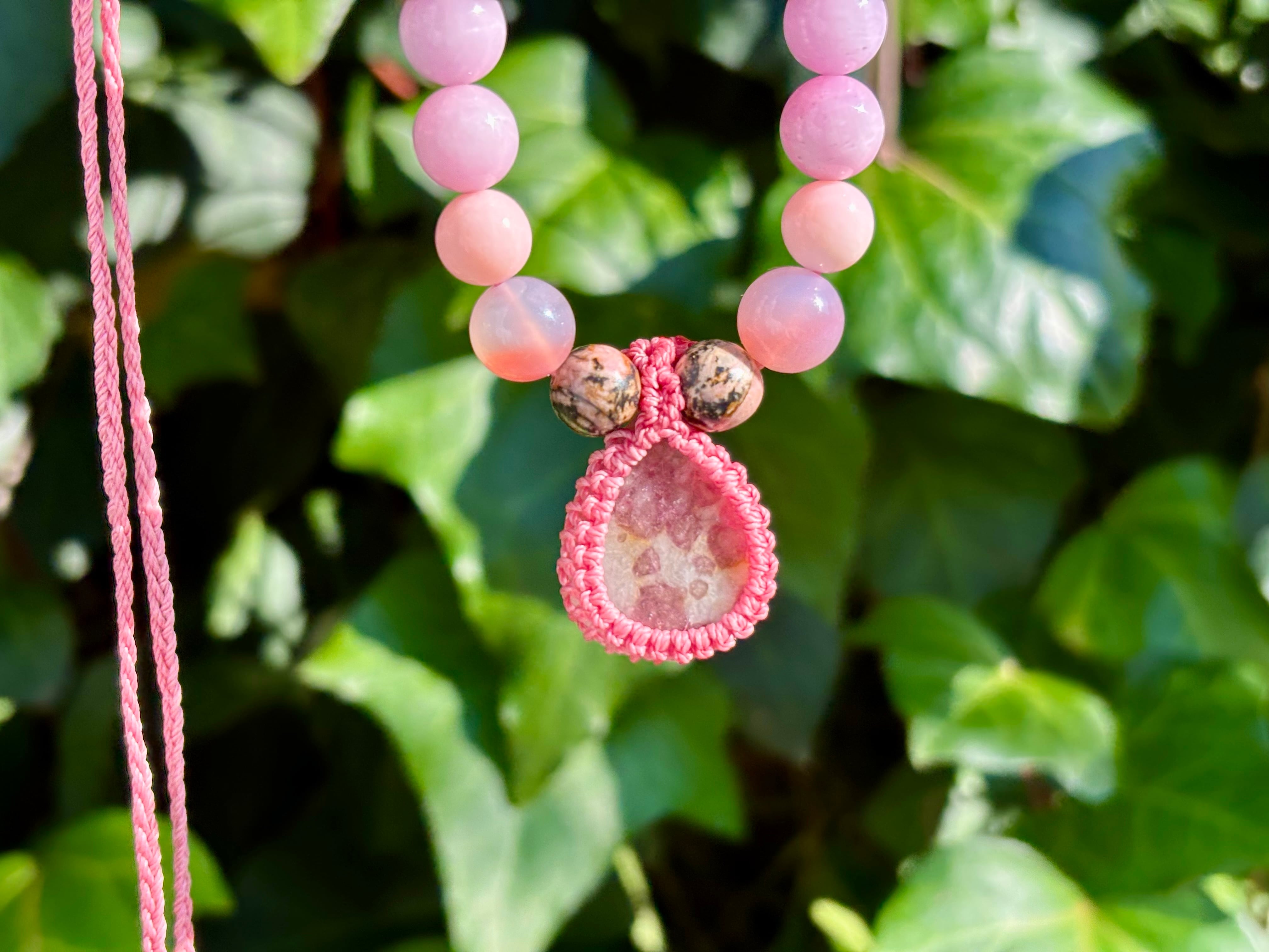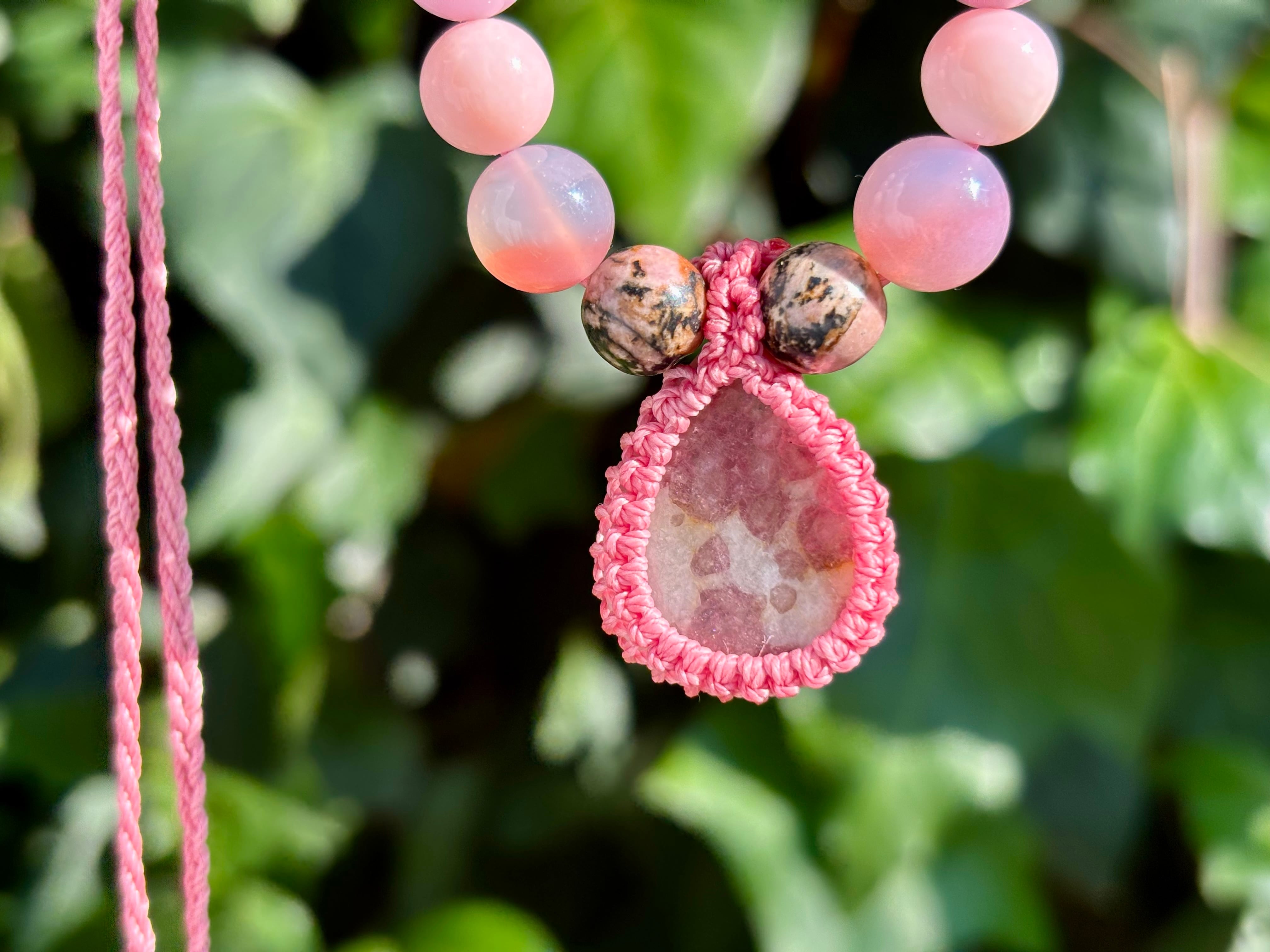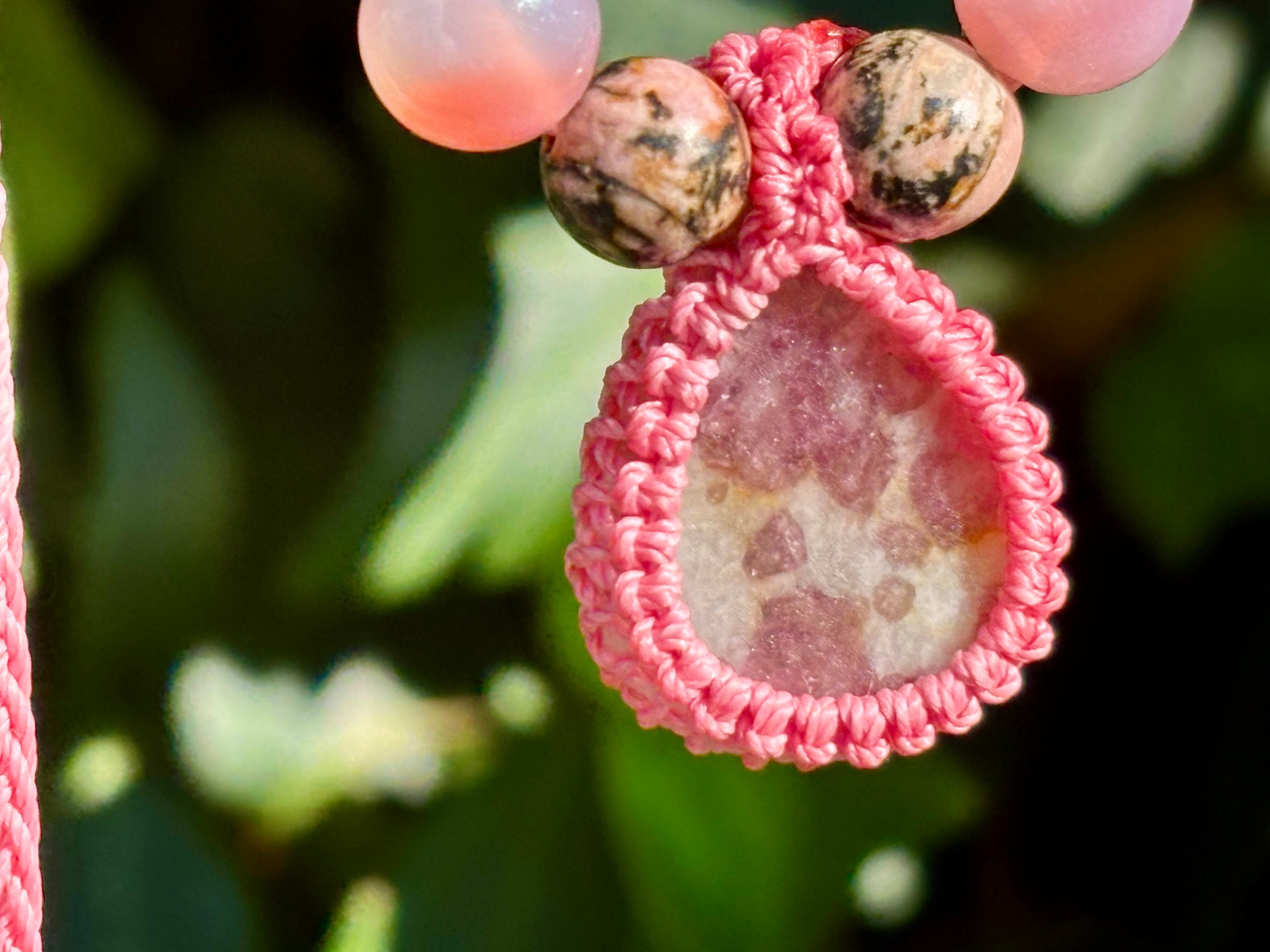 #948高品質ピンクトルマリン限定1点(ピンクトルマリン×ロードナイト×ソルトソースアゲート×ピンクオパール×クンツァイトマクラメ編みデザインネックレス)