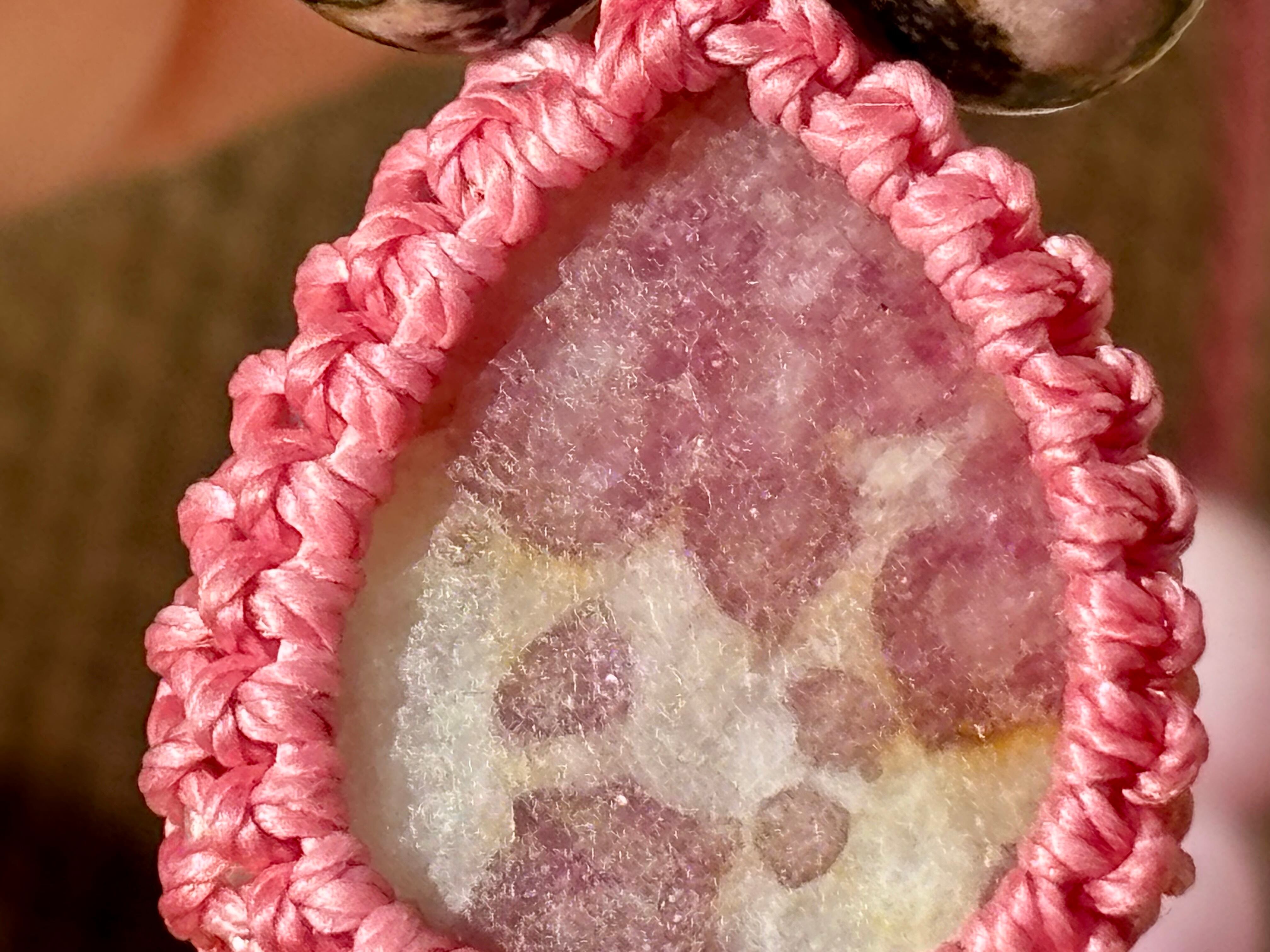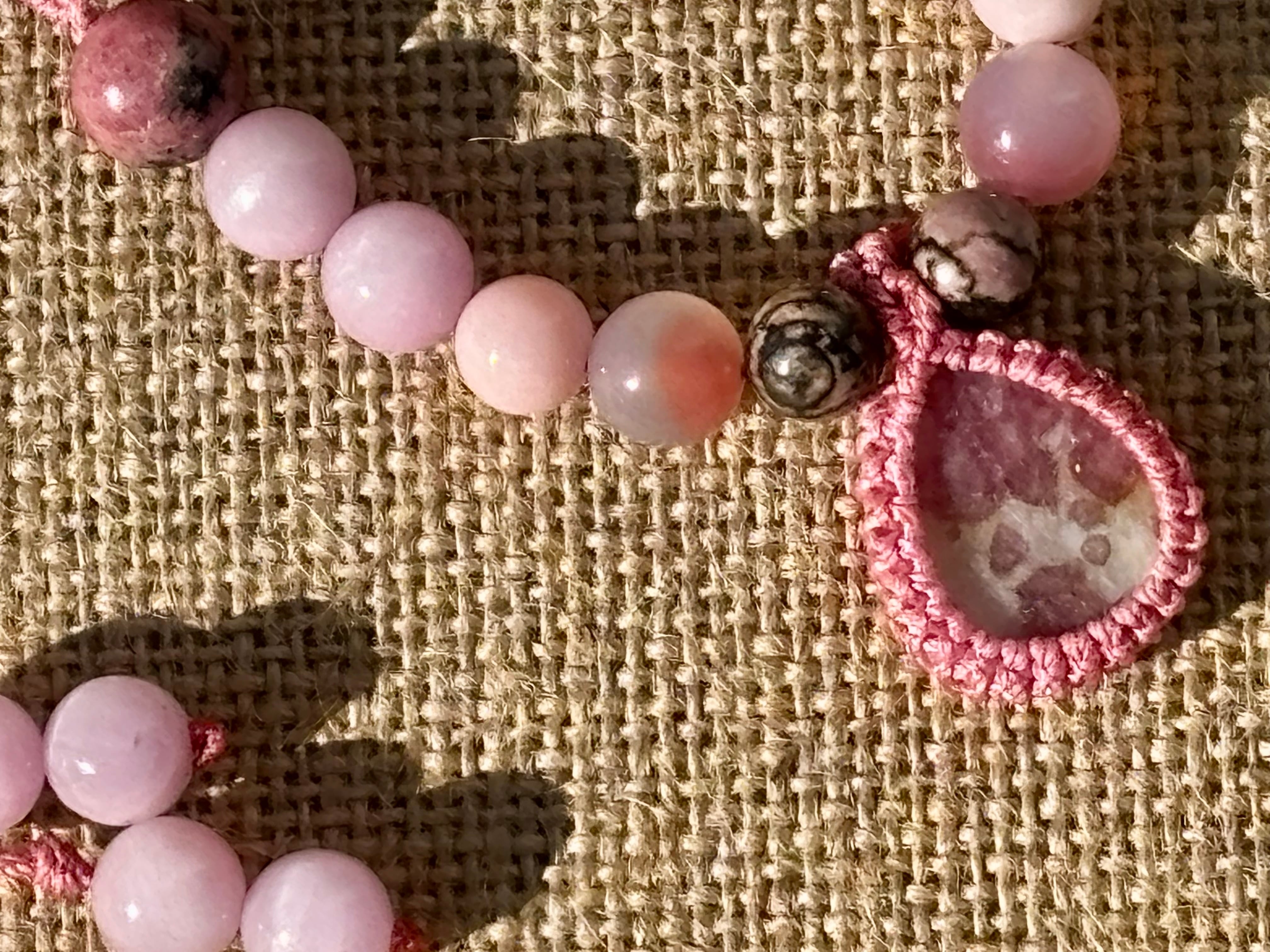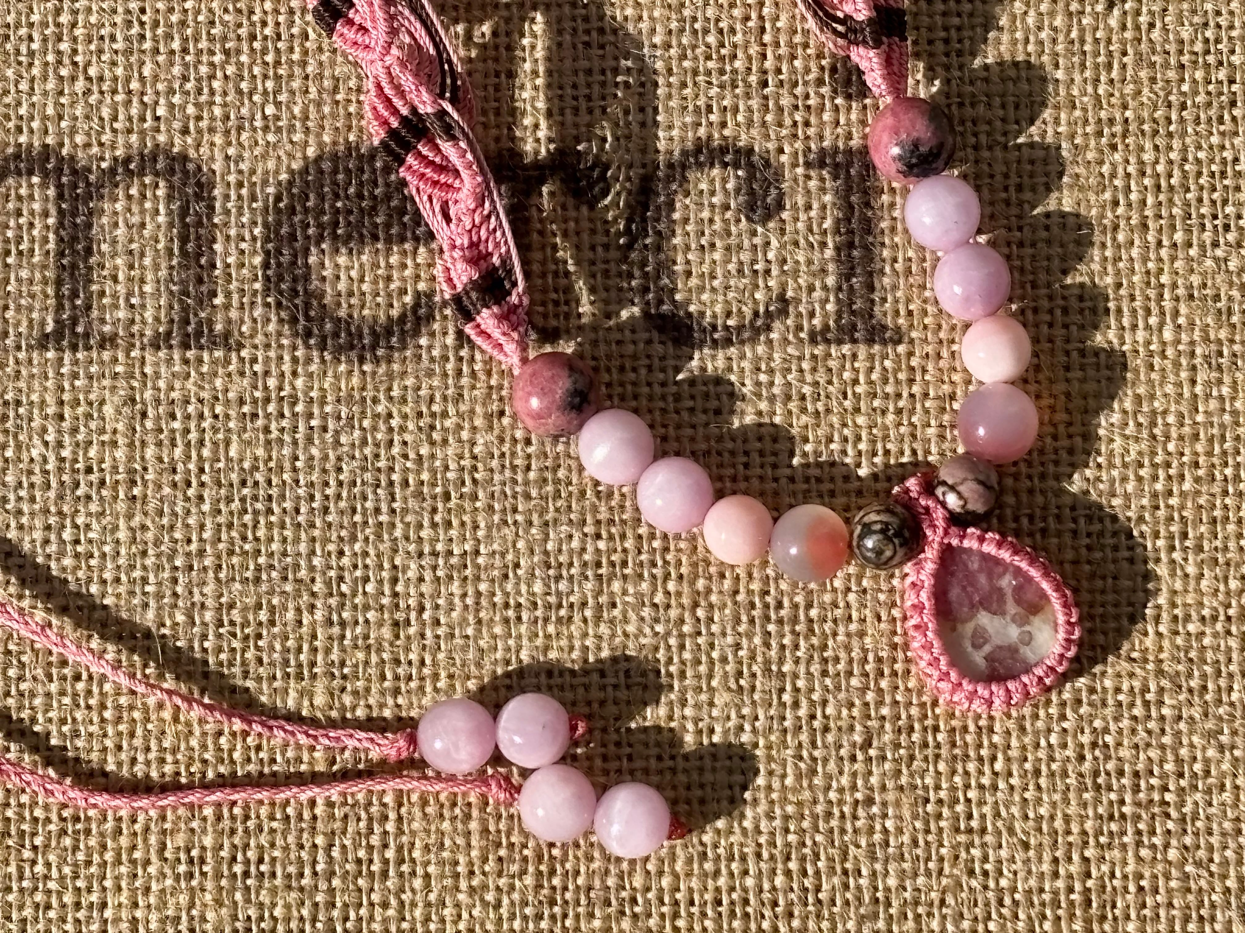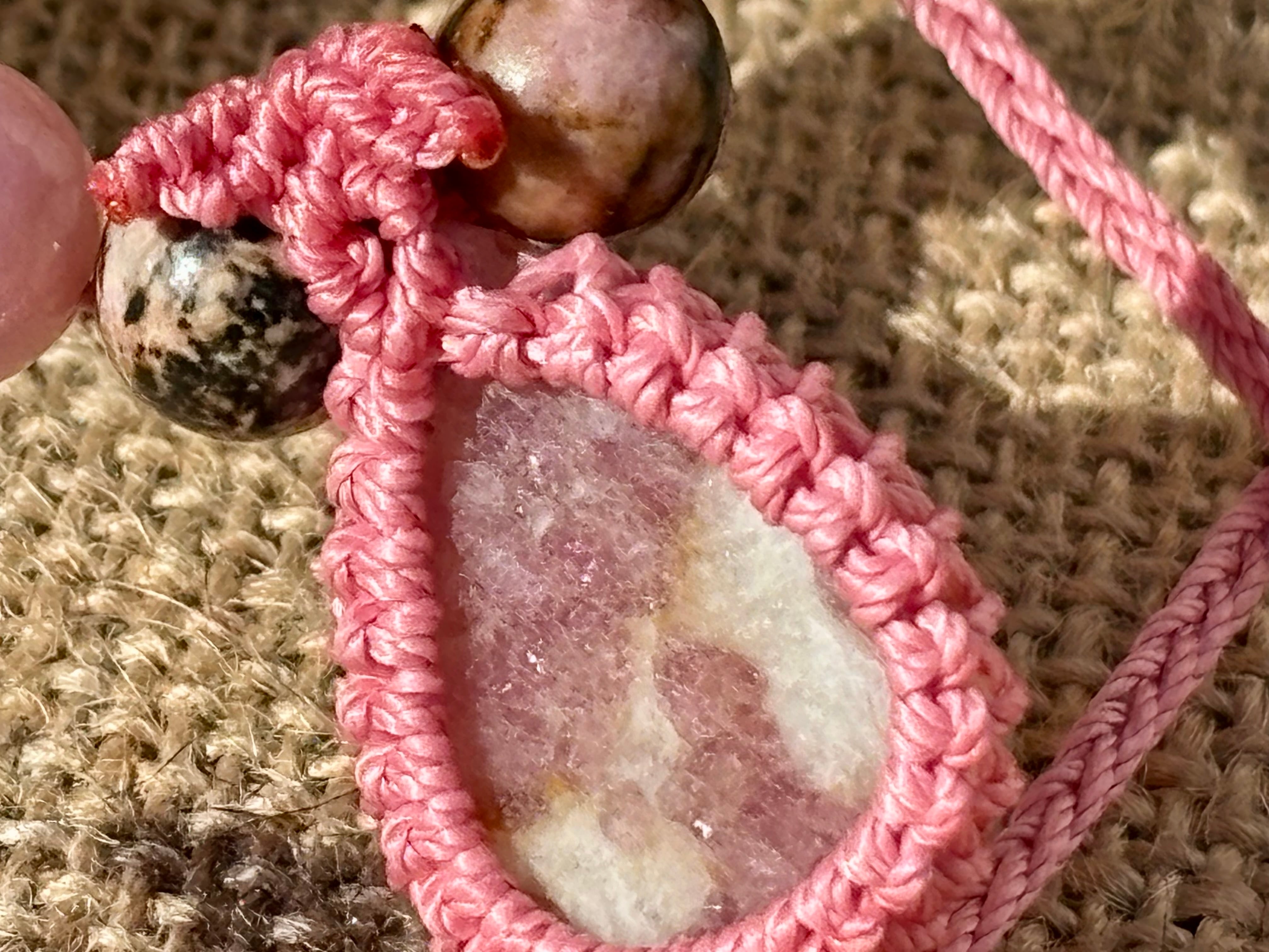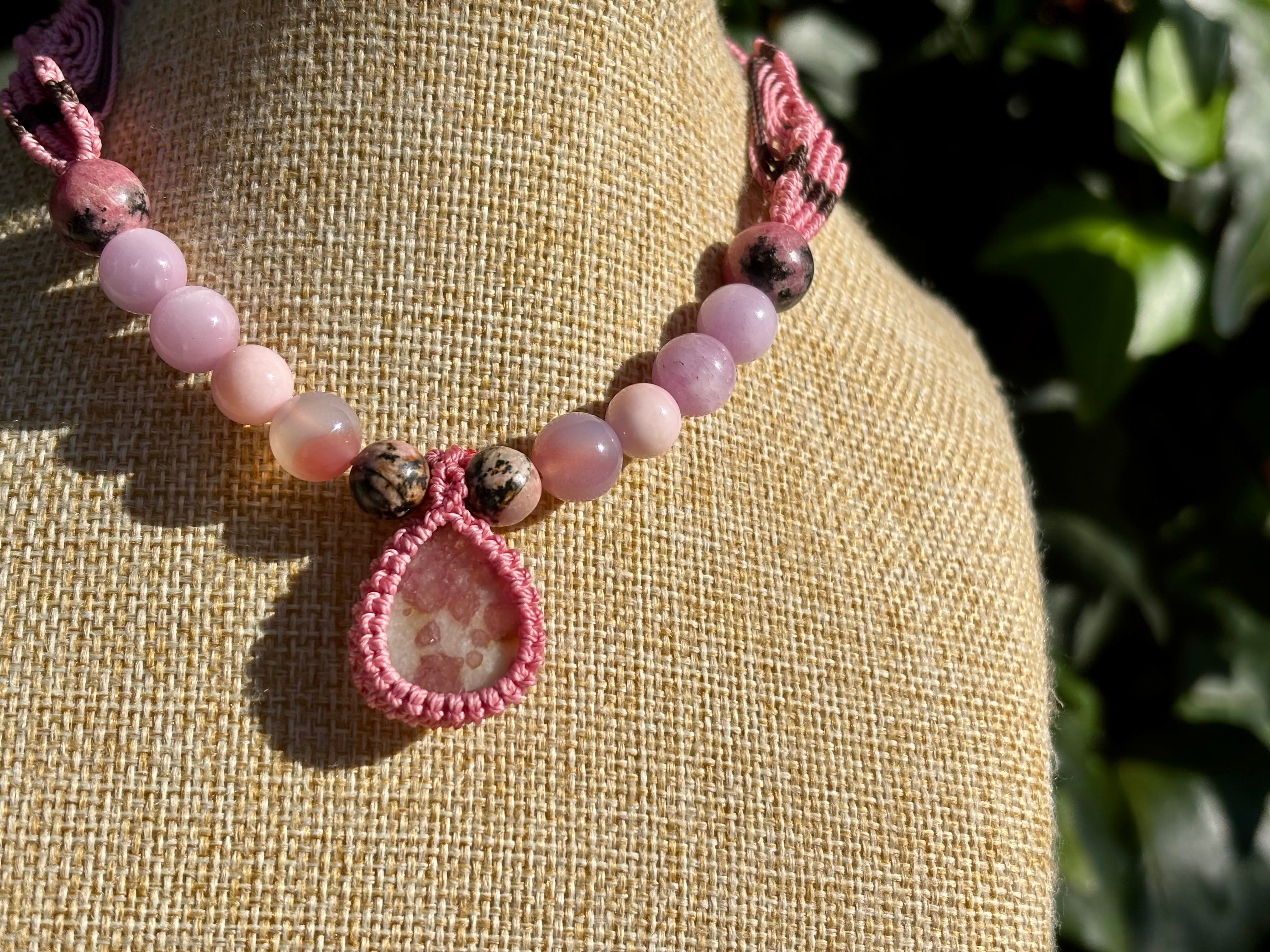 #948高品質ピンクトルマリン限定1点(ピンクトルマリン×ロードナイト×ソルトソースアゲート×ピンクオパール×クンツァイトマクラメ編みデザインネックレス)