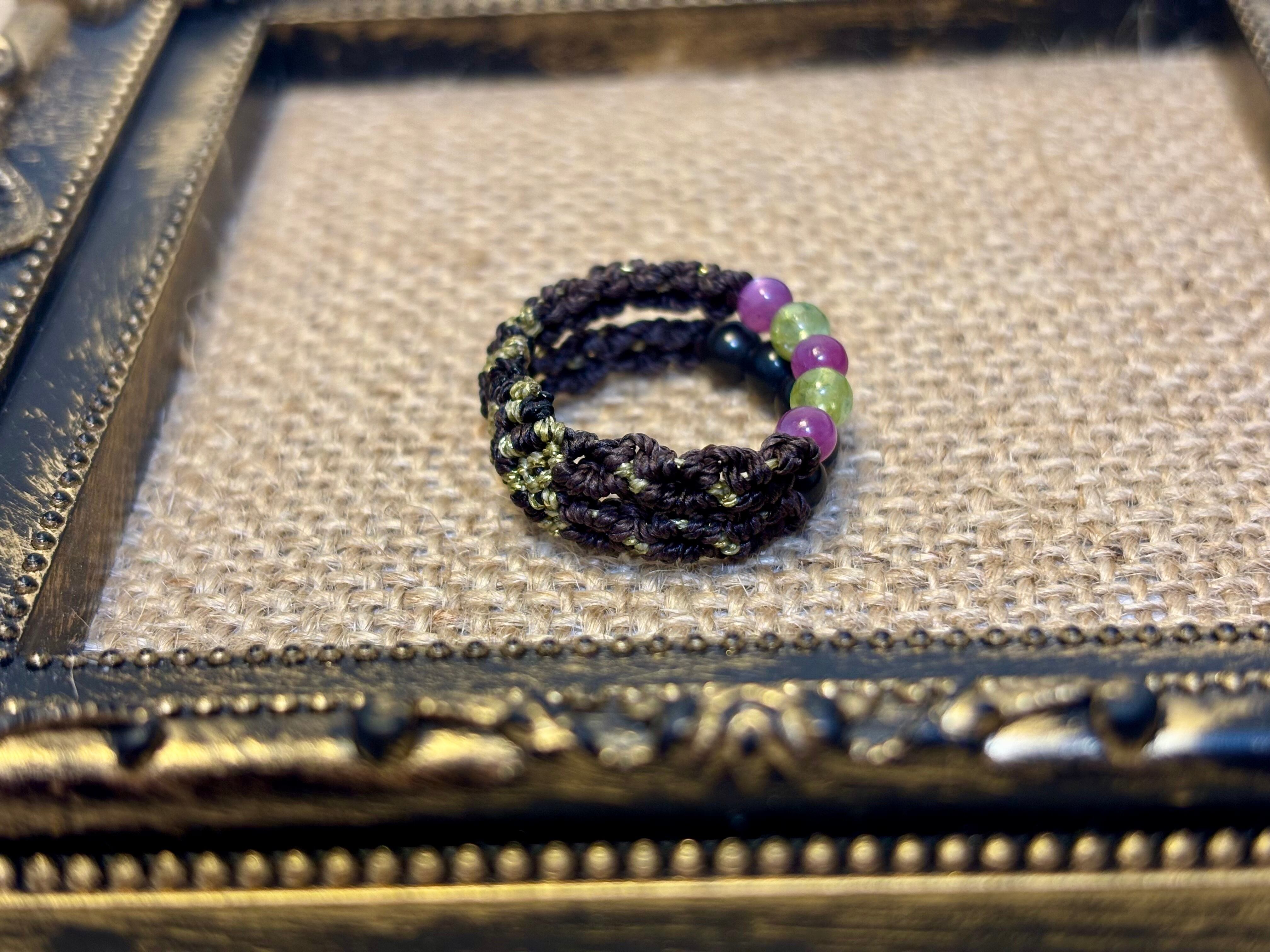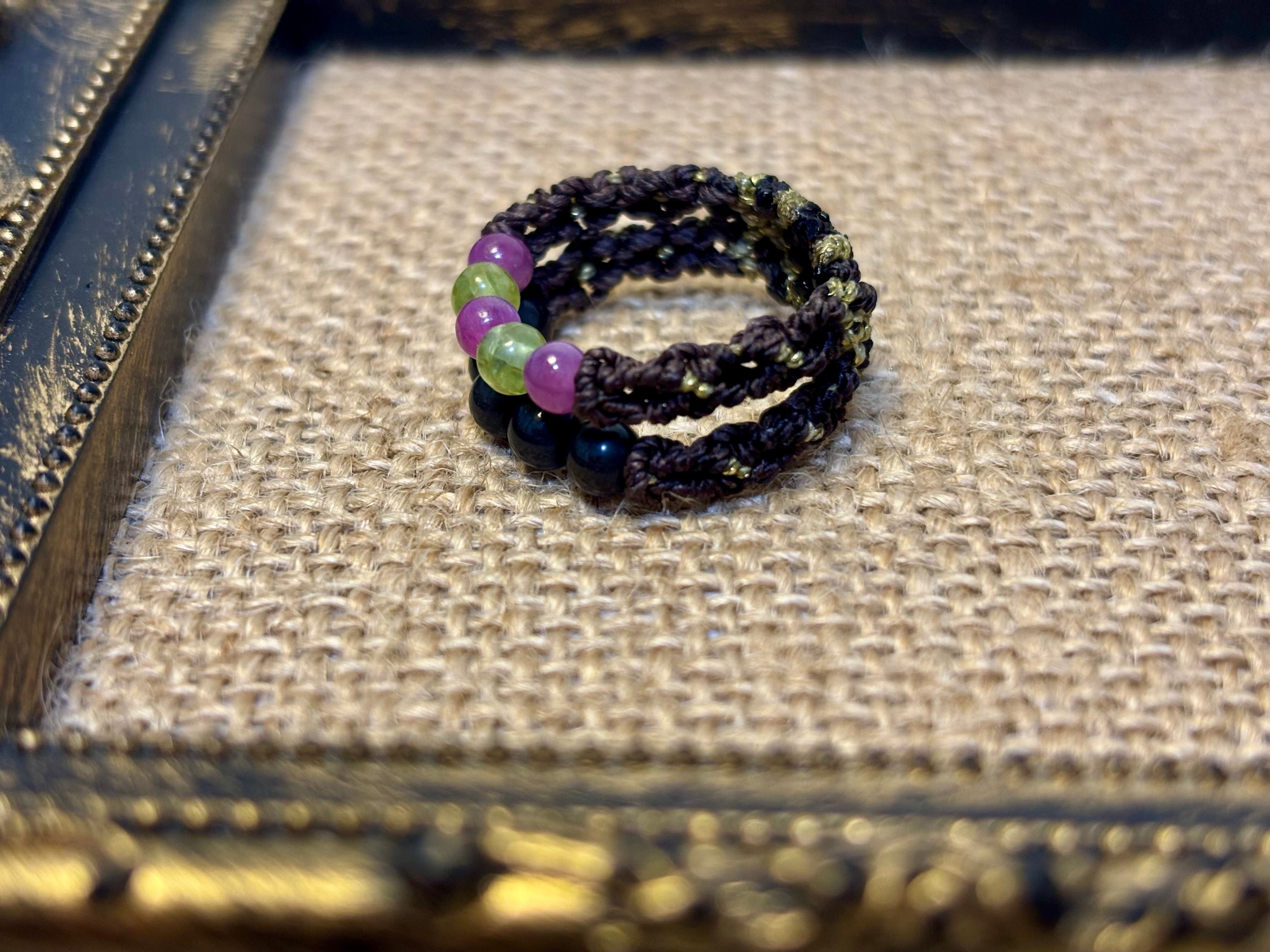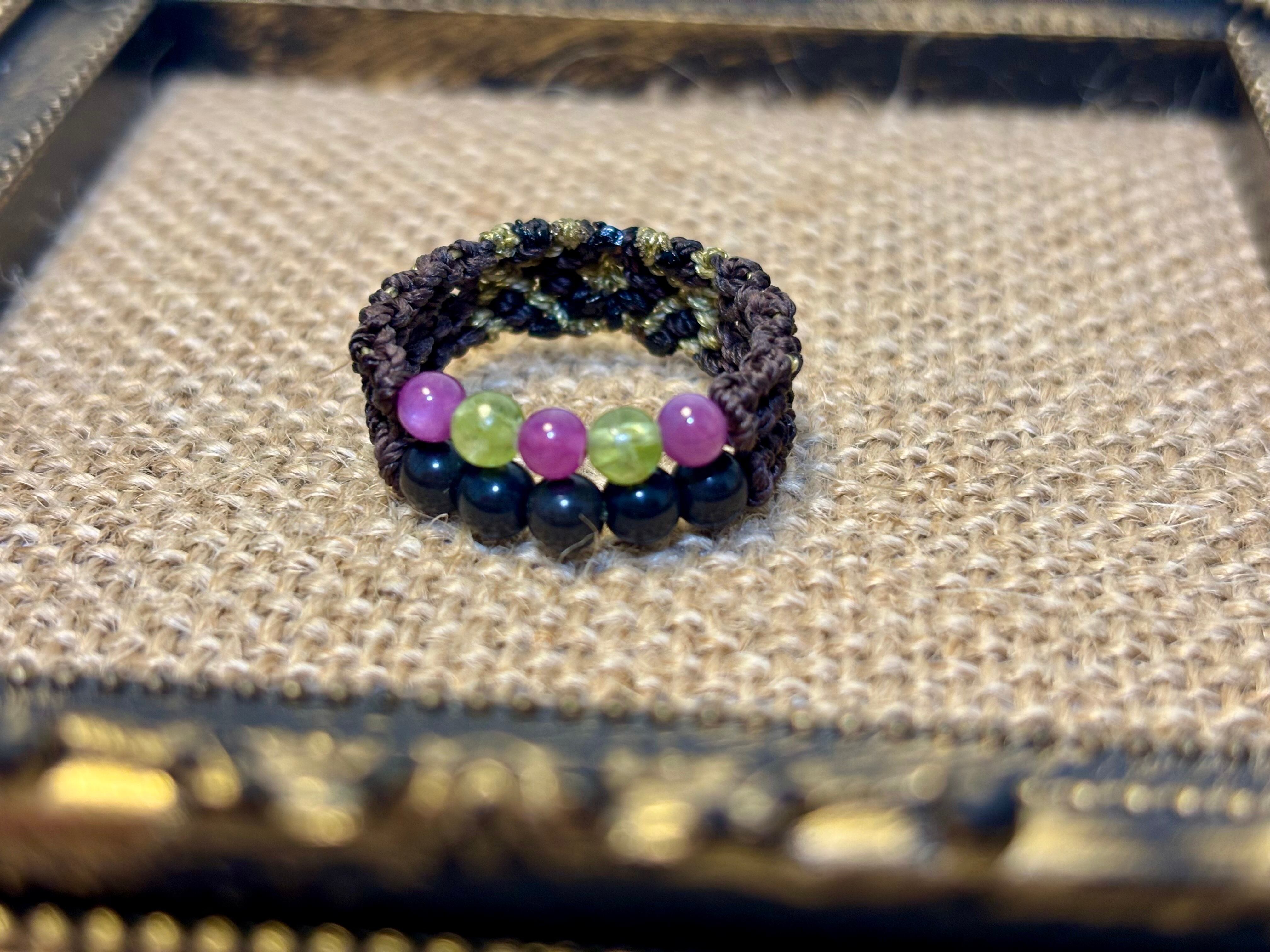 #960天然チェリーピンクルビー一点物(チェリーピンクルビー×北投石 マクラメ編み二連リング/指輪)