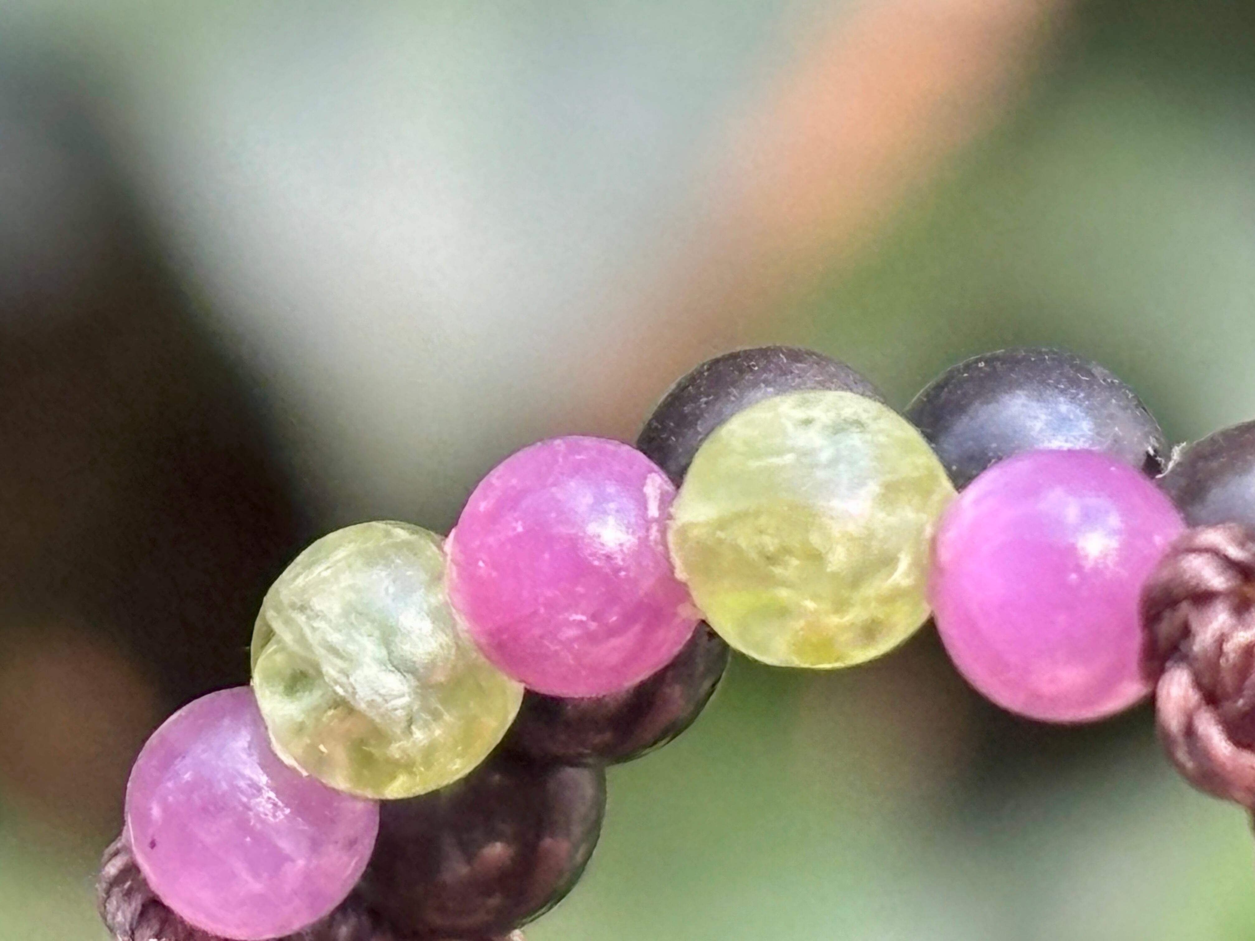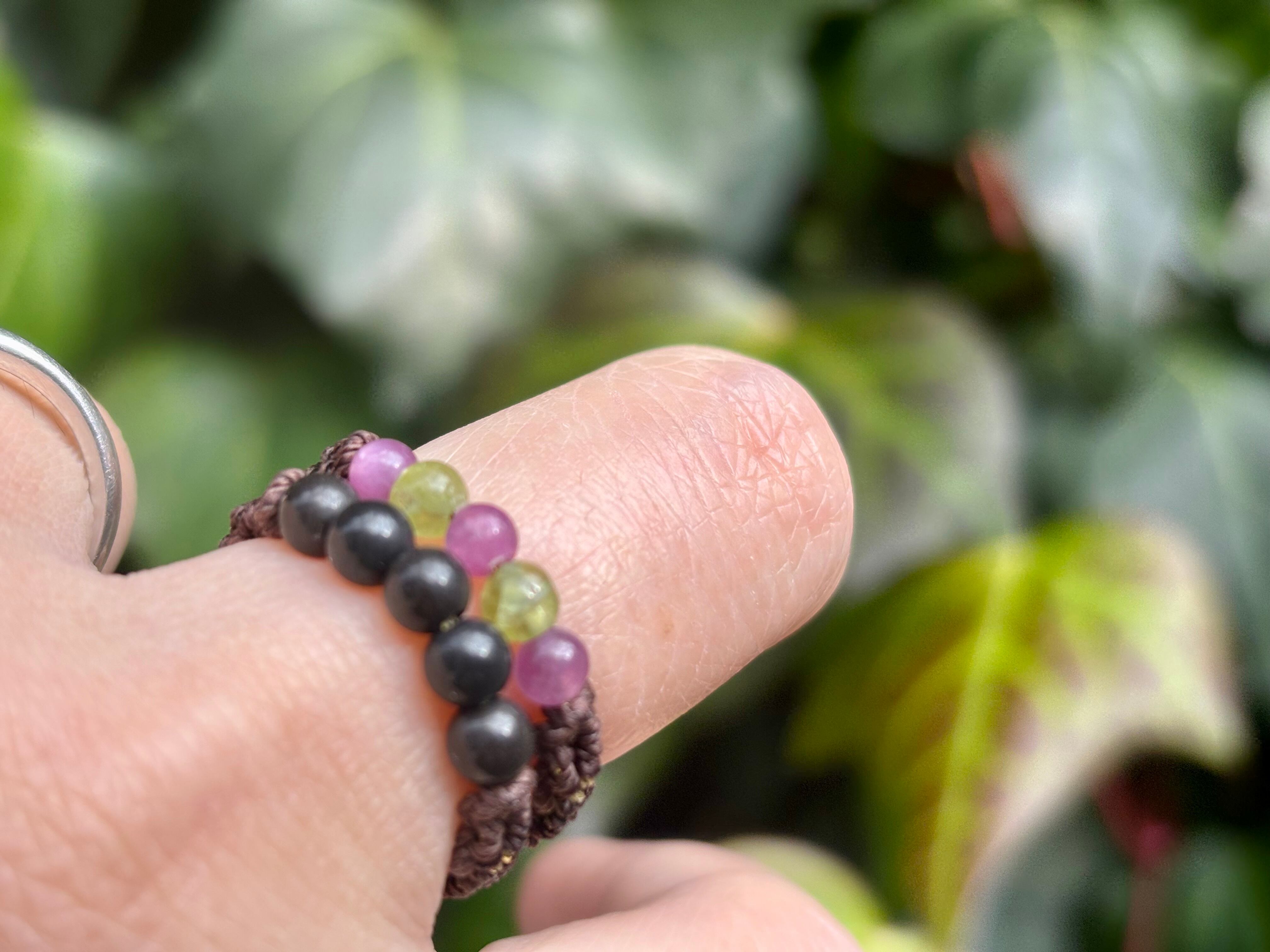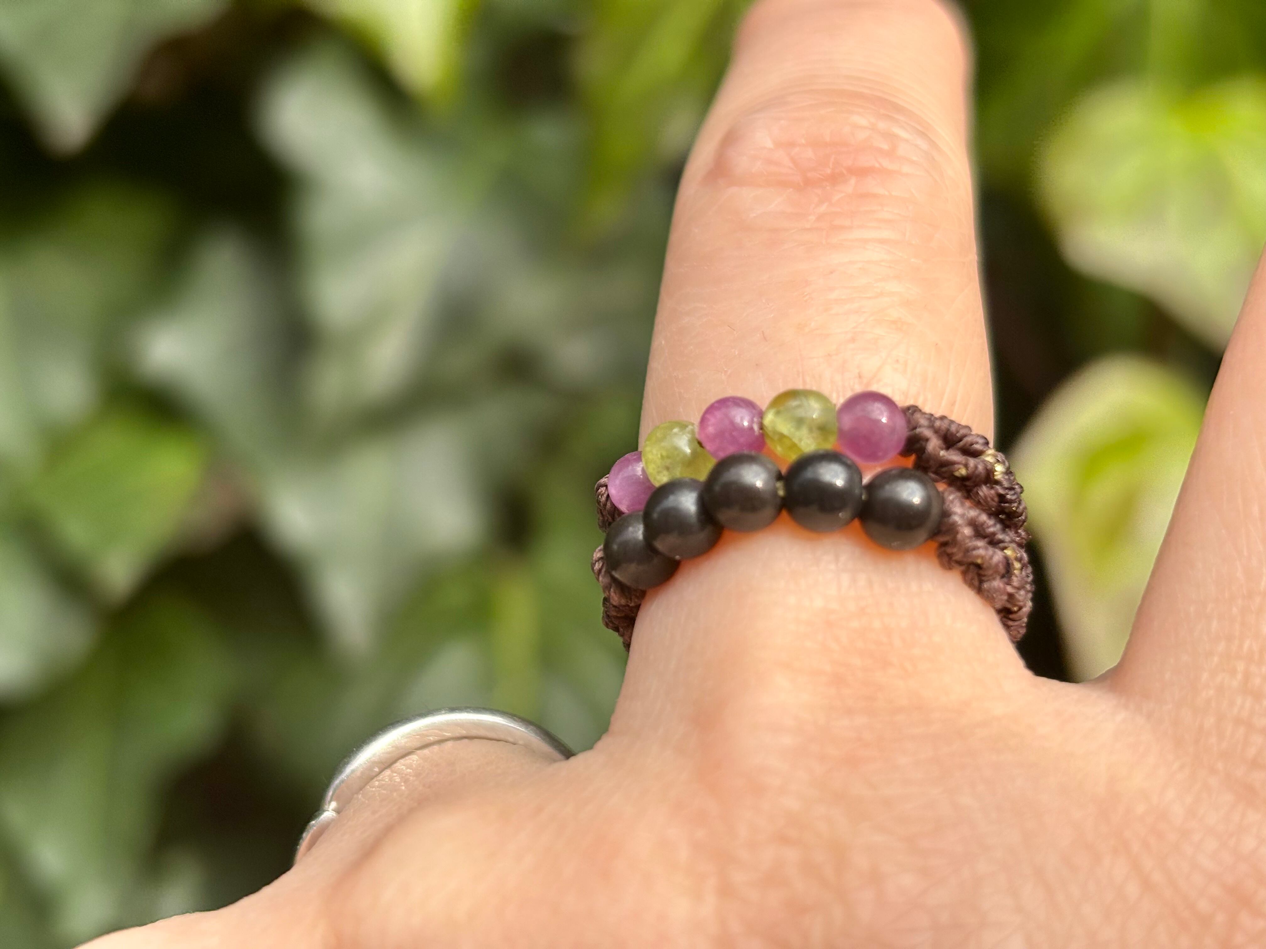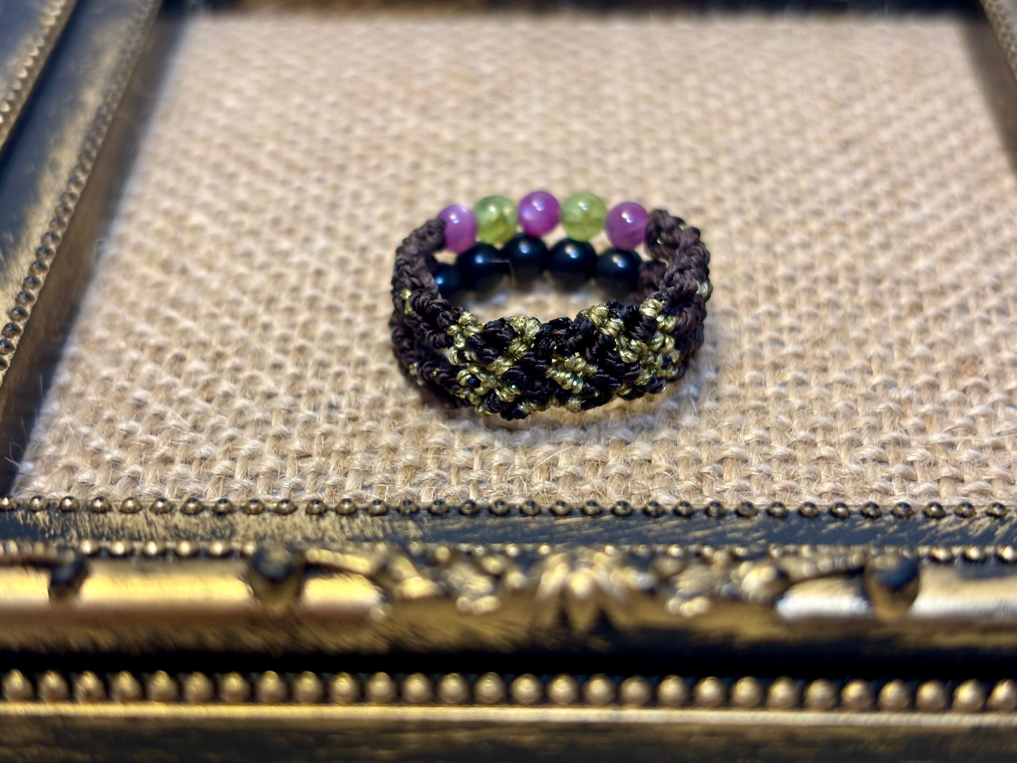 #960天然チェリーピンクルビー一点物(チェリーピンクルビー×北投石 マクラメ編み二連リング/指輪)