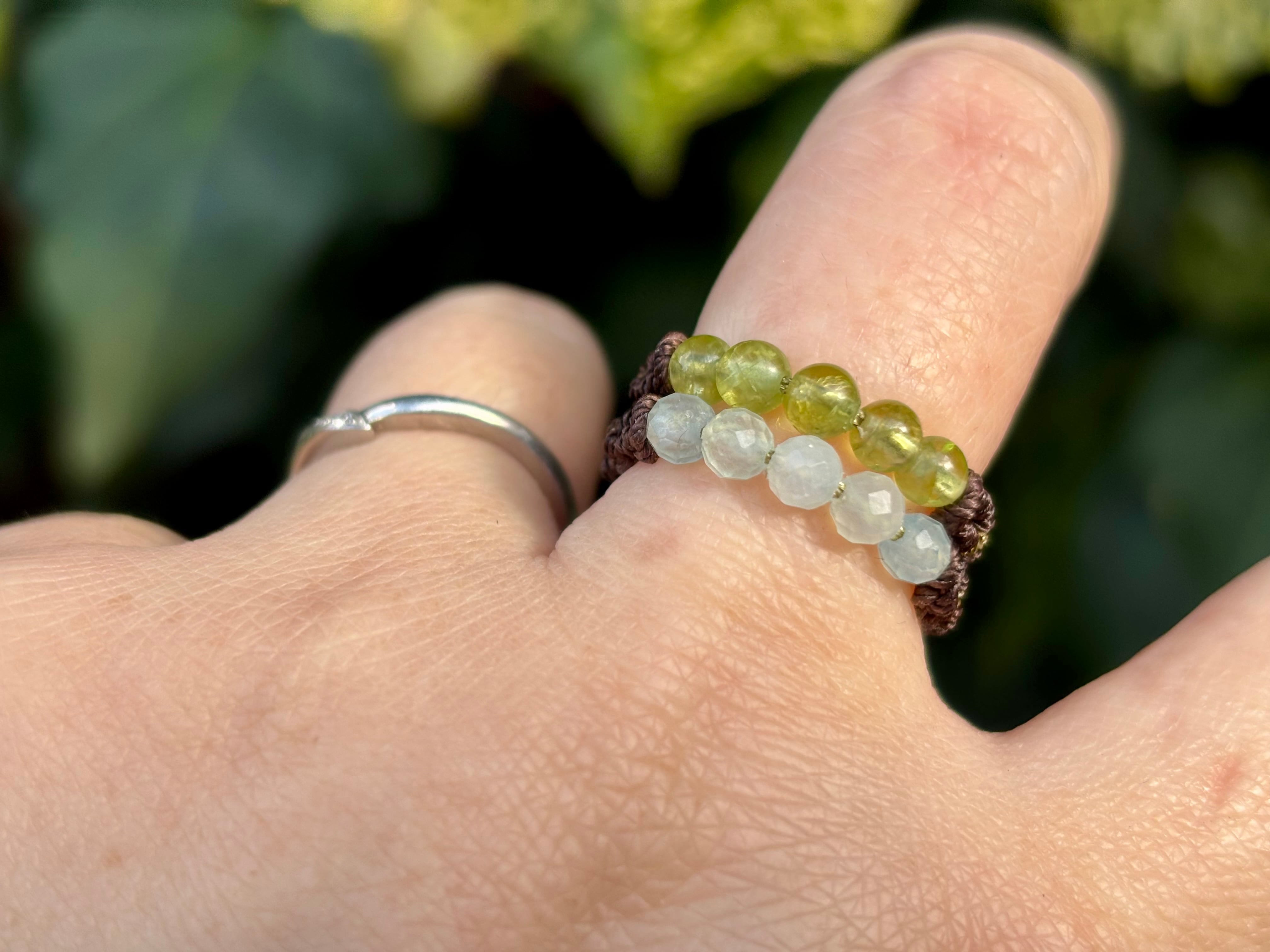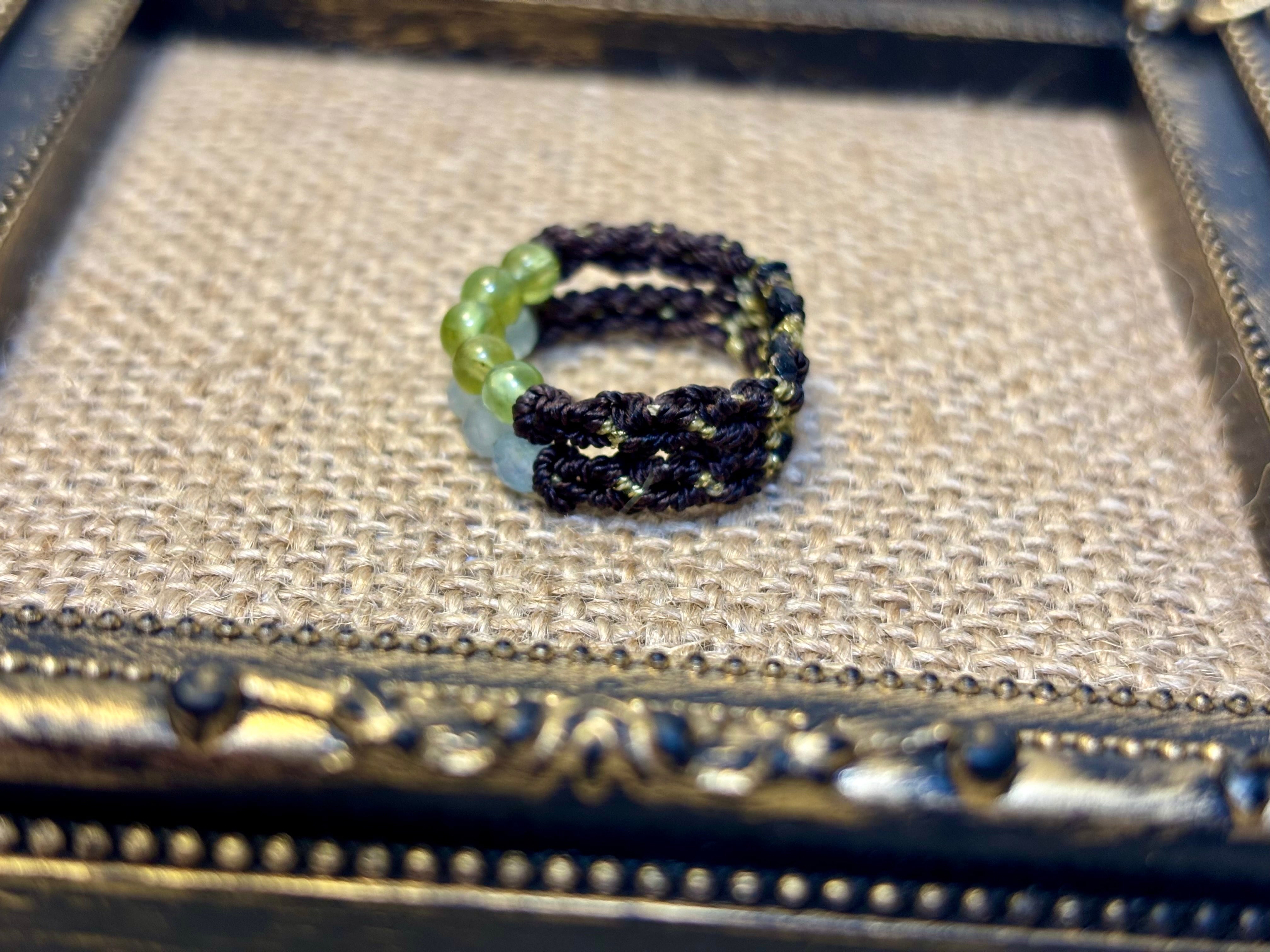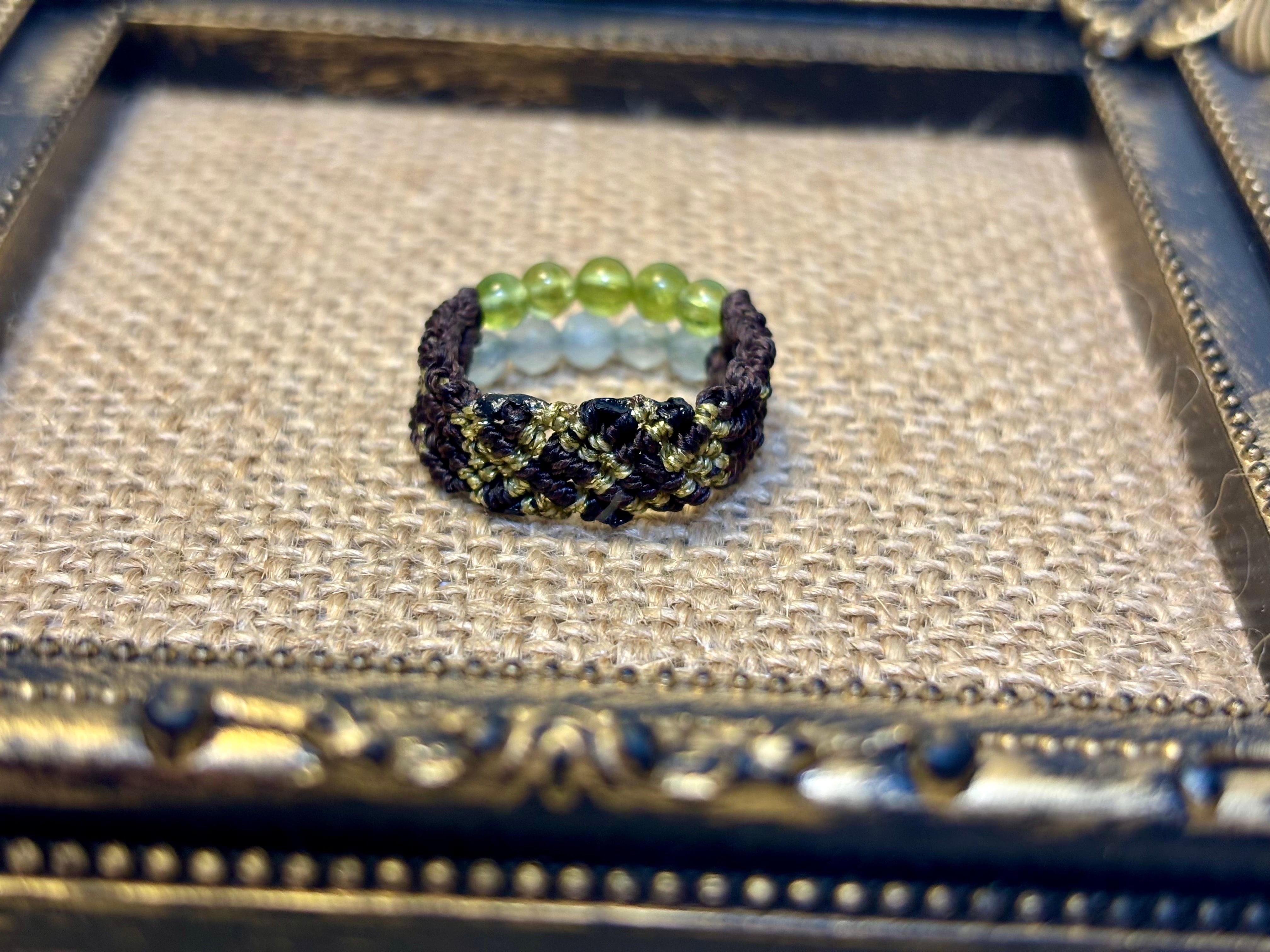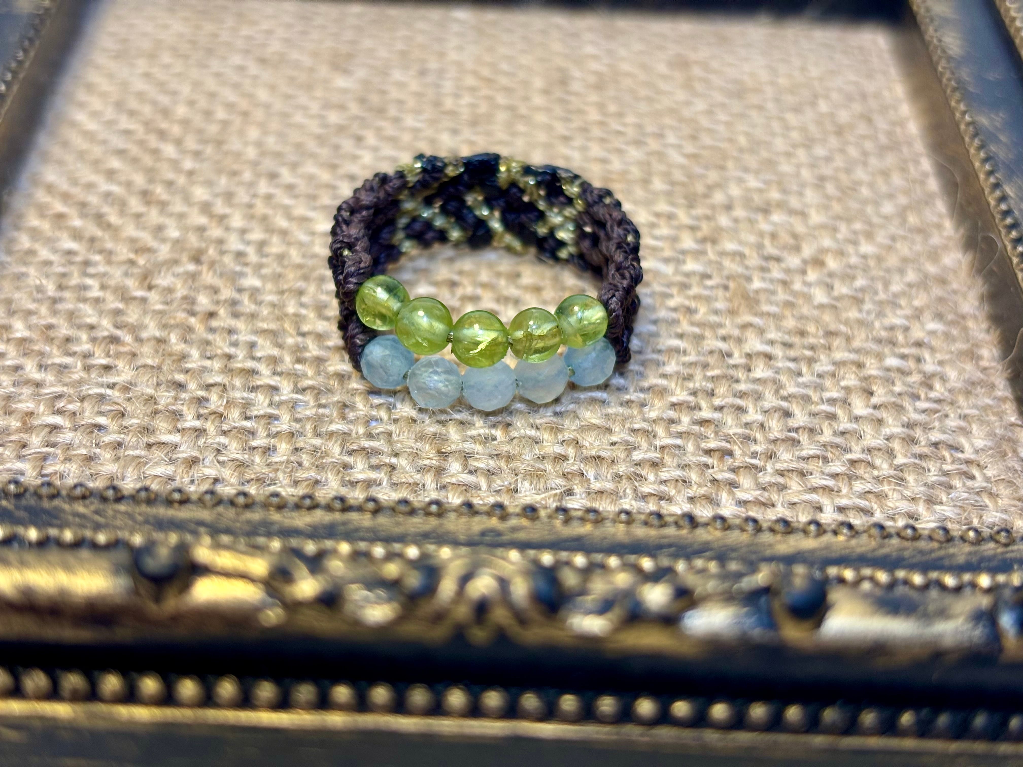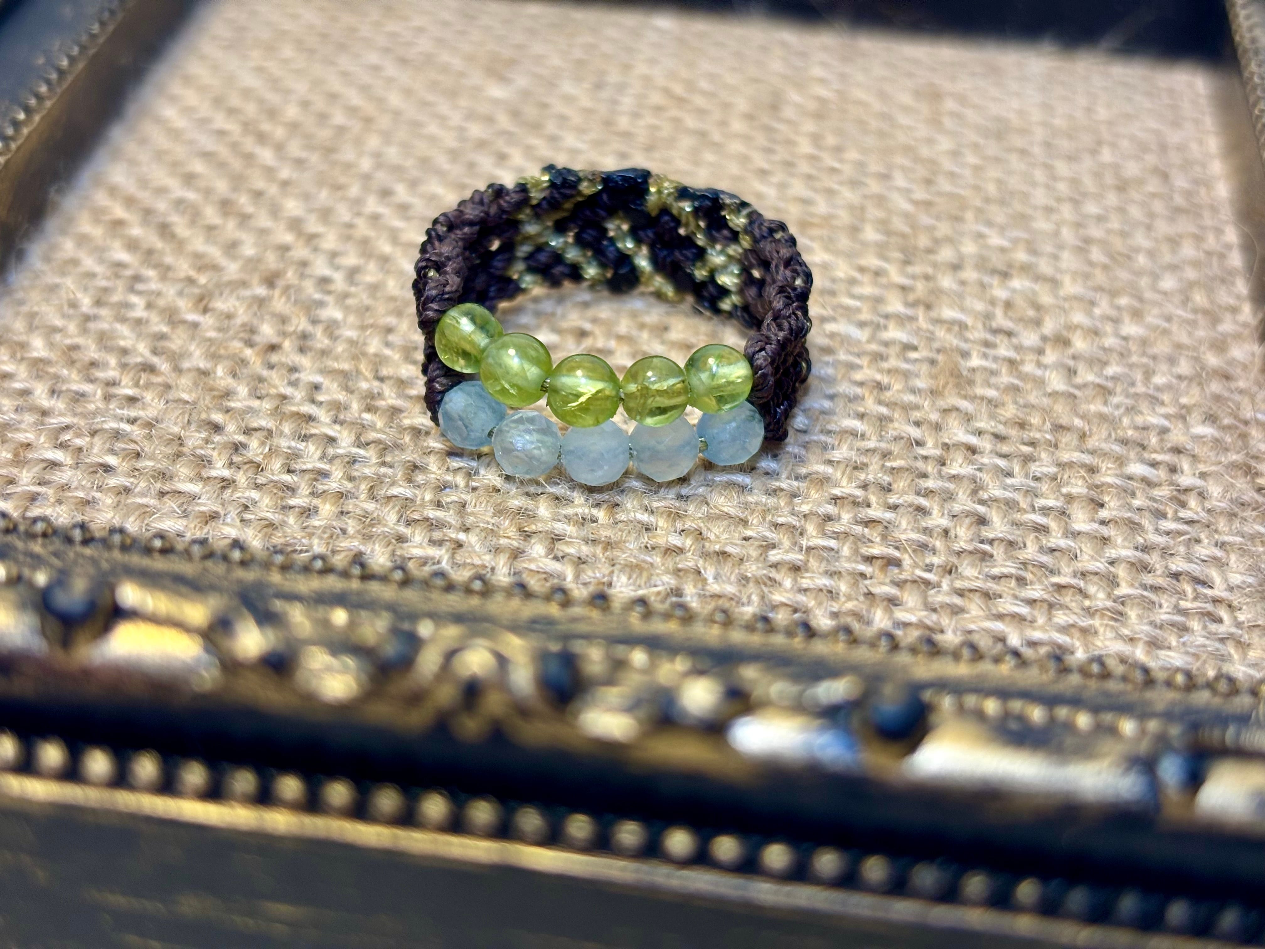 #963天然ペリドット一点物(ペリドット×アクアマリン マクラメ編み二連リング/指輪)