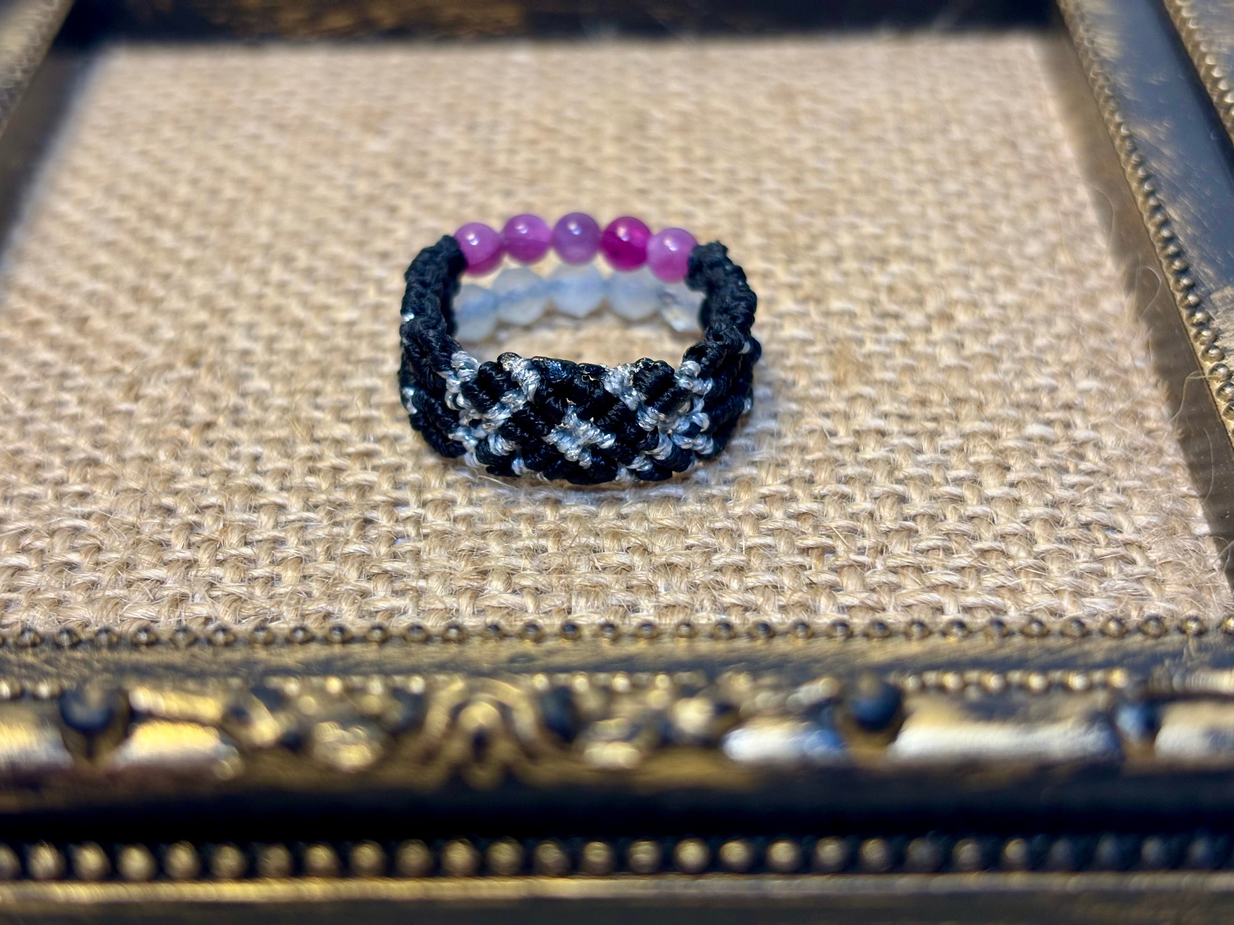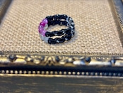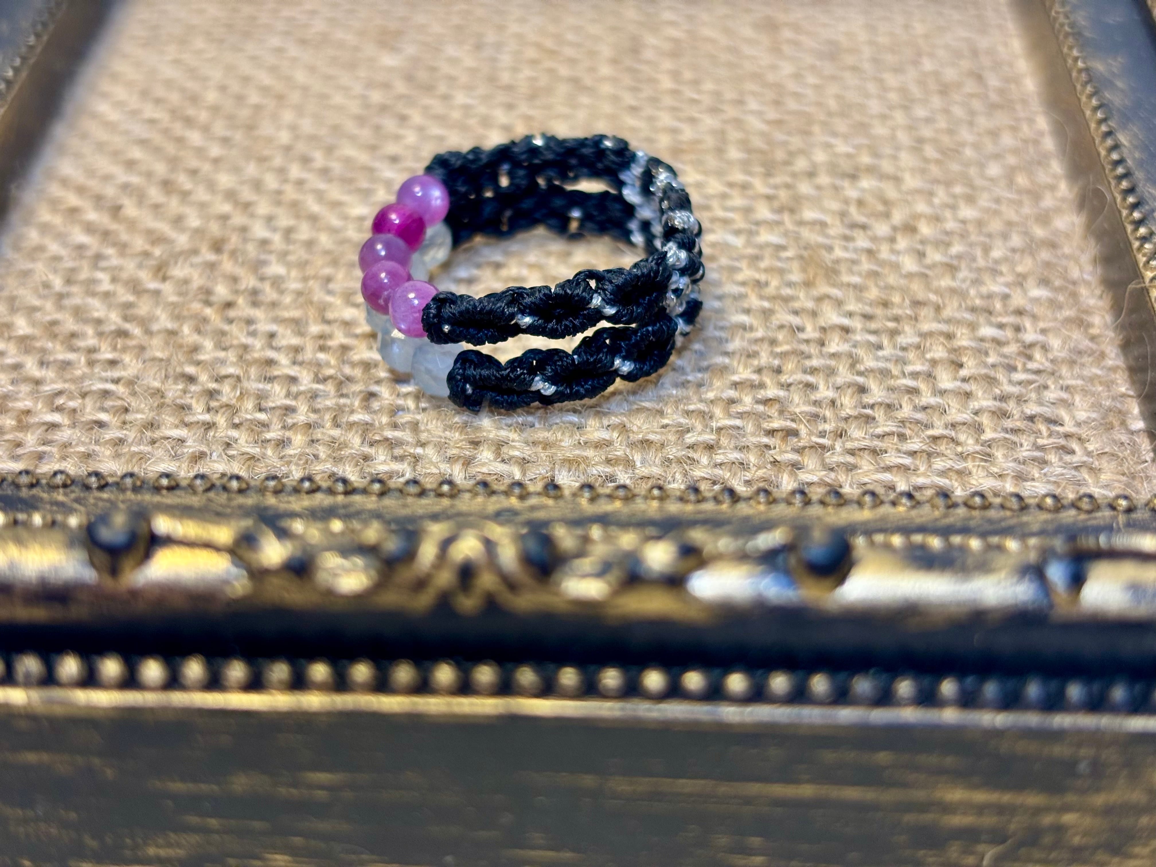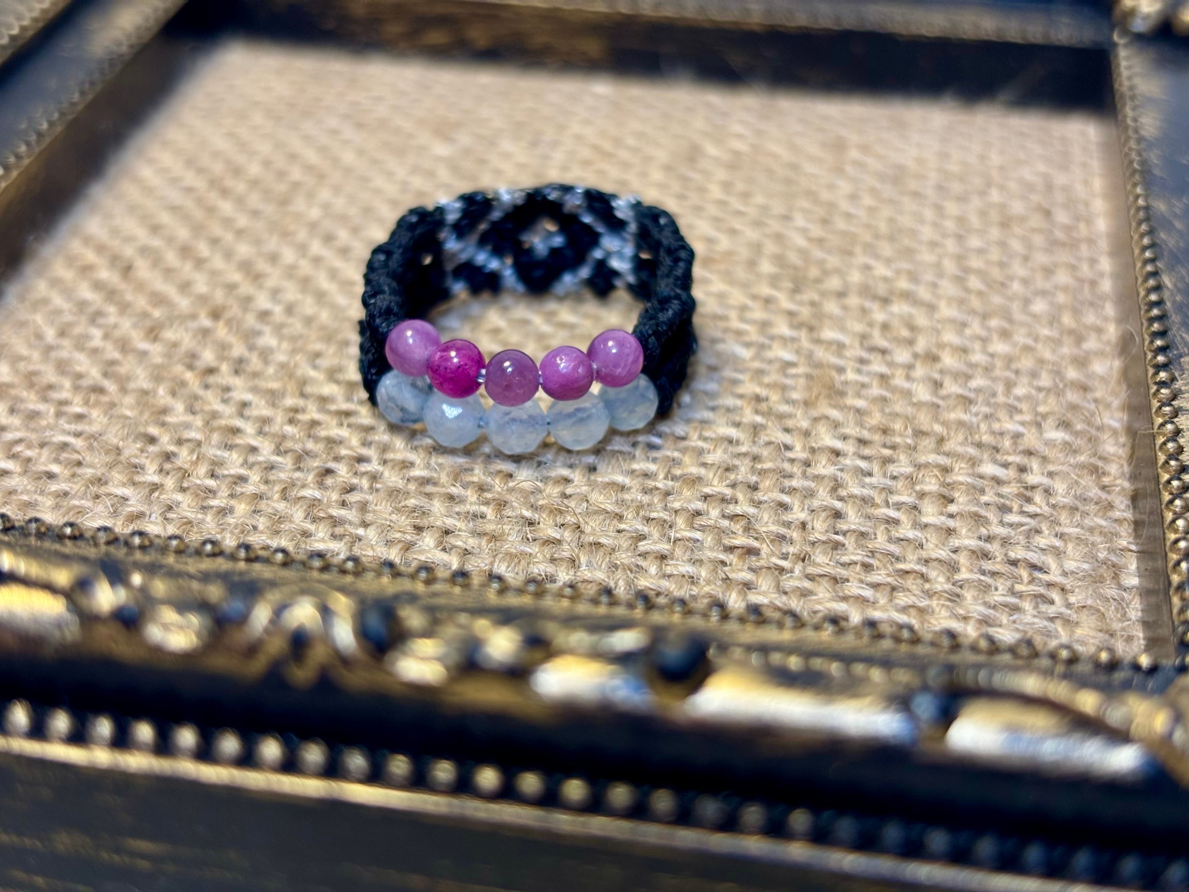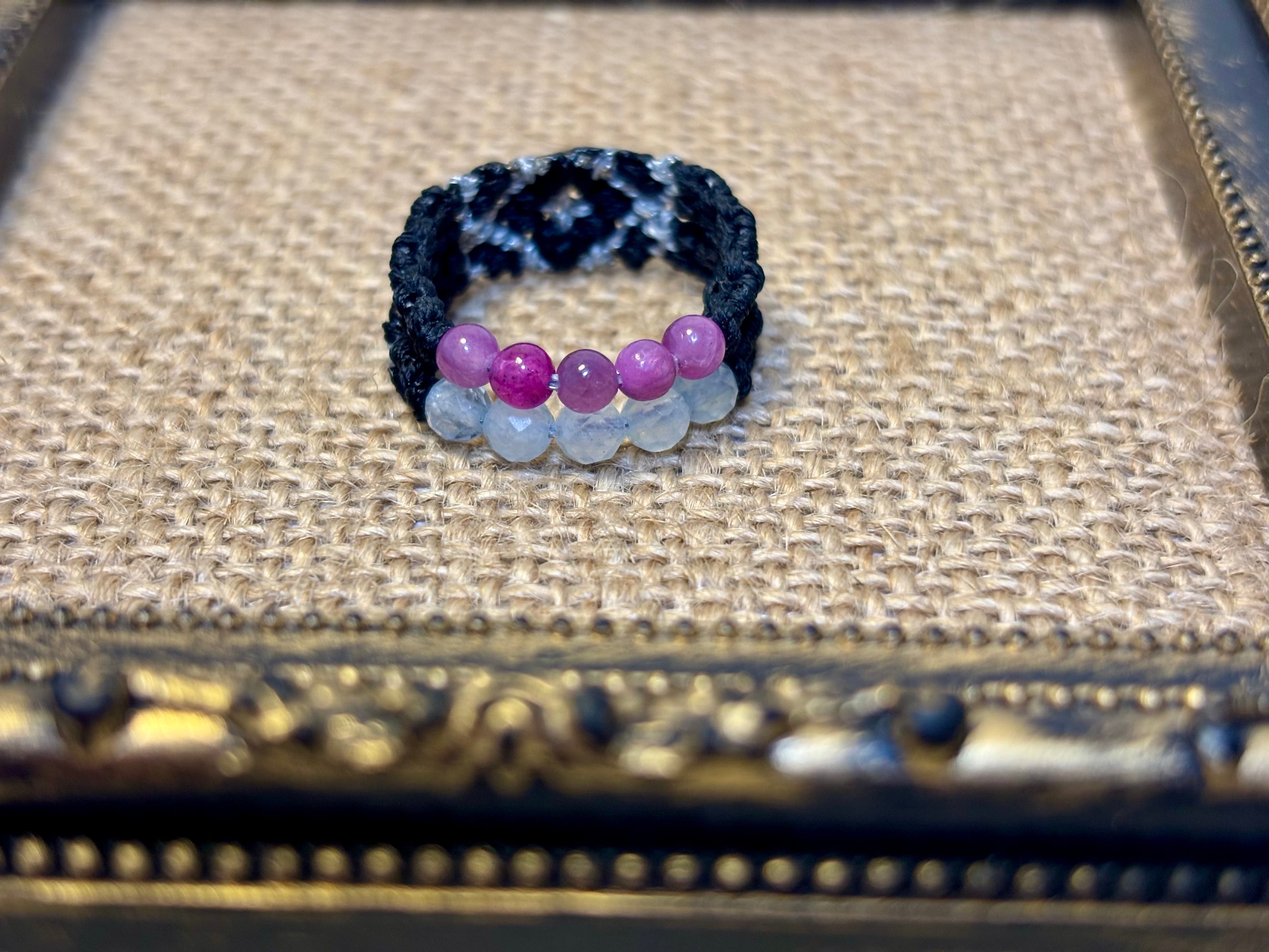 #964天然チェリーピンクルビー一点物(チェリーピンクルビー×アクアマリン マクラメ編み二連リング/指輪)