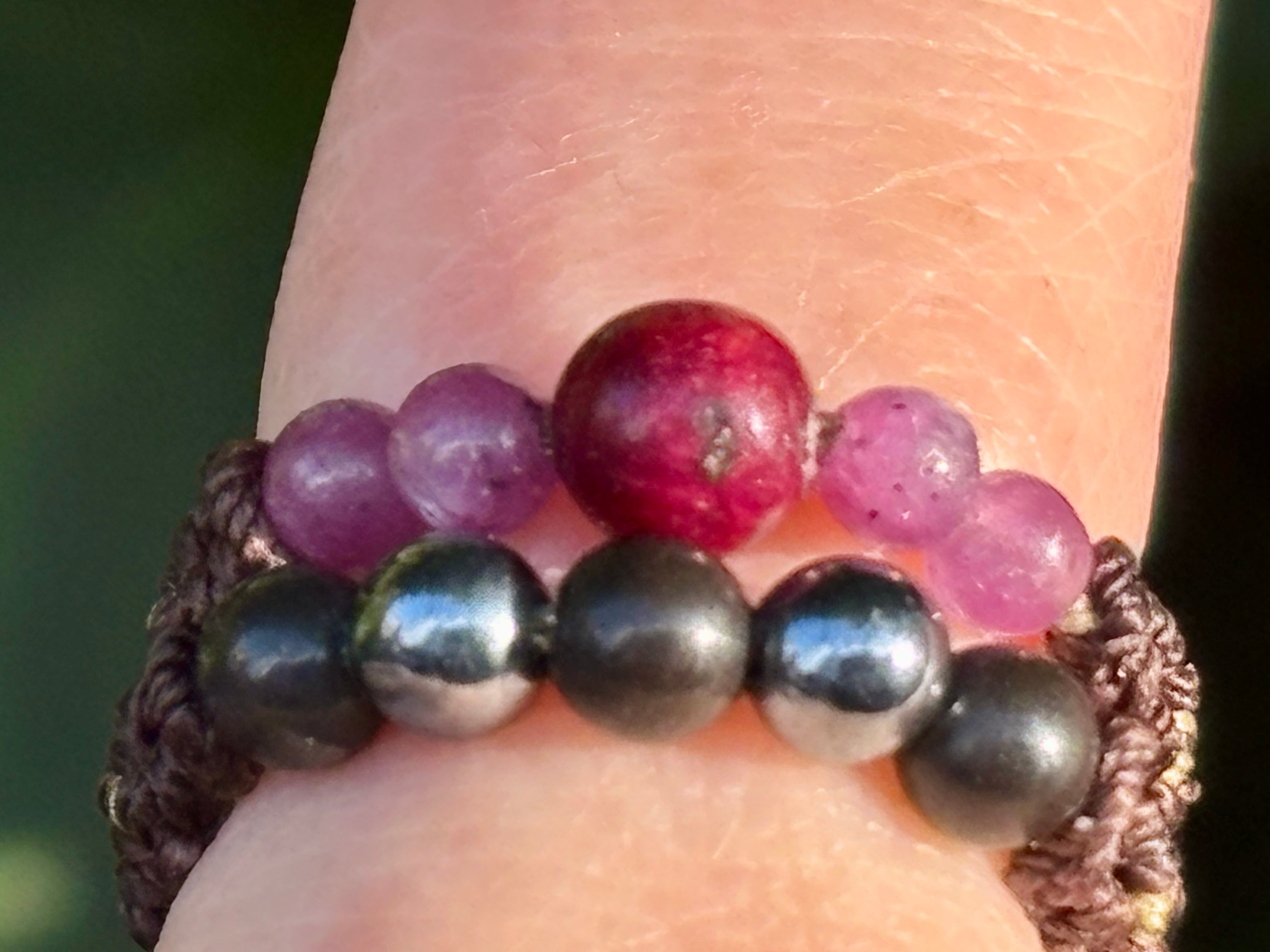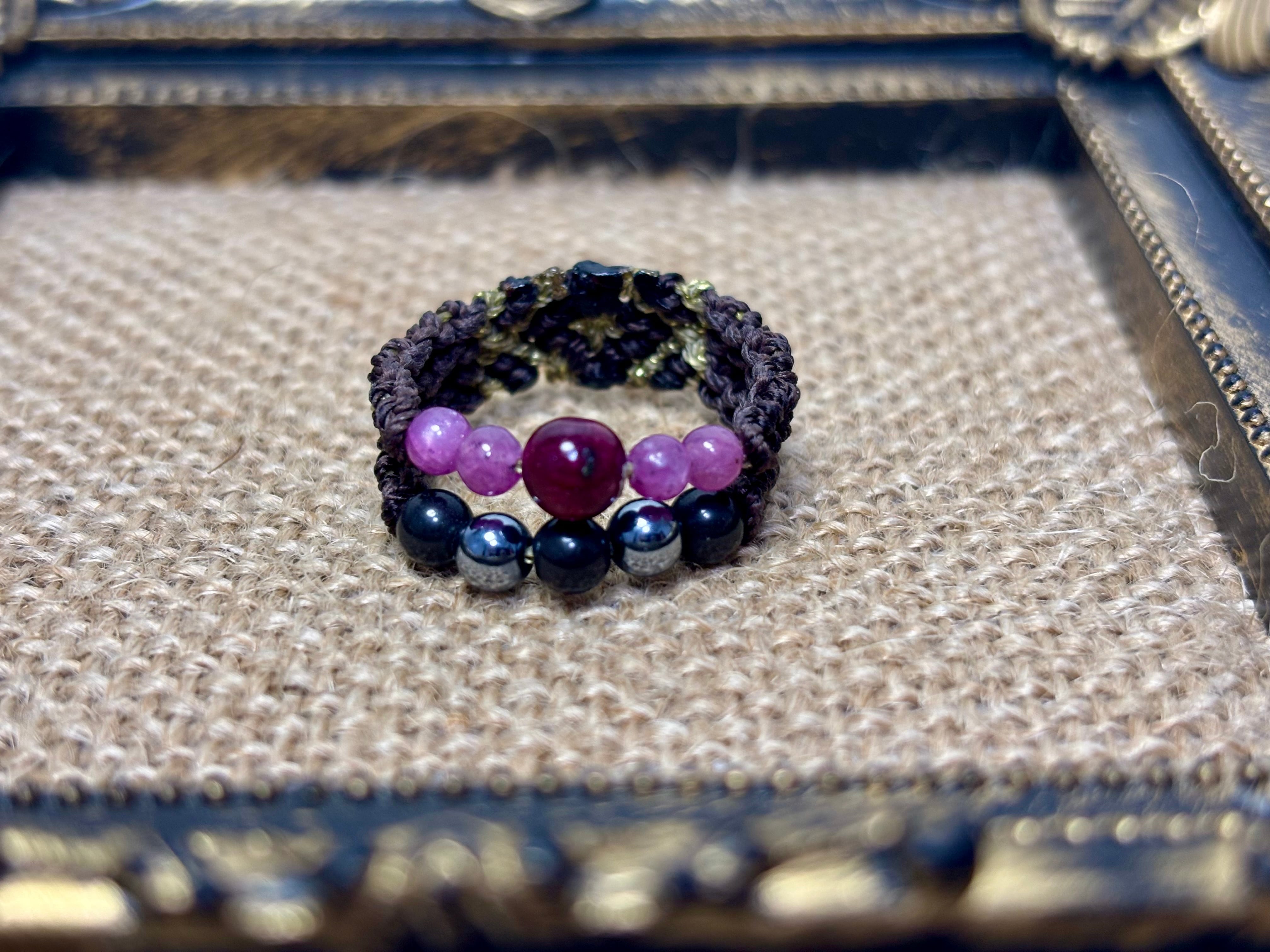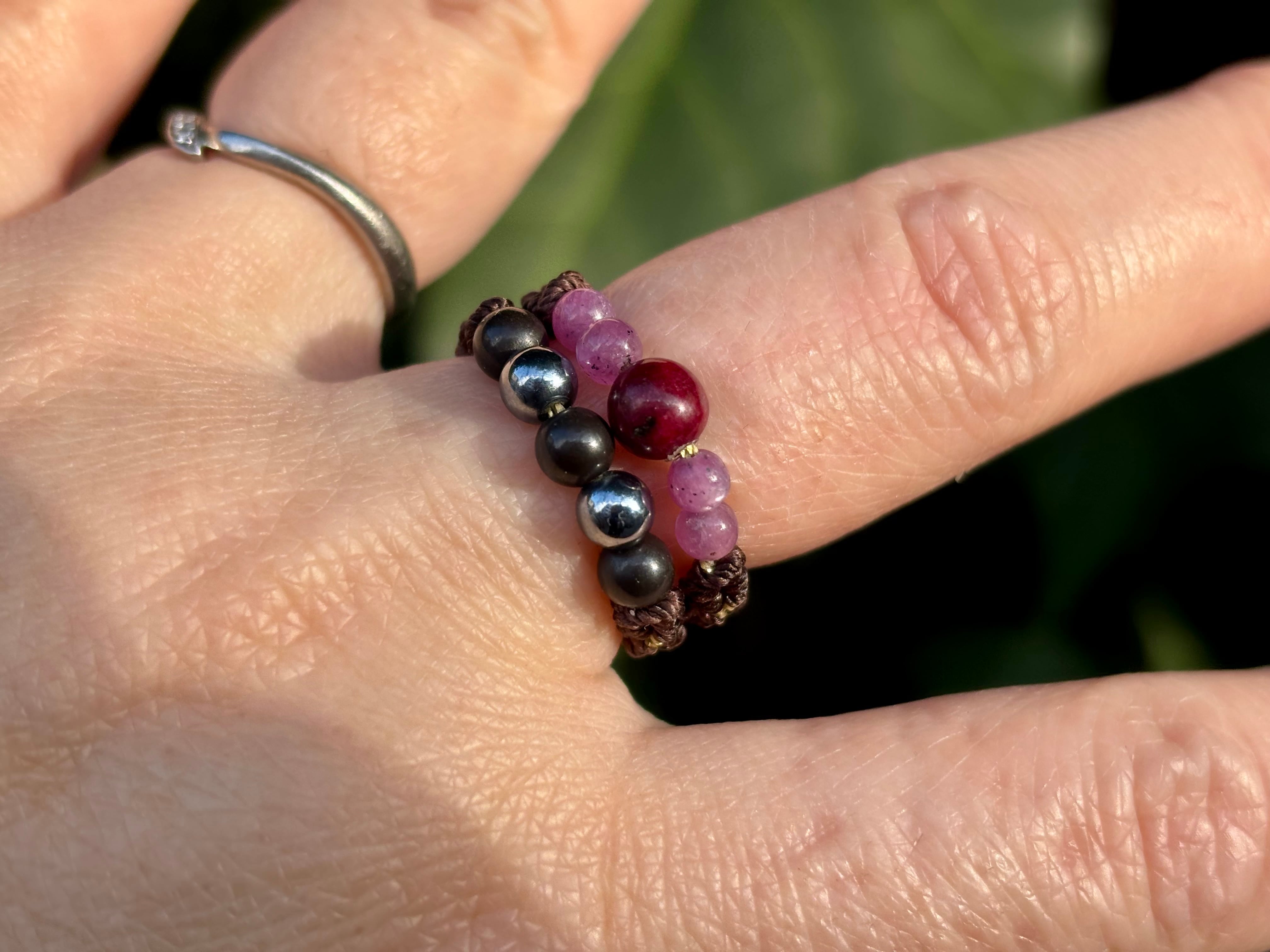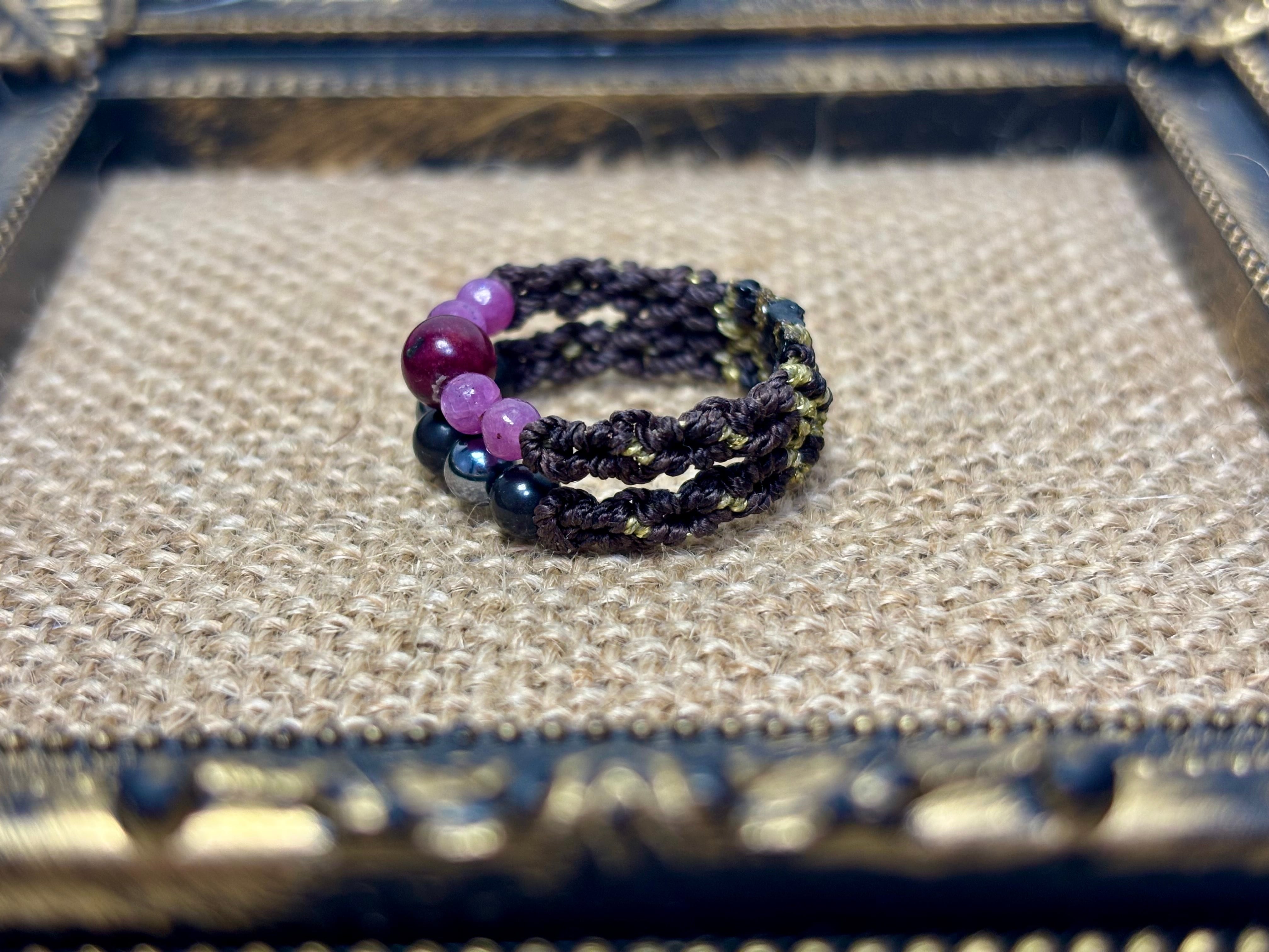 #967紅玉ルビー一点物(ルビー×チェリーピンクルビー×テラヘルツ×北投石 マクラメ編み二連リング/指輪)
