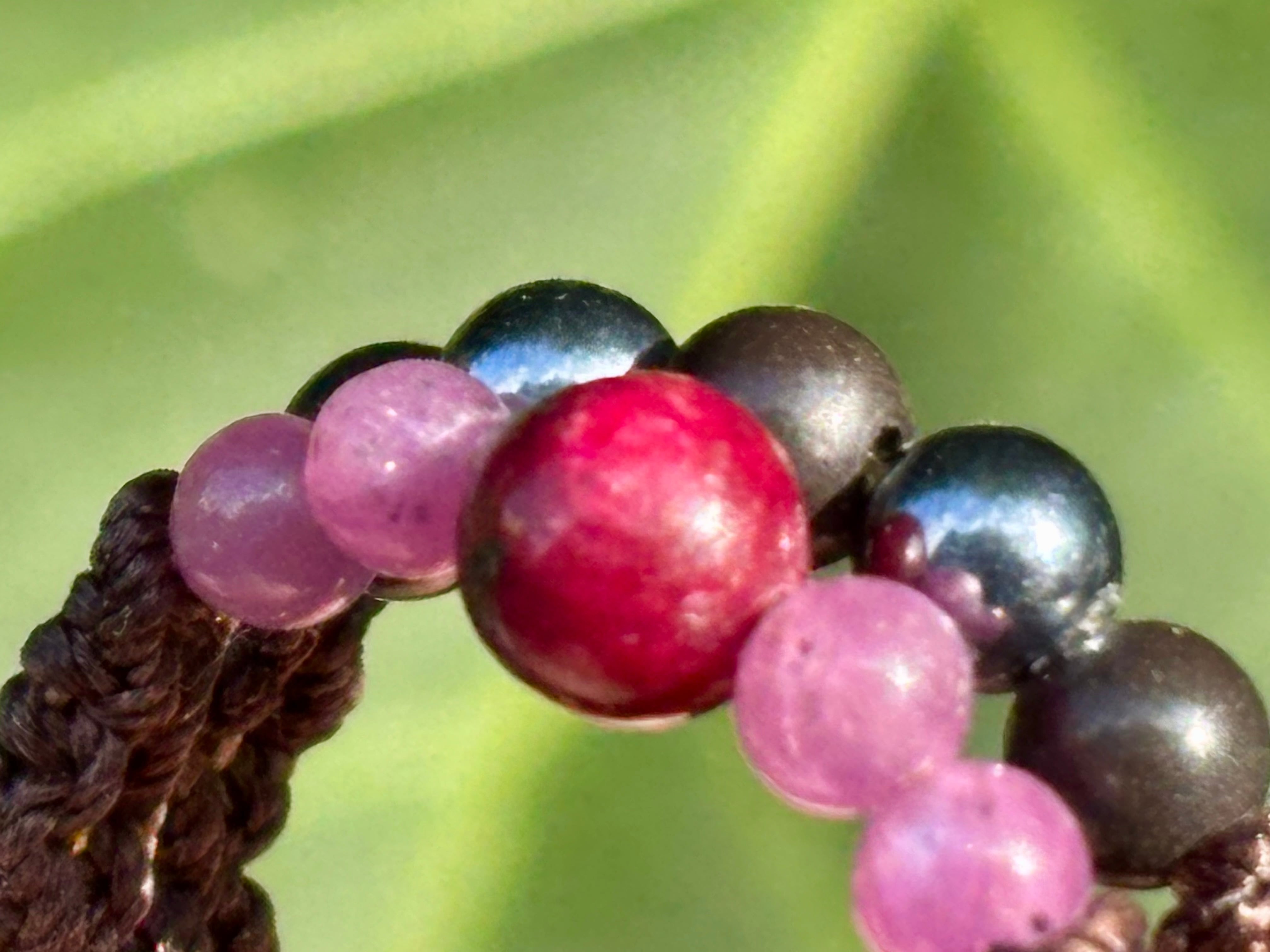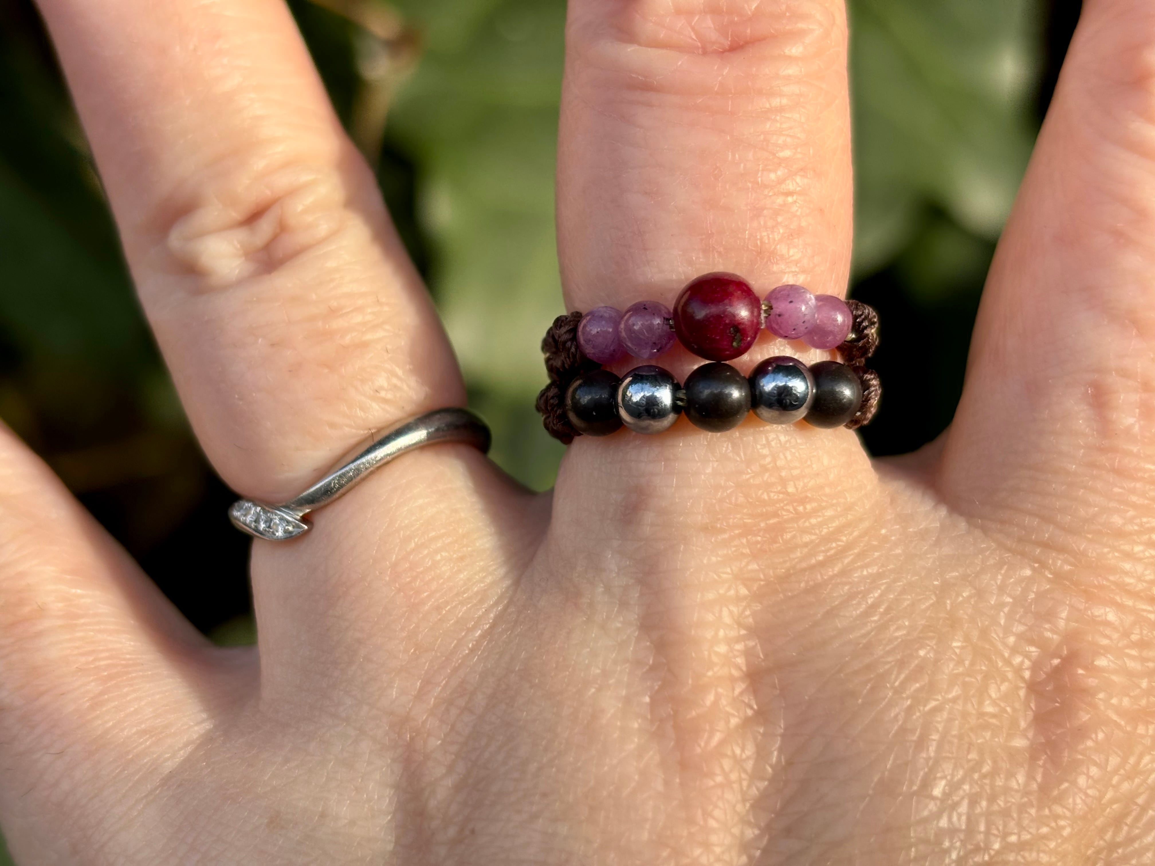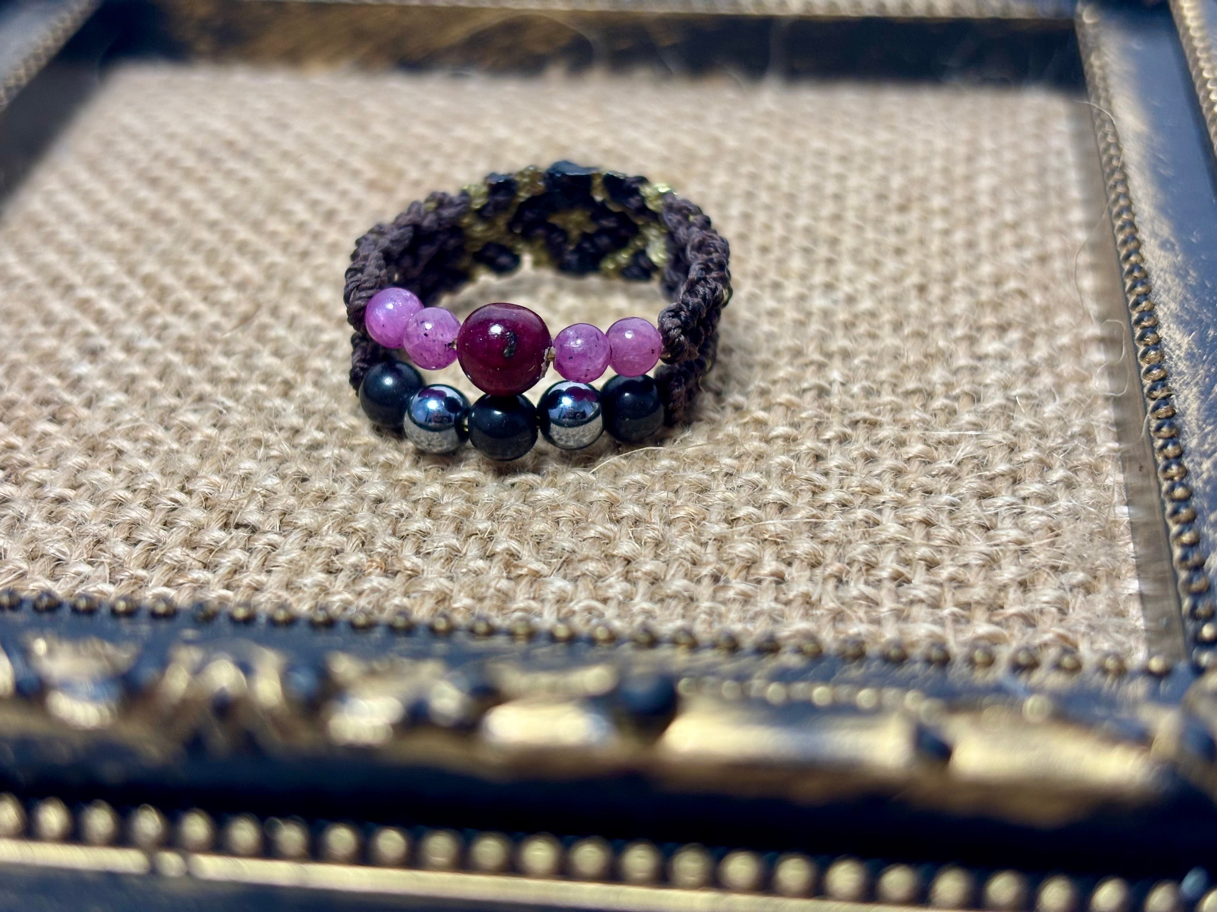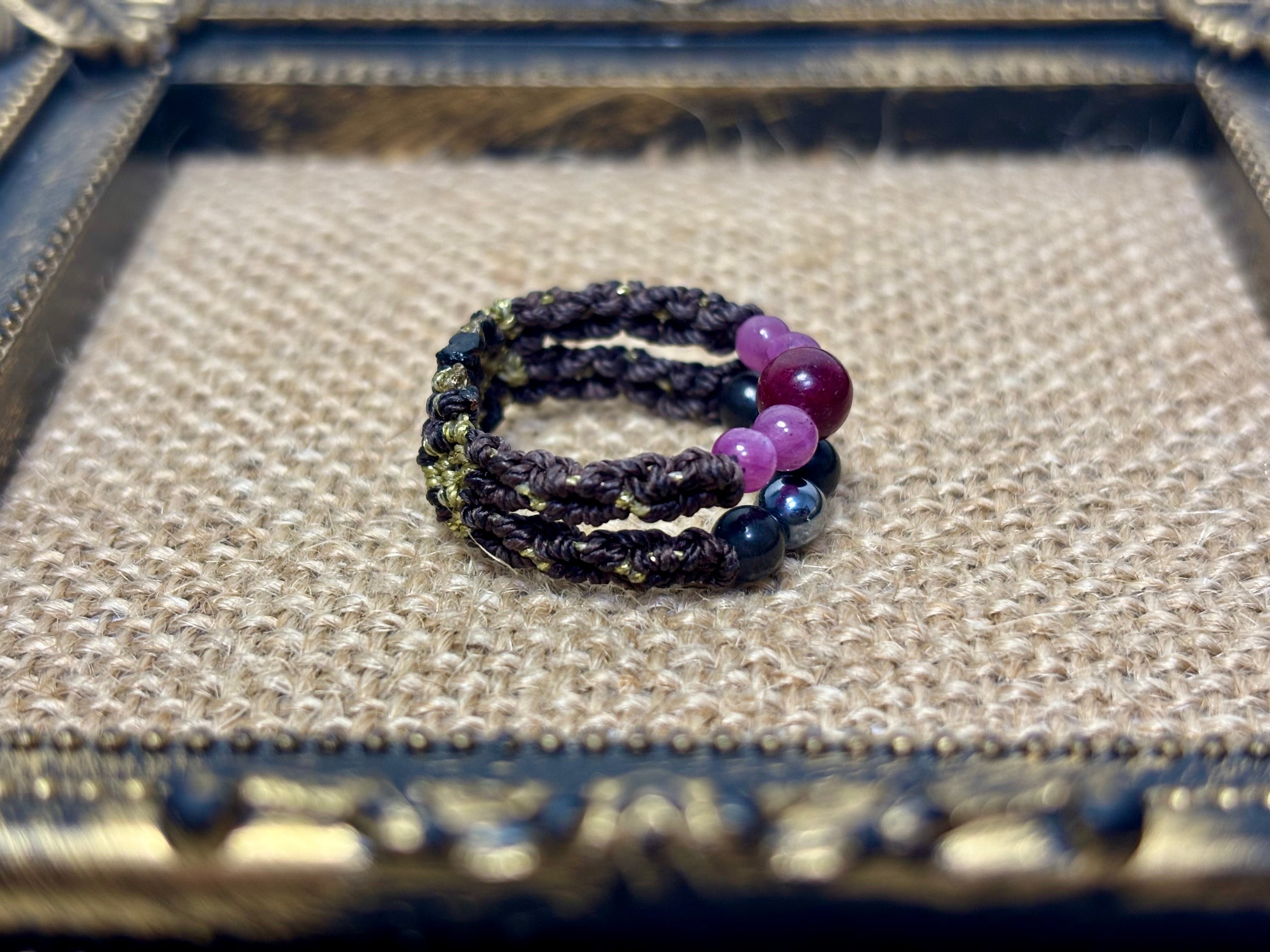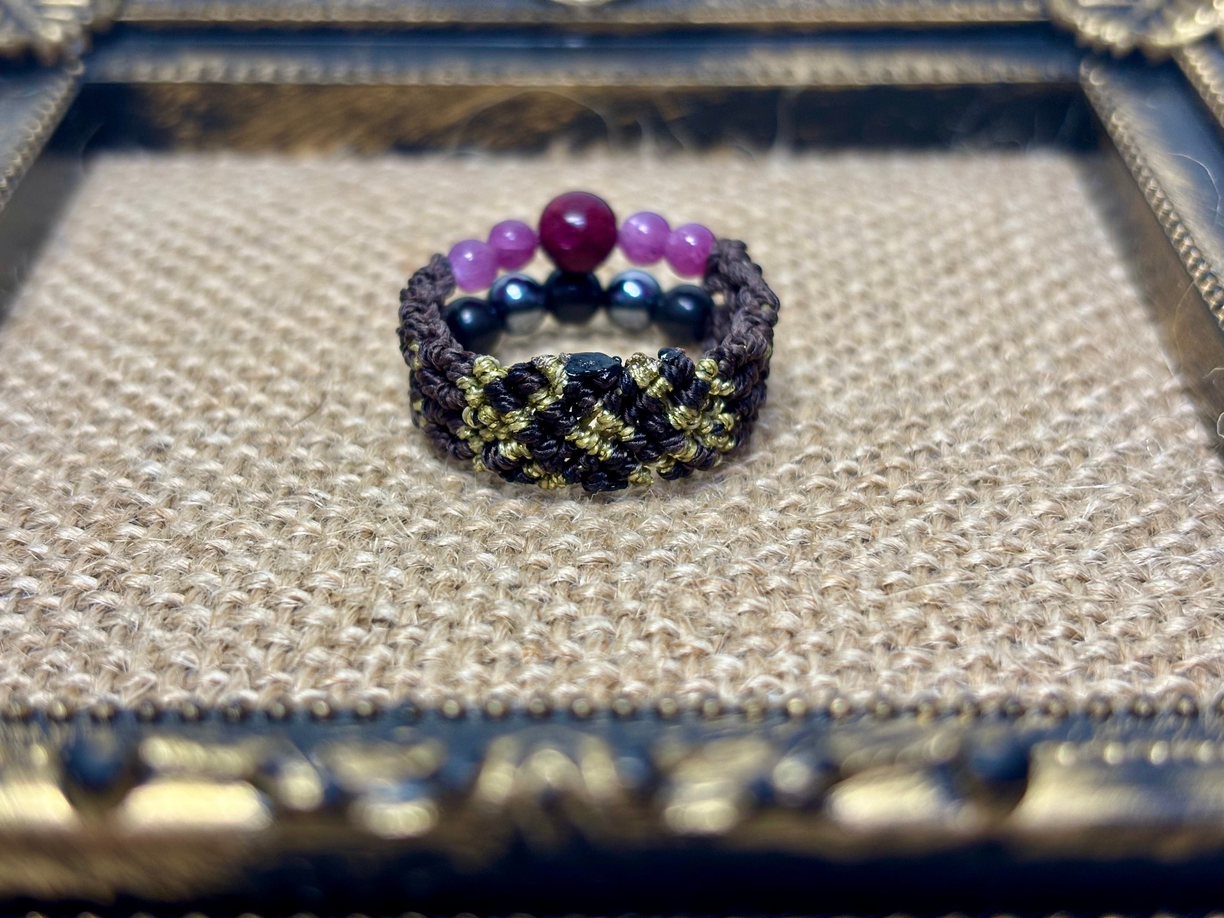 #967紅玉ルビー一点物(ルビー×チェリーピンクルビー×テラヘルツ×北投石 マクラメ編み二連リング/指輪)