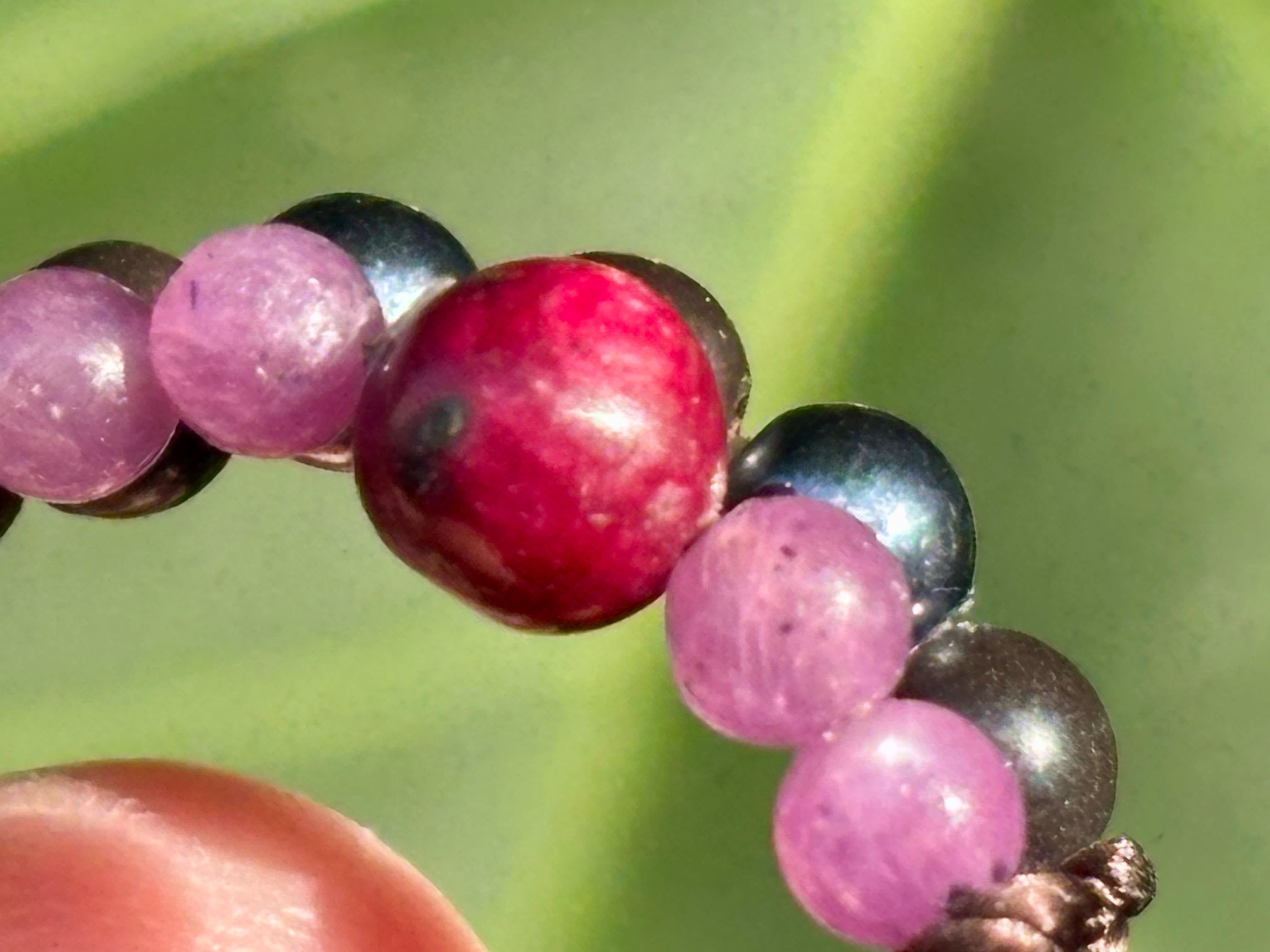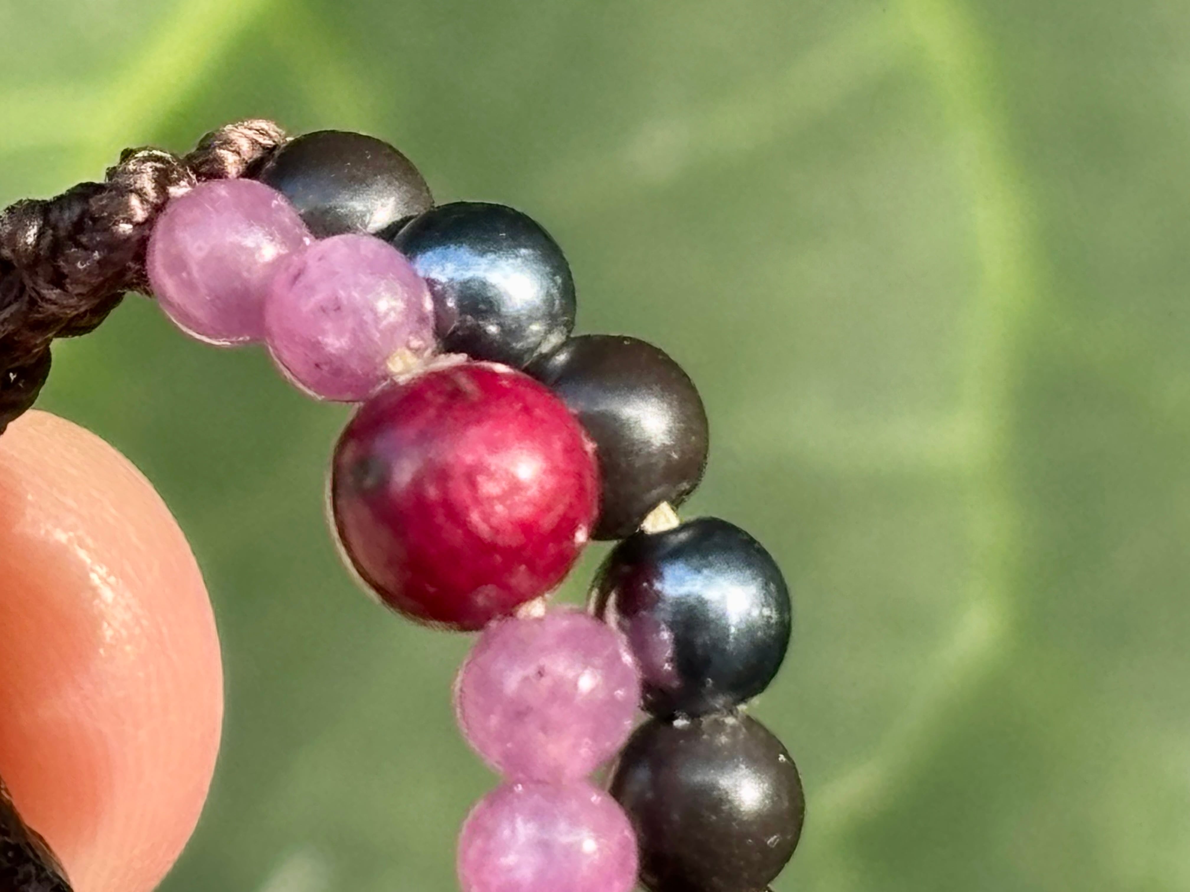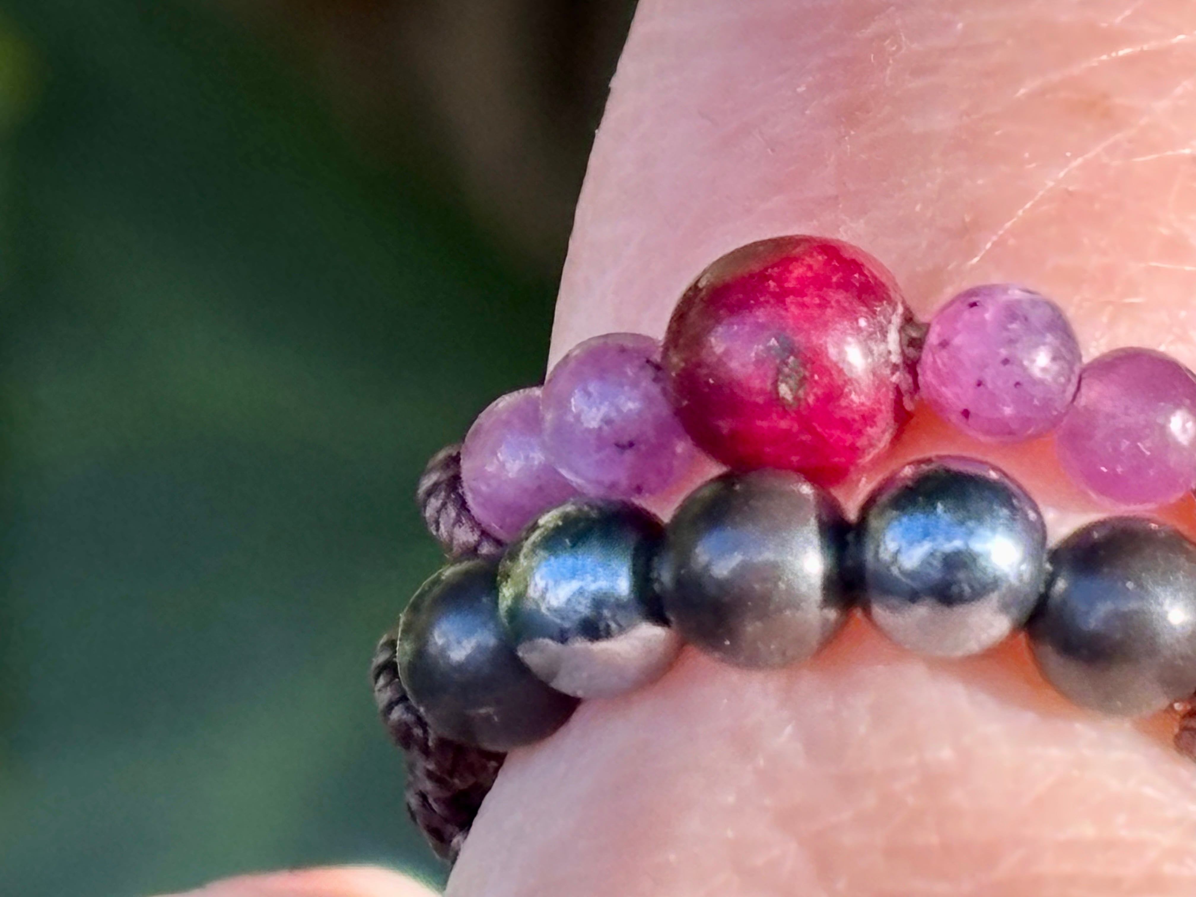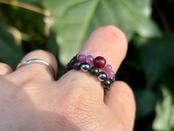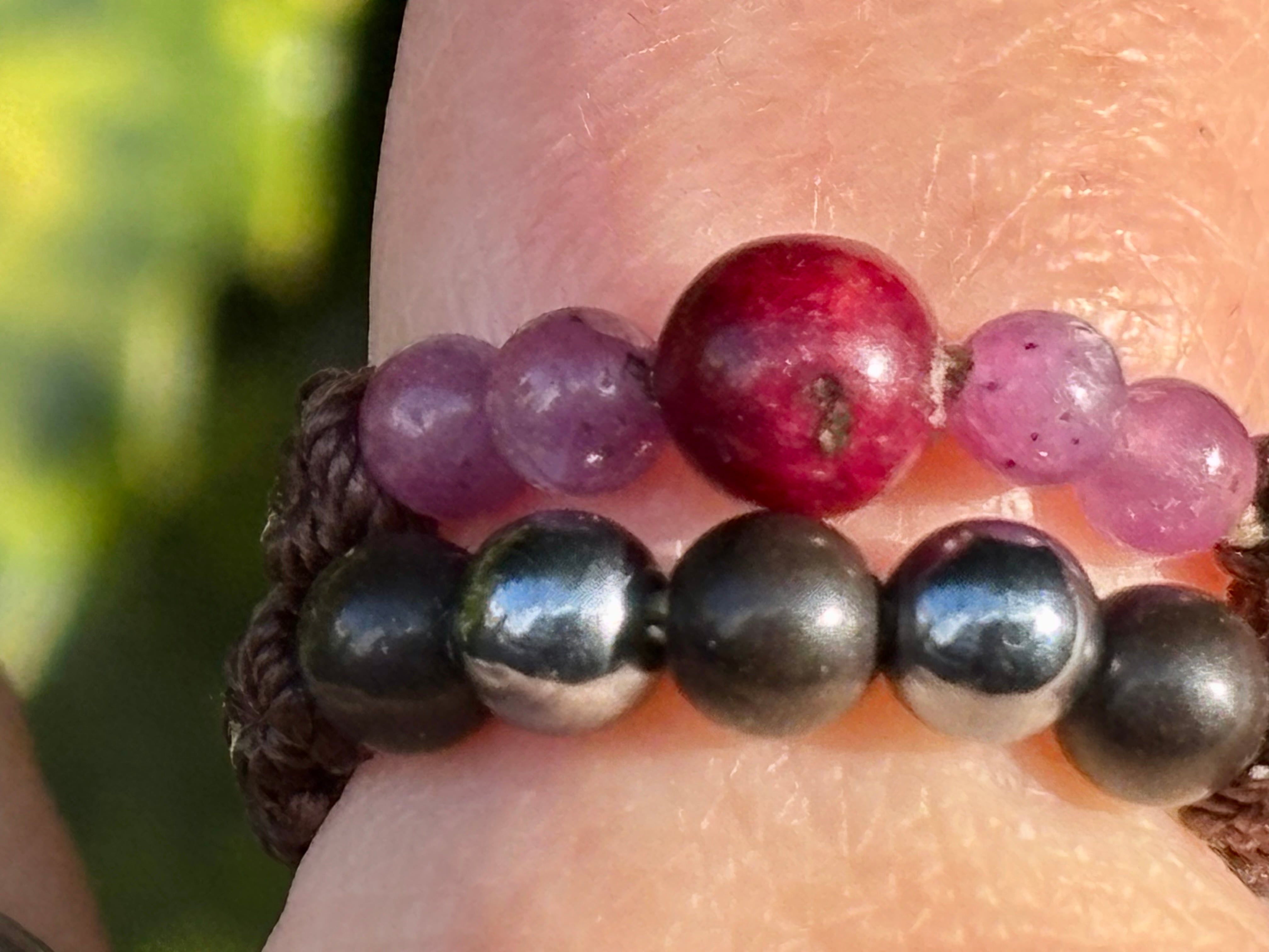 #967紅玉ルビー一点物(ルビー×チェリーピンクルビー×テラヘルツ×北投石 マクラメ編み二連リング/指輪)