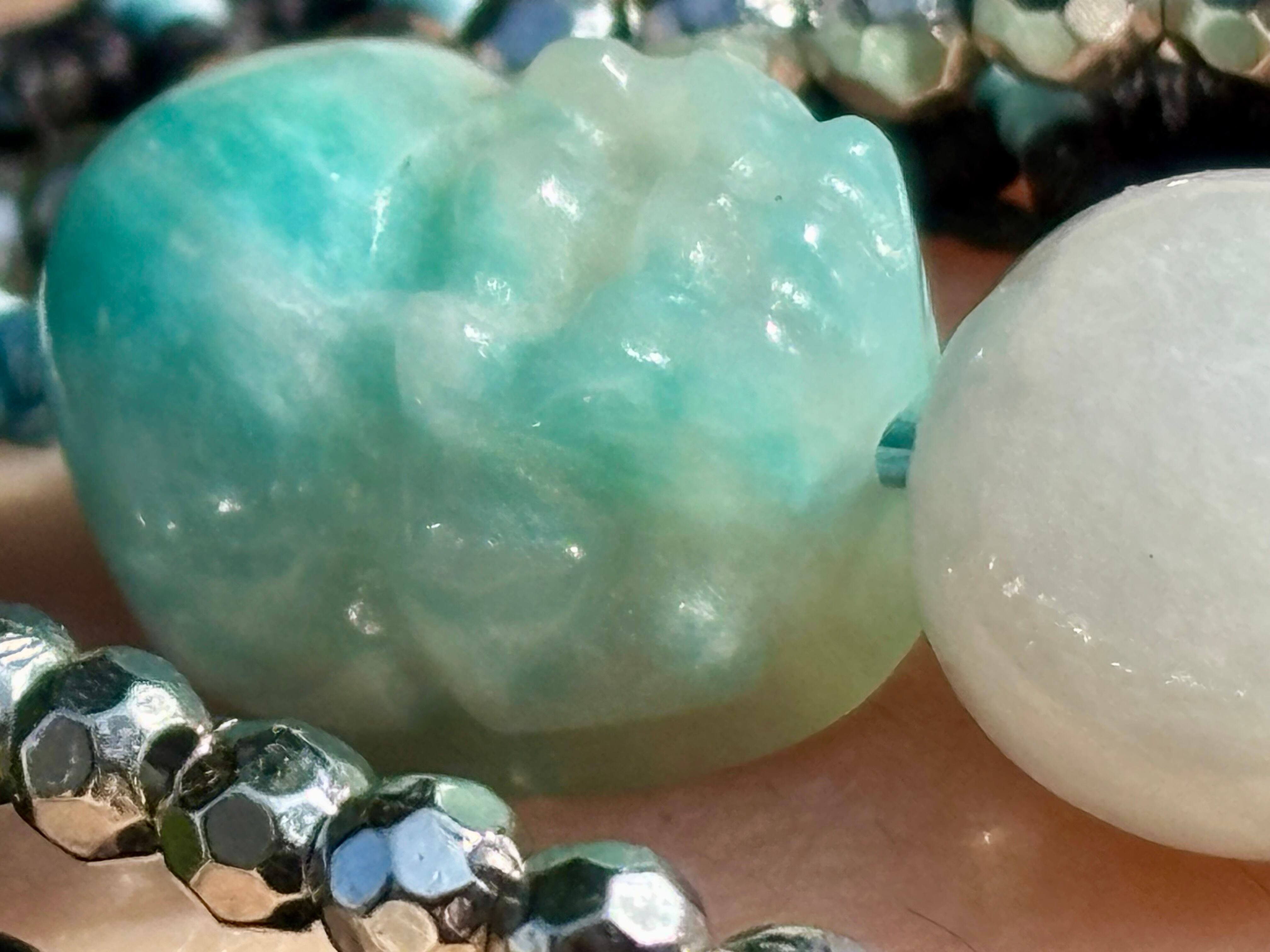 アマゾナイト(天河石)にシリカ(石英)成分が混ざり合い、透明感と艶が増した美しい青緑色の天然石で、「希望の石」や「ホープストーン」とも呼ばれ、精神安定や幸運を引き寄せるパワーストーンとして人気があります。