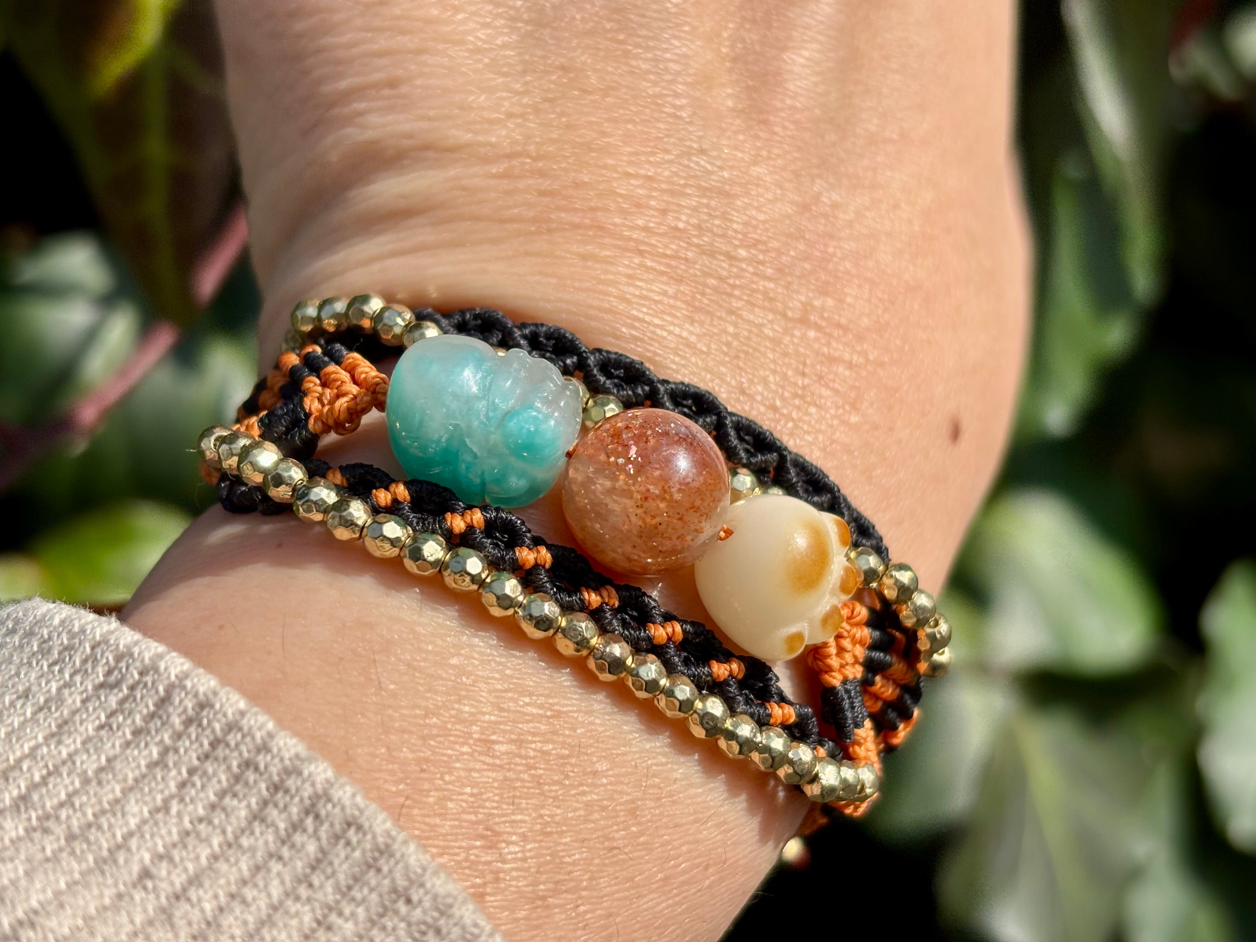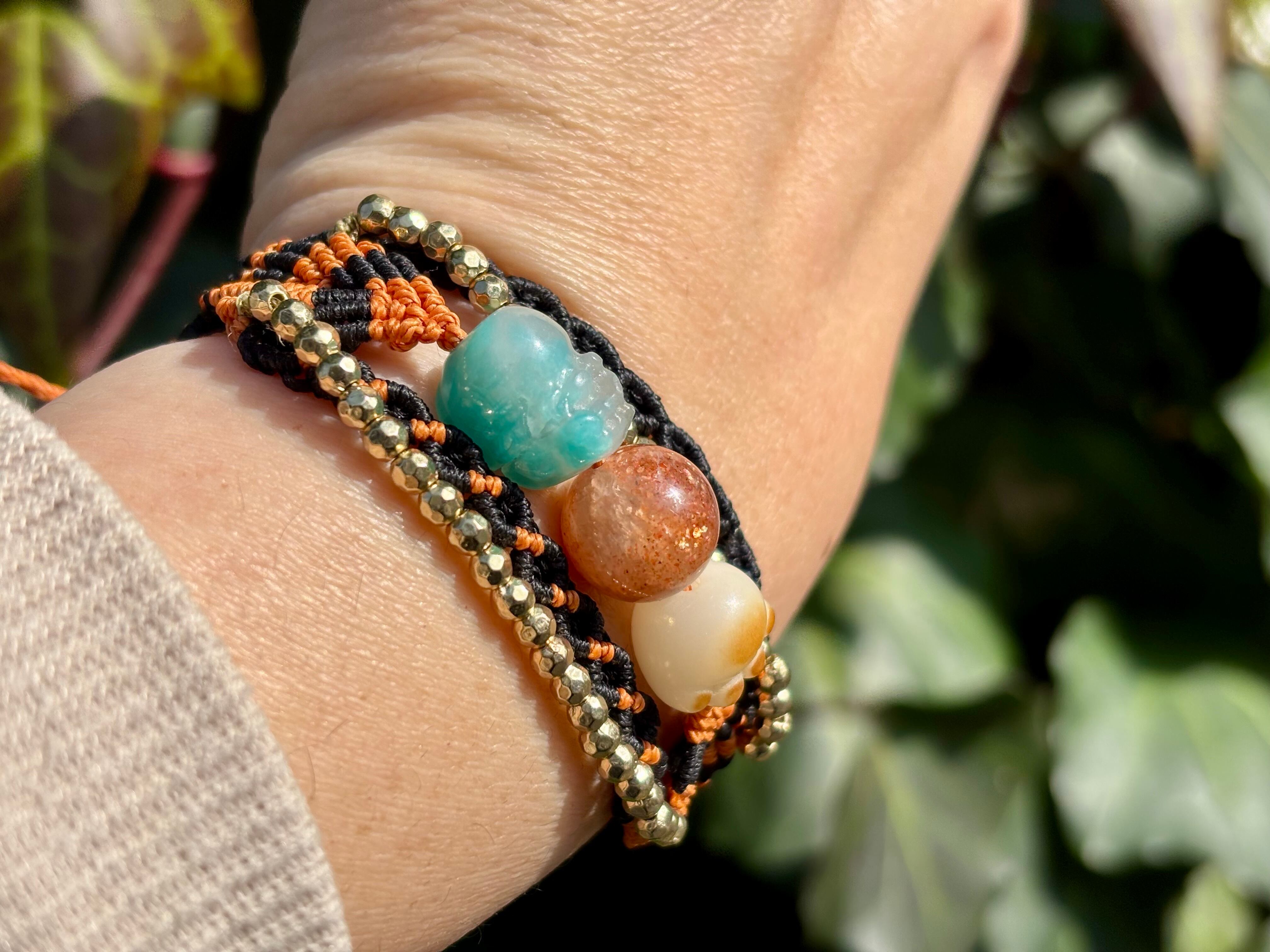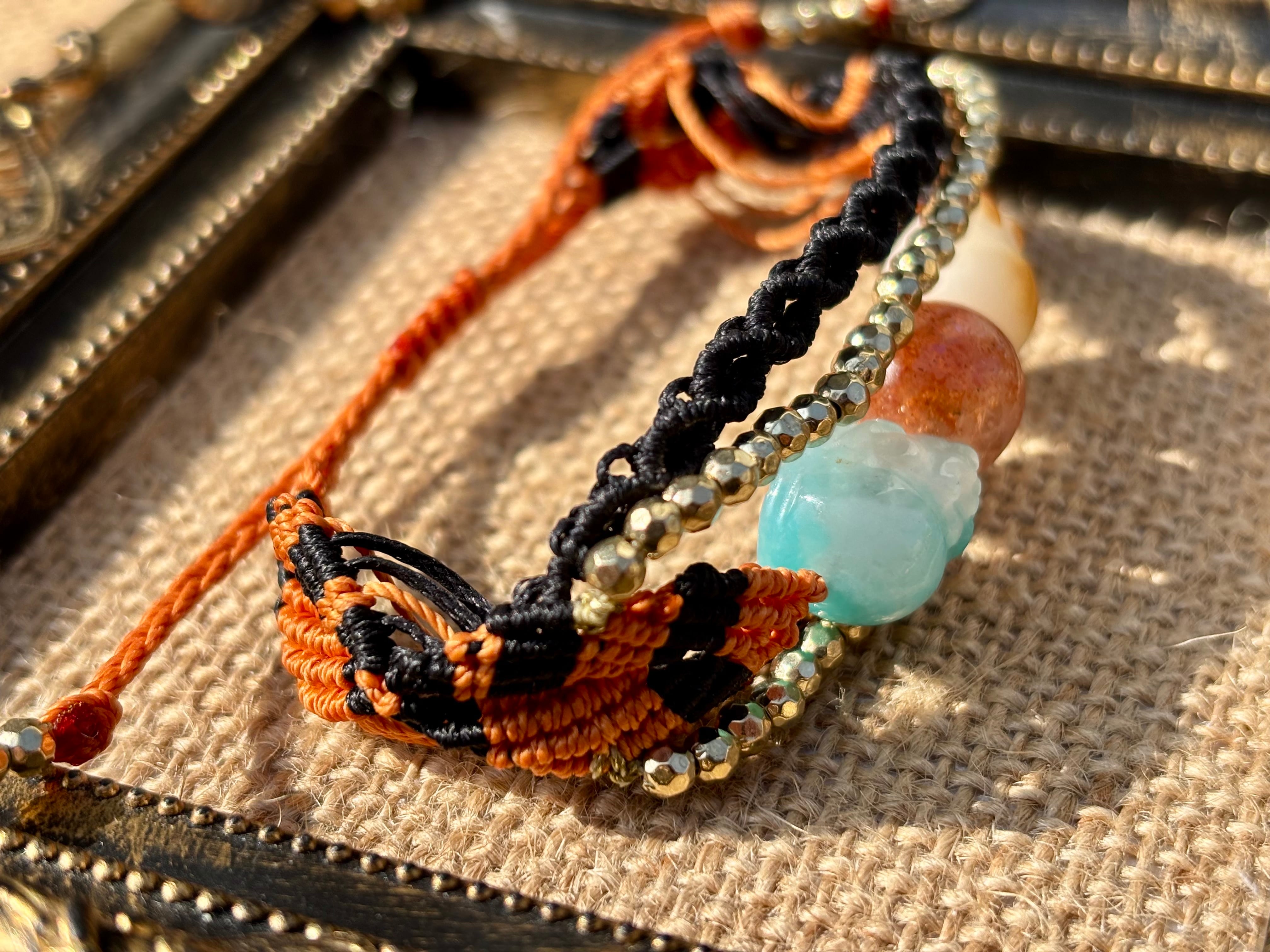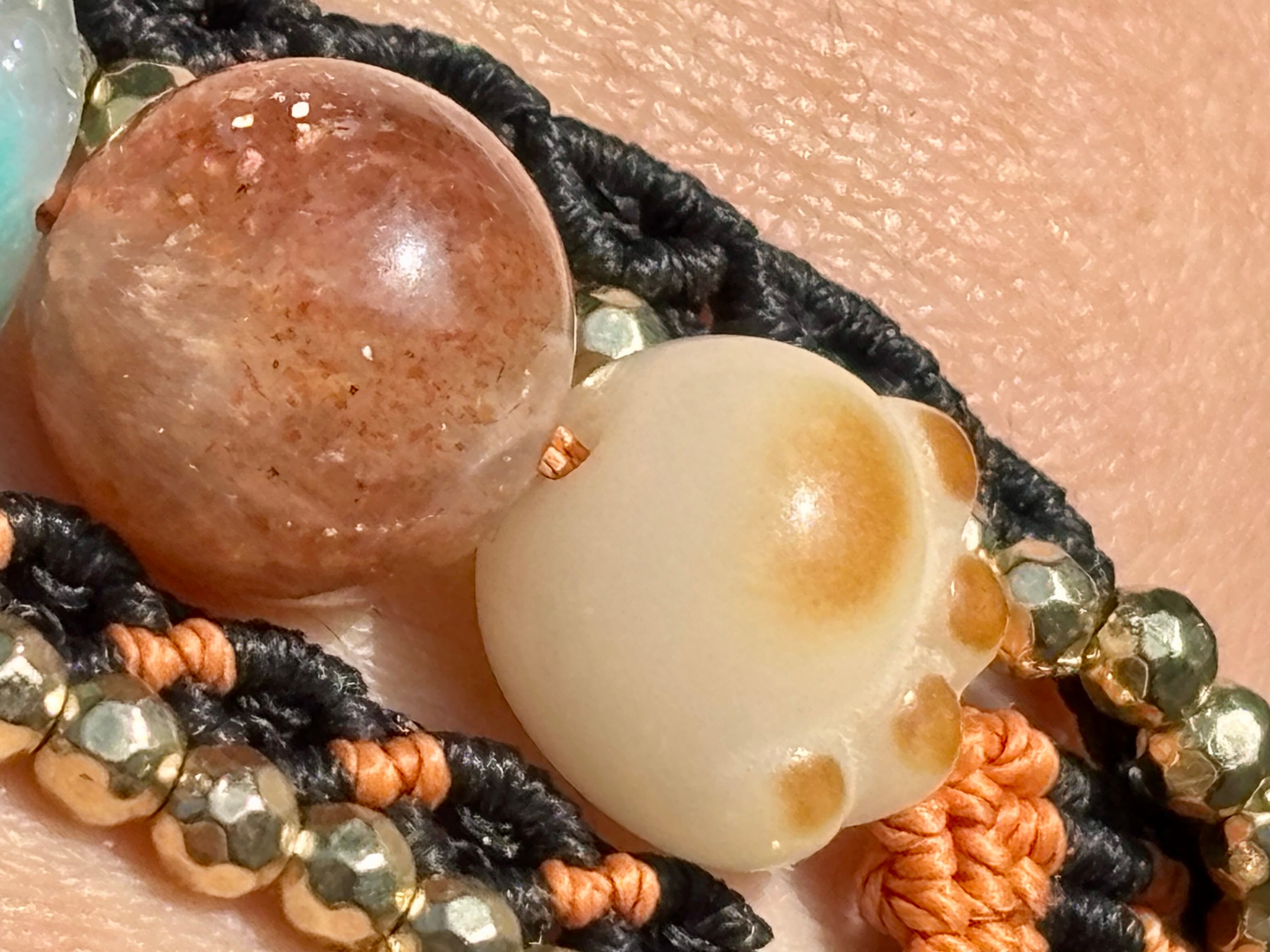 #980財運の神獣・貔貅一点物(アマゾナイトシリカ×サンストーン×菩提樹 マクラメ編みブレスレット)