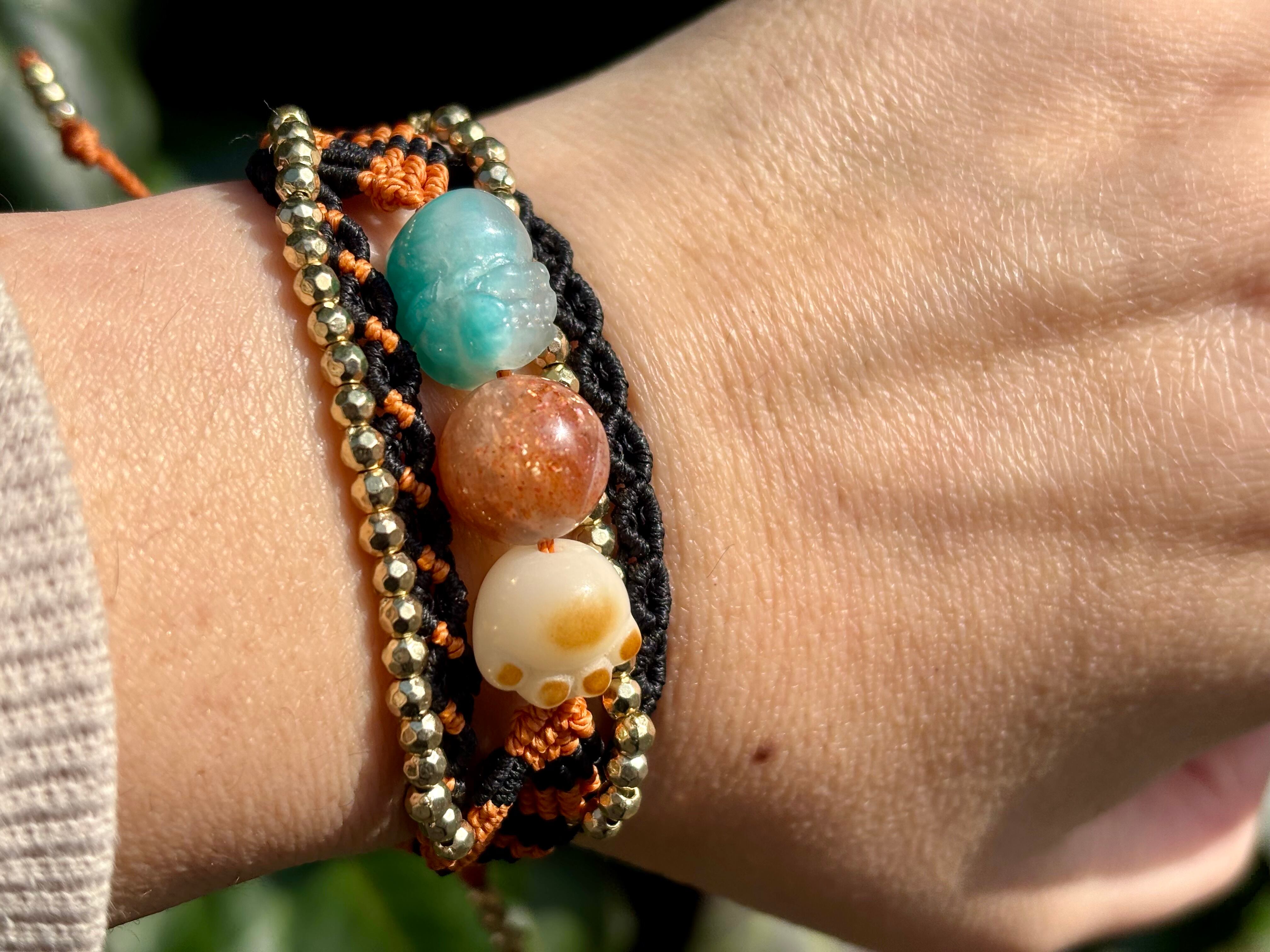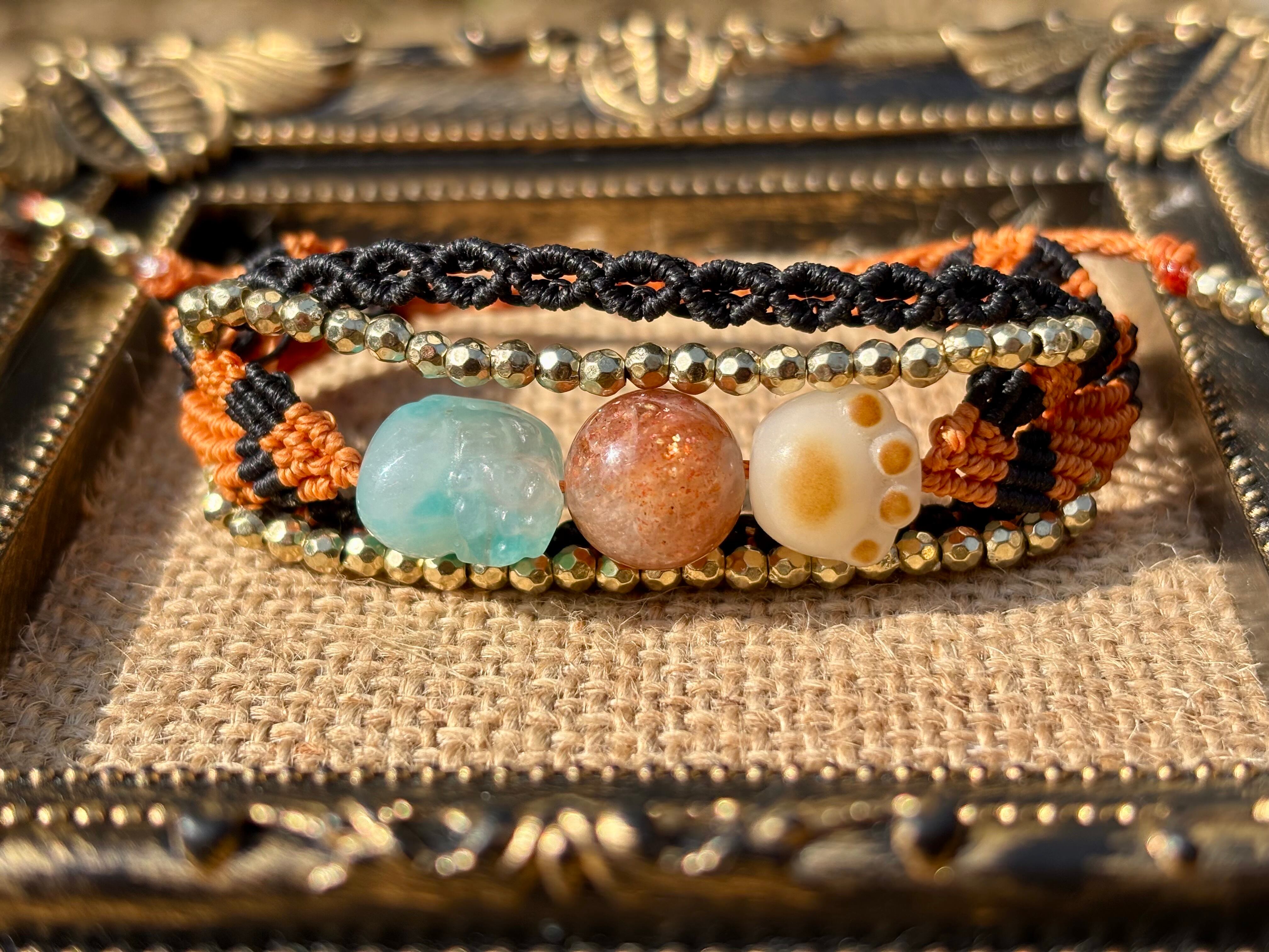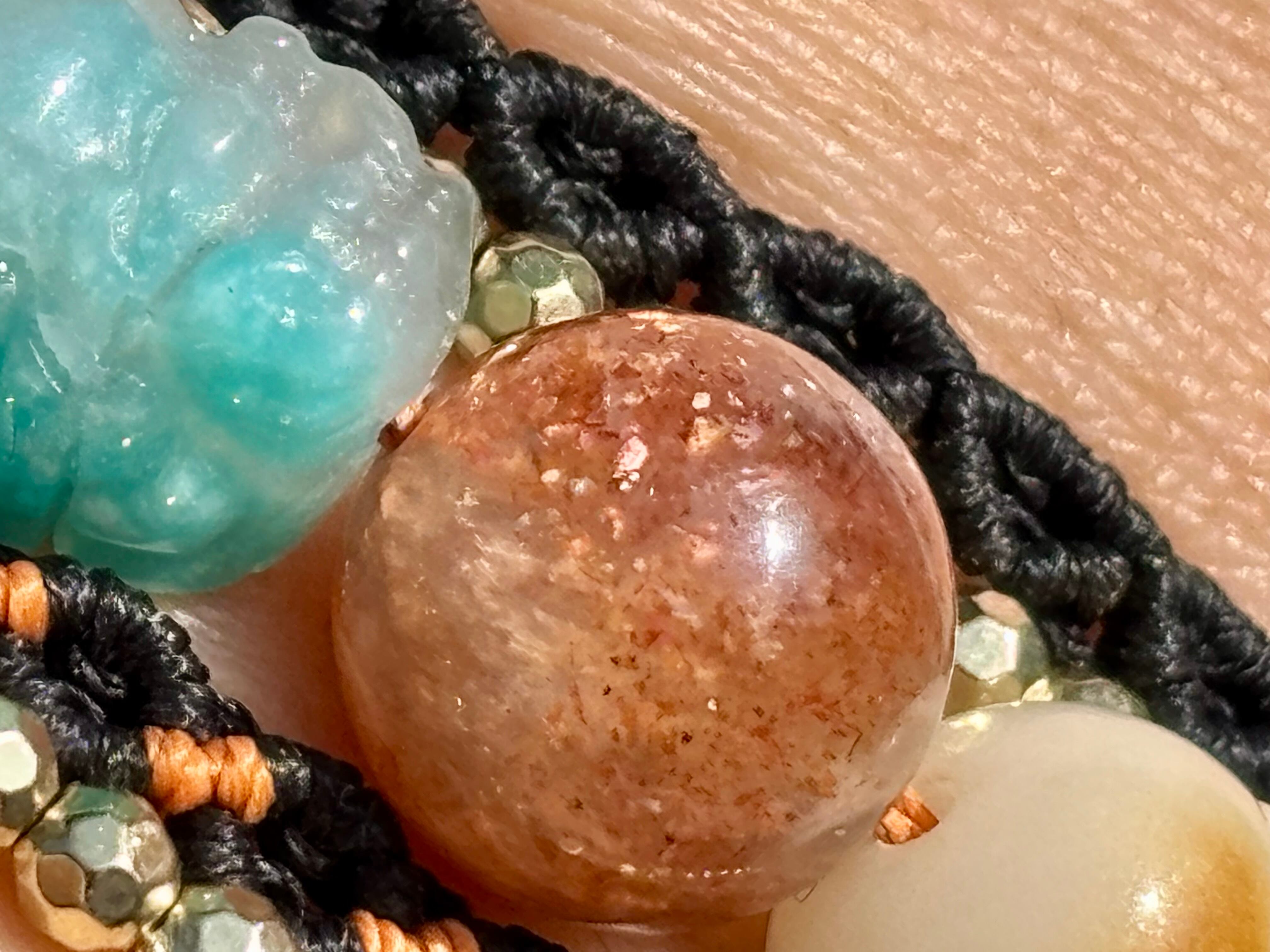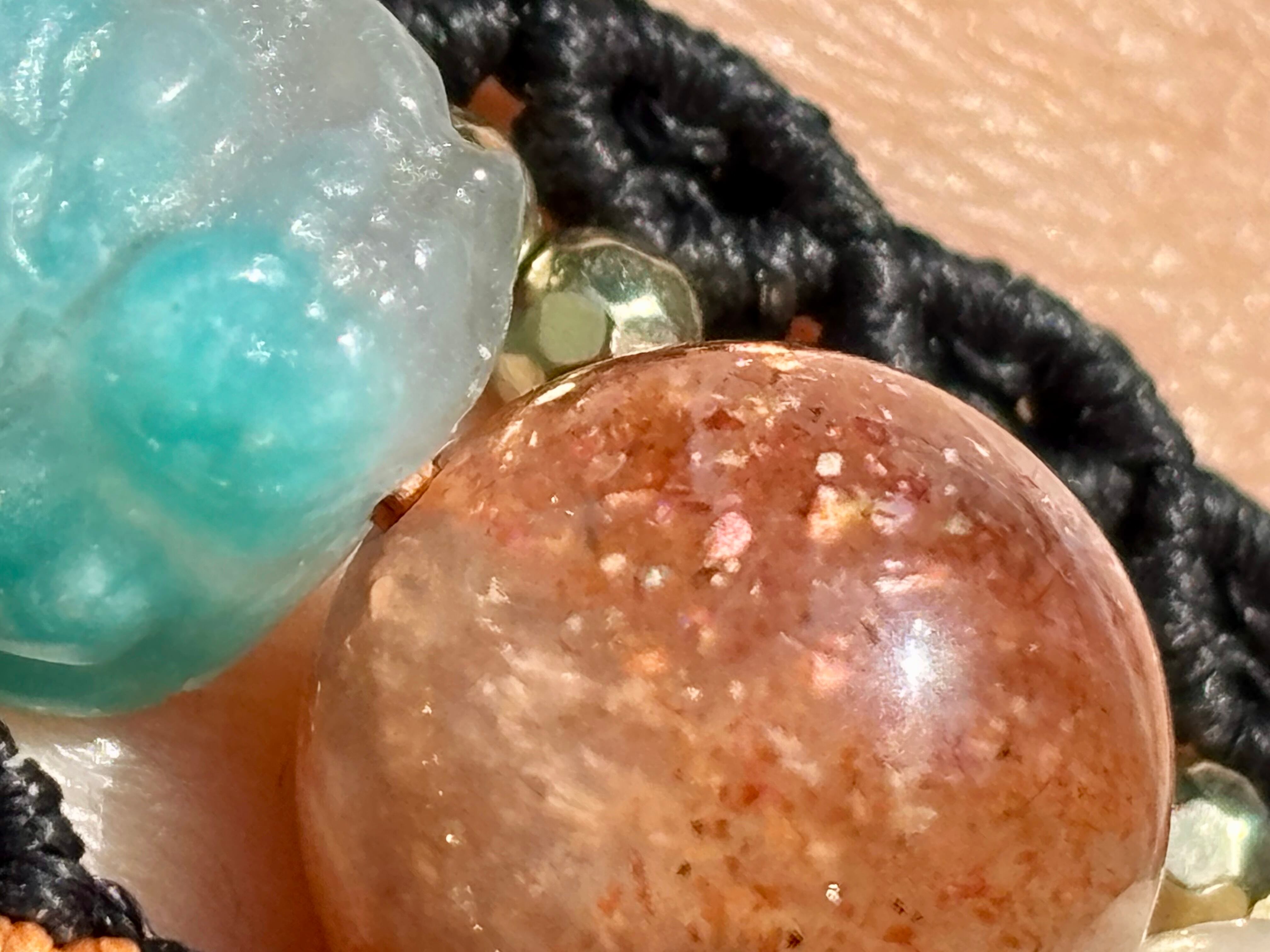 #980財運の神獣・貔貅一点物(アマゾナイトシリカ×サンストーン×菩提樹 マクラメ編みブレスレット)