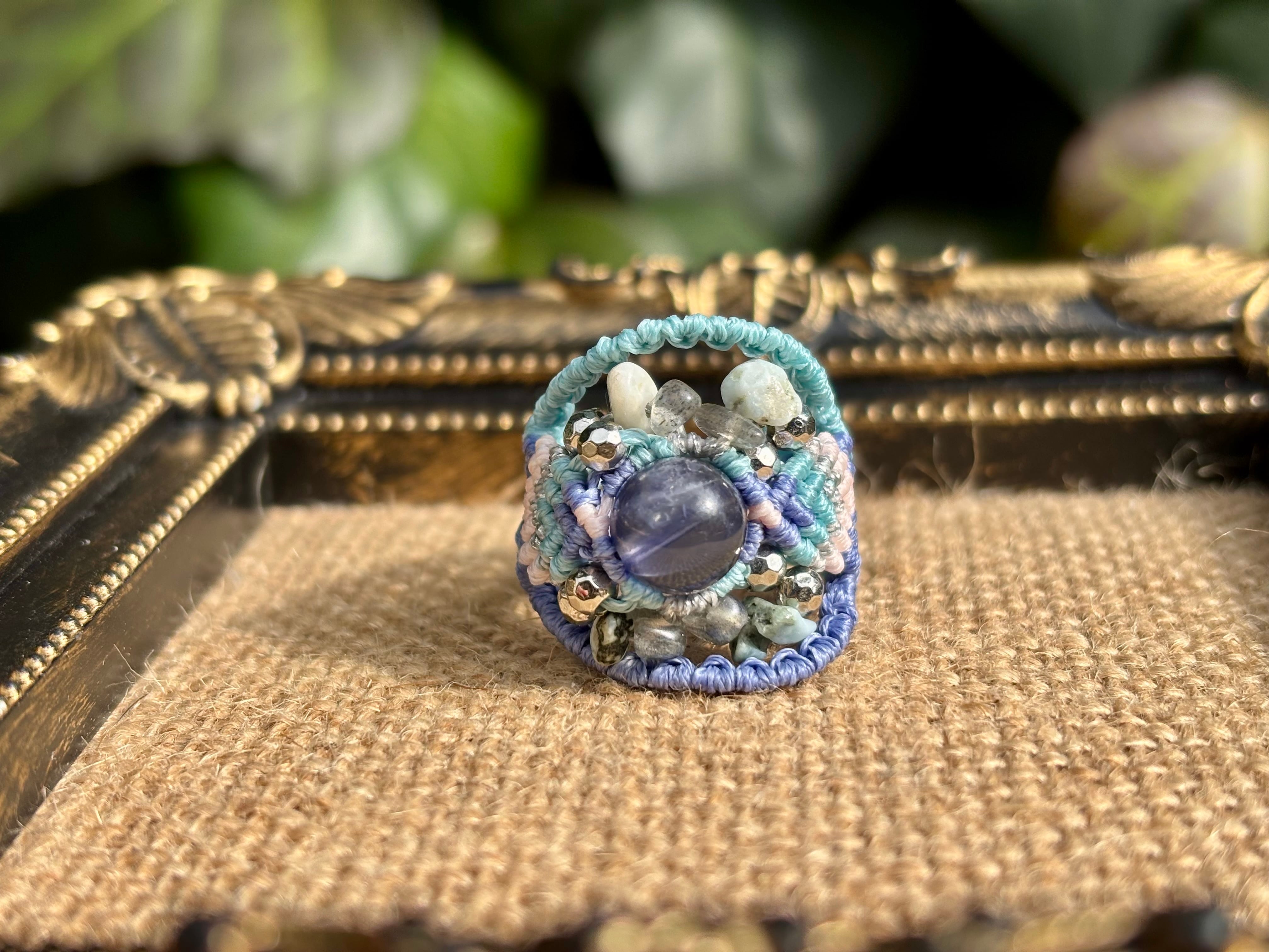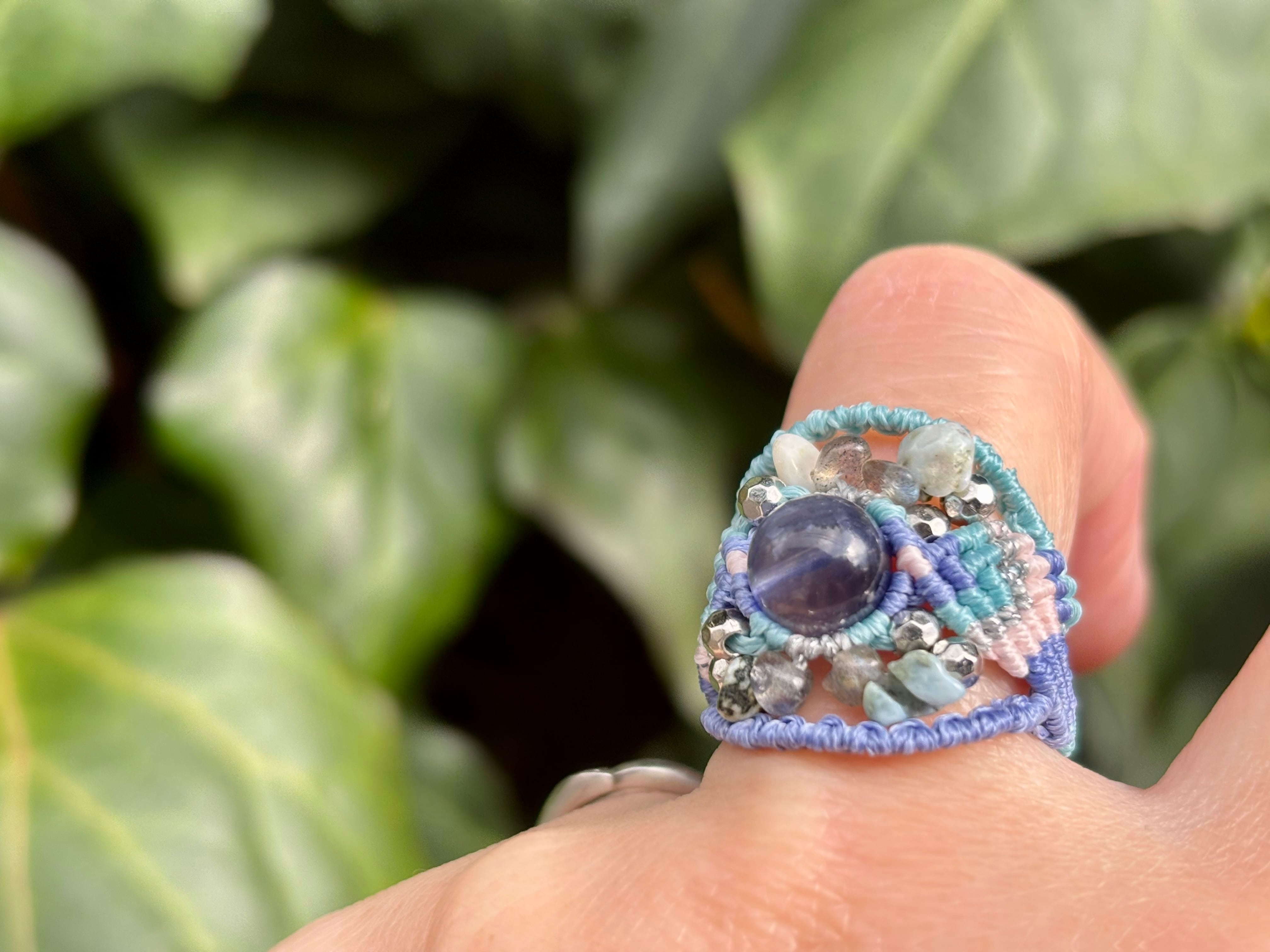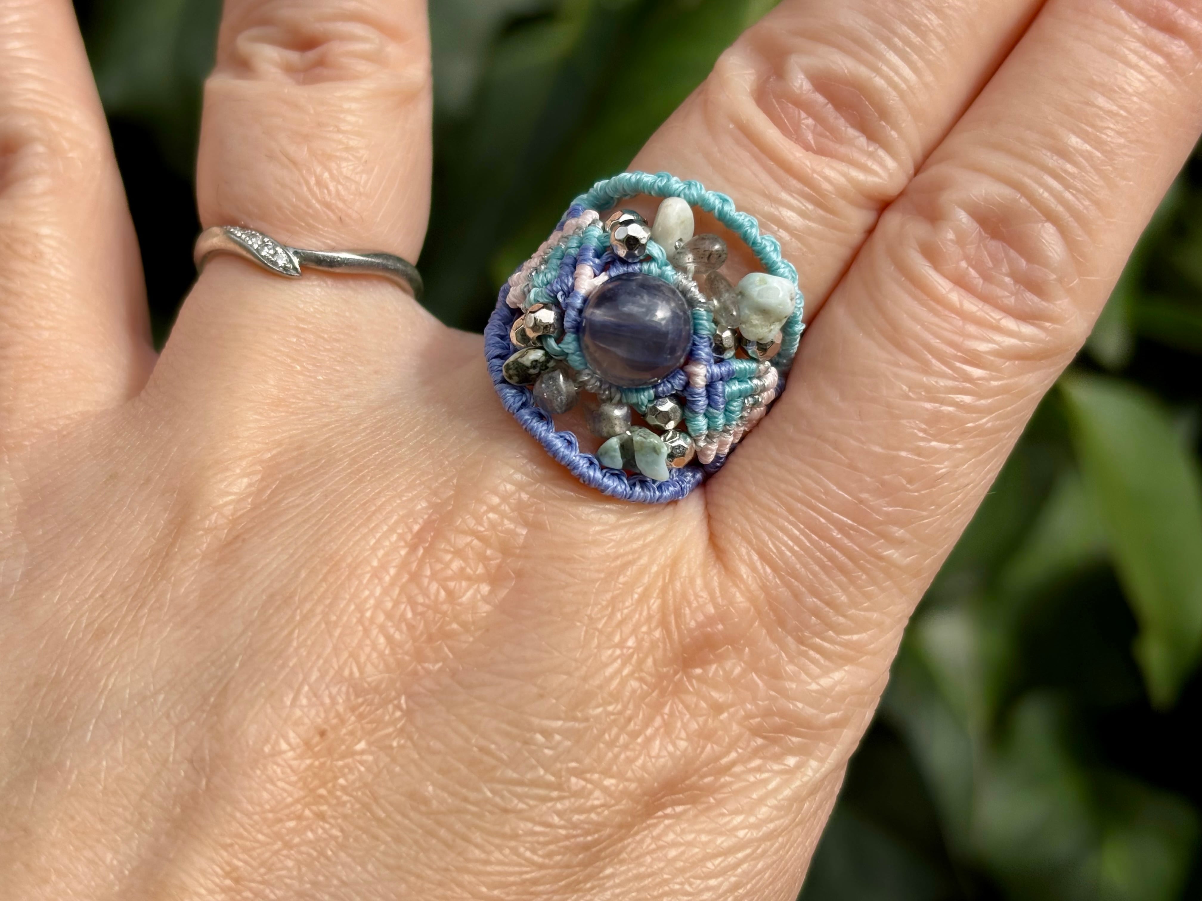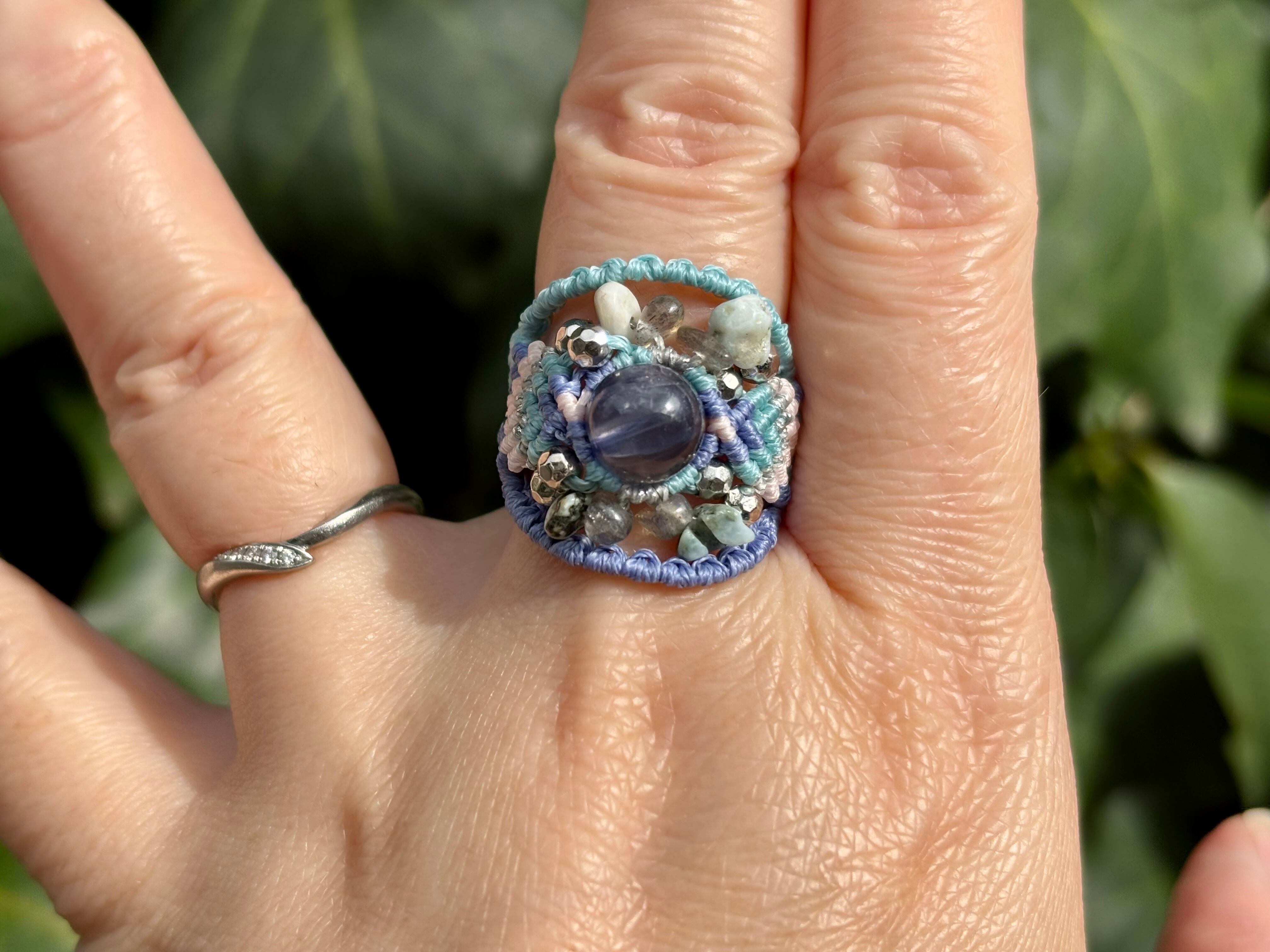 #992高評価4Aアイオライト一点物(アイオライト×ラブラドライト×ラリマー マクラメ編みリング/指輪)