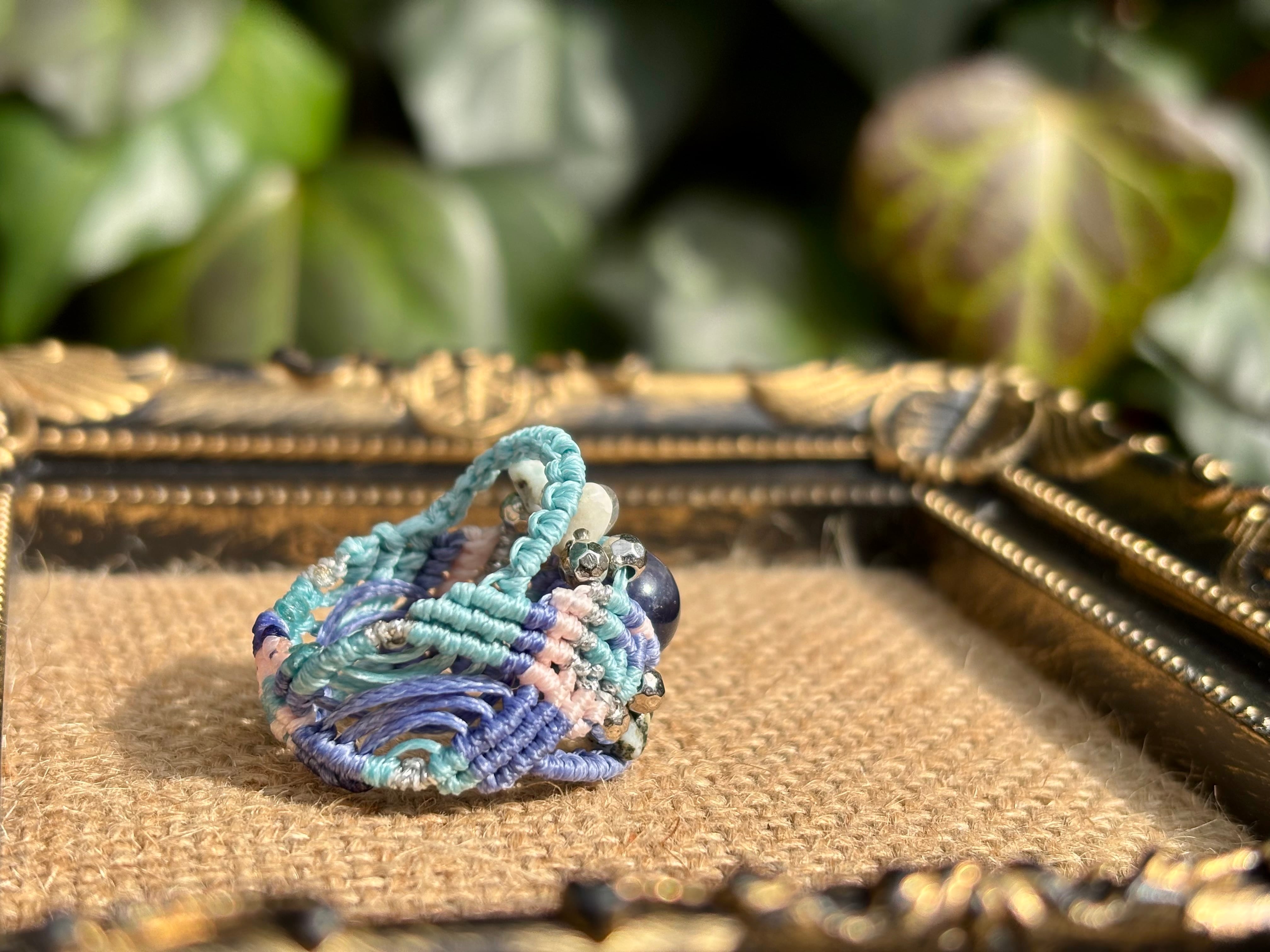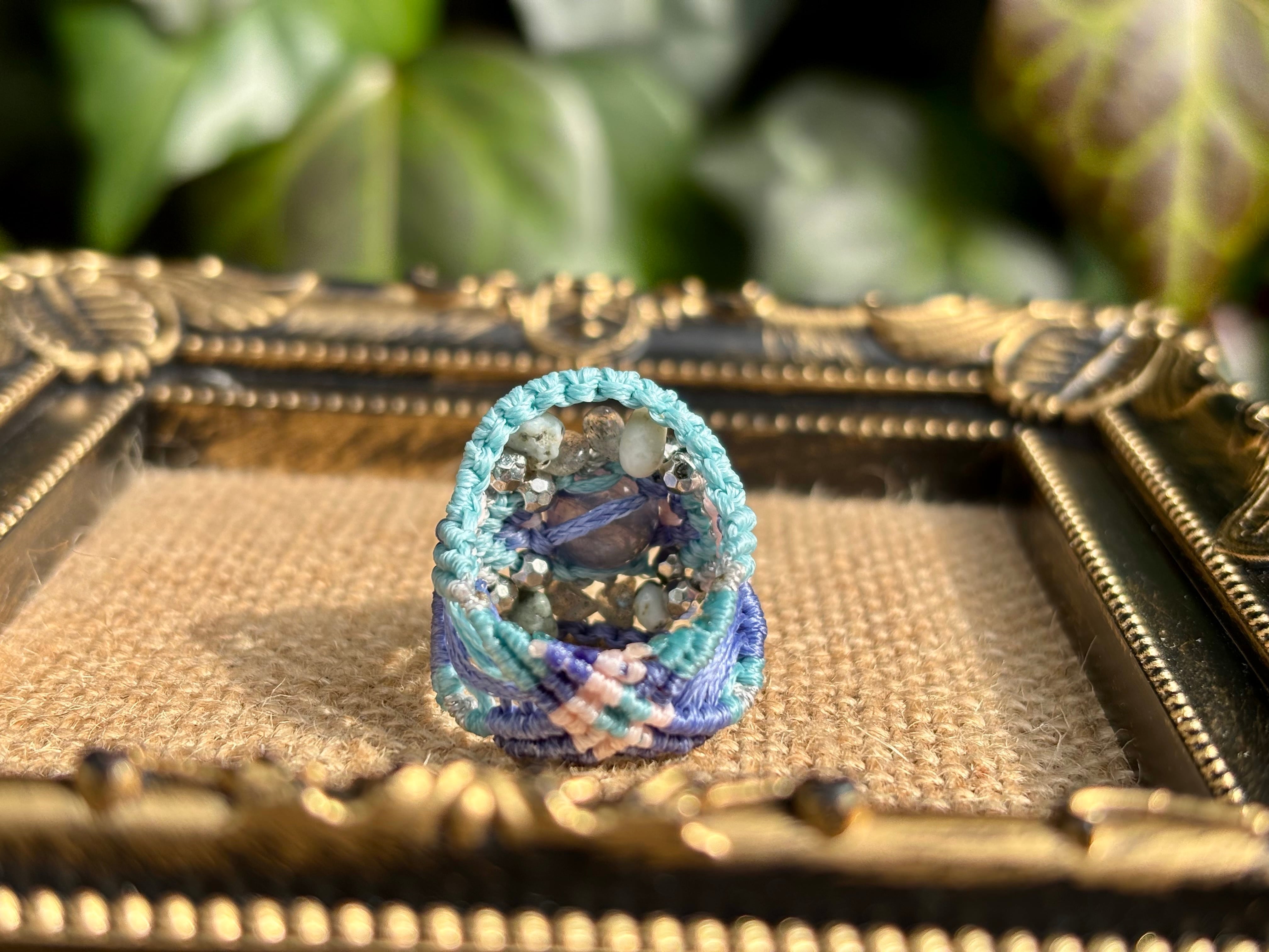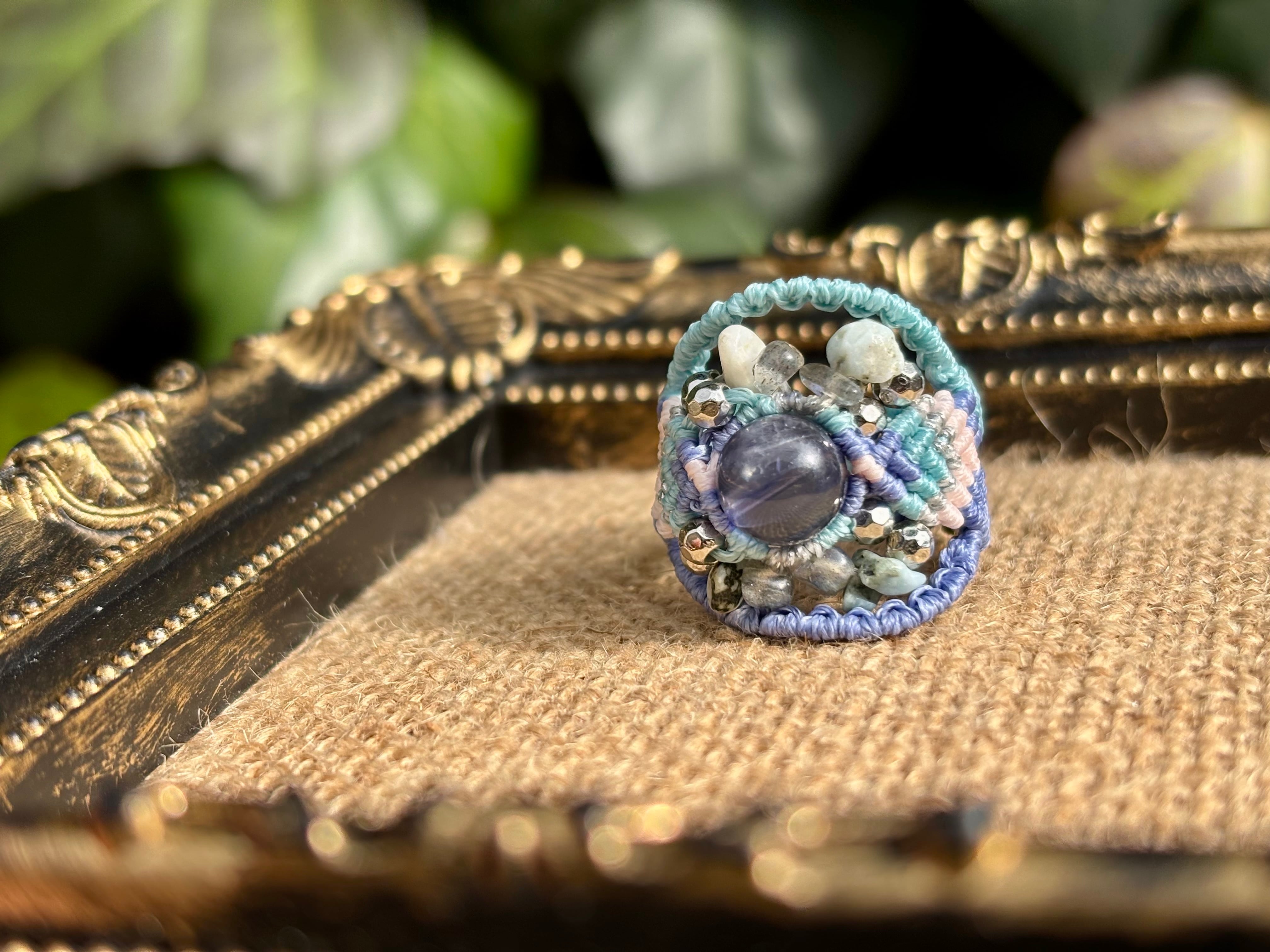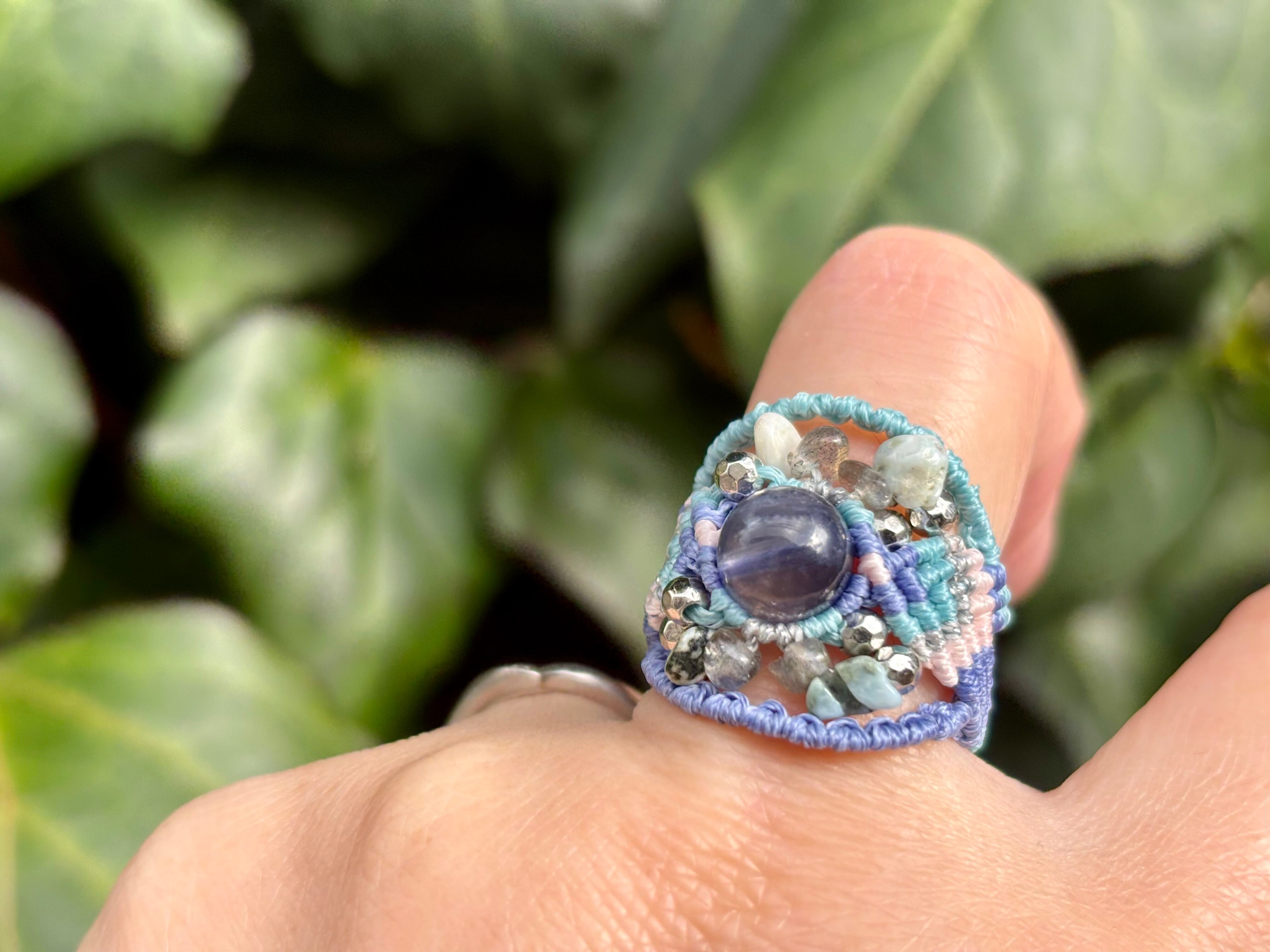 #992高評価4Aアイオライト一点物(アイオライト×ラブラドライト×ラリマー マクラメ編みリング/指輪)