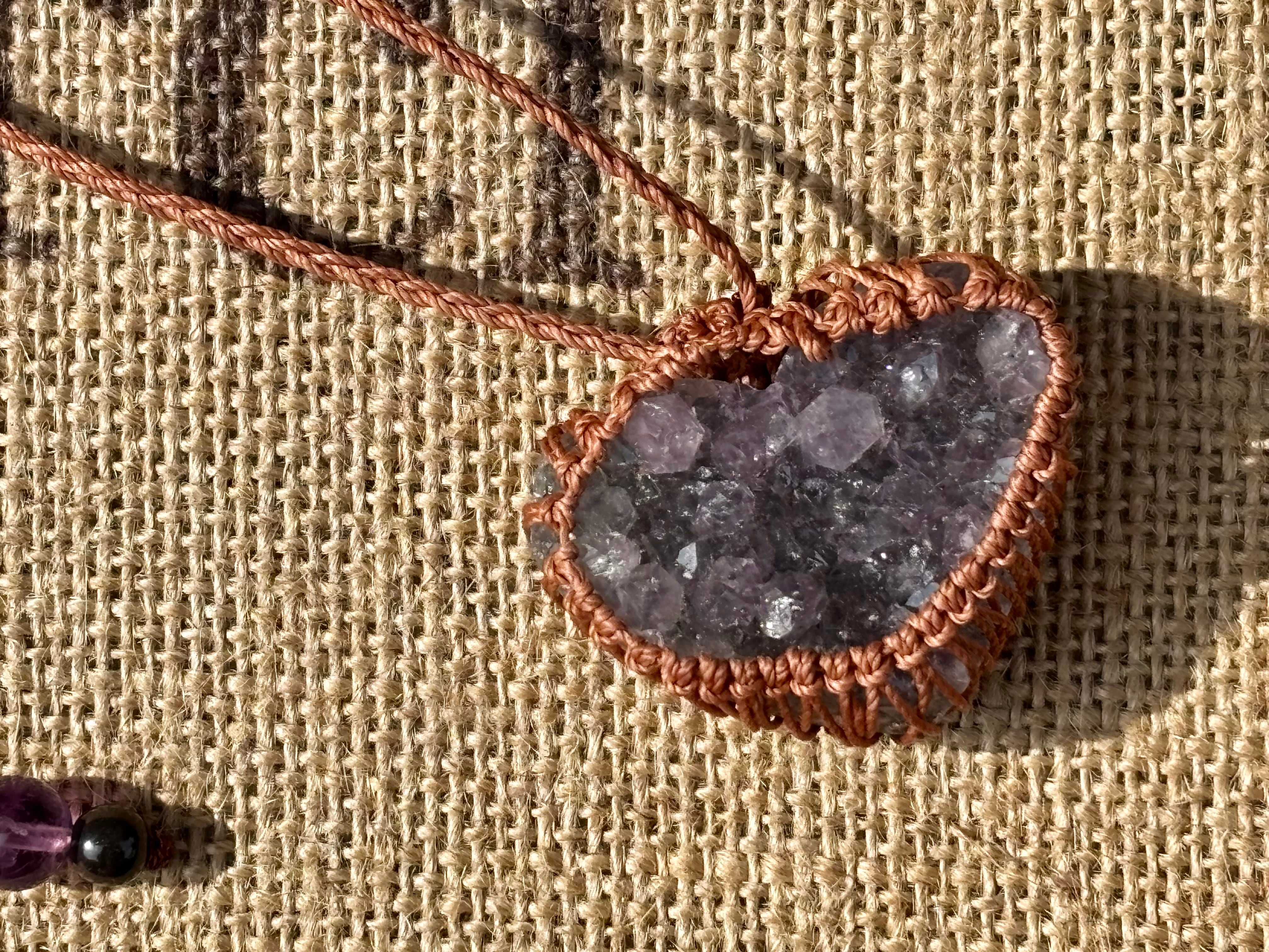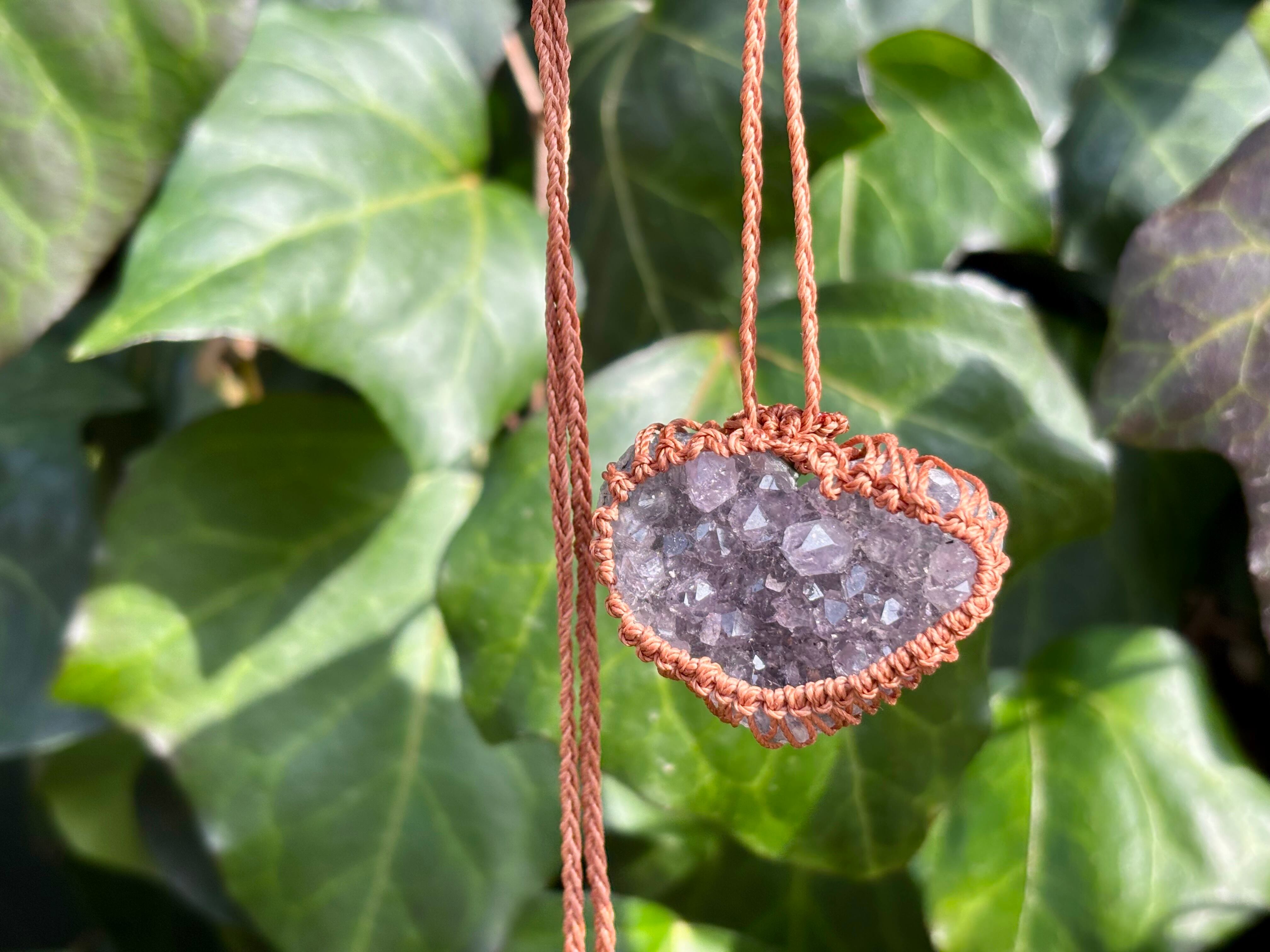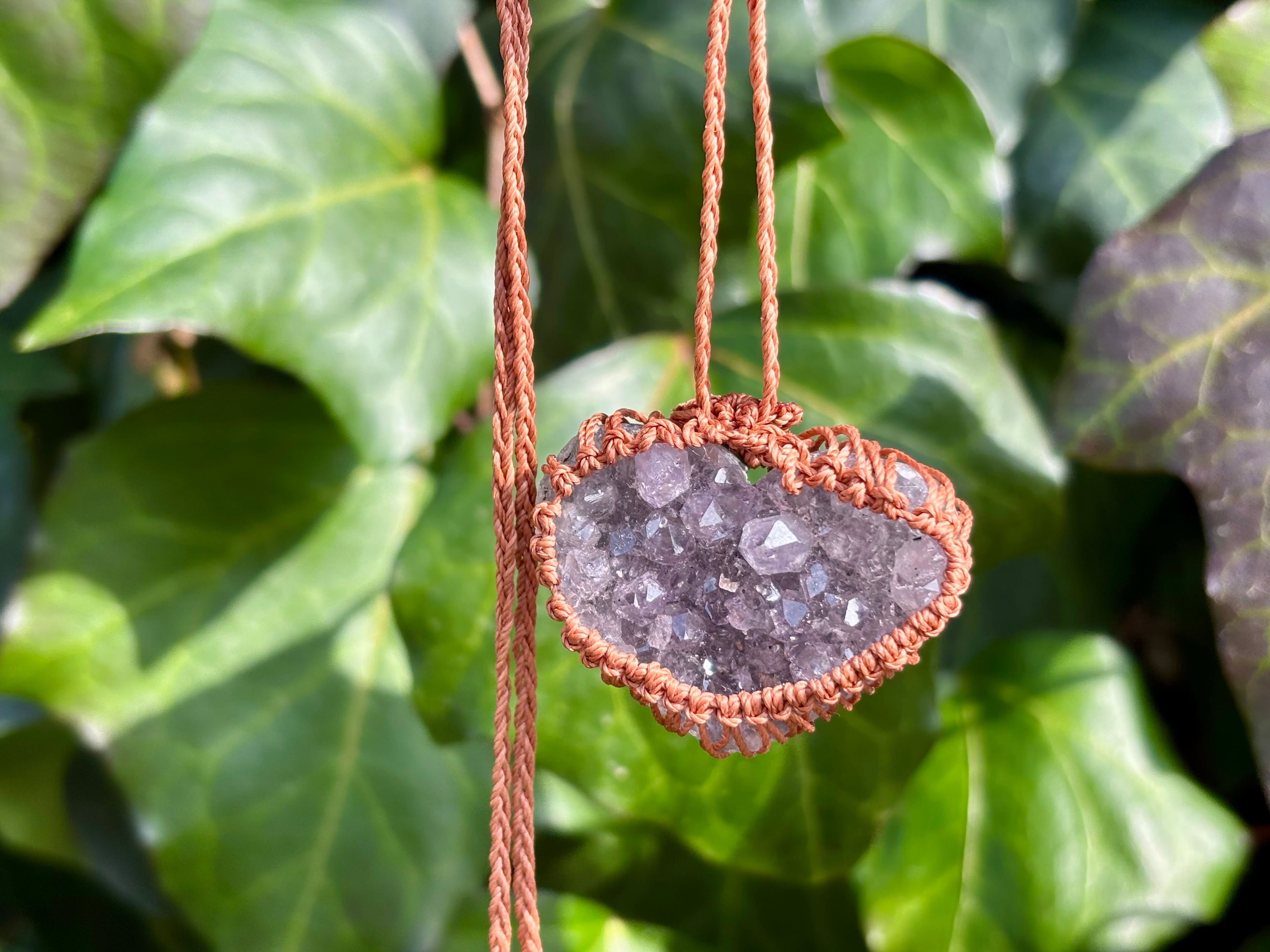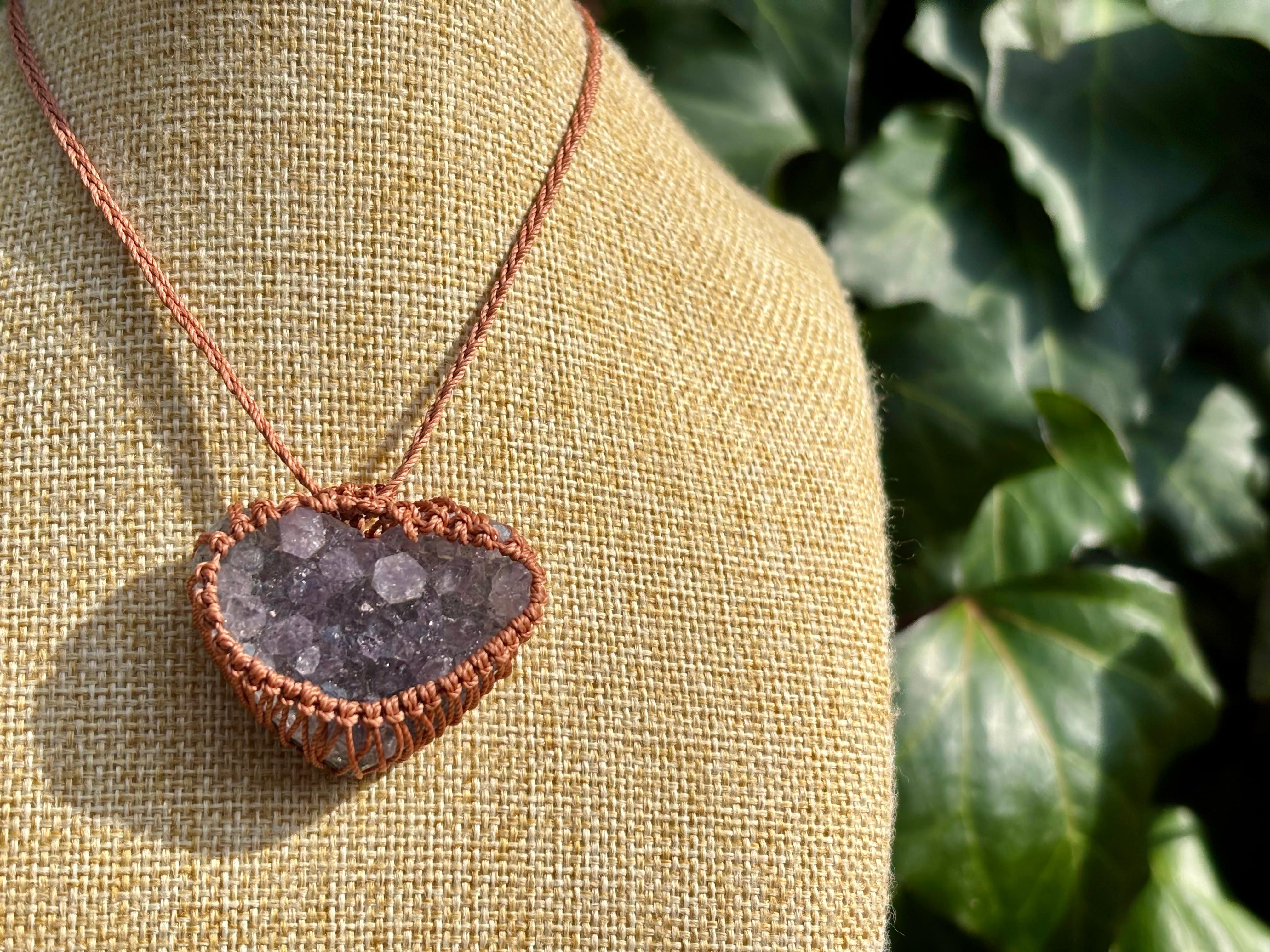 そんなアメジストドゥルージーをハート型にカットし、マクラメ編みでお作りしましたネックレス。