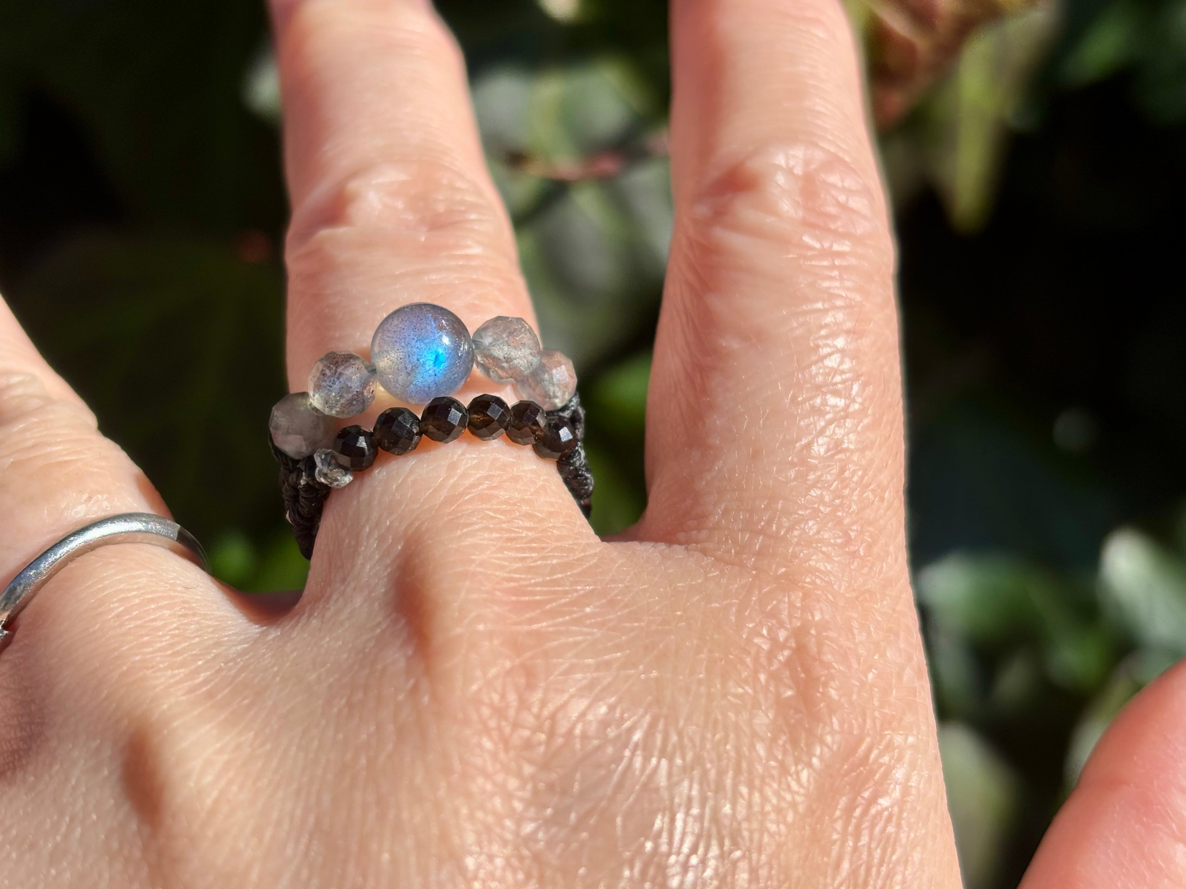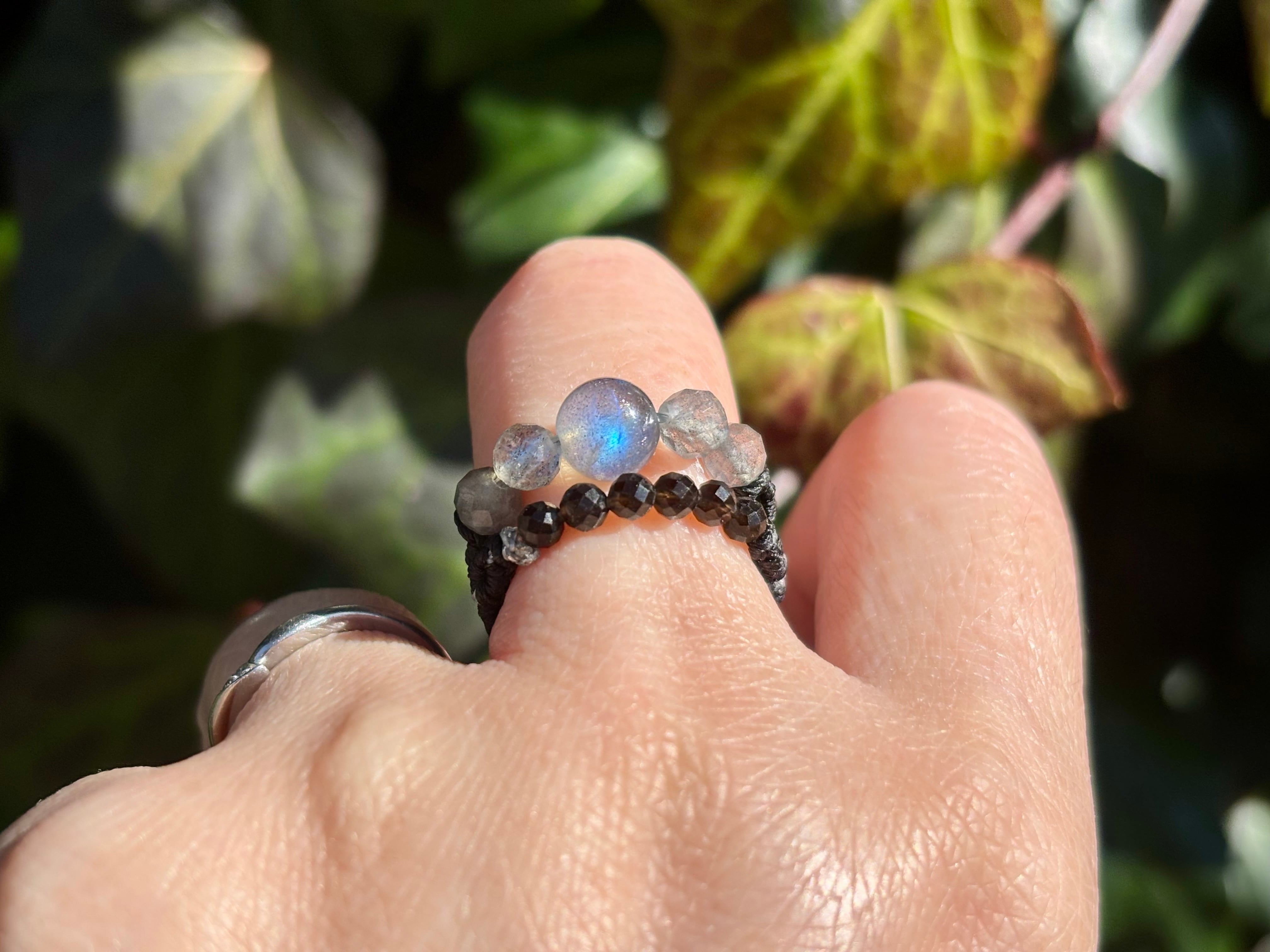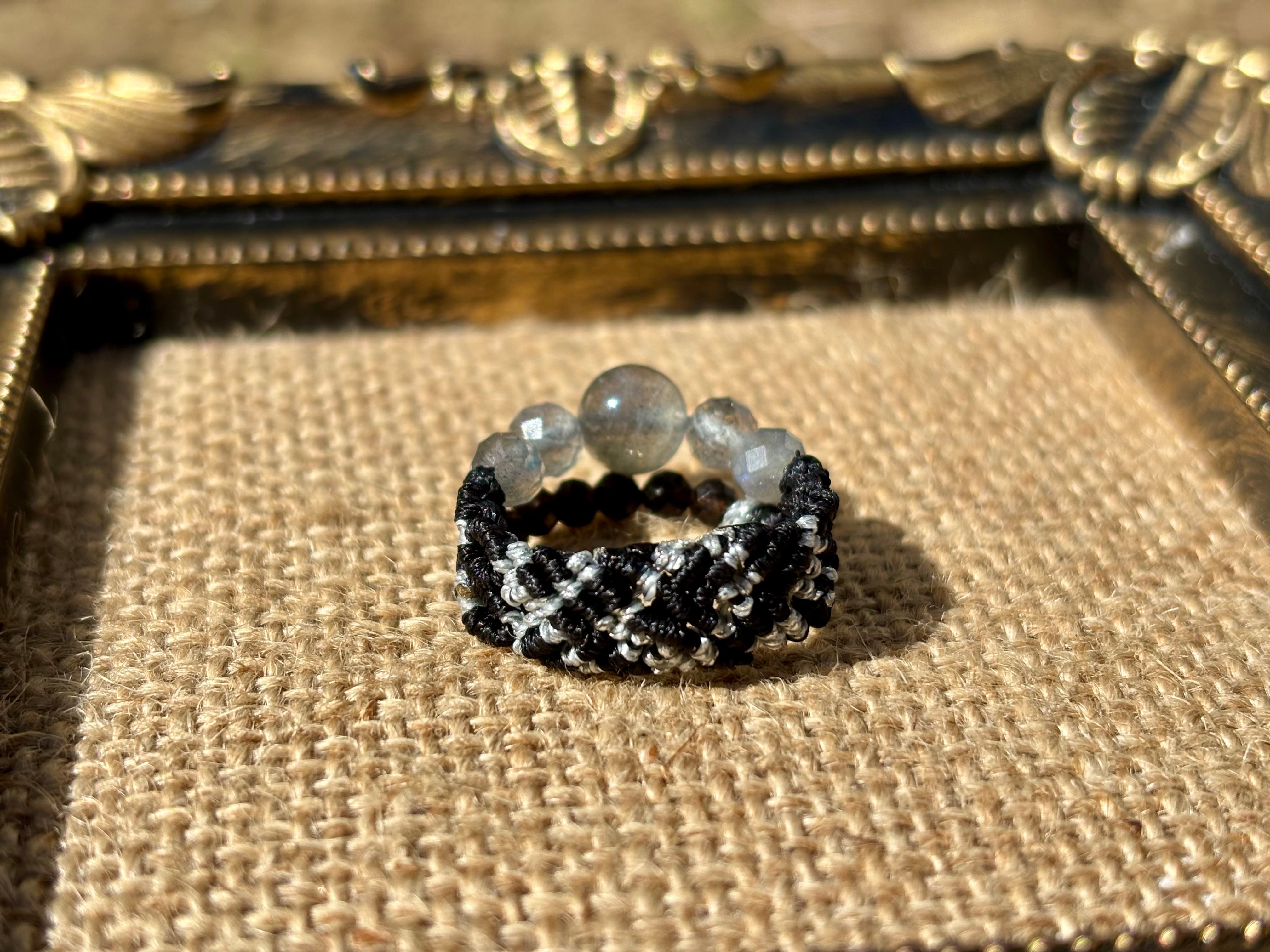 #1002高品質ラブラドライト一点物(ラブラドライト×モリオン黒水晶 マクラメ編み二連リング/指輪)