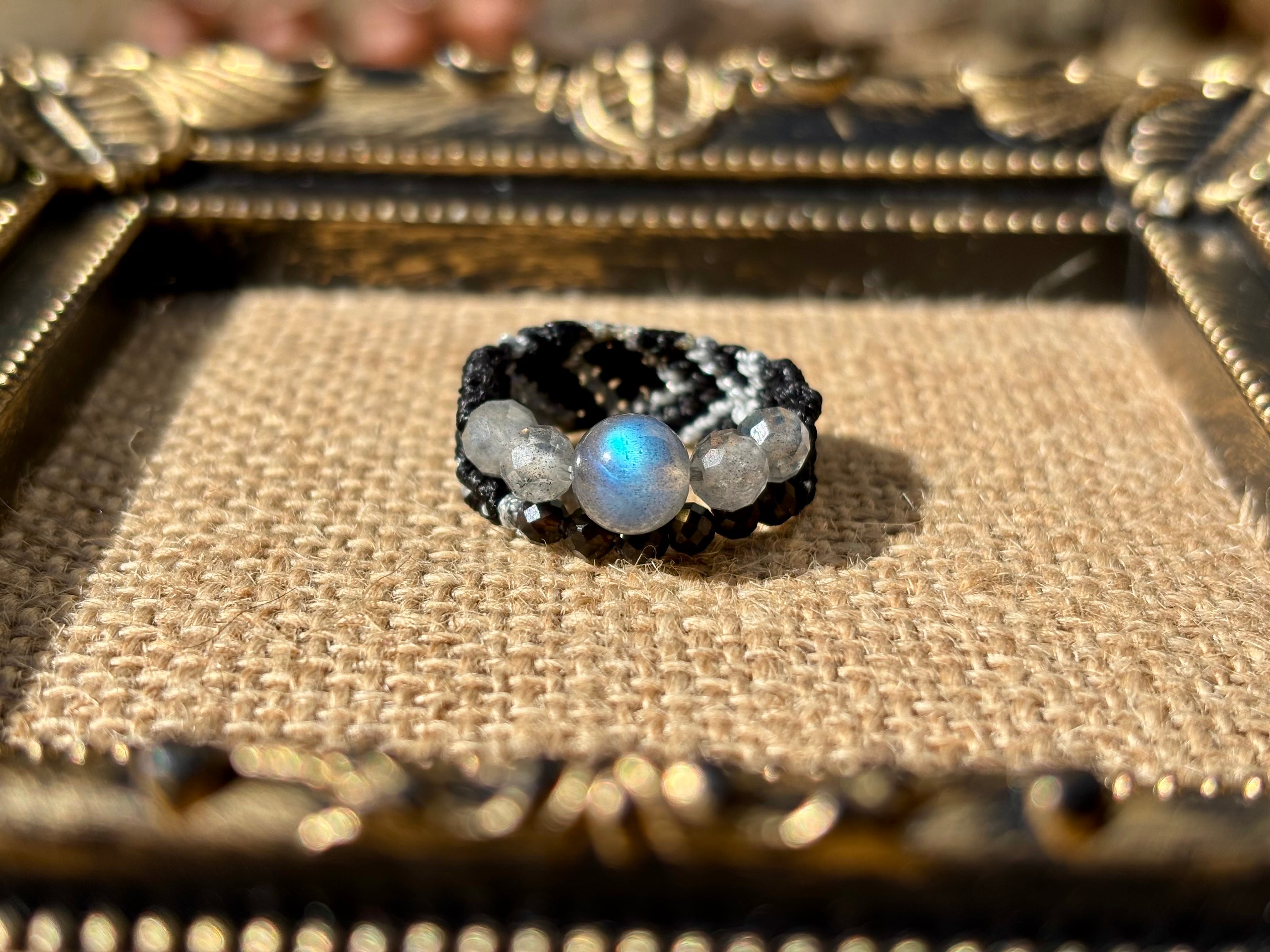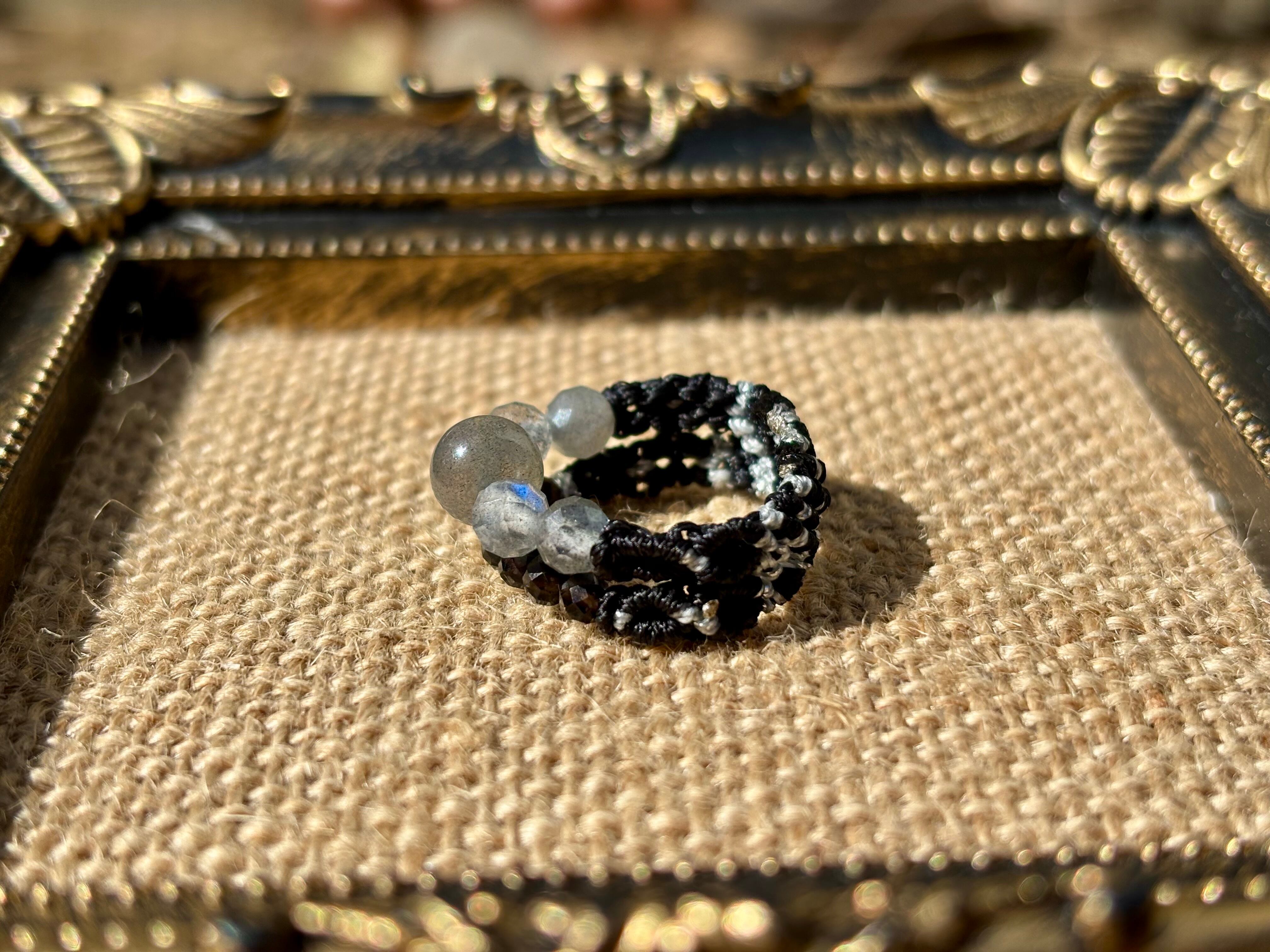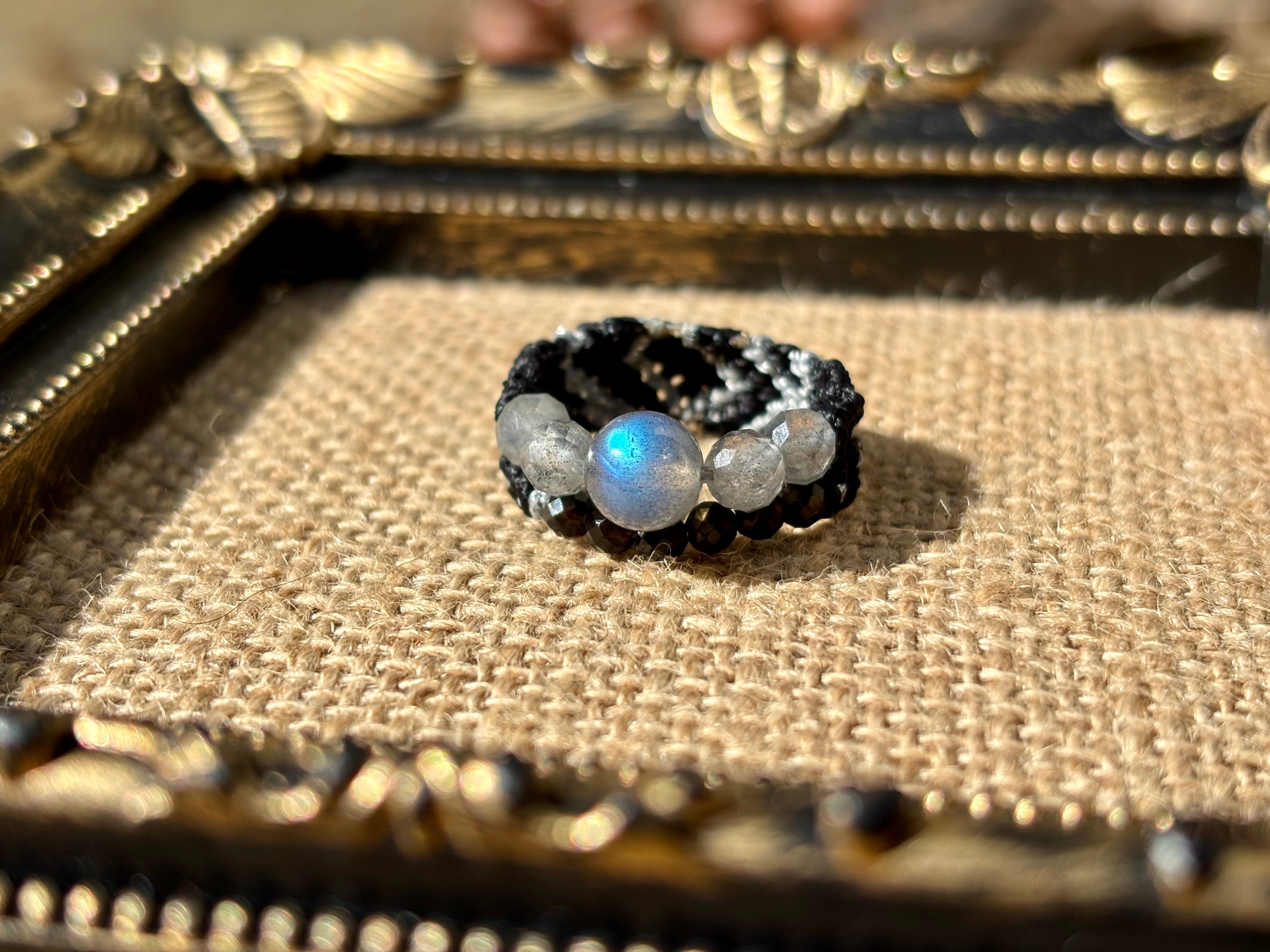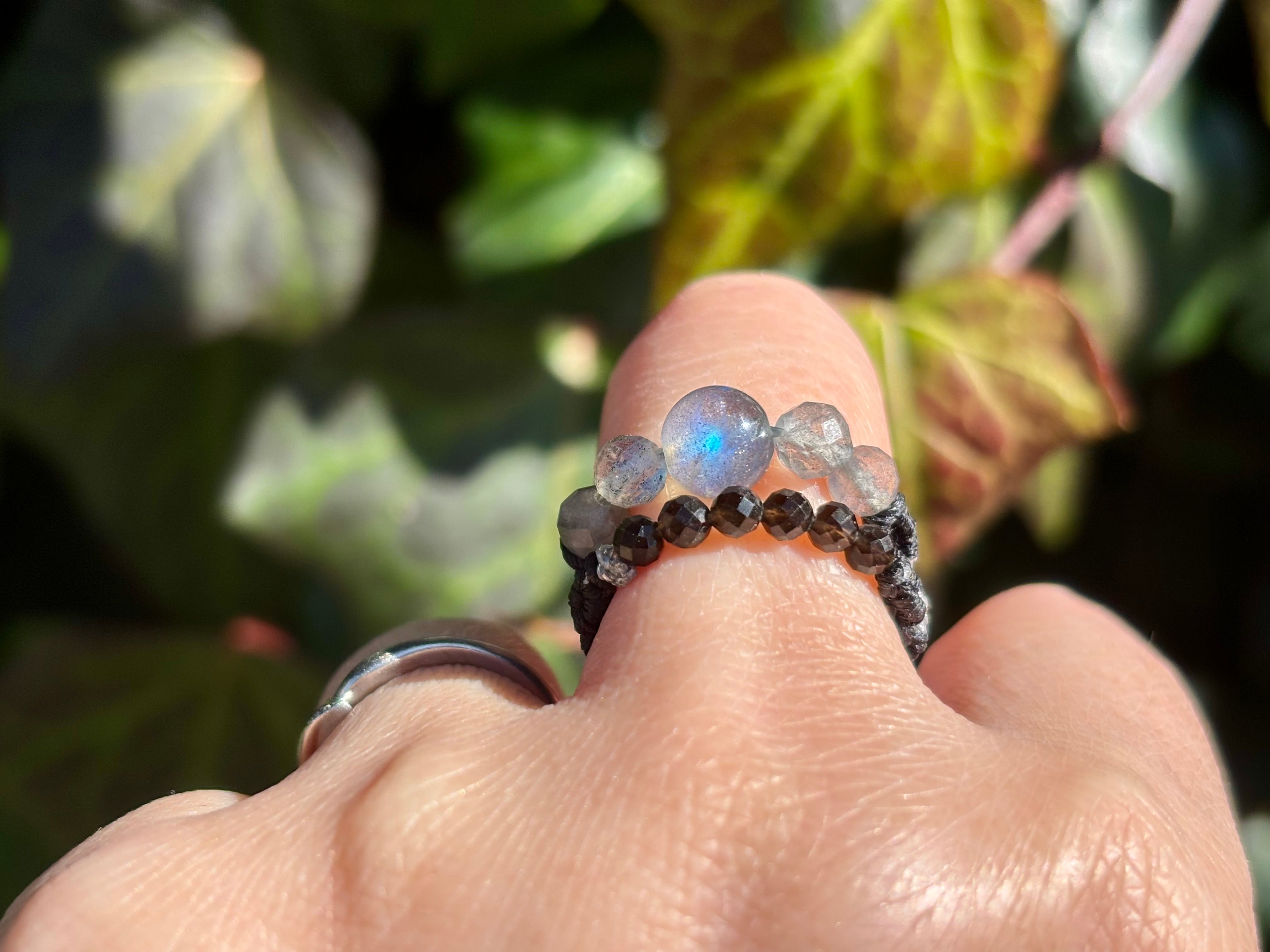 #1002高品質ラブラドライト一点物(ラブラドライト×モリオン黒水晶 マクラメ編み二連リング/指輪)