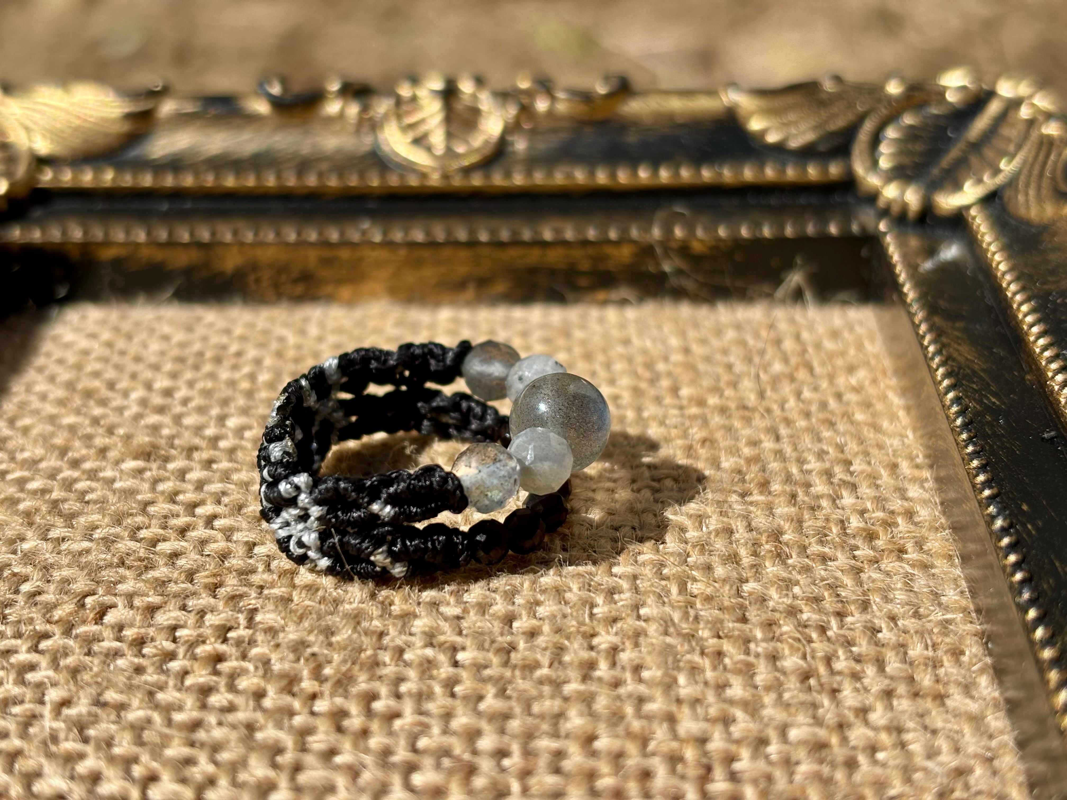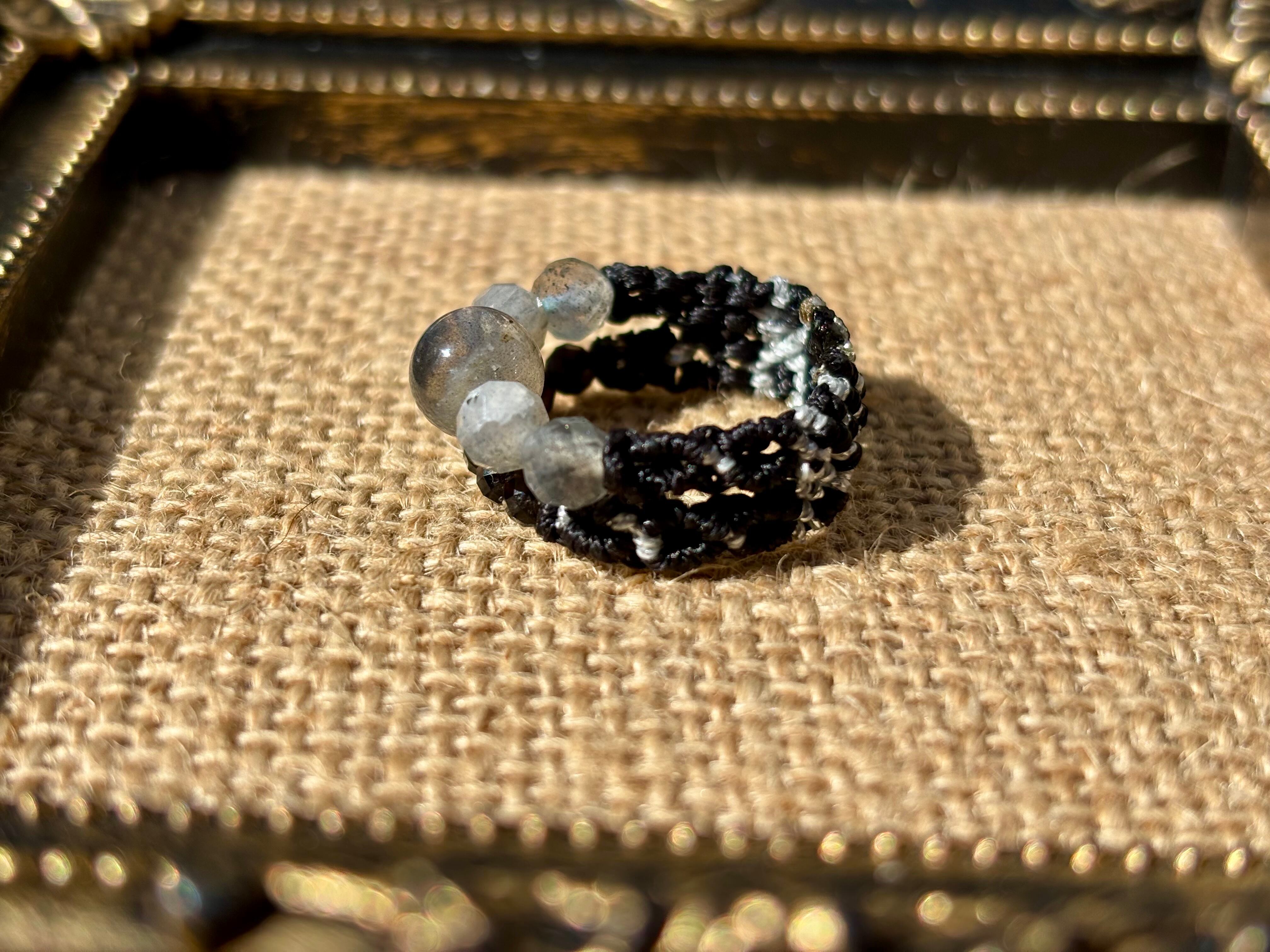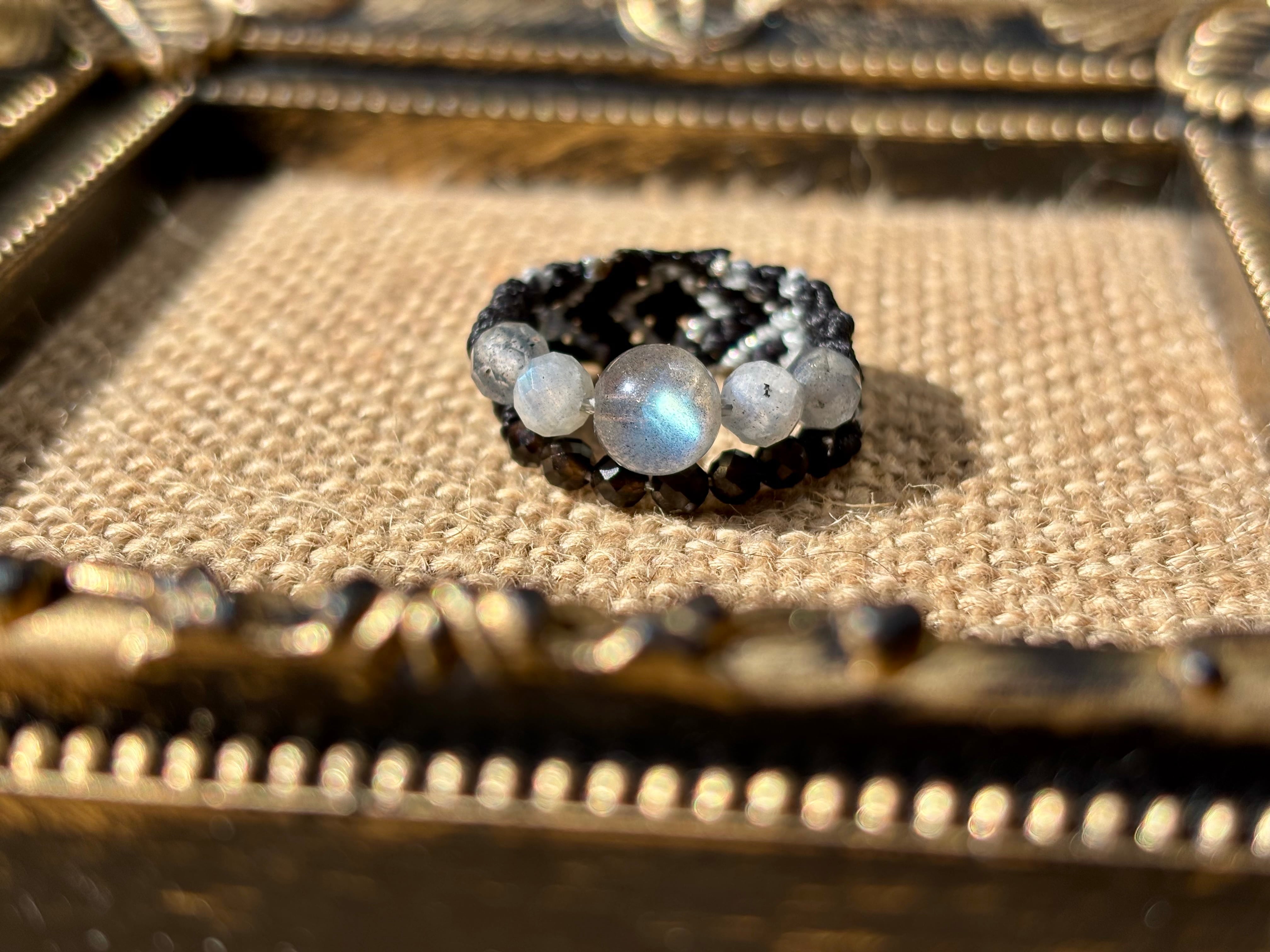 #1003高品質ラブラドライト一点物(ラブラドライト×モリオン黒水晶 マクラメ編み二連リング/指輪)
