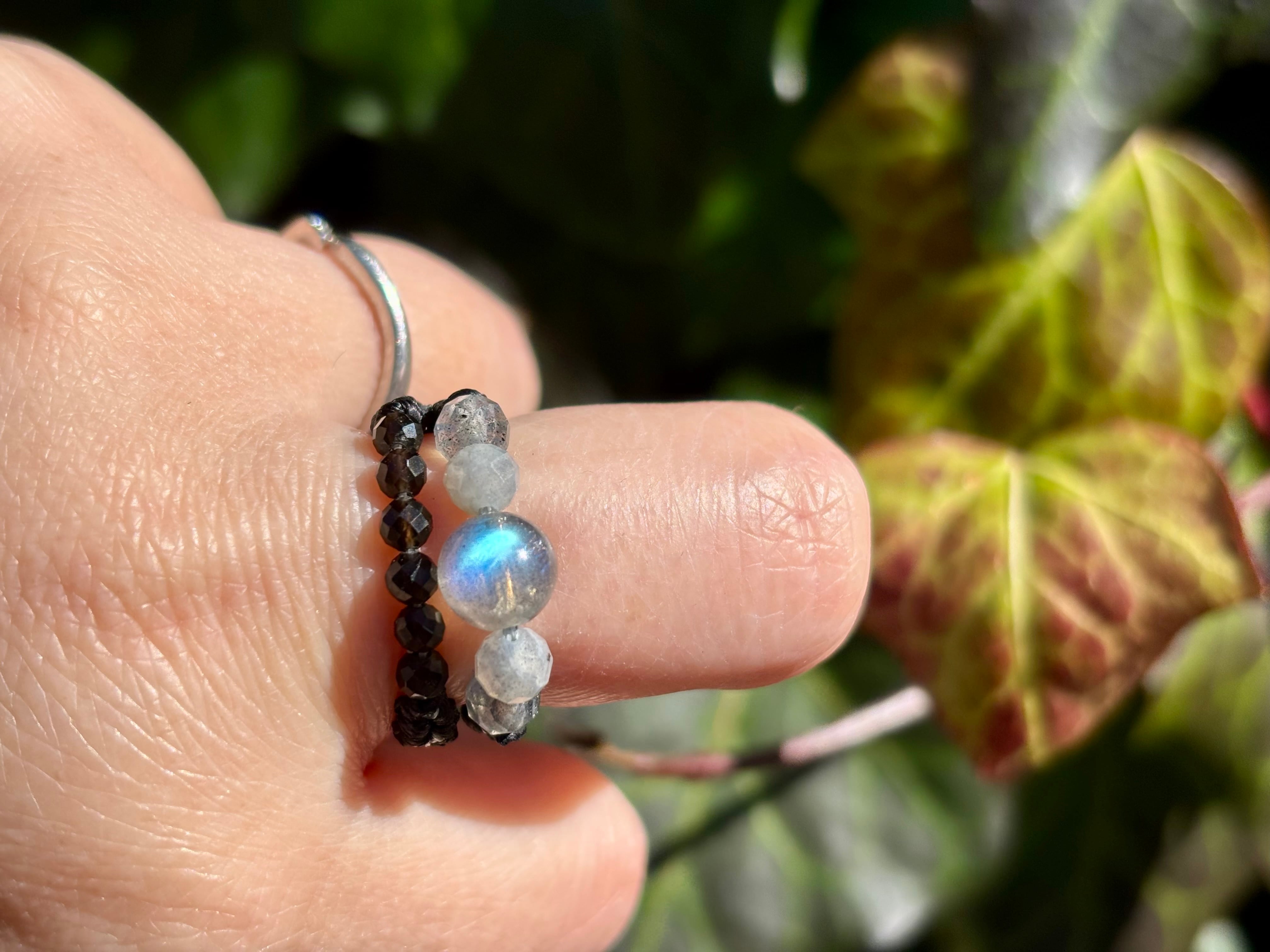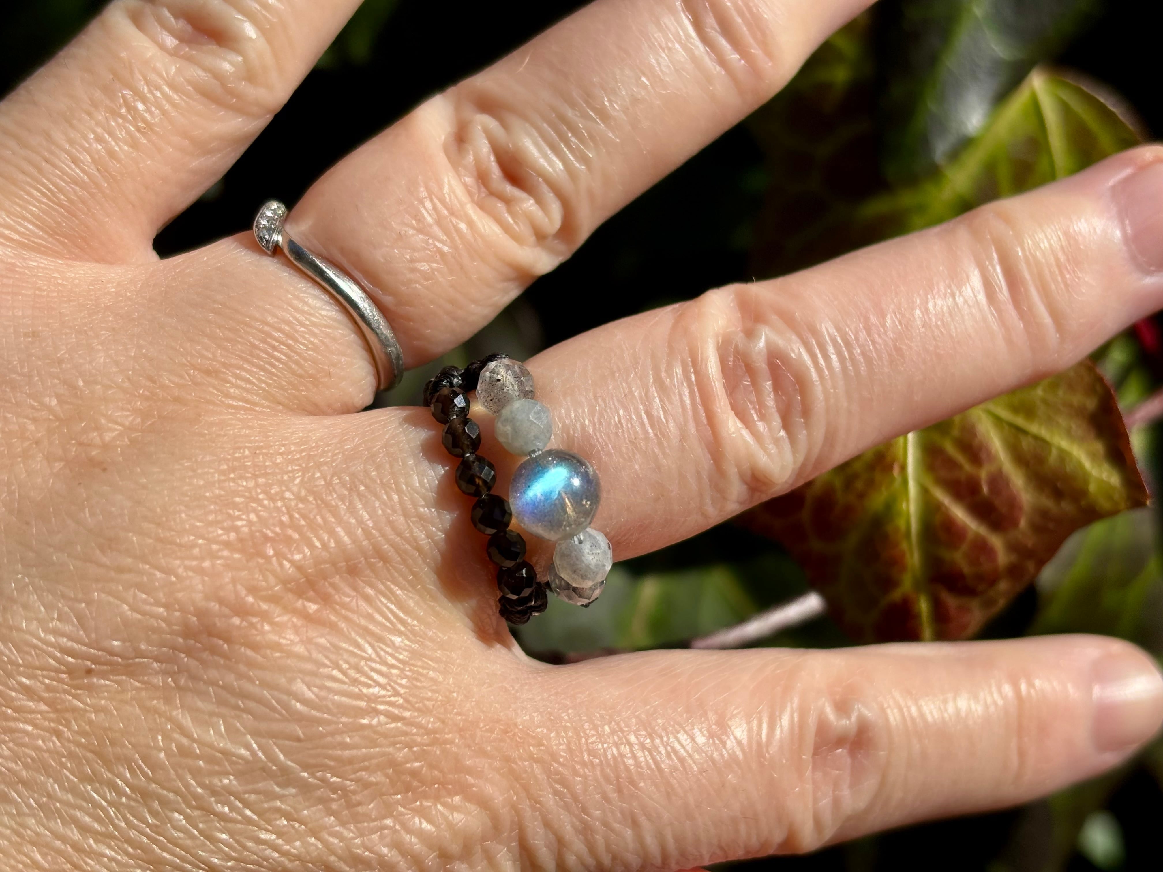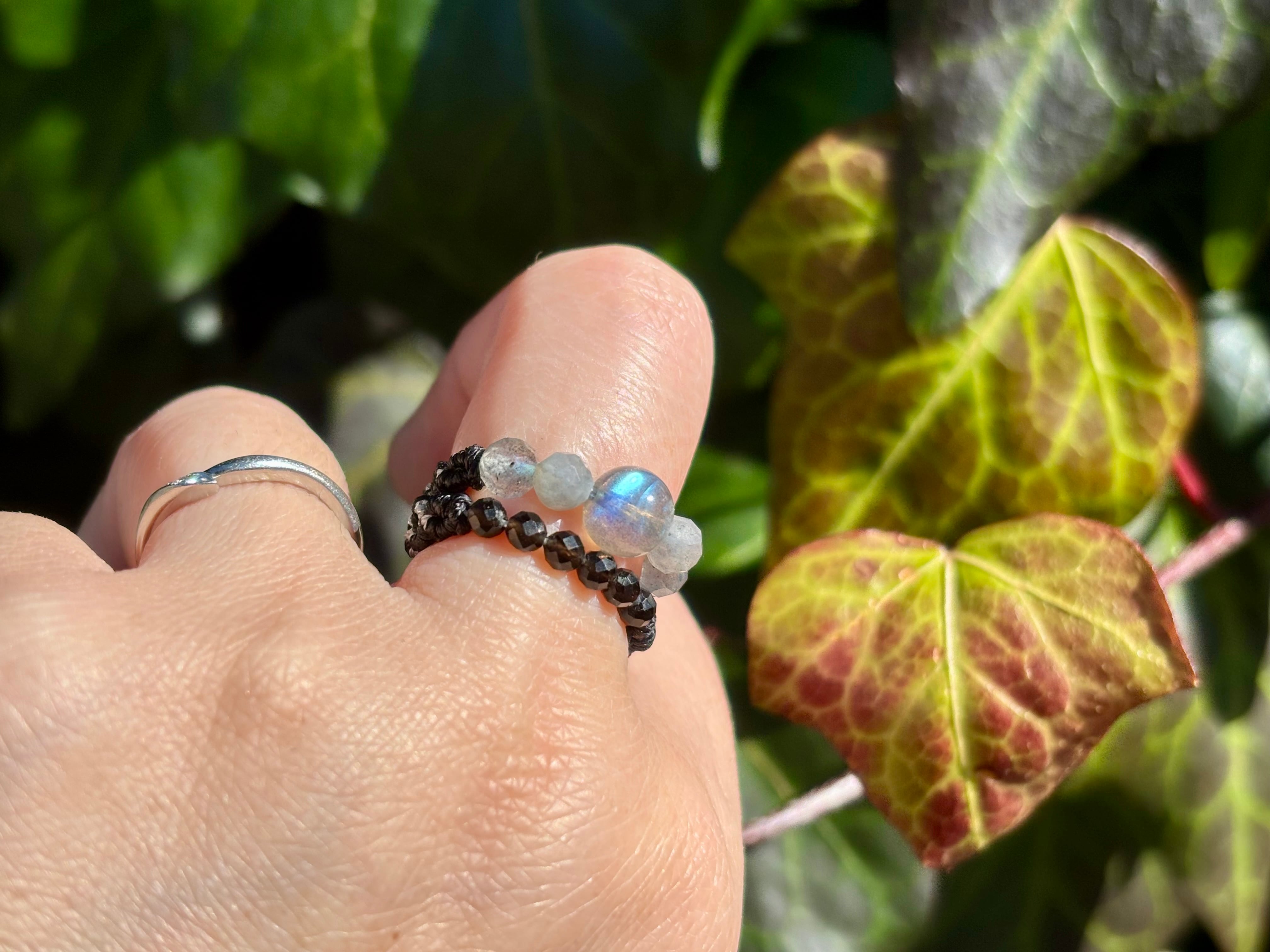 #1003高品質ラブラドライト一点物(ラブラドライト×モリオン黒水晶 マクラメ編み二連リング/指輪)
