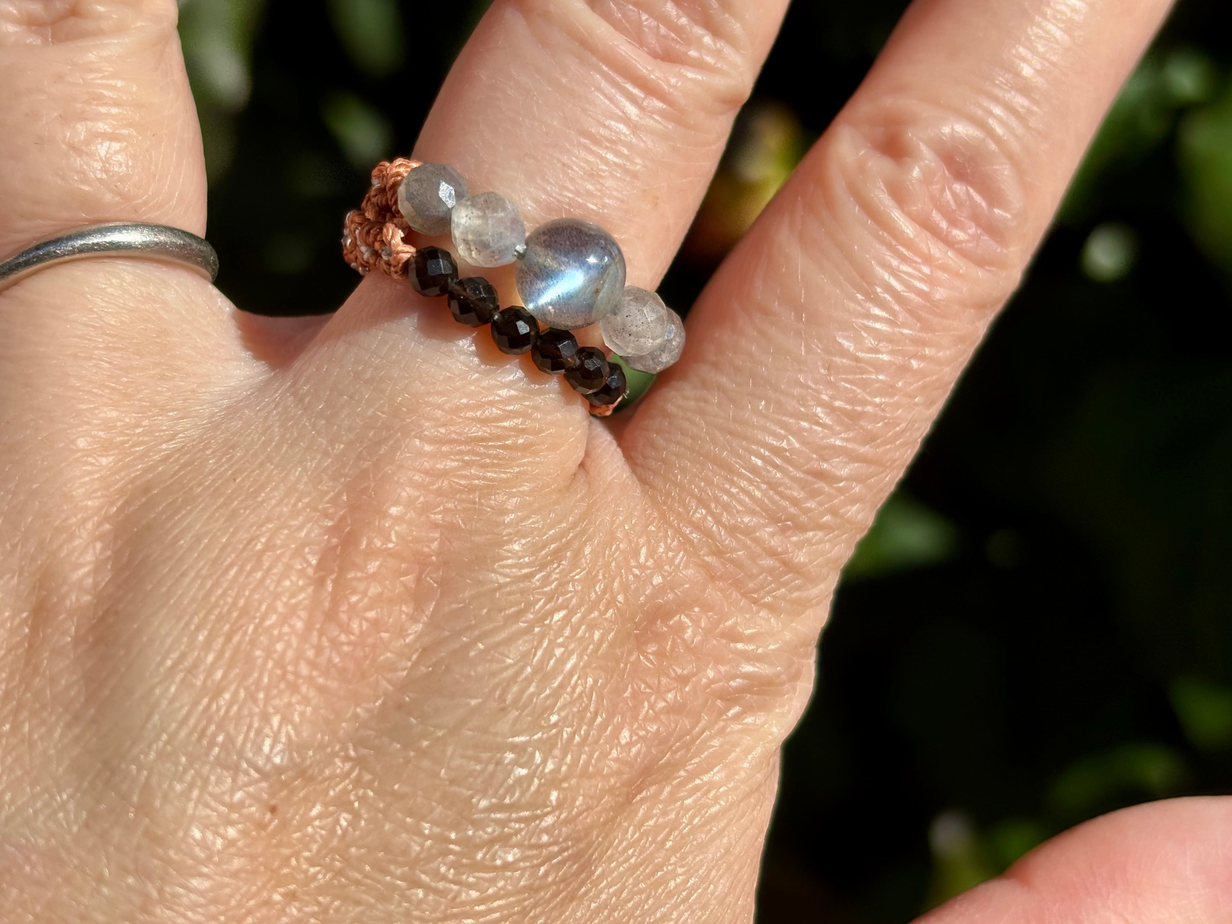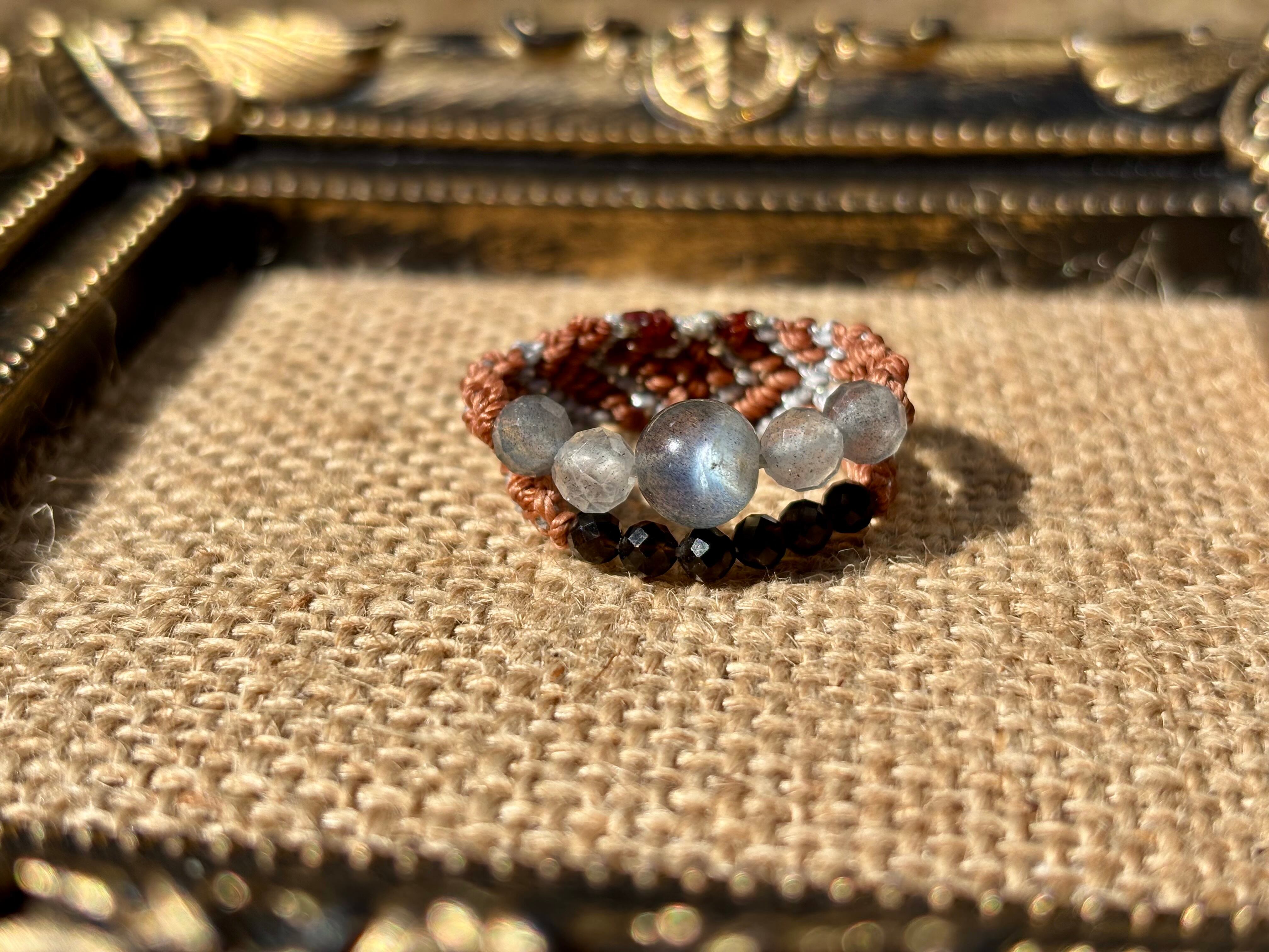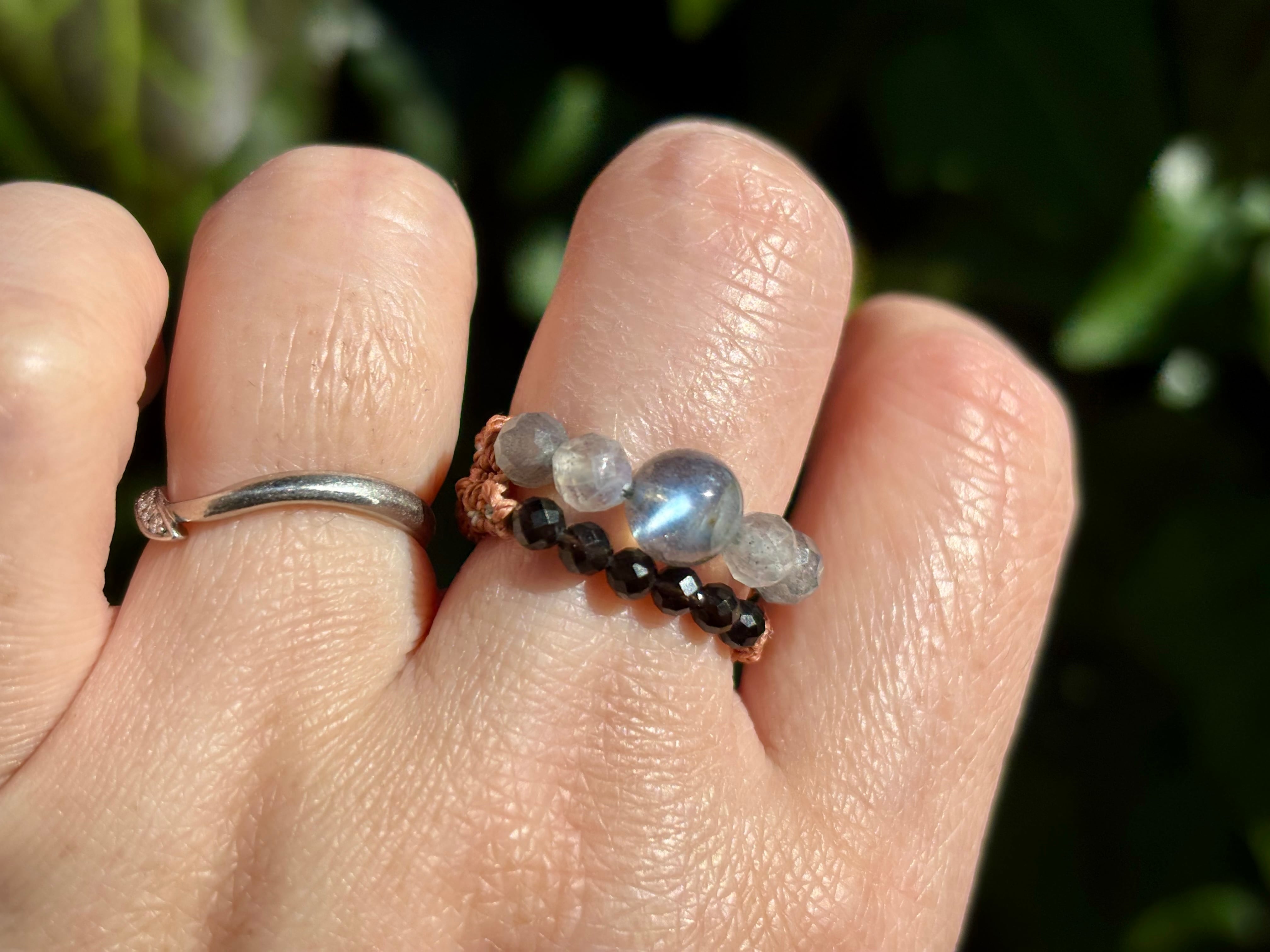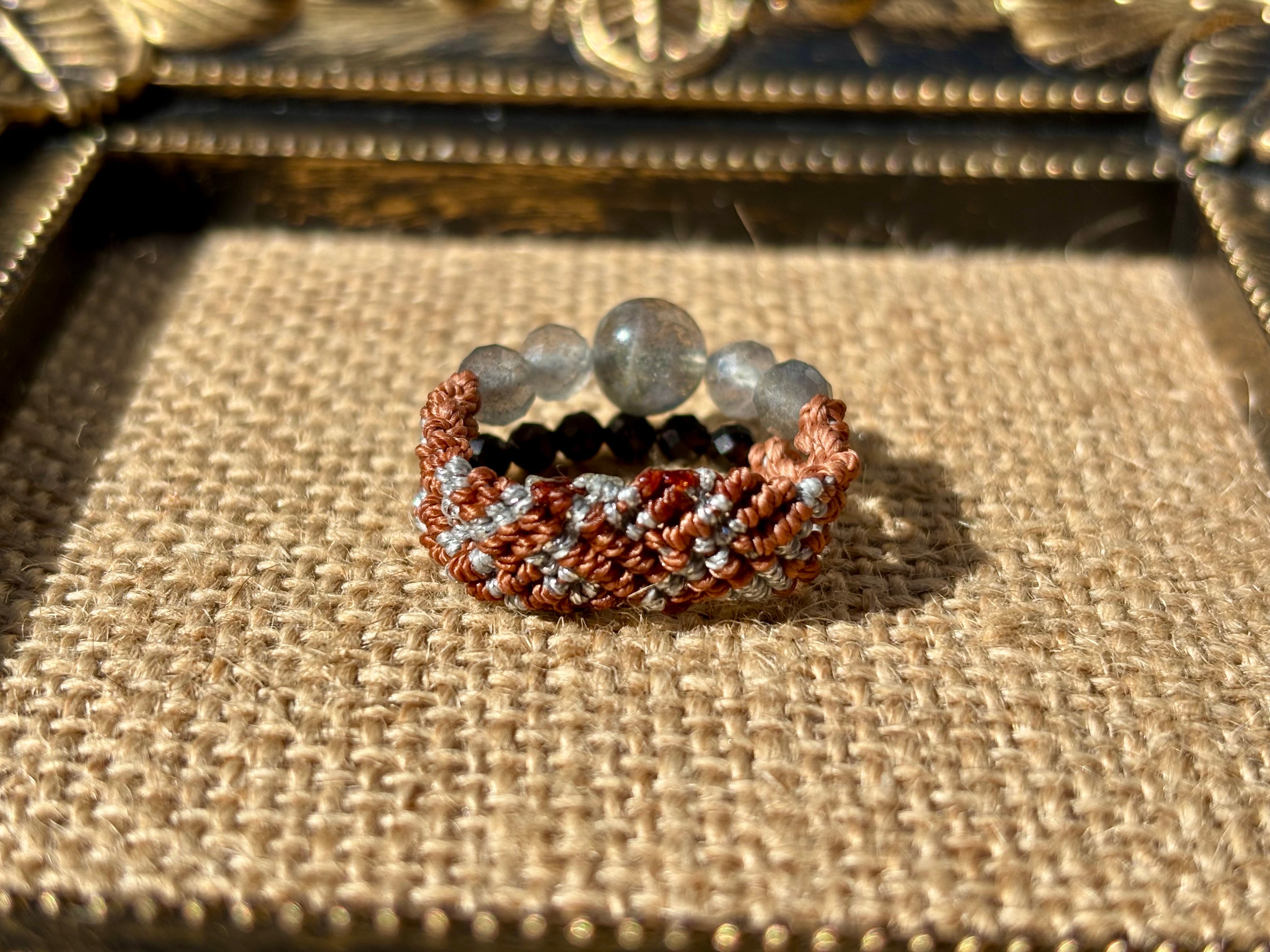 #1005高品質ラブラドライト一点物(ラブラドライト×モリオン黒水晶 マクラメ編み二連リング/指輪)