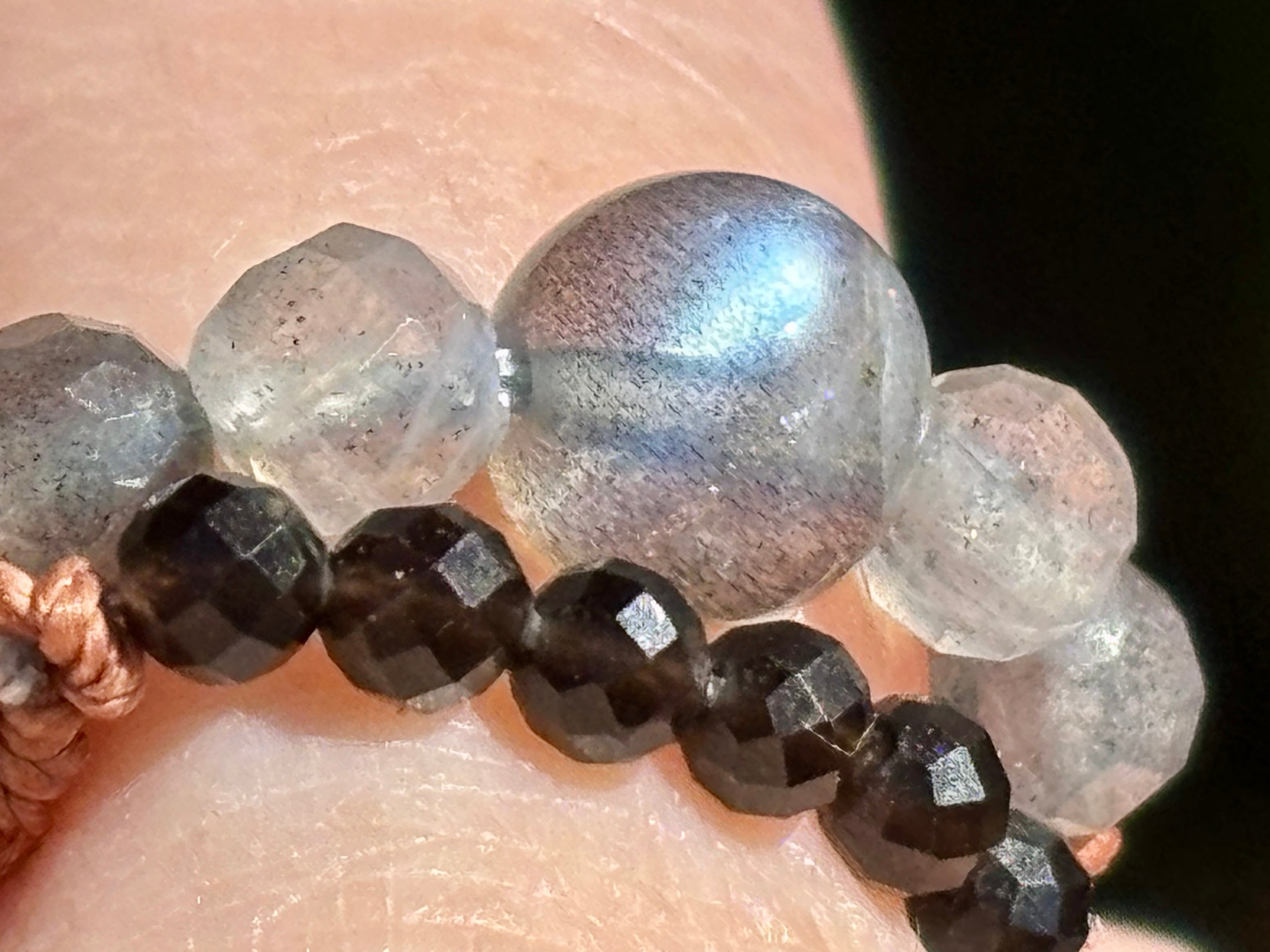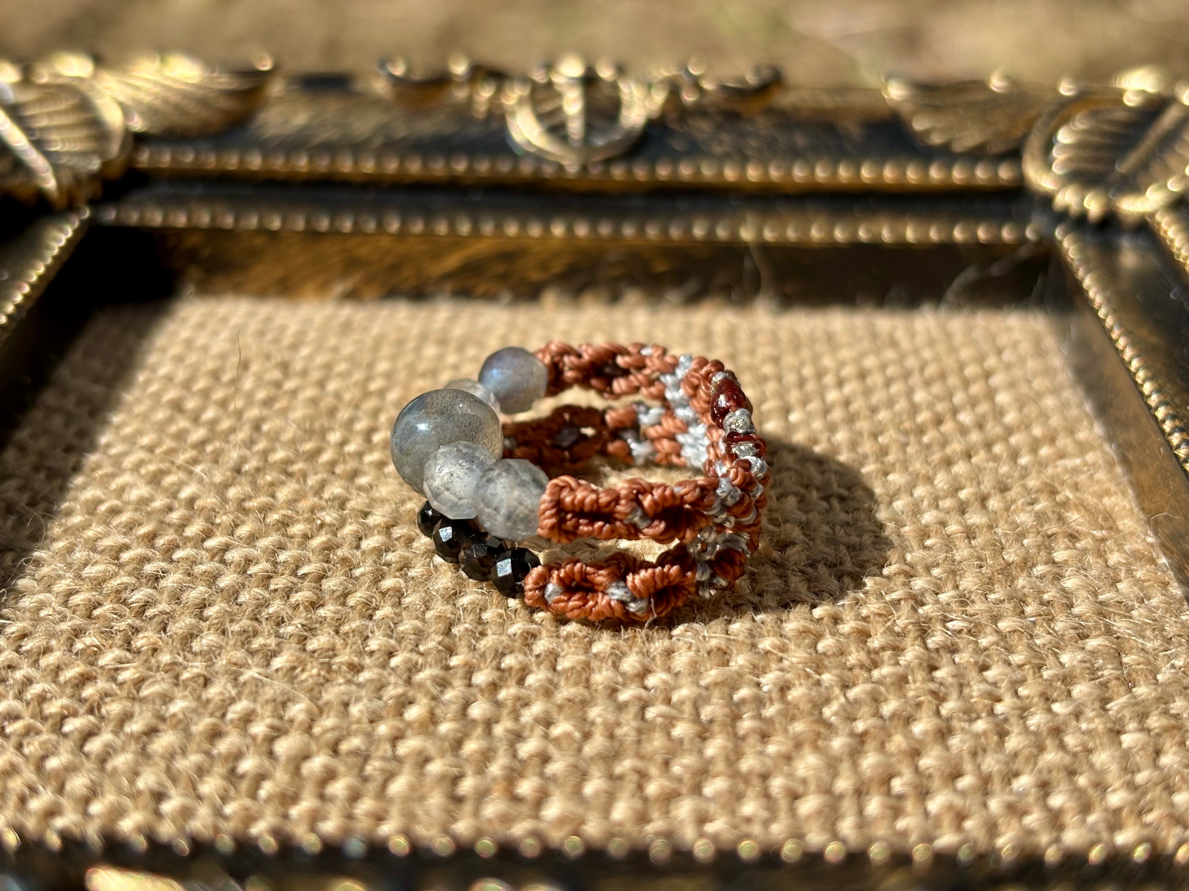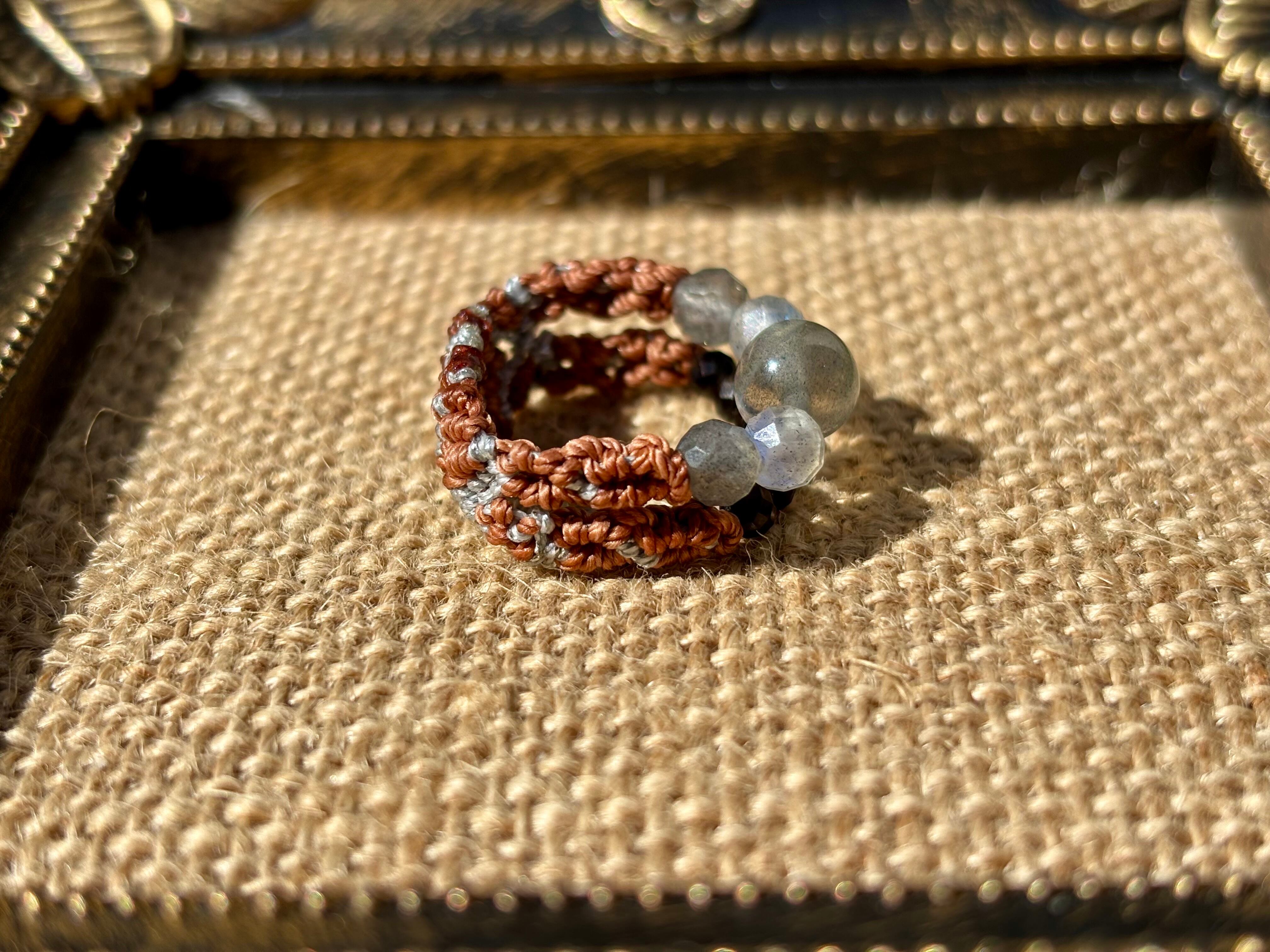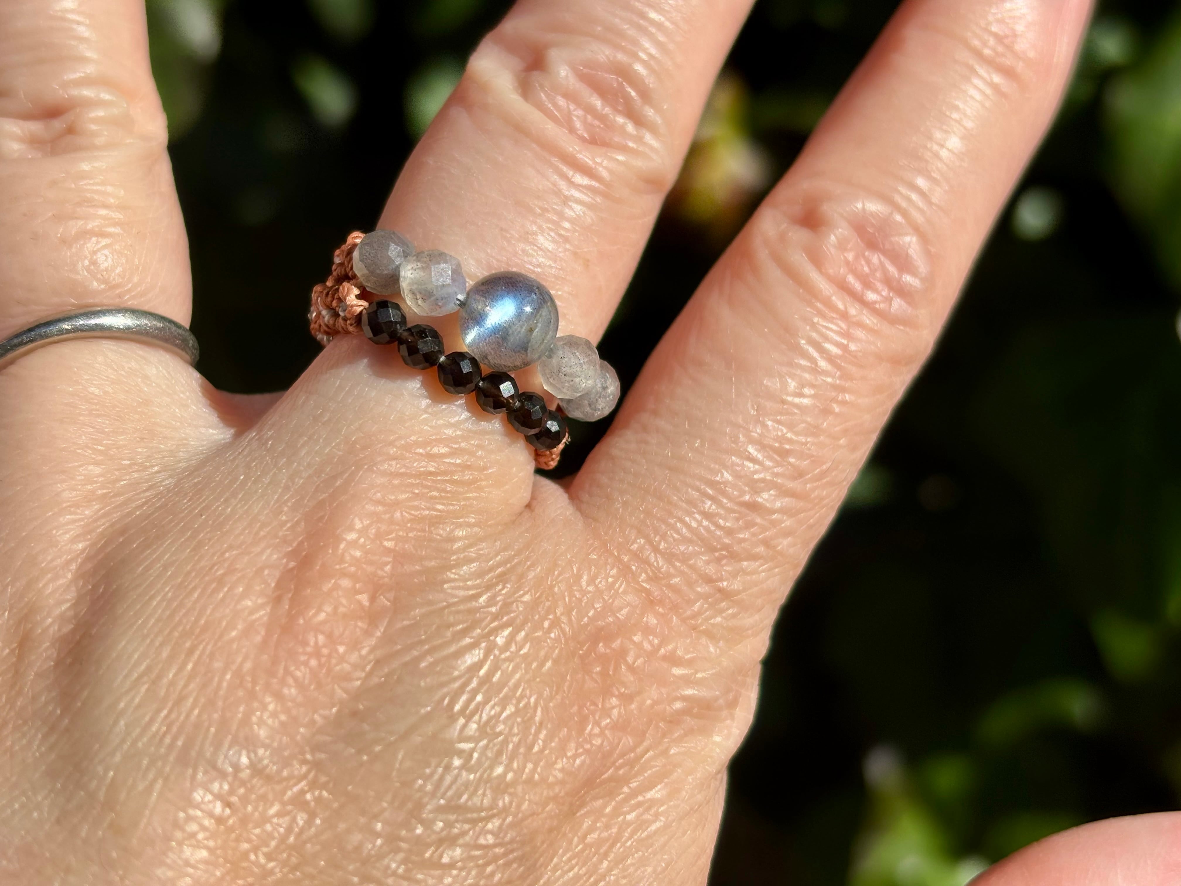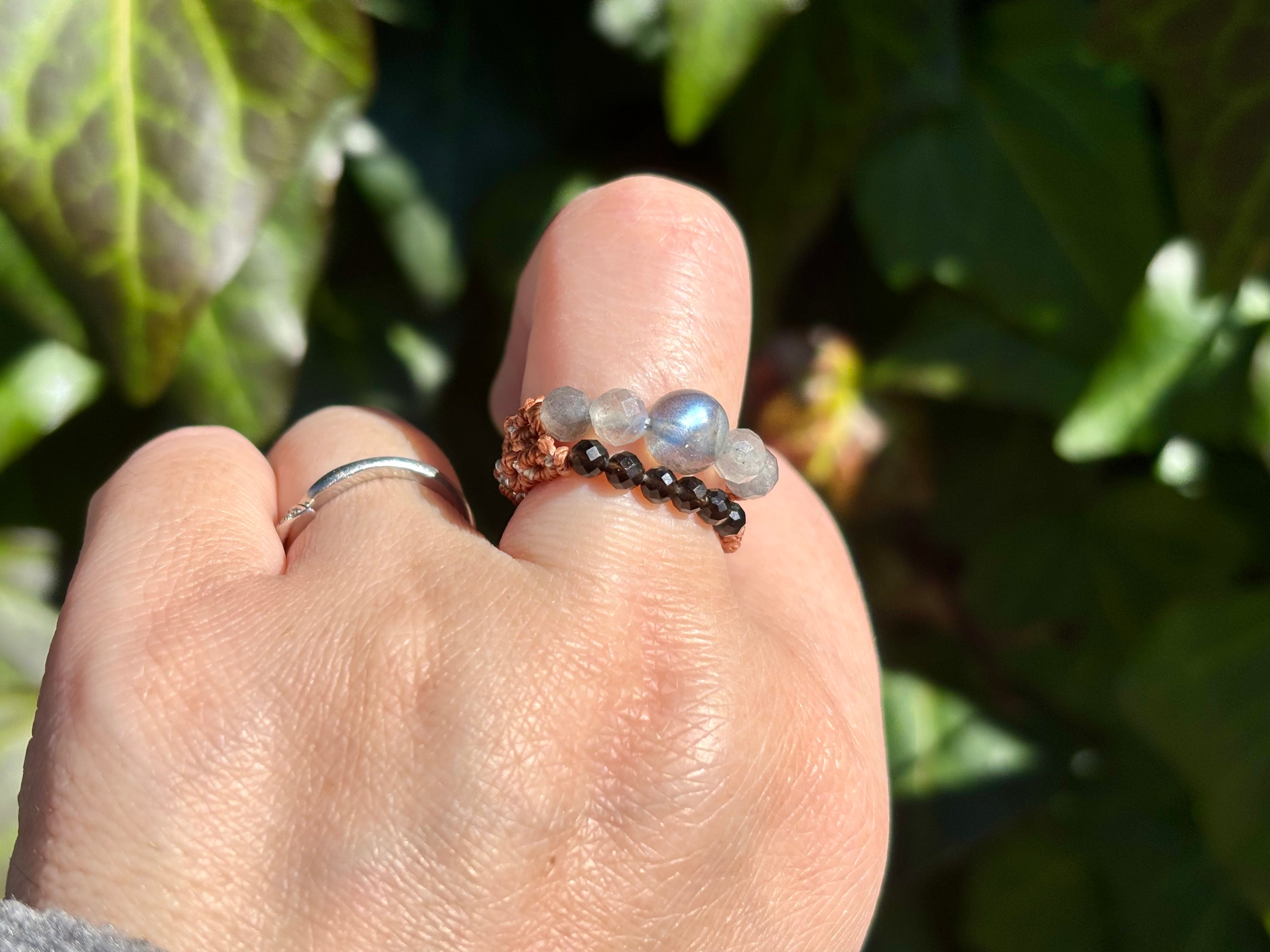 #1005高品質ラブラドライト一点物(ラブラドライト×モリオン黒水晶 マクラメ編み二連リング/指輪)