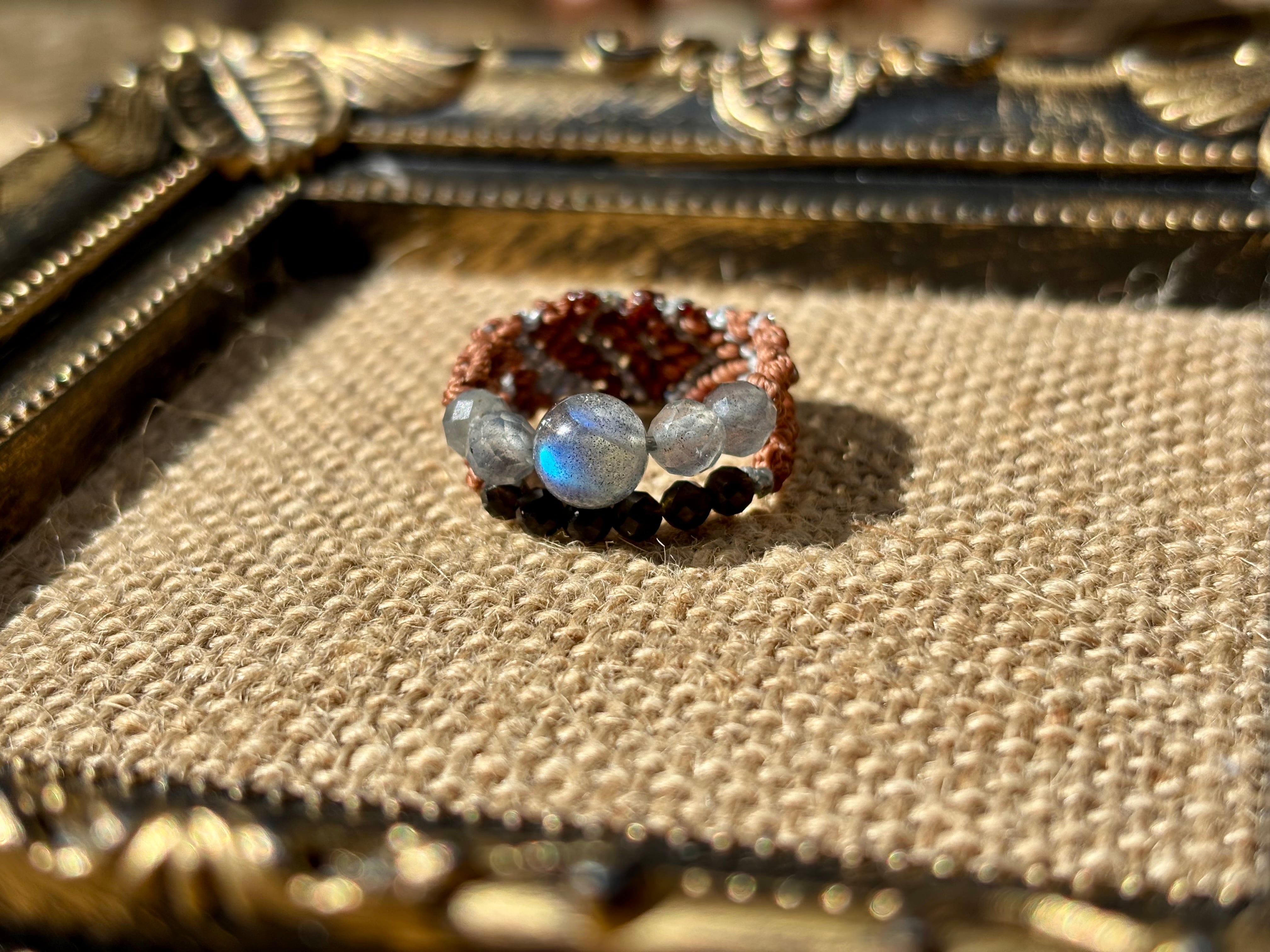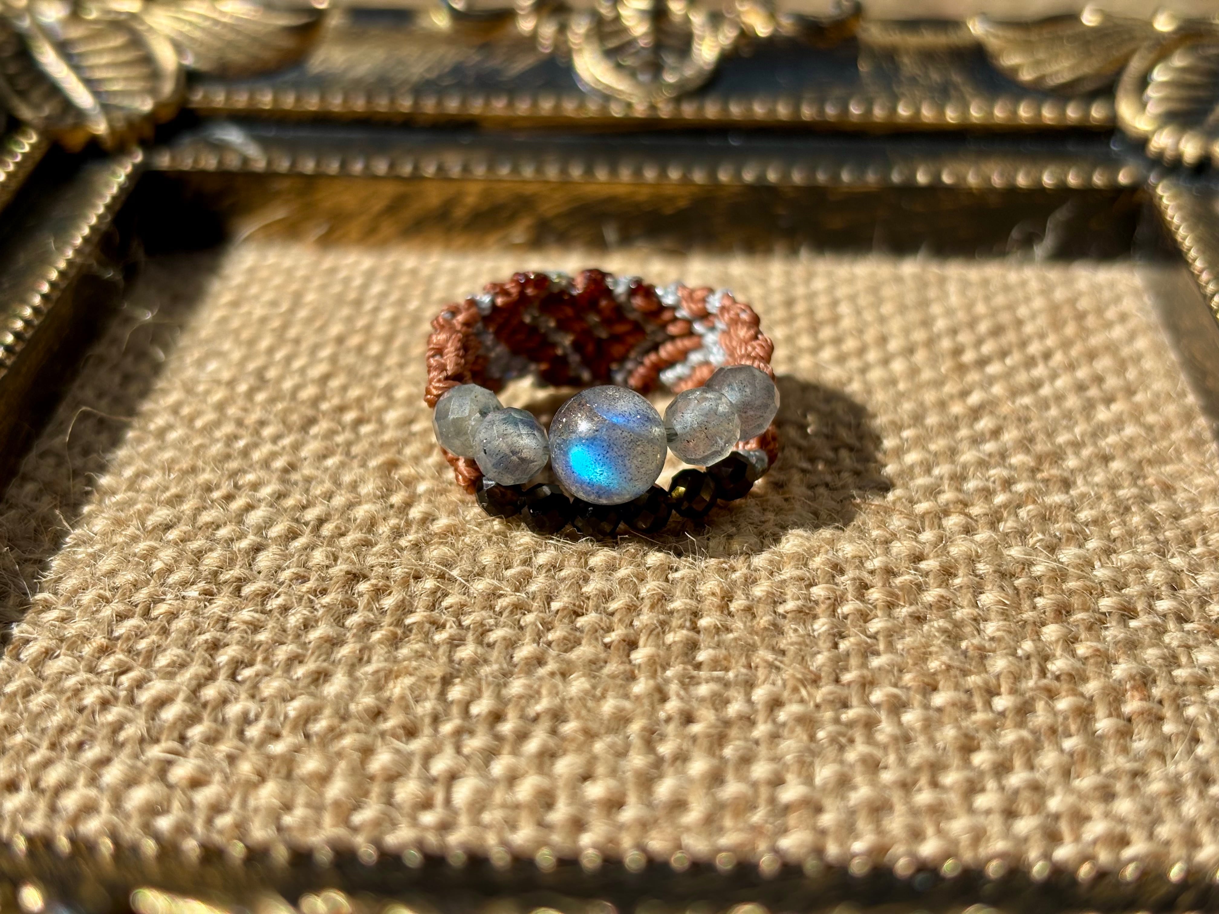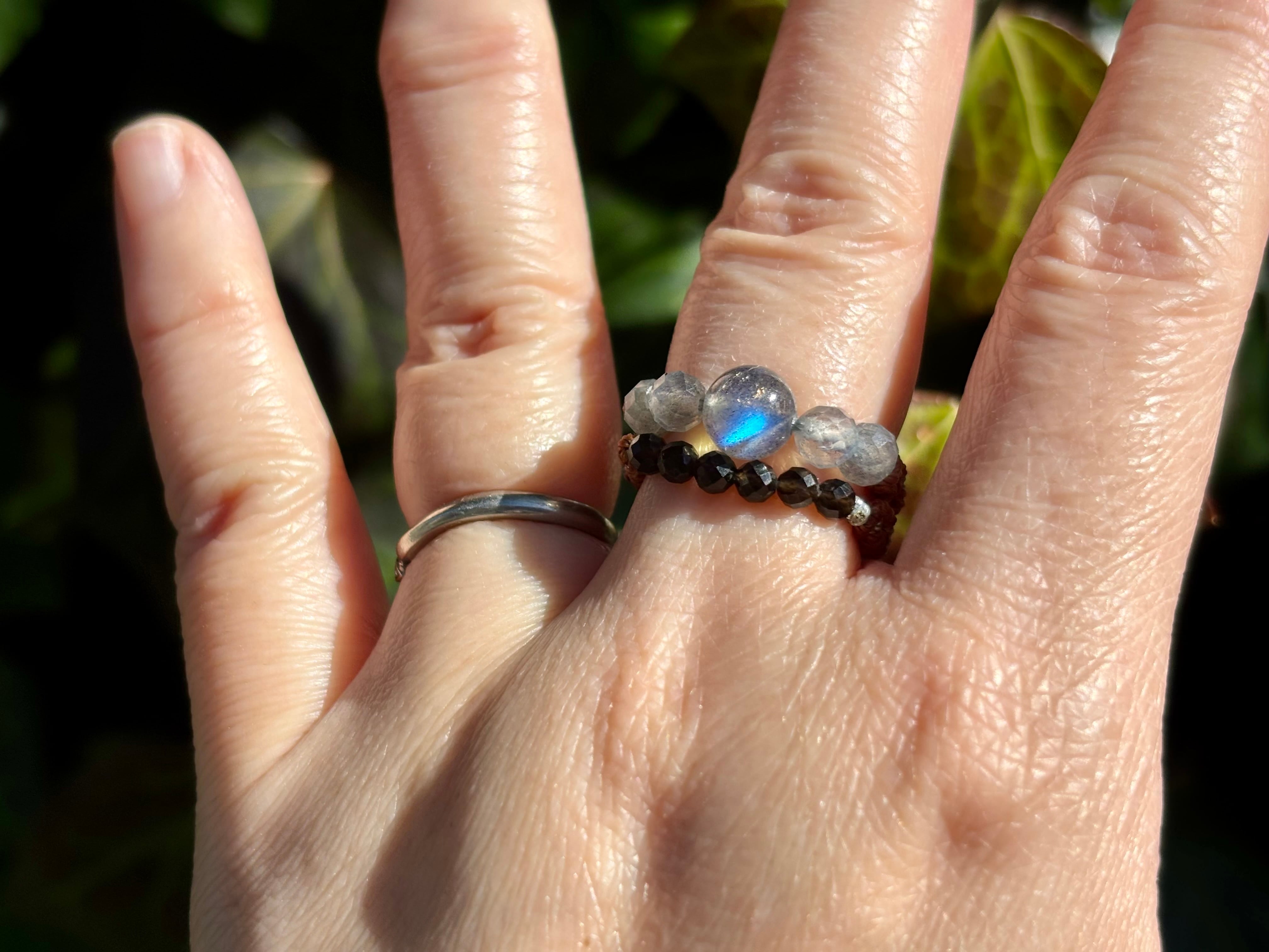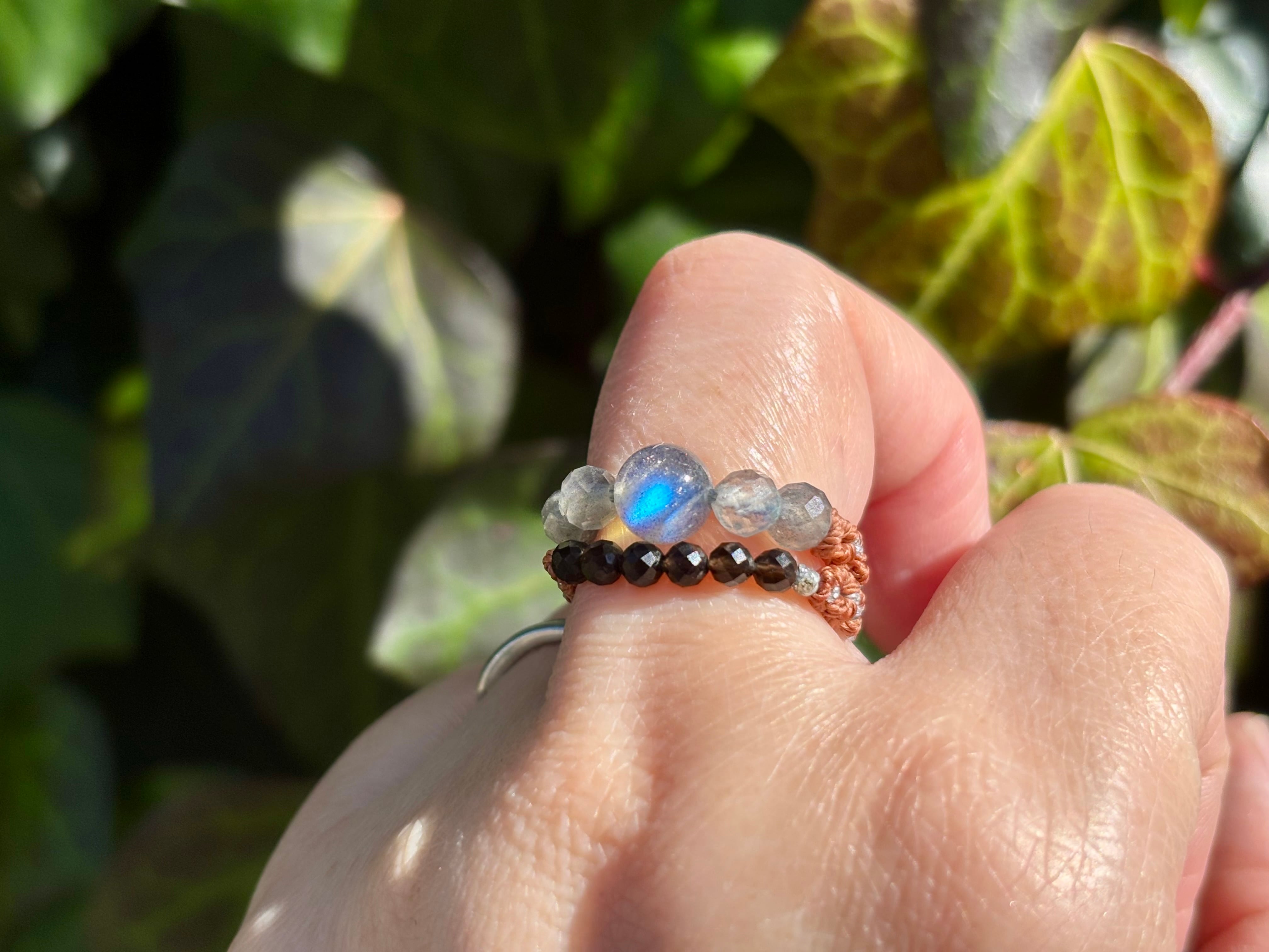 #1006高品質ラブラドライト一点物(ラブラドライト×モリオン黒水晶 マクラメ編み二連リング/指輪)