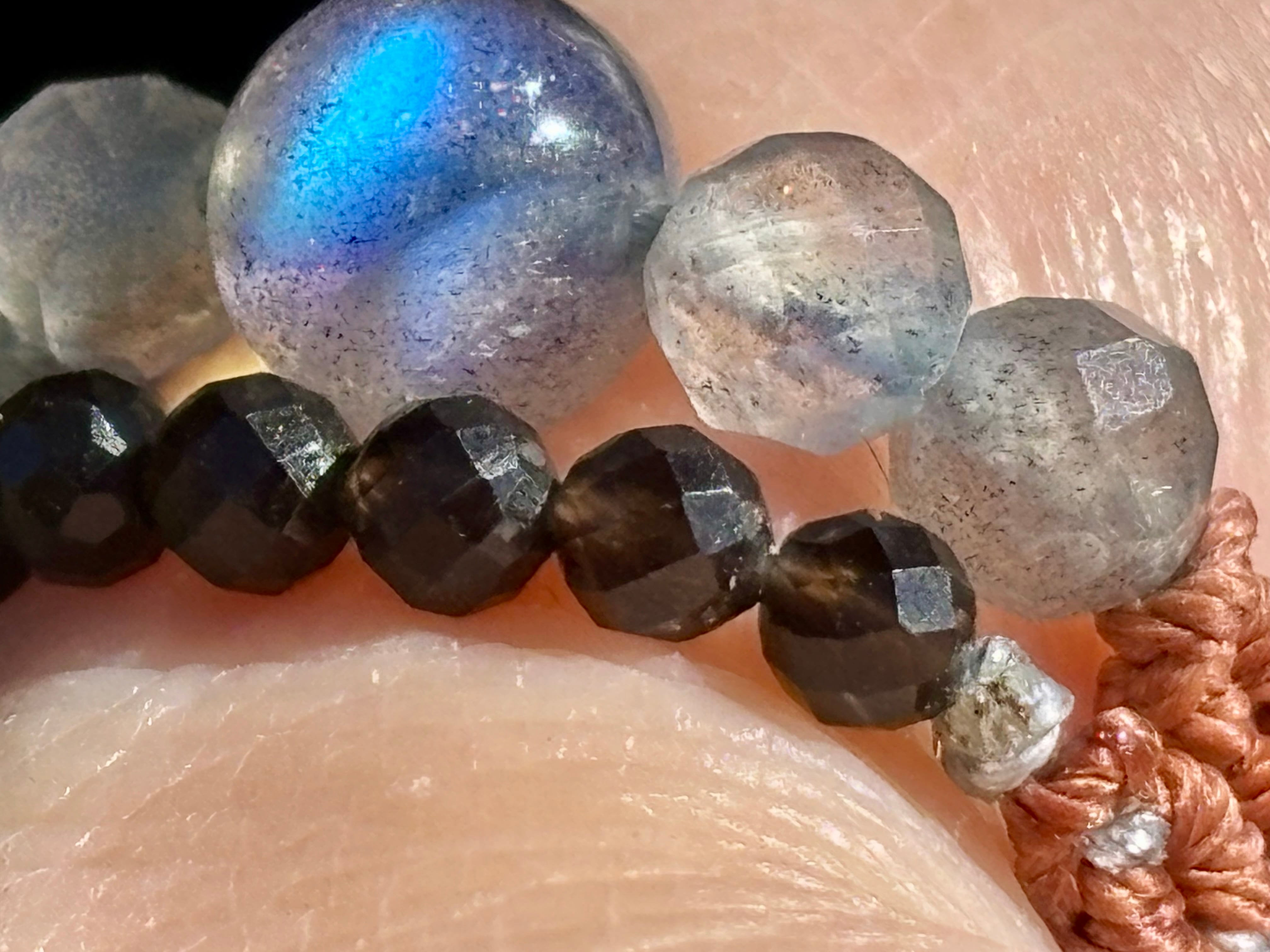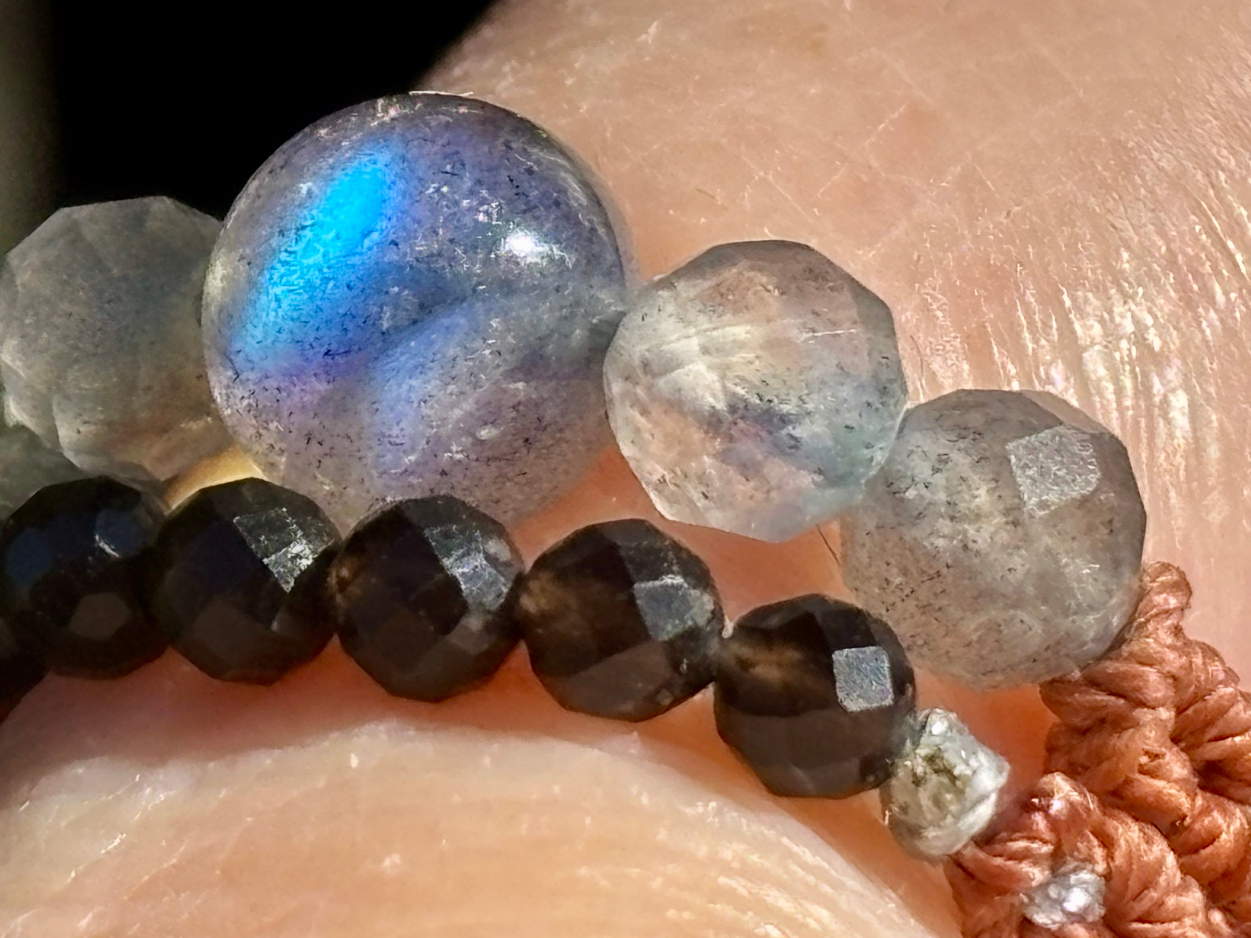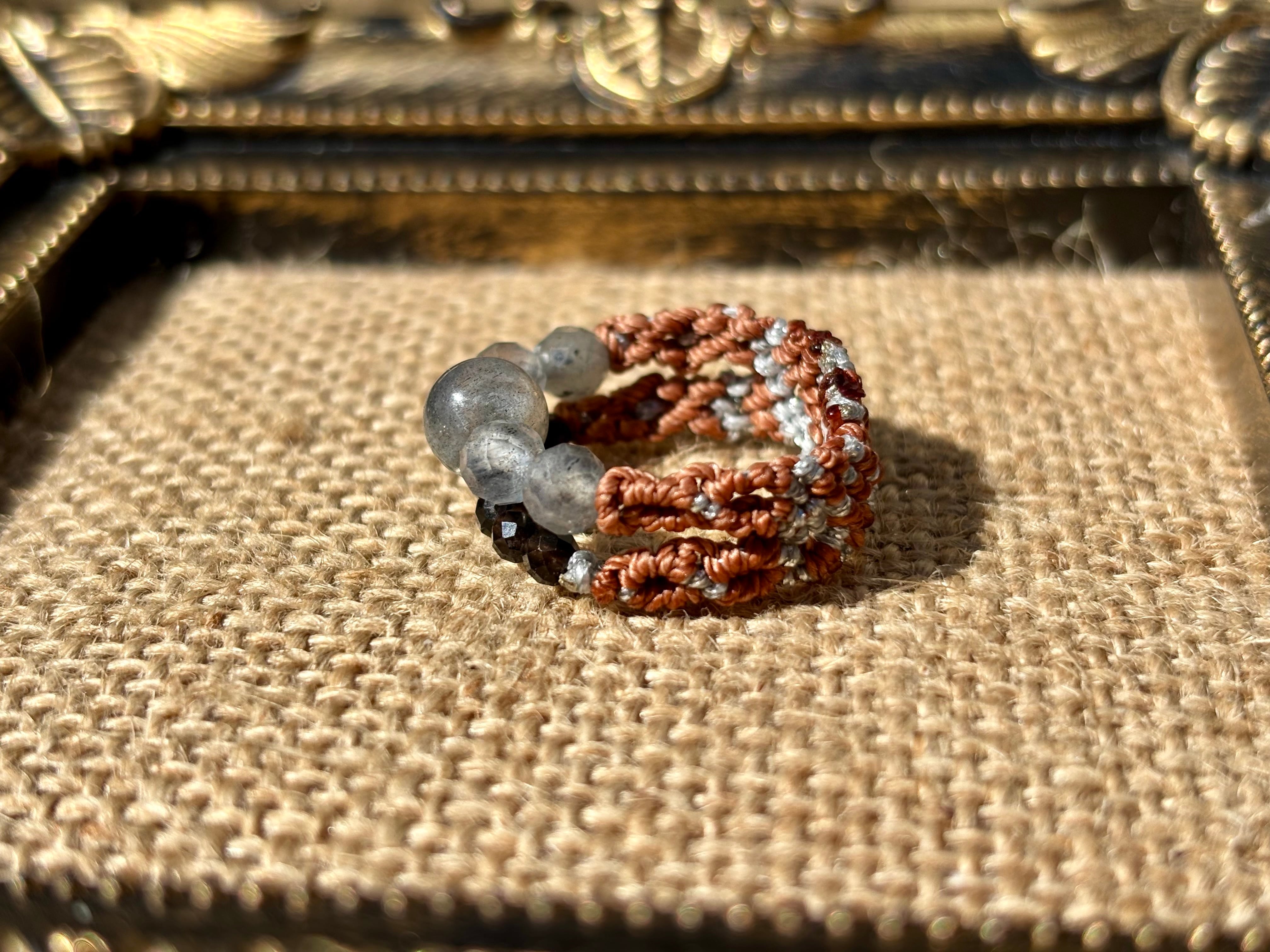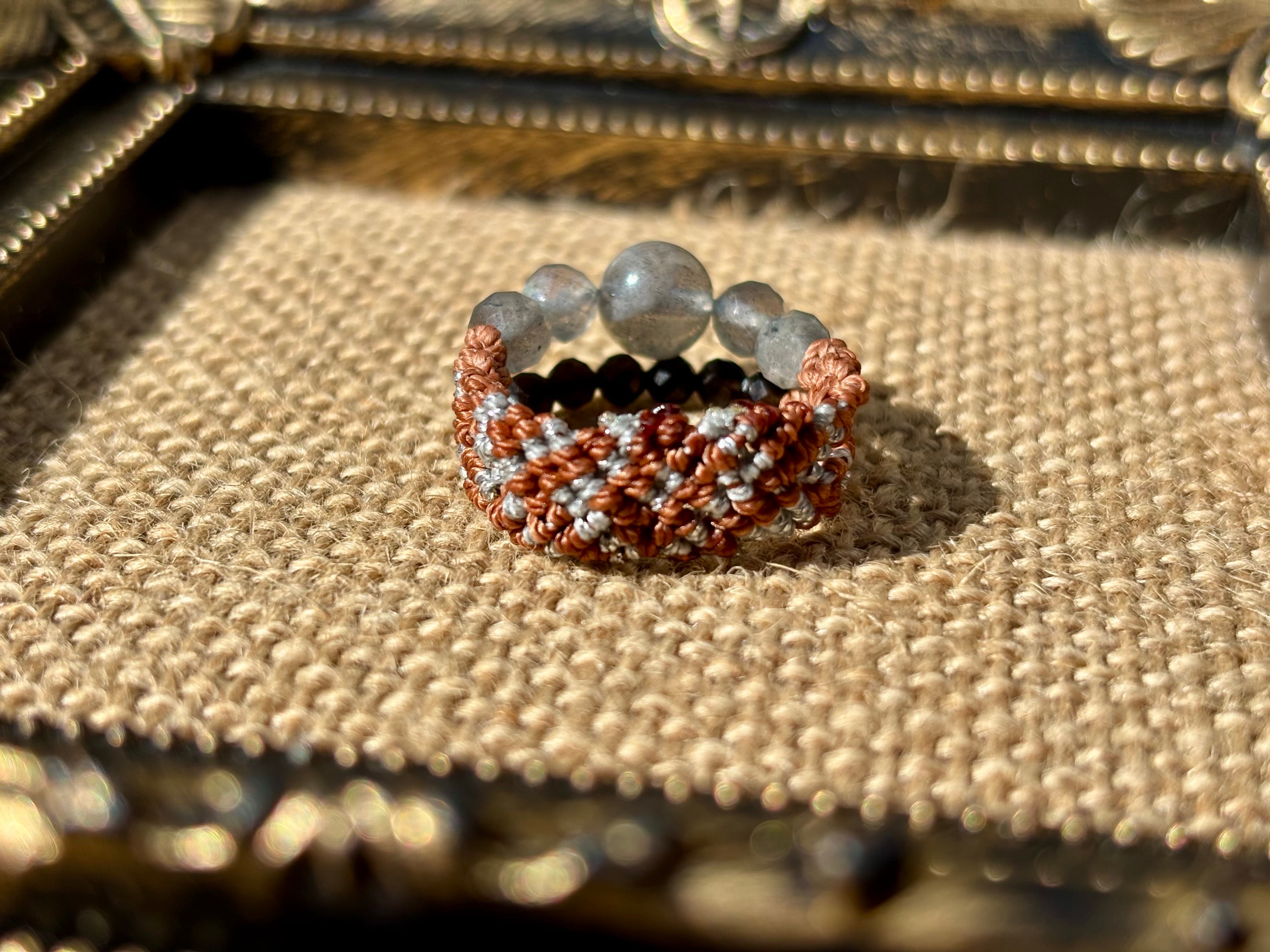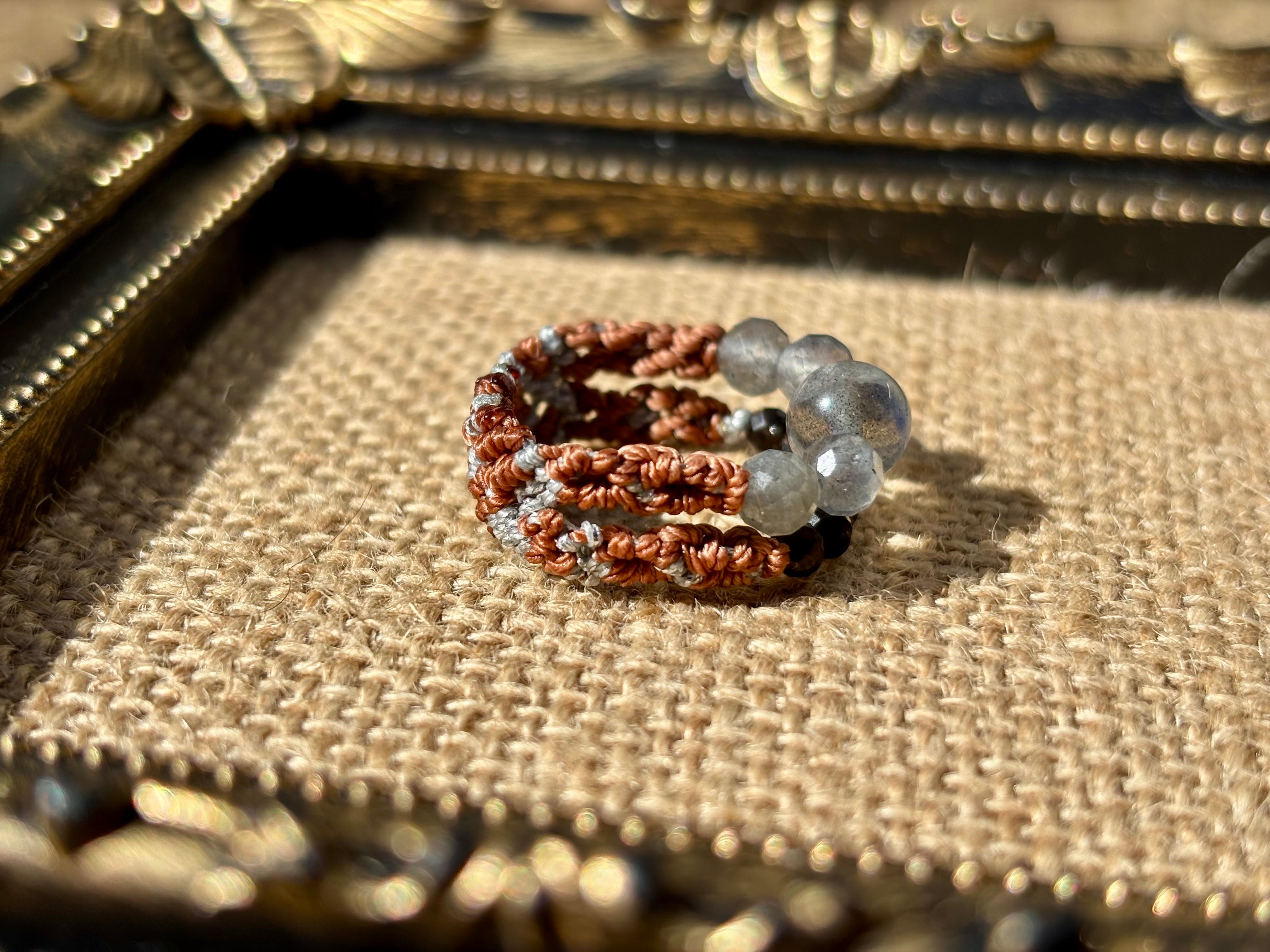 #1006高品質ラブラドライト一点物(ラブラドライト×モリオン黒水晶 マクラメ編み二連リング/指輪)