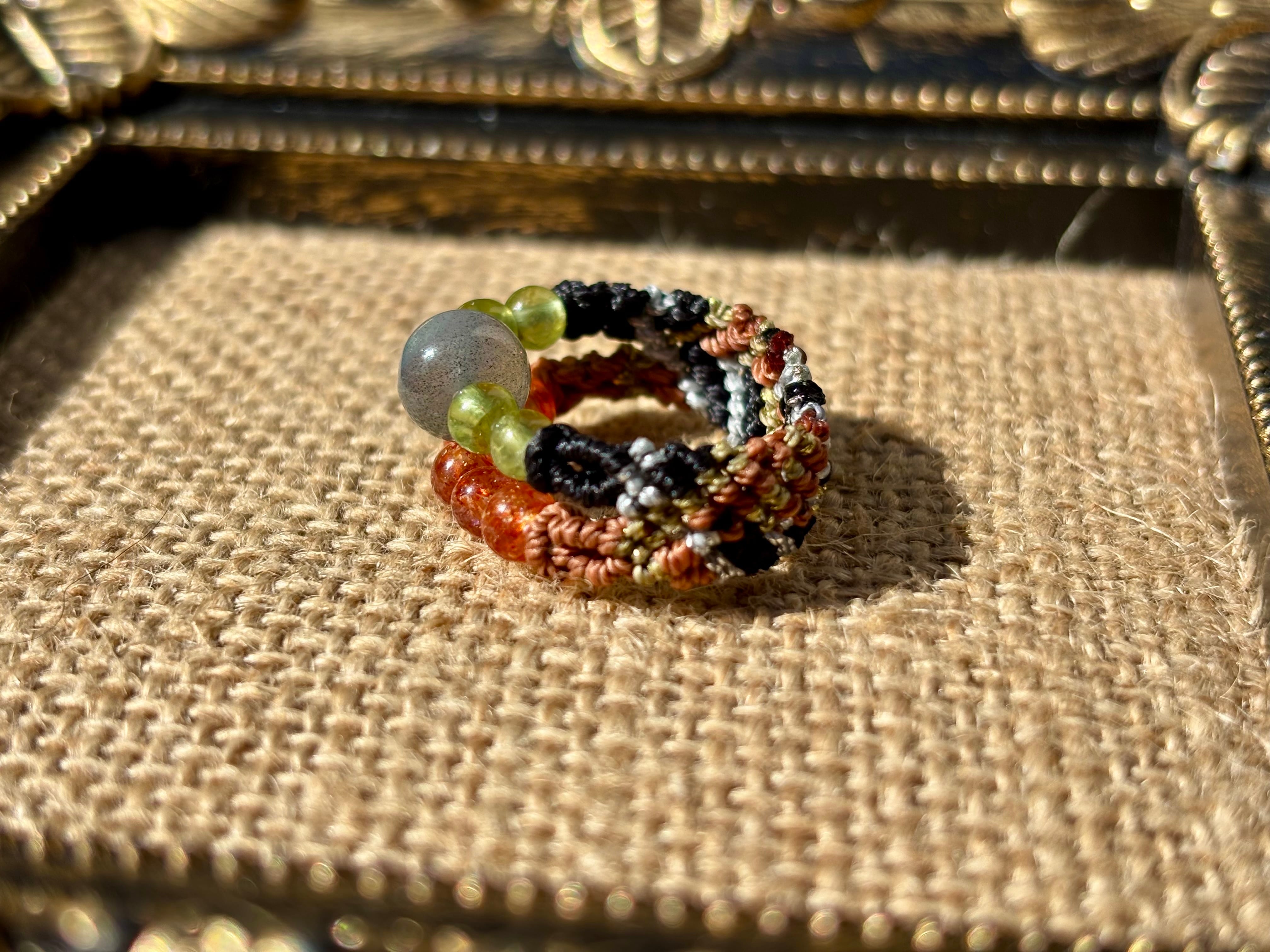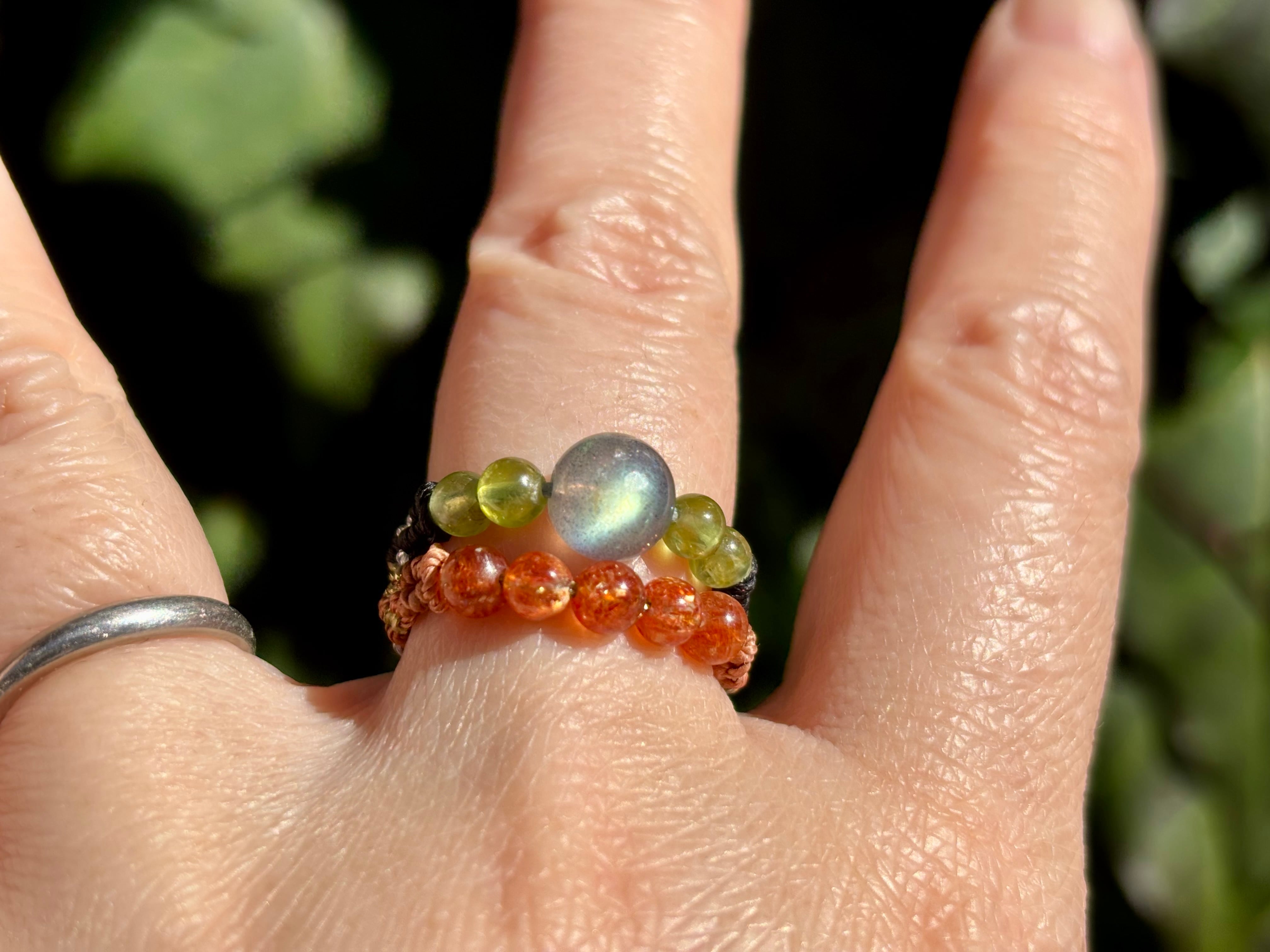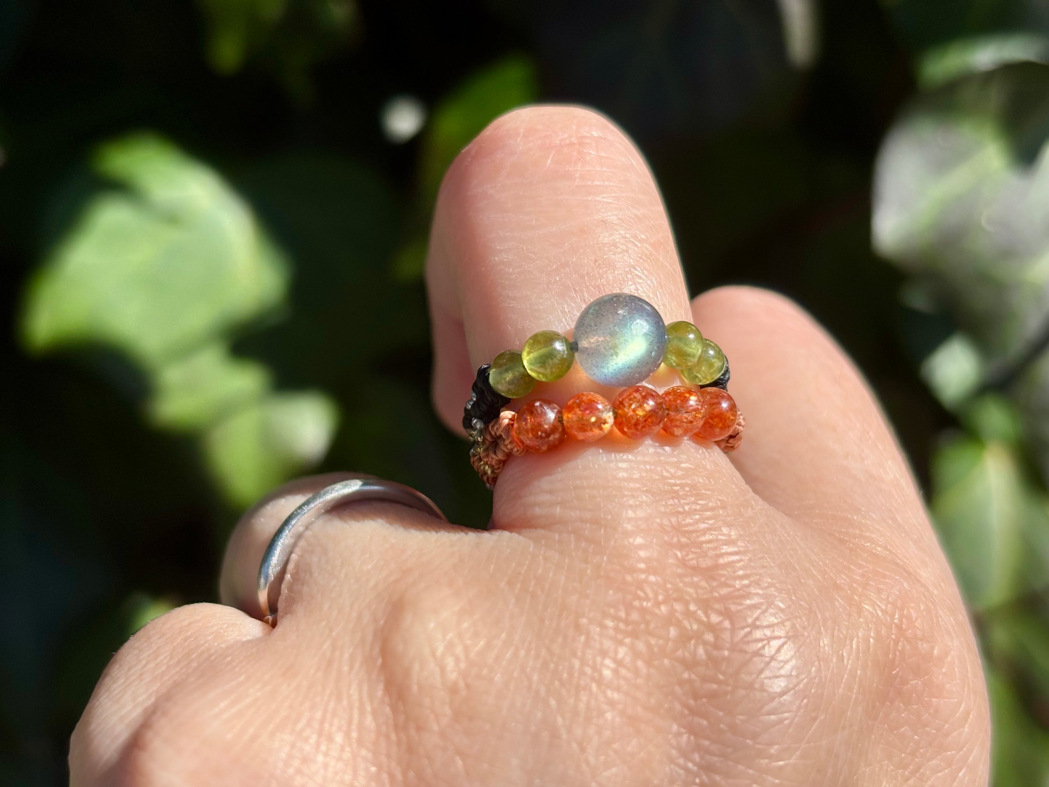 #1010高品質ラブラドライト一点物(ラブラドライト×サンストーン×ペリドット マクラメ編み二連リング/指輪)