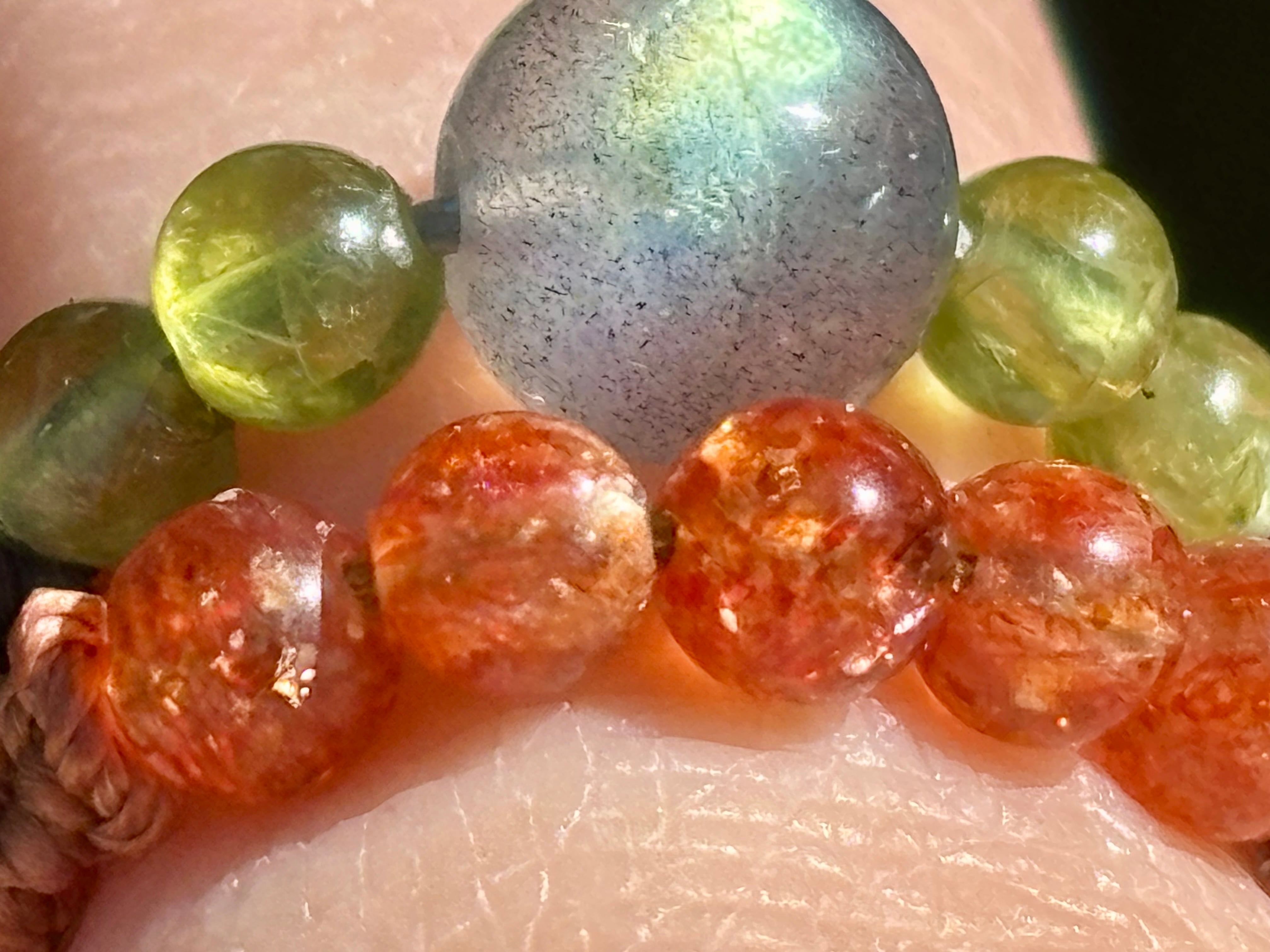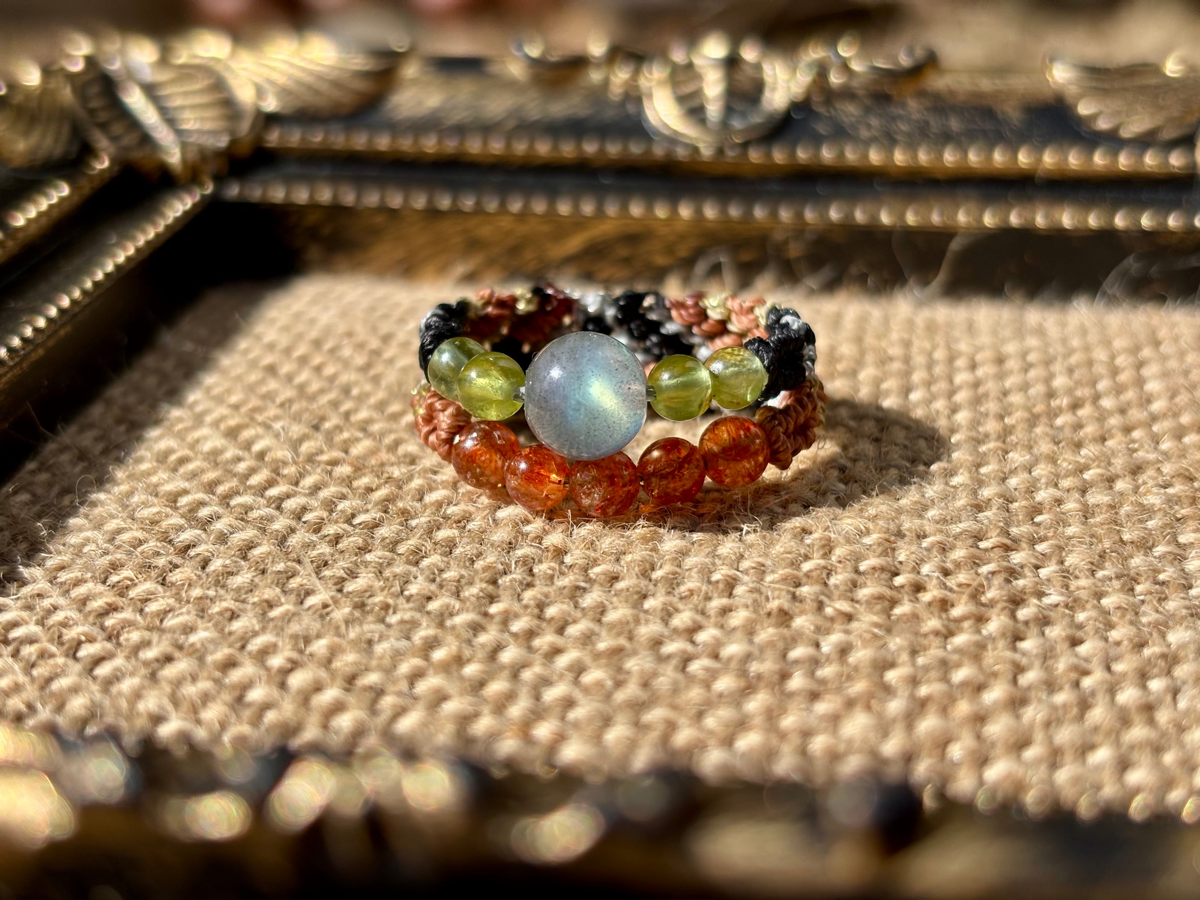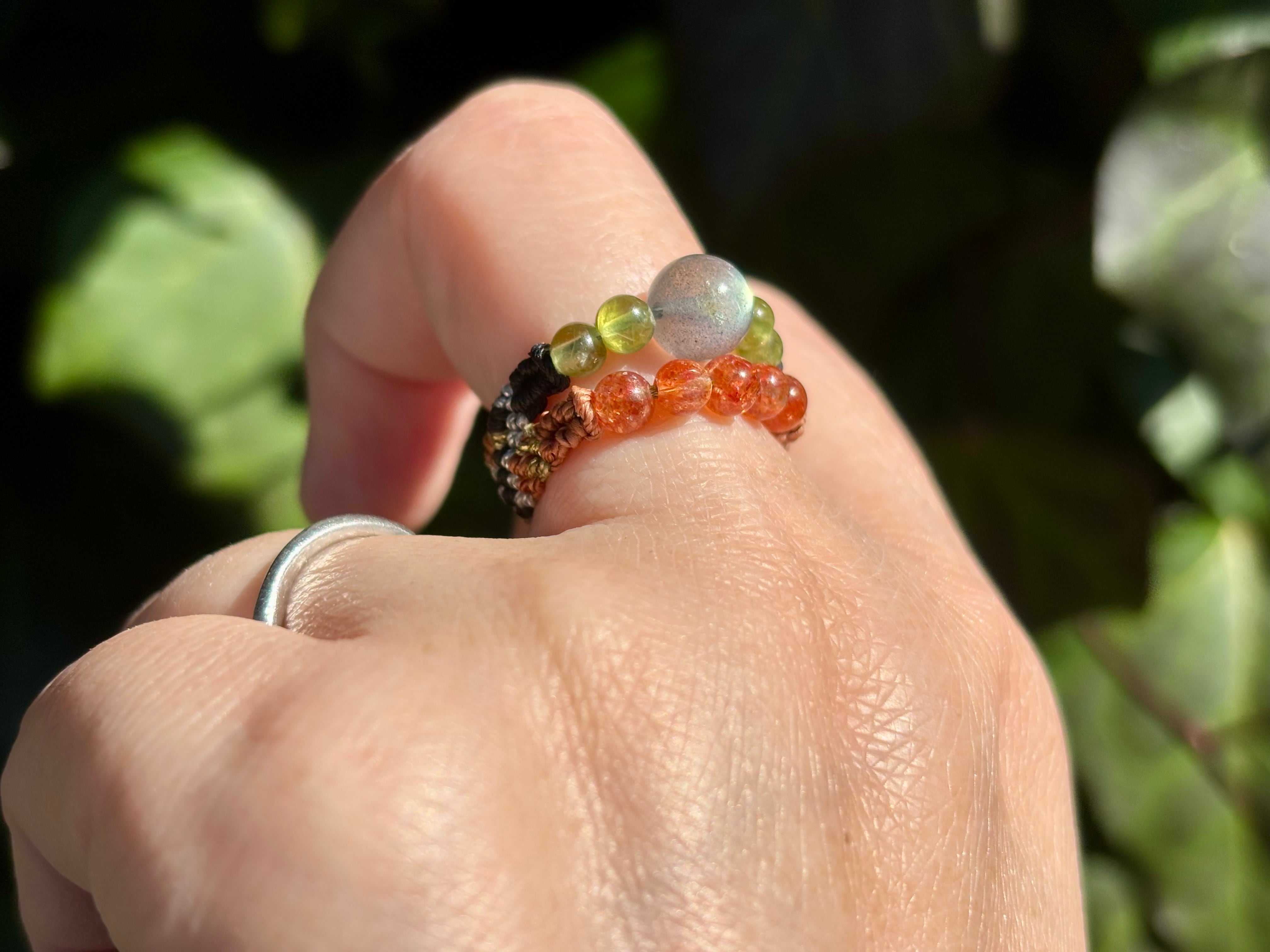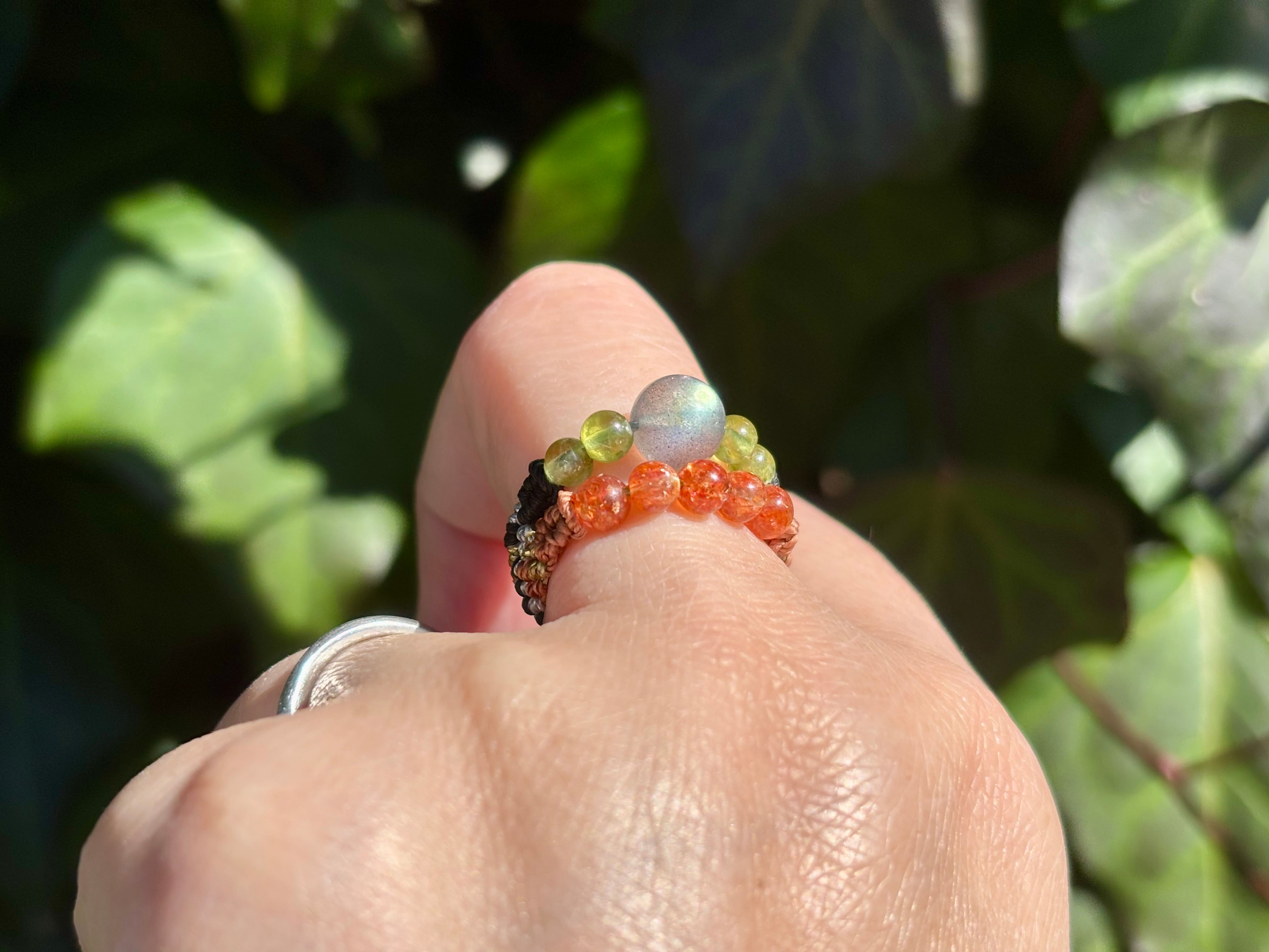 #1010高品質ラブラドライト一点物(ラブラドライト×サンストーン×ペリドット マクラメ編み二連リング/指輪)